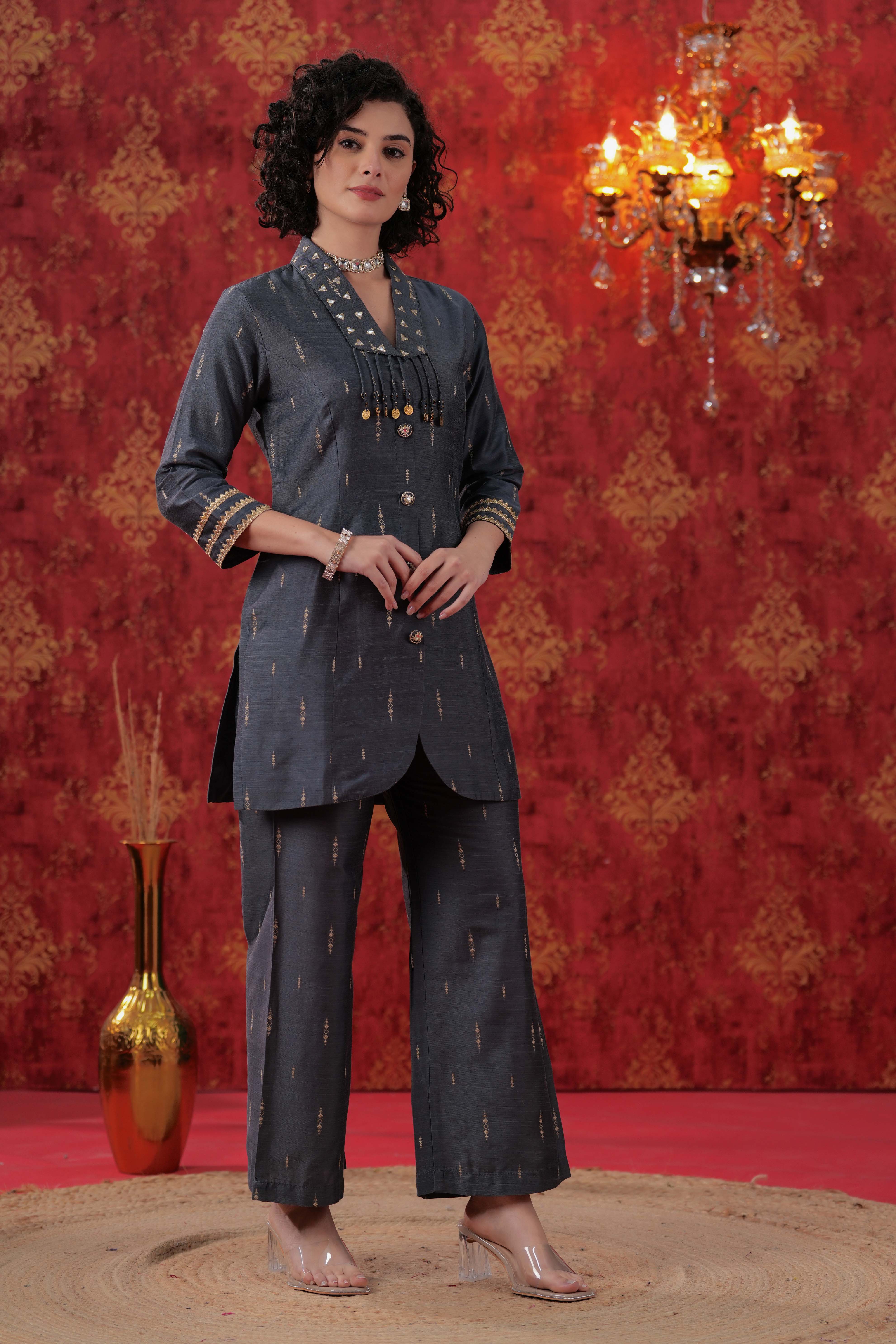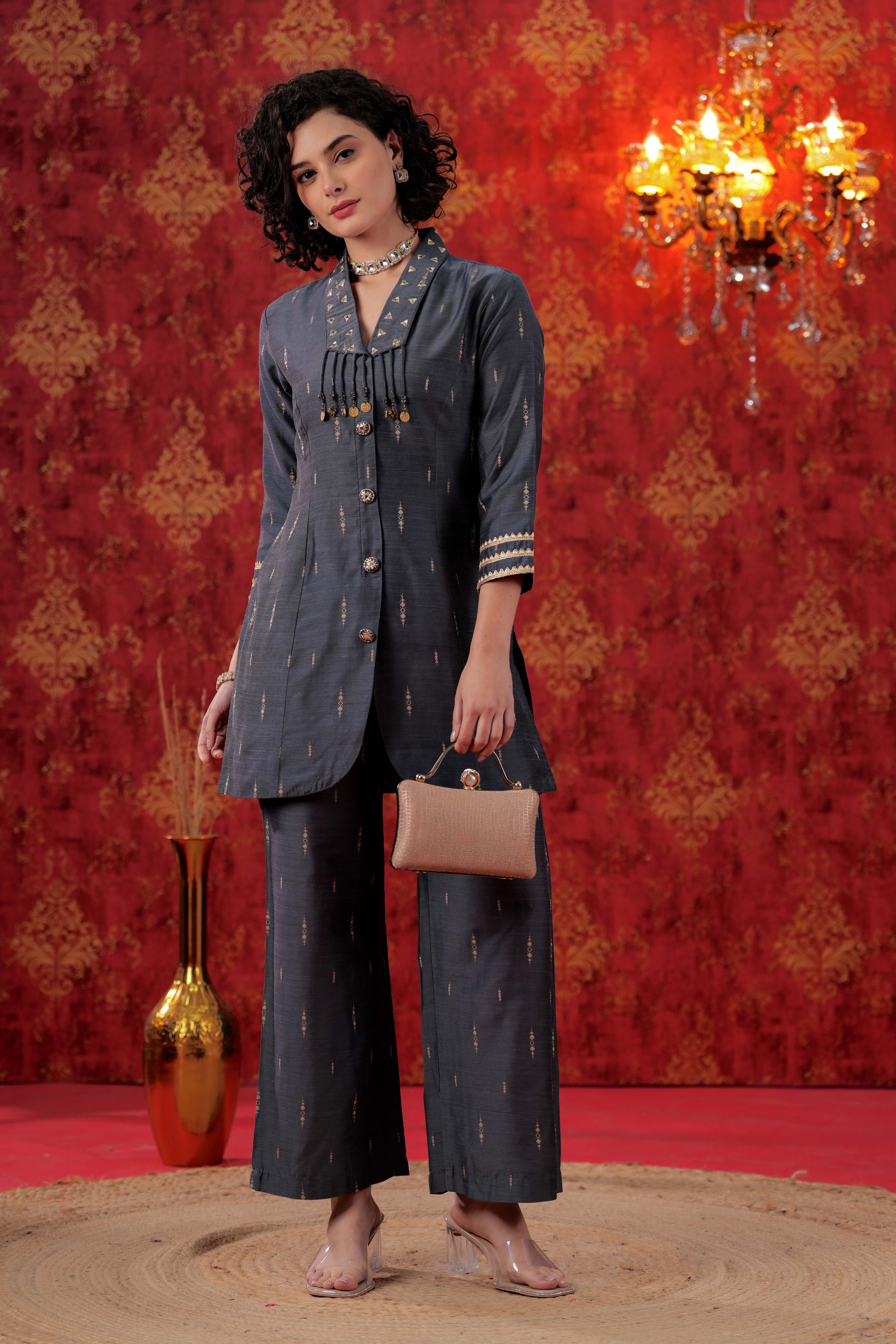 Desi Disco Grey Glitz Grey Jacket Co-ord Set- Shine effortlessly in the Desi Disco Glitz Grey Co-ord Set. Crafted from luxe cotton silk, it features a mirror-detailed shawl-collar jacket with zari-trimmed sleeves and sleek palazzos—perfect for festive fêtes and soirées.