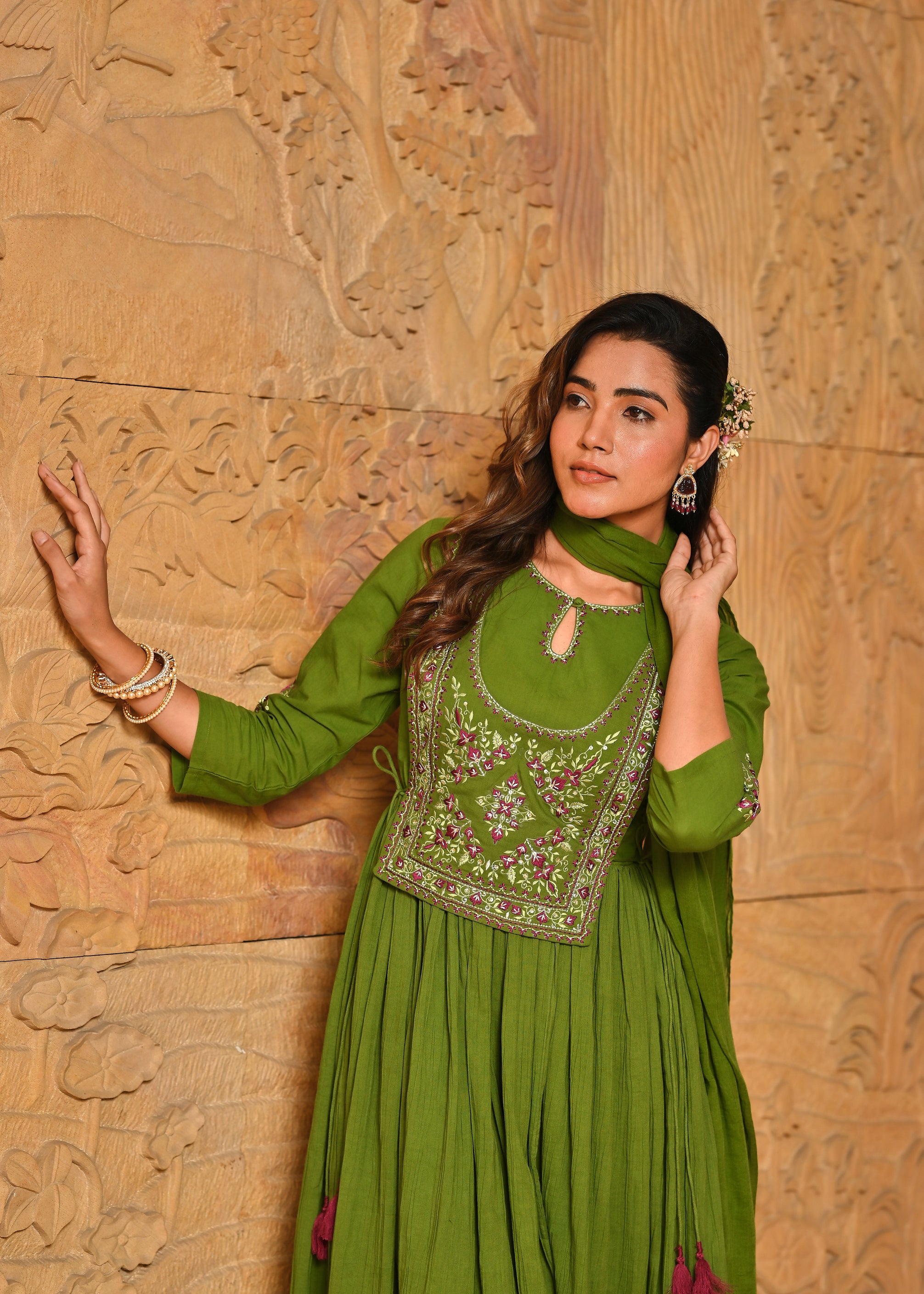 Rangmanch Hari Leher Wrinkled Zari Work Anarkali Kurta Dupatta Set - Embrace serene elegance in the Green Pure Cotton Crinkle Kurta Set. The soft, crinkled cotton offers a beautiful texture, enhanced by an ornate tie-up yoke detailed with exquisite Resham and Zari embroidery. This three-piece set includes complementary pants and a light, airy Cotton Mul dupatta, creating a look that is both comfortable and luxuriously handcrafted.