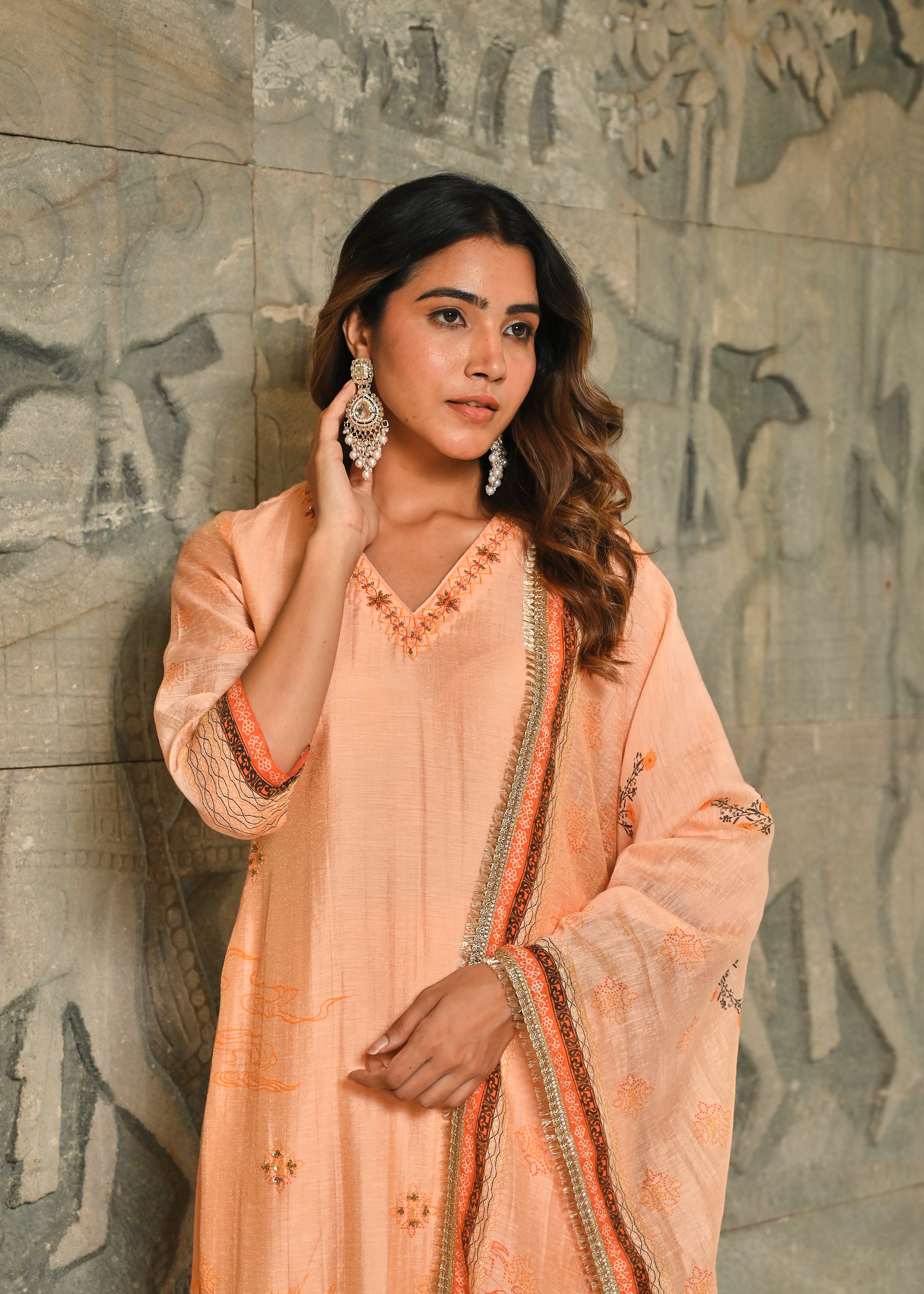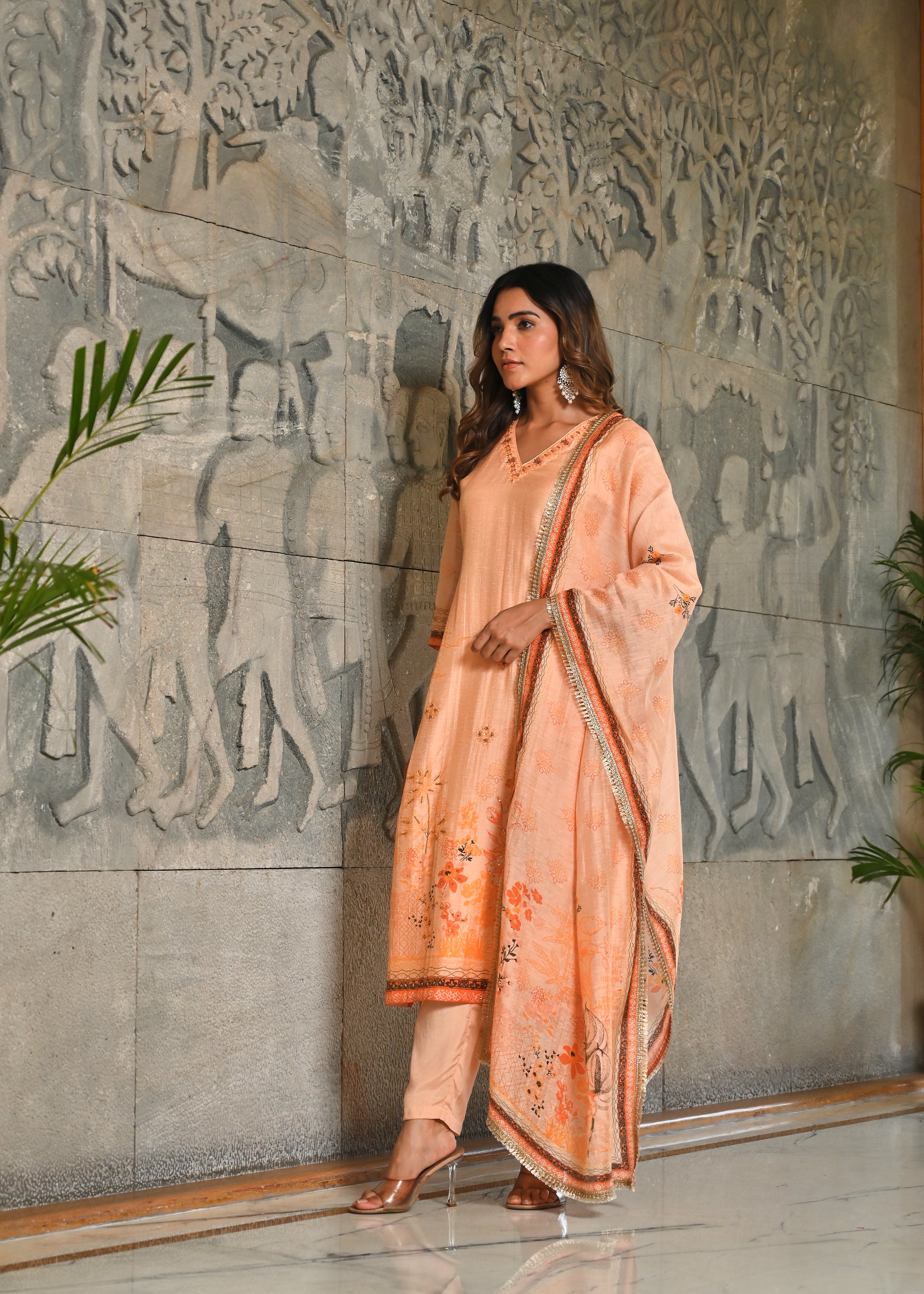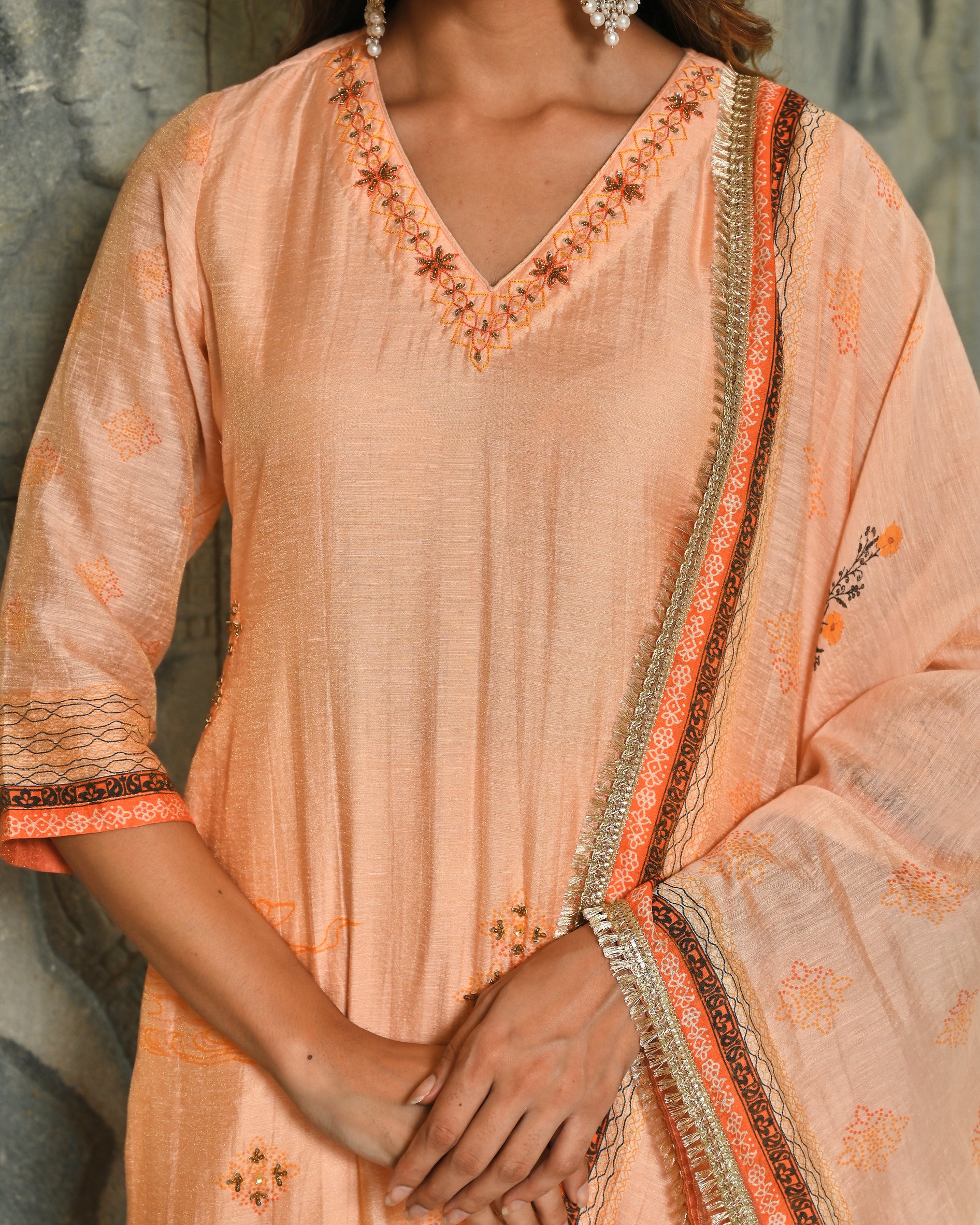 Floral Panache Peach Zari - Kari & Phool Silk Kurta Dupatta Set- Drape yourself in the soft splendor of this exquisite Peach Kurta-Dupatta Set. Crafted from luxurious Aurum Silk, the kurta features a classic V - neckline. The beauty is centered on the yoke, which is beautifully accented with intricate Zari and delicate Resham hand-embroidery. Subtle floral prints adorn the front, along with coordinating solid pant. Paired with a matching silk dupatta, this set is a perfect blend of traditional artistry and contemporary grace.
