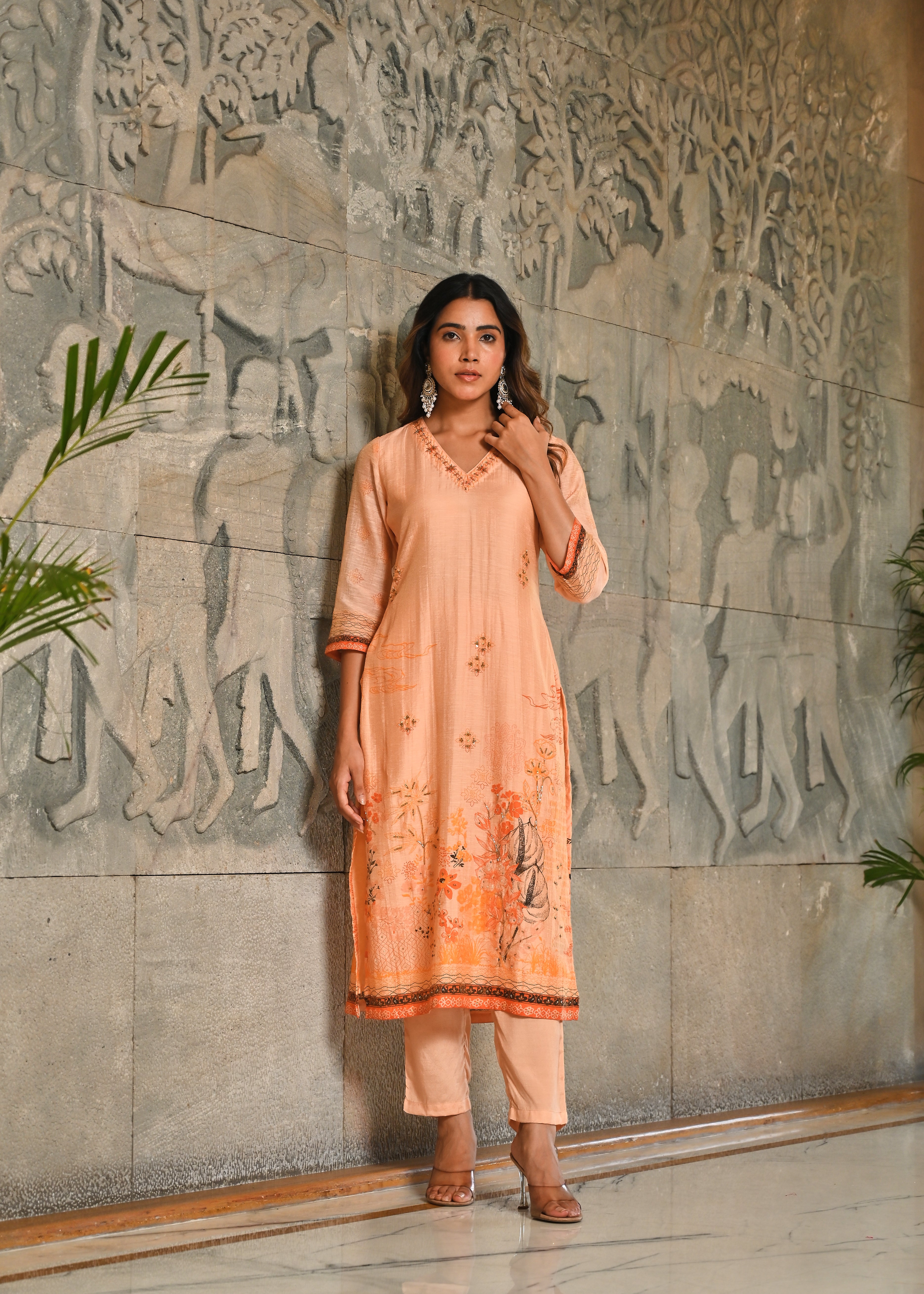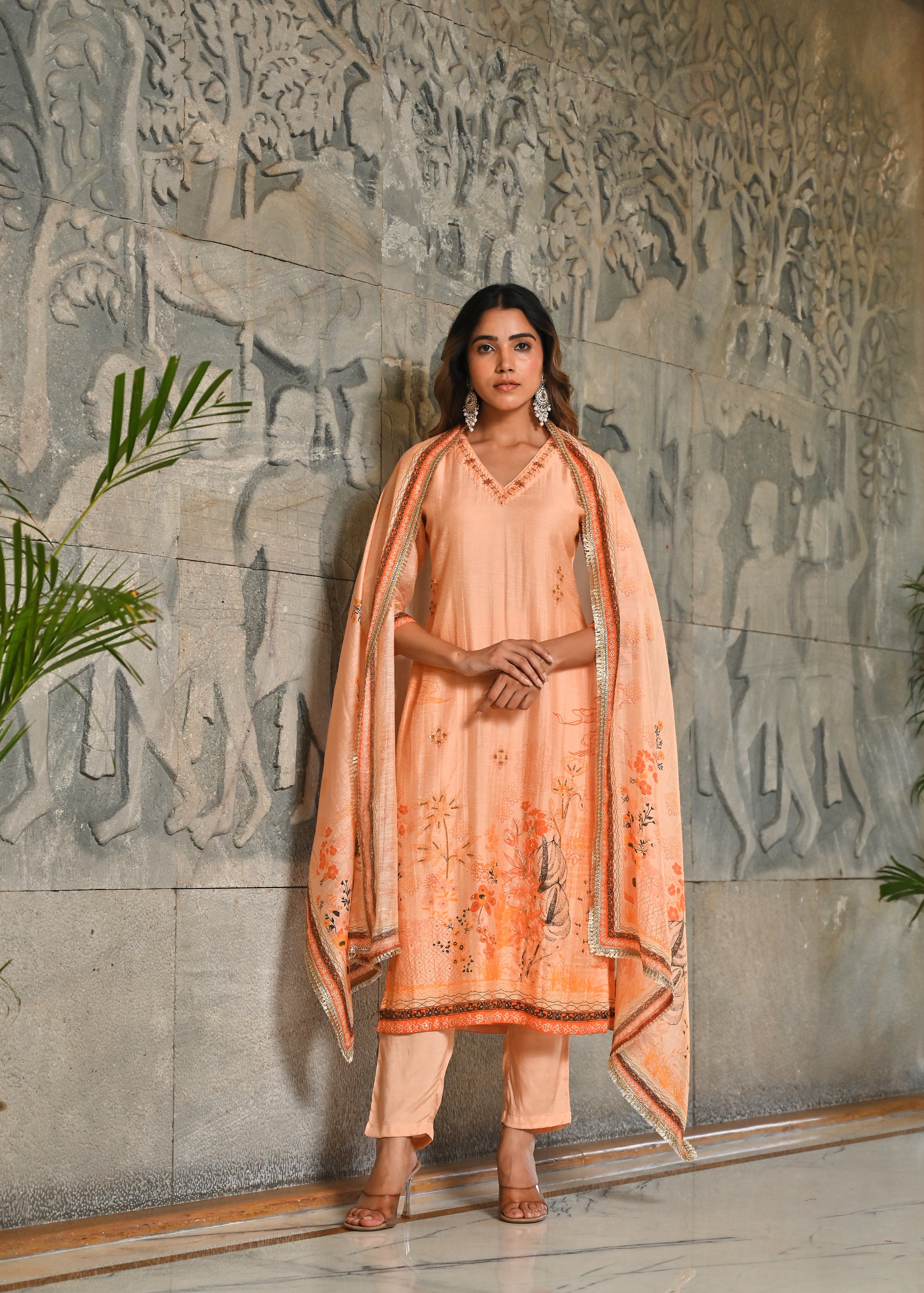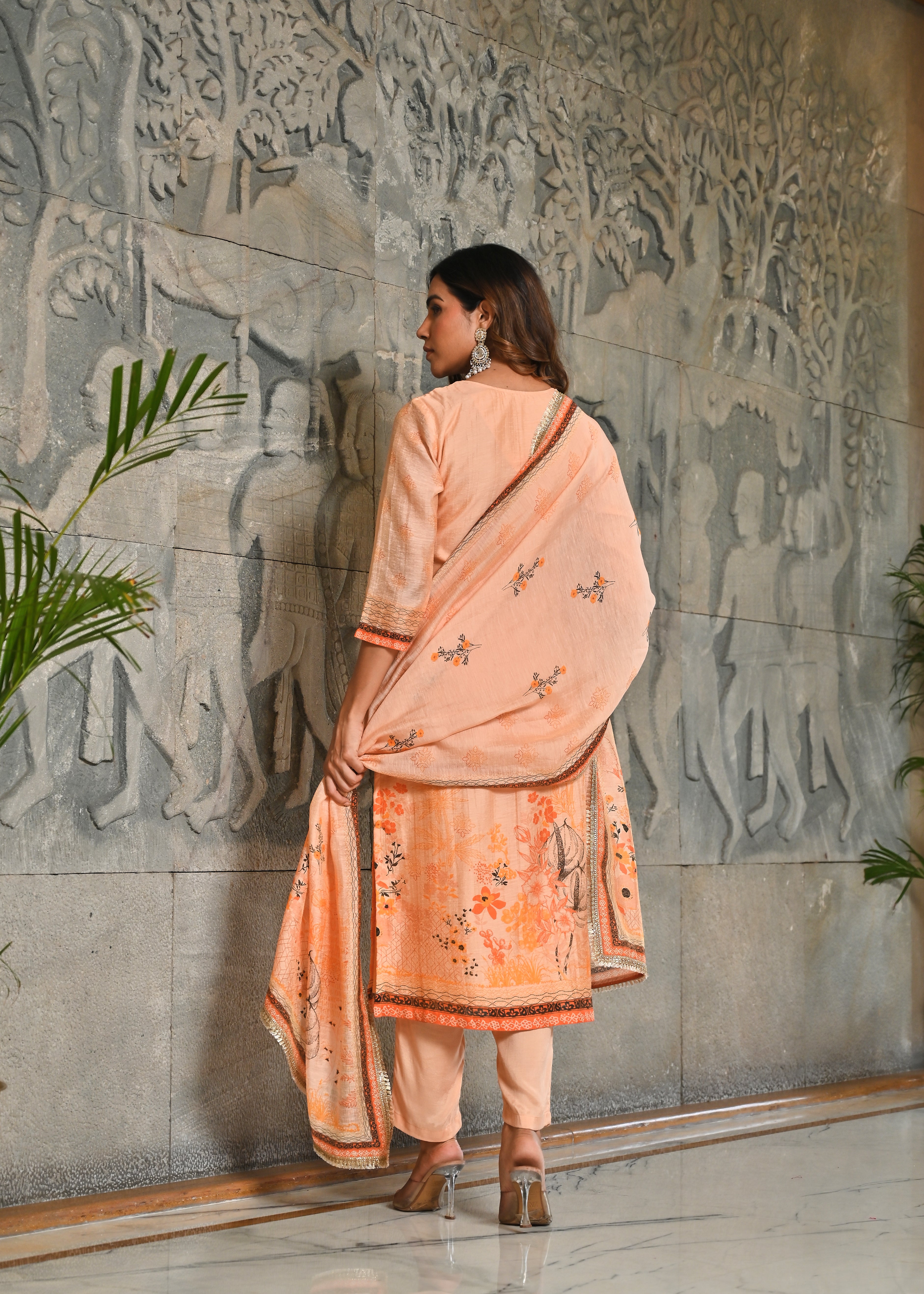 Floral Panache Peach Zari - Kari & Phool Silk Kurta Dupatta Set- Drape yourself in the soft splendor of this exquisite Peach Kurta-Dupatta Set. Crafted from luxurious Aurum Silk, the kurta features a classic V - neckline. The beauty is centered on the yoke, which is beautifully accented with intricate Zari and delicate Resham hand-embroidery. Subtle floral prints adorn the front, along with coordinating solid pant. Paired with a matching silk dupatta, this set is a perfect blend of traditional artistry and contemporary grace.