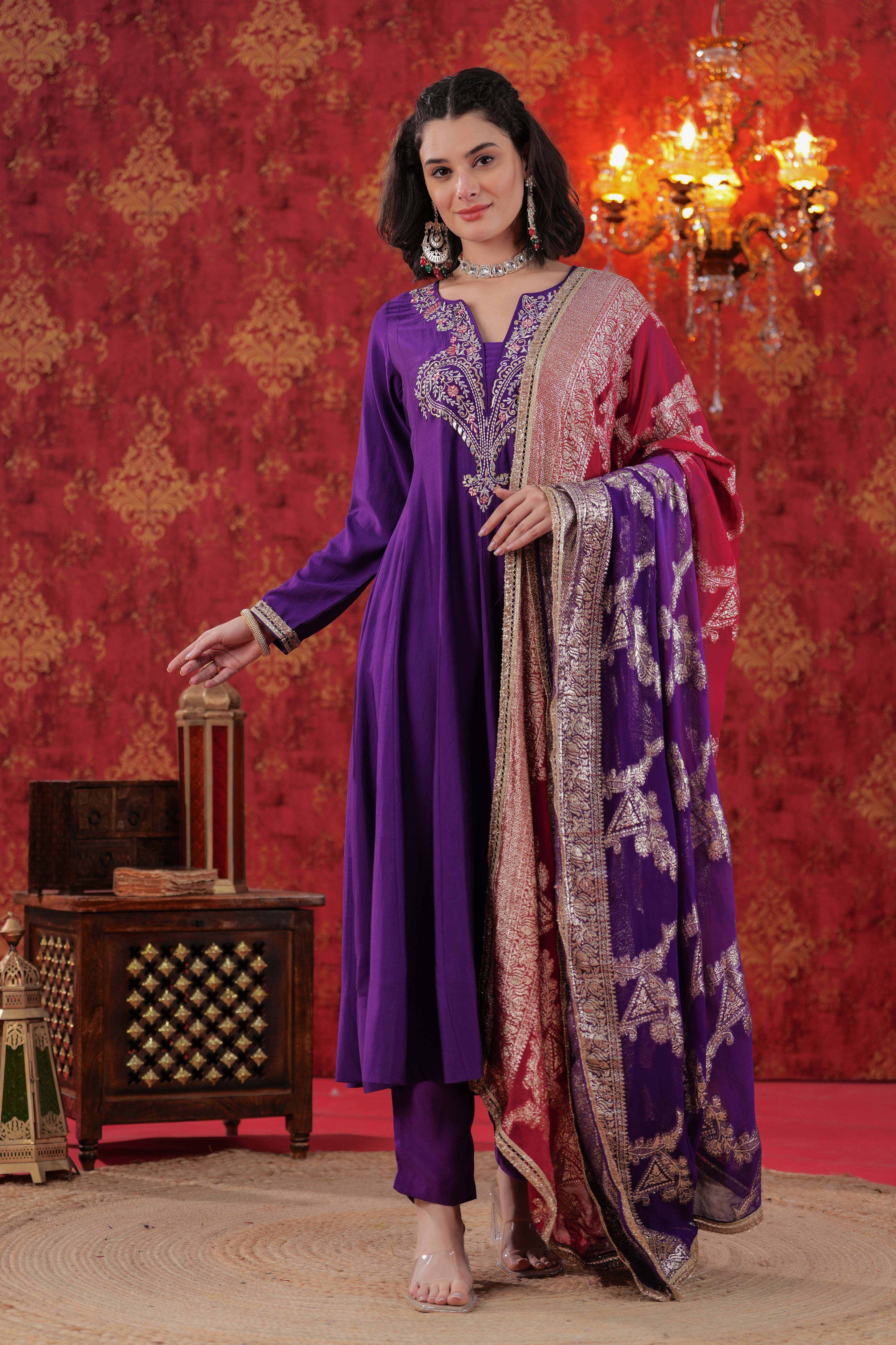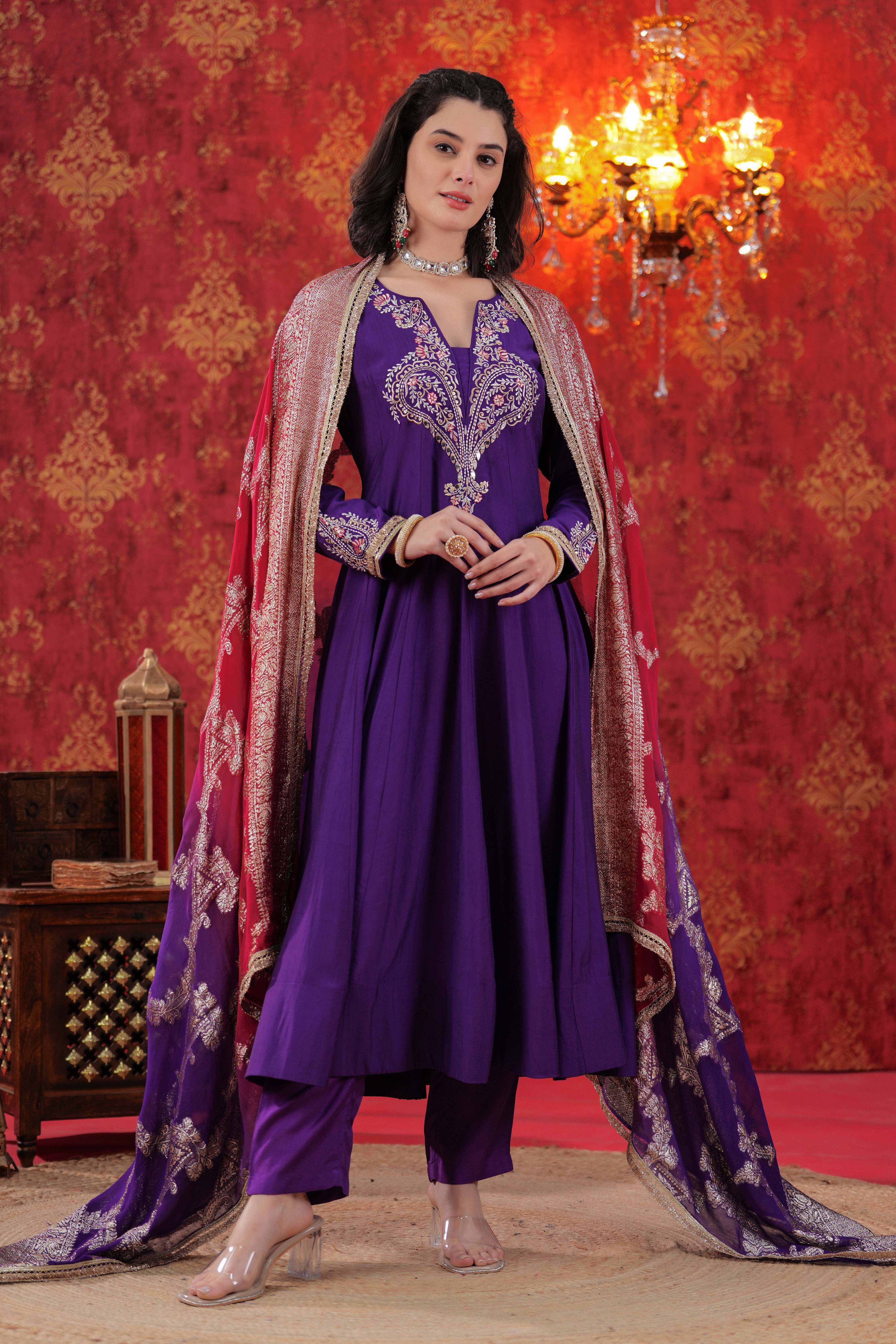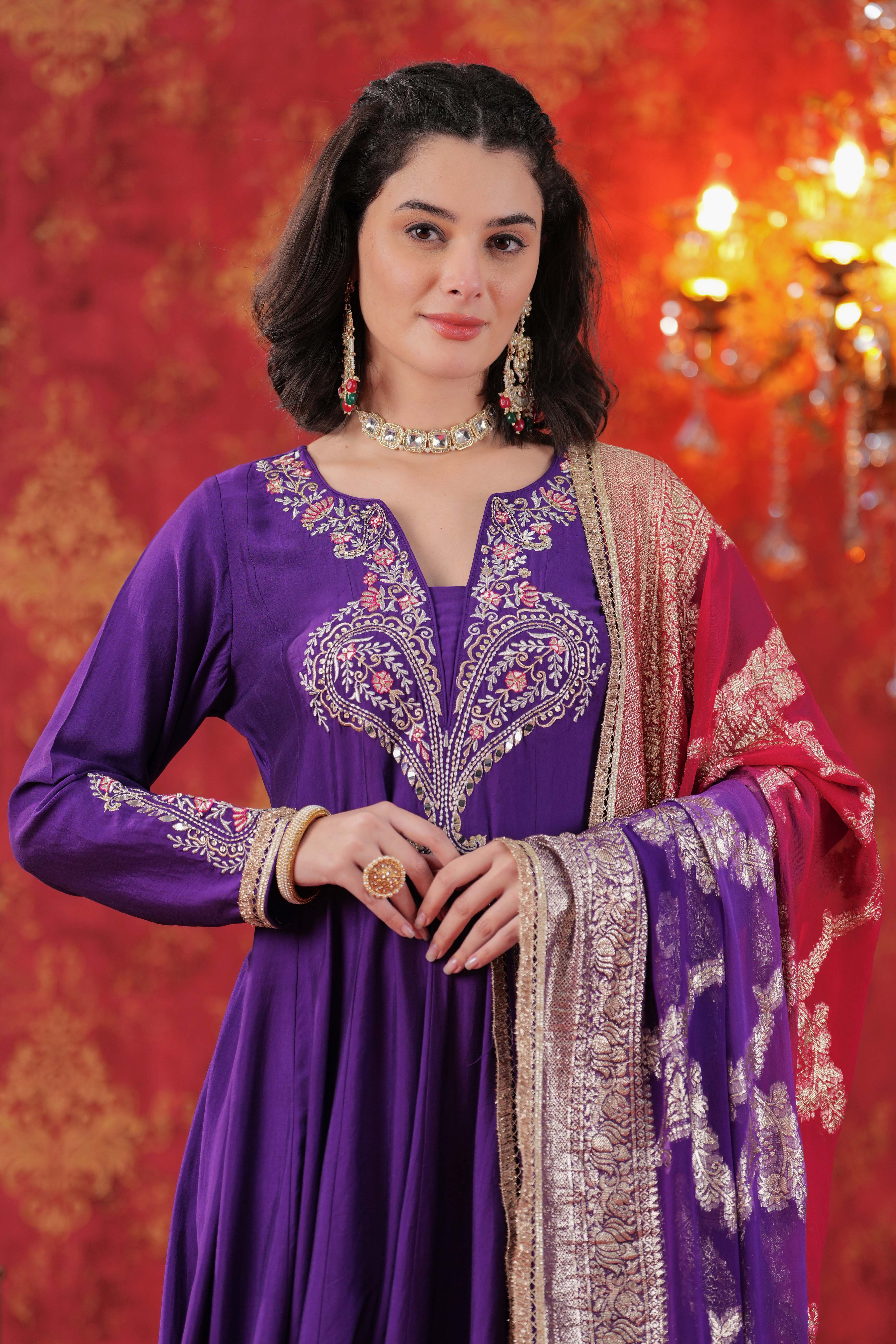 Maharani Vibes Purple Indira Anarkali Set with Ombre Dupatta- Drape yourself in majesty with this purple Missimi silk Anarkali set, featuring a sequinned zari-embroidered yoke, paired with shantoon trousers and an ombre zari georgette dupatta, perfect for timeless festive grandeur.