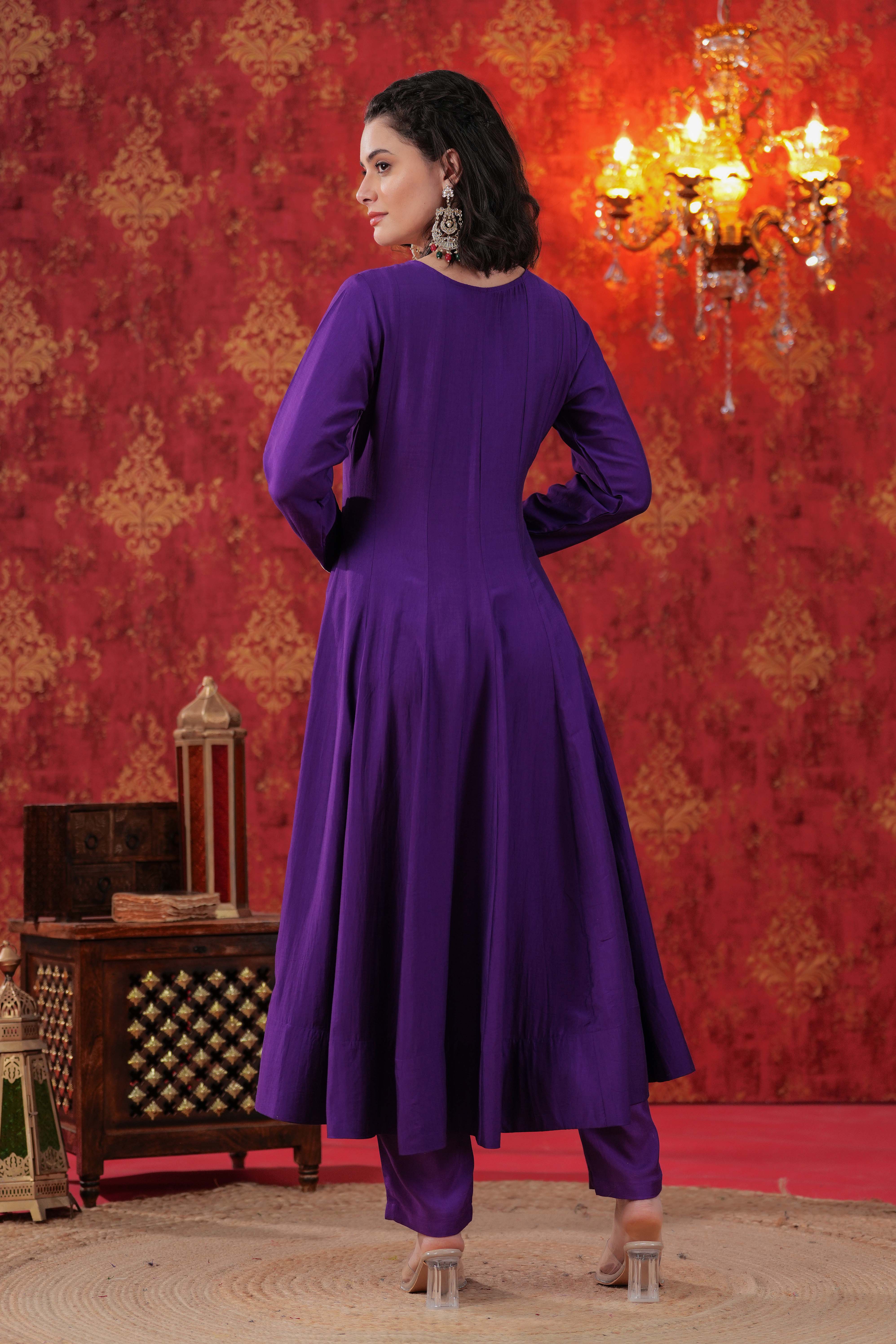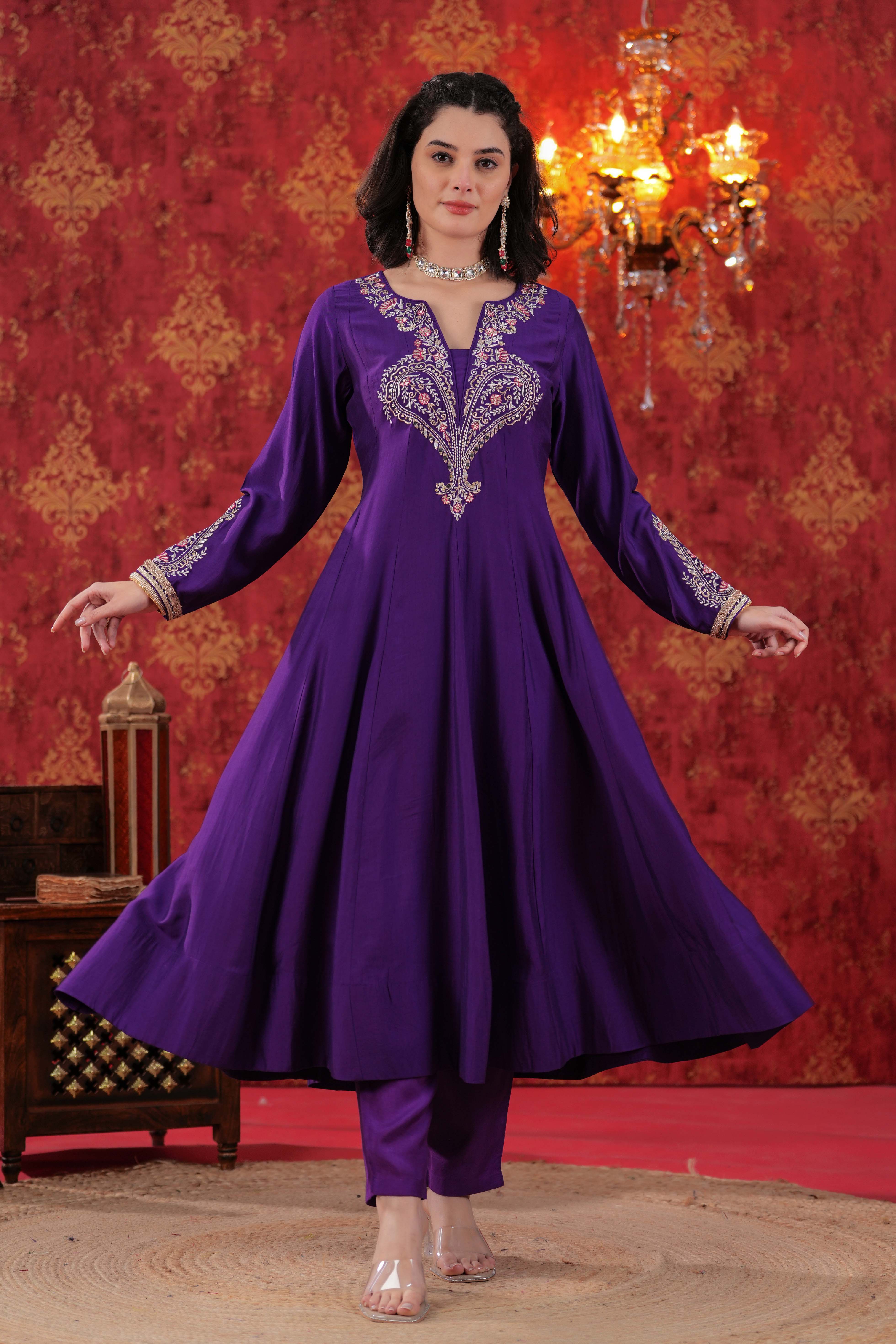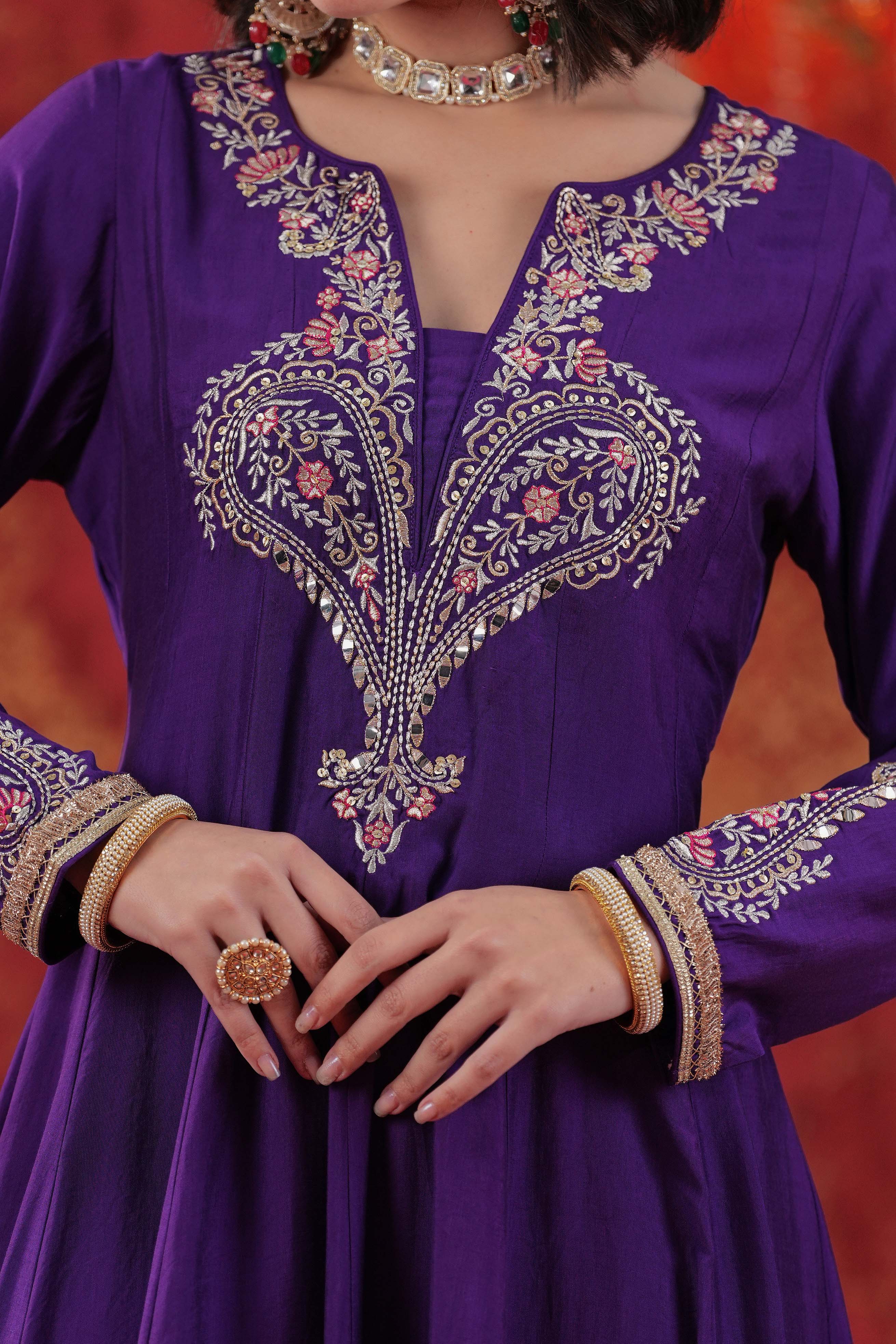 Maharani Vibes Purple Indira Anarkali Set with Ombre Dupatta- Drape yourself in majesty with this purple Missimi silk Anarkali set, featuring a sequinned zari-embroidered yoke, paired with shantoon trousers and an ombre zari georgette dupatta, perfect for timeless festive grandeur.