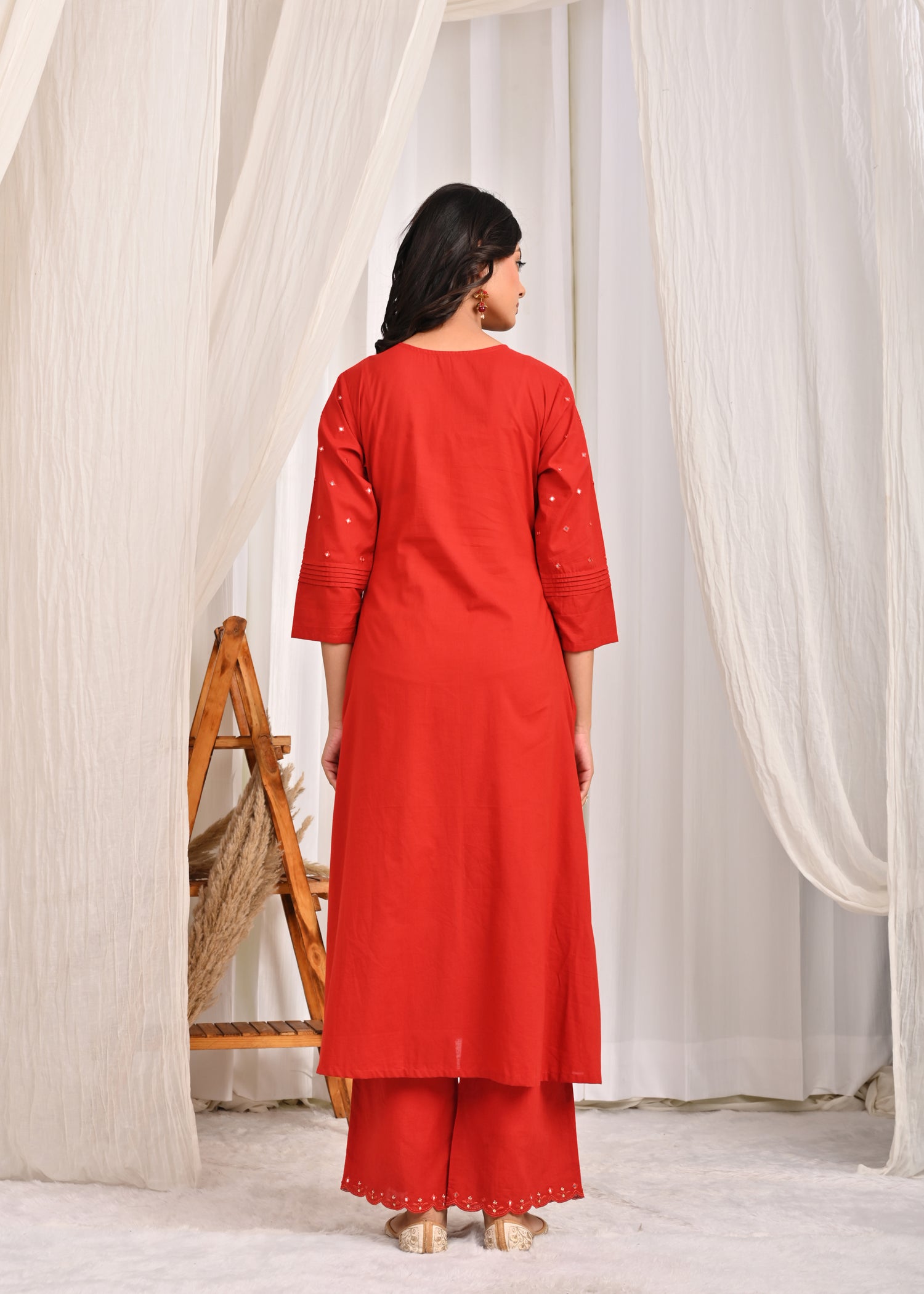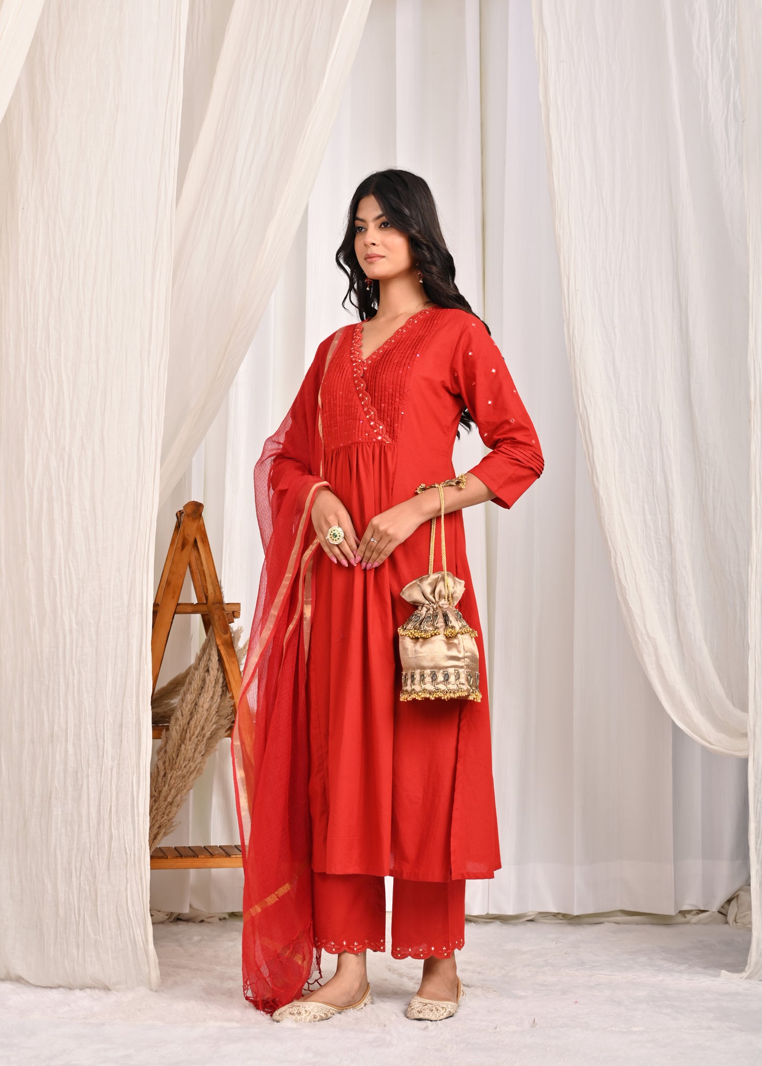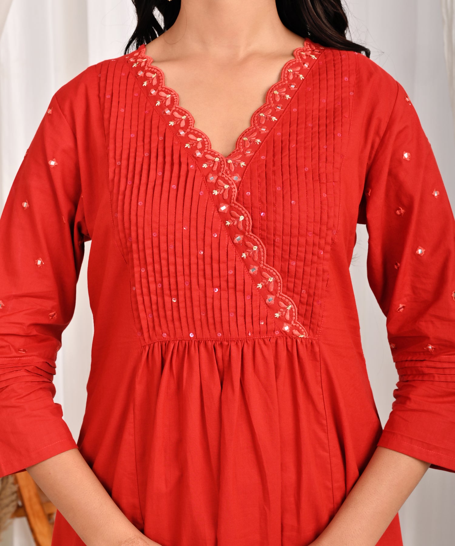 Rangmanch Rangat Pin Tuck A-Line Kurta Kota Doriya Dupatta Set - Step into elegance with this striking Scarlet Red Pure Cotton Kurta Set. The kurta features a flattering V-neckline and a structured pin-tuck yoke brilliantly highlighted with shimmering sequin work. The matching palazzo is exquisitely finished with mirror and resham embroidery along the scalloped hemline. Completing the look is a solid, airy Pure Kota Doria Dupatta, making this ensemble a picture of sophisticated, traditional charm.
