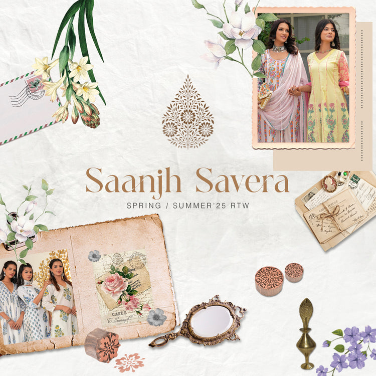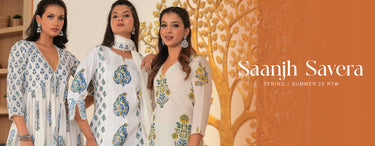 Saanj Savera Palm Tree Block Print Kurta Salwar Set -The Saanj Savera Palm Tree Block Print Kurta Salwar Set blends nature-inspired design with contemporary style. The A-line, pin-tucked kurta features a striking Palm Tree block print and a chic front placket adorned with Kantha...- Rs. 3,799.00