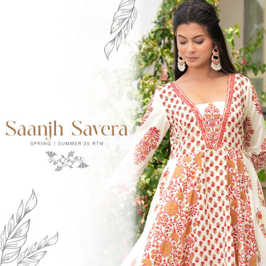 Saanj Savera Gulnaar Pink & White Anarkali Set -The Saanj Savera Gulnaar Pink & White Anarkali Set is a playful yet elegant ensemble crafted in soft cotton. The short Anarkali flared kurta features delicate Sanganeri prints and a flattering V-neckline accented with crochet lace...- Rs. 5,495.00