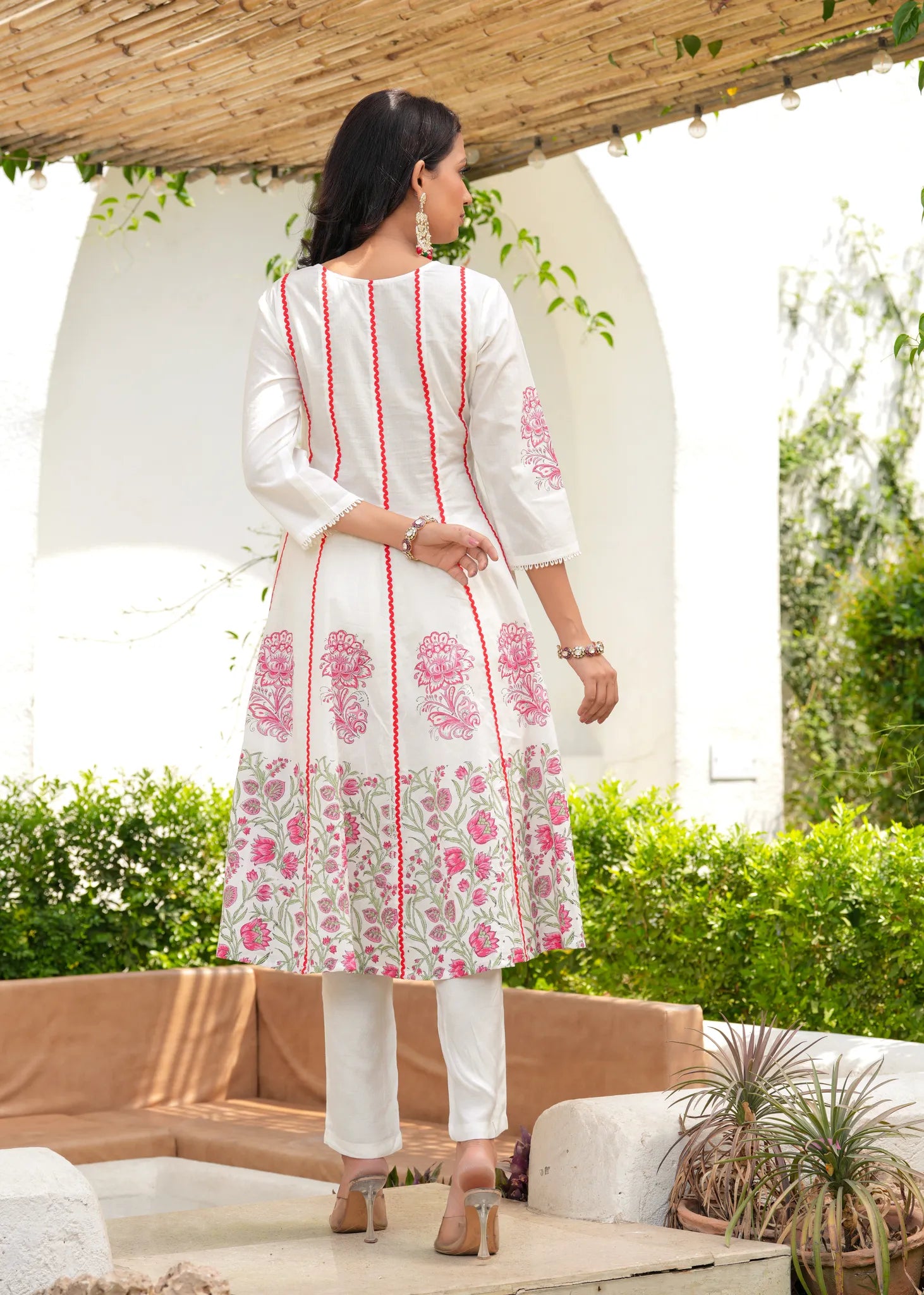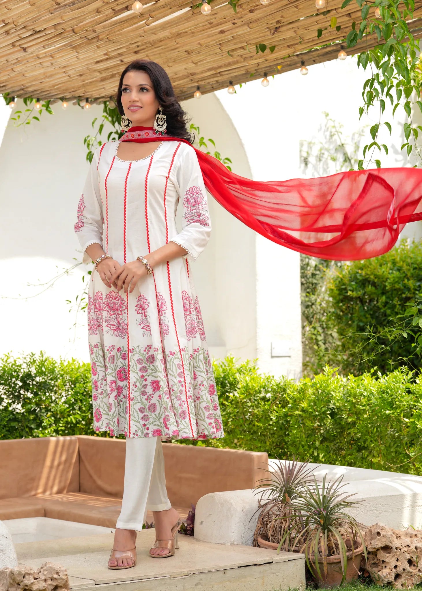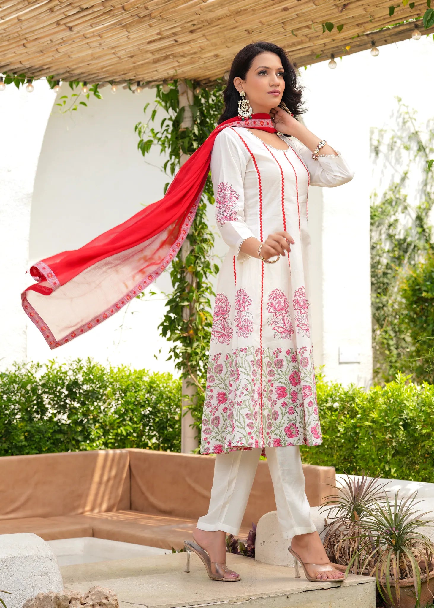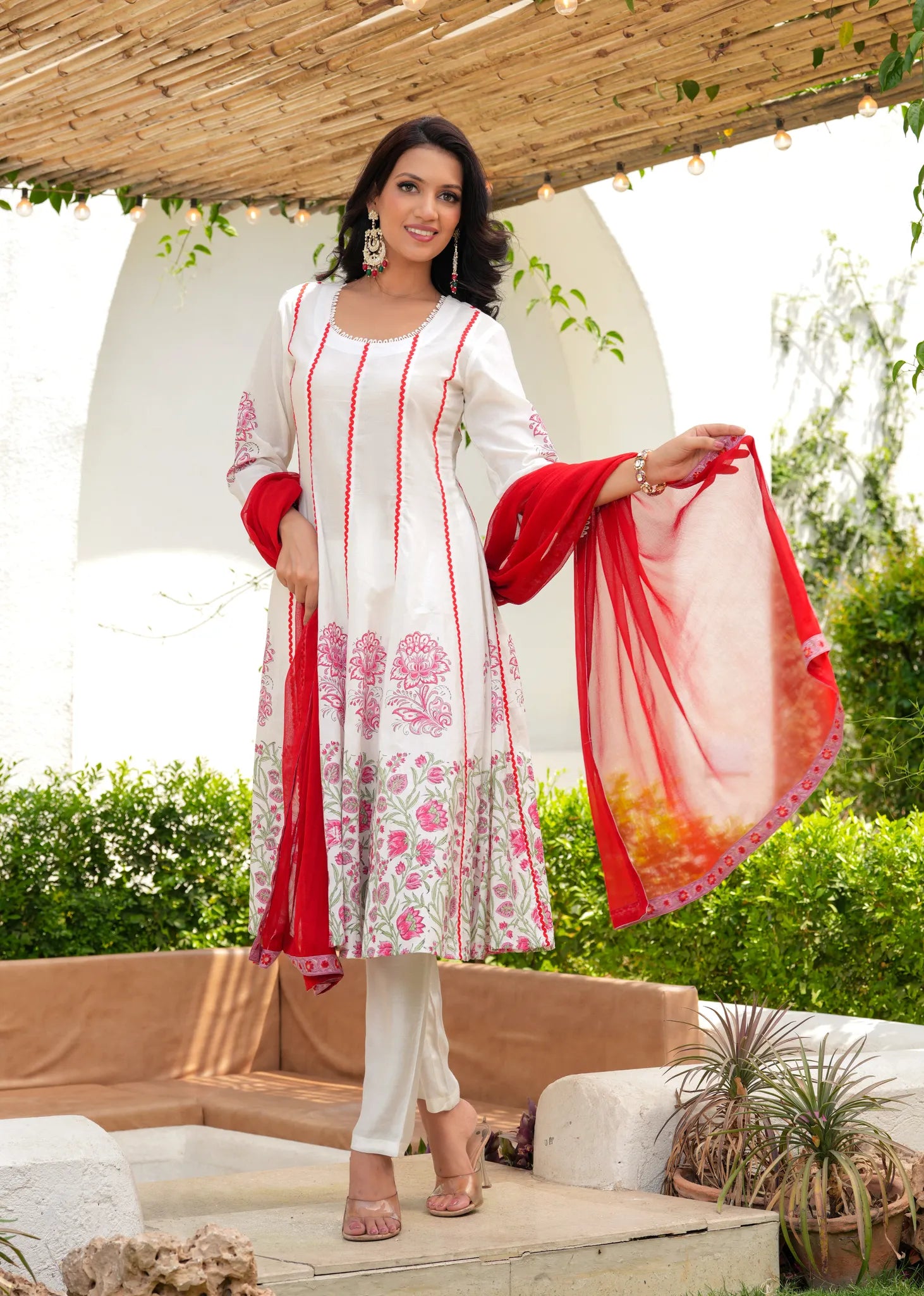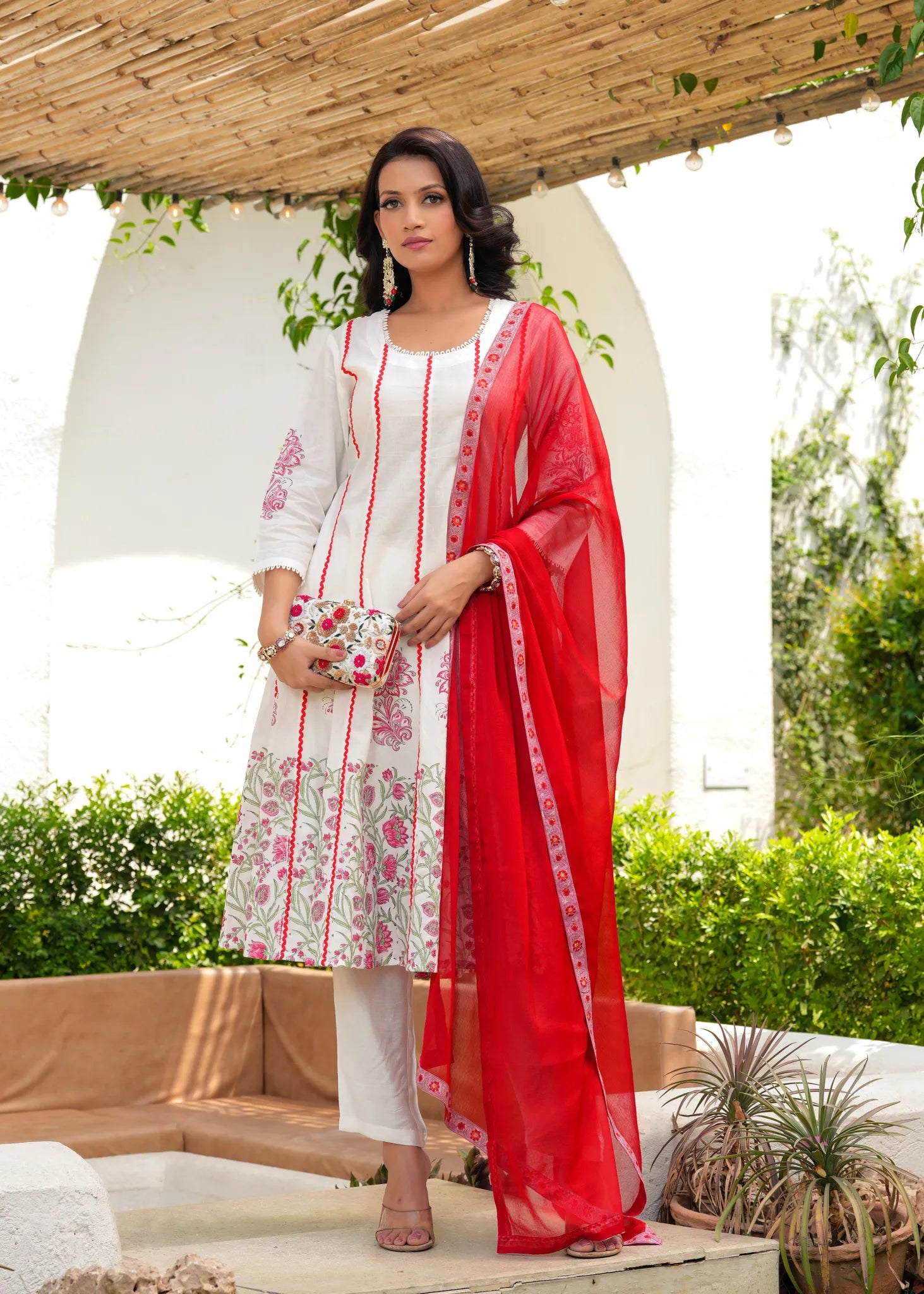 Saanj Savera Aabha Pristine White Hand Blocked Anarkali Set - The Saanj Savera Abha Pristine White Handblocked Anarkali Set is a vision of timeless elegance. Crafted in soft white cotton, the floral block-printed Anarkali kurta features striking red zig-zag lace detailing along the kalis and a classic round neckline. Paired with solid pants and a contrasting red chiffon dupatta with delicate border edging, this set blends purity with vibrant charm—perfect for refined festive looks.