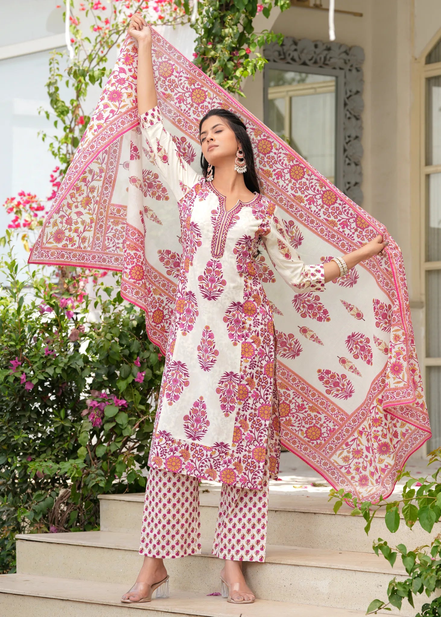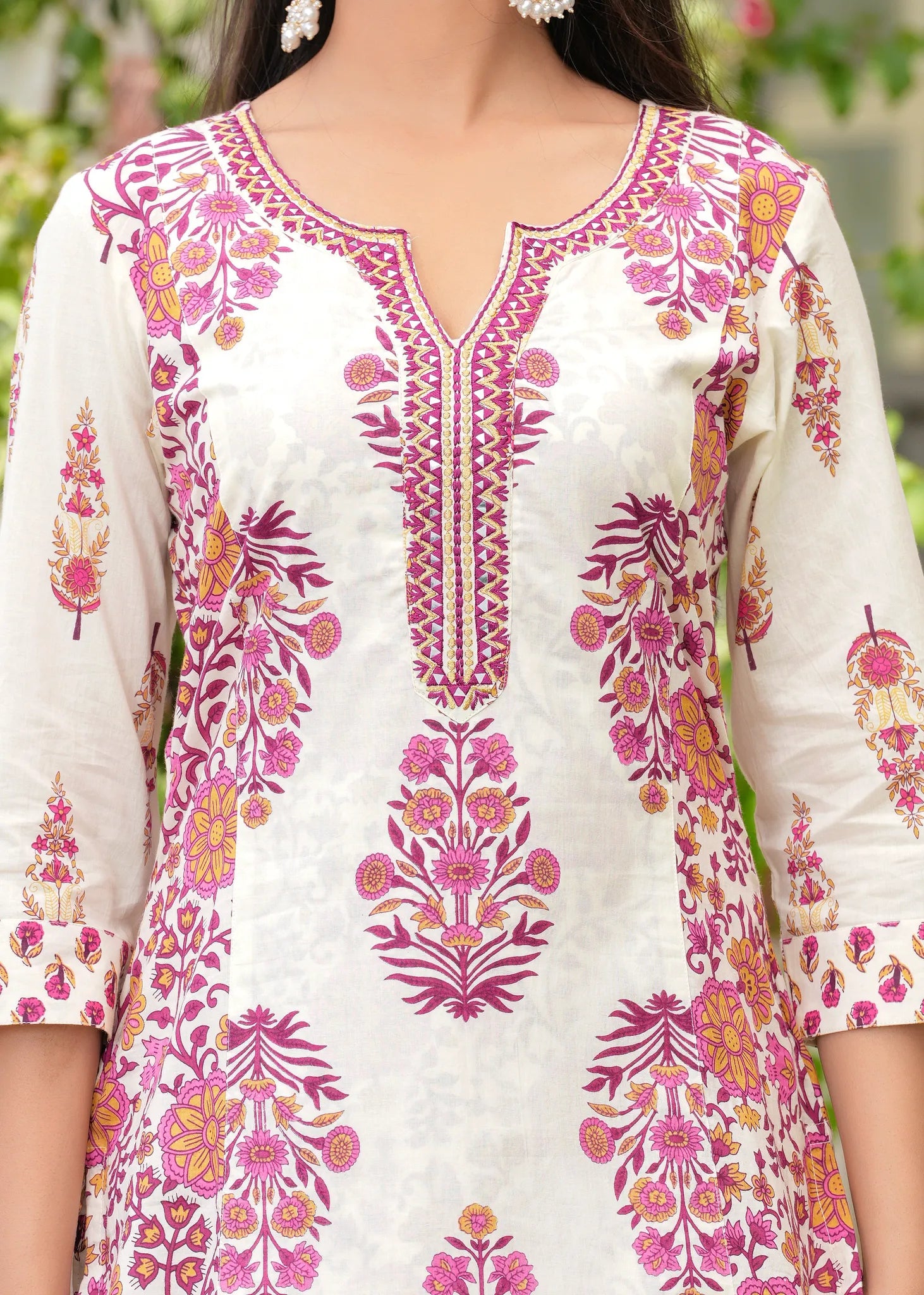 Saanj Savera Aarohi Rani Pink Mirror Work Cotton Kurta Set - The Saanj Savera Aarohi Rani Pink Cotton Kurta Set is a vibrant blend of tradition and elegance. Made from soft cotton, the straight-fit kurta showcases ethnic floral prints, elevated by intricate mirror and resham work on the yoke. Paired with a matching printed palazzo and a pure cotton floral-printed dupatta, this set is perfect for festive moments and graceful daytime gatherings.