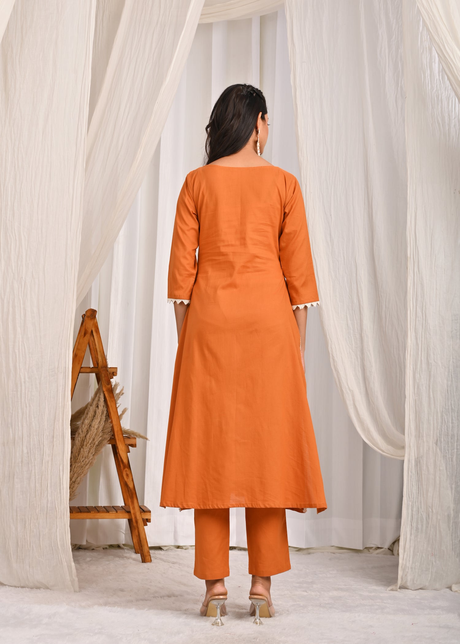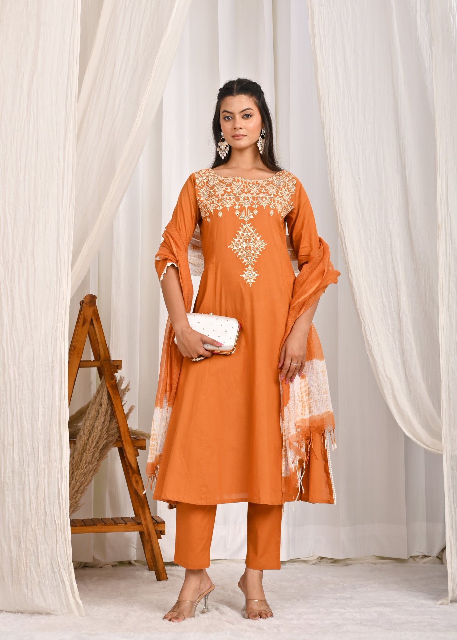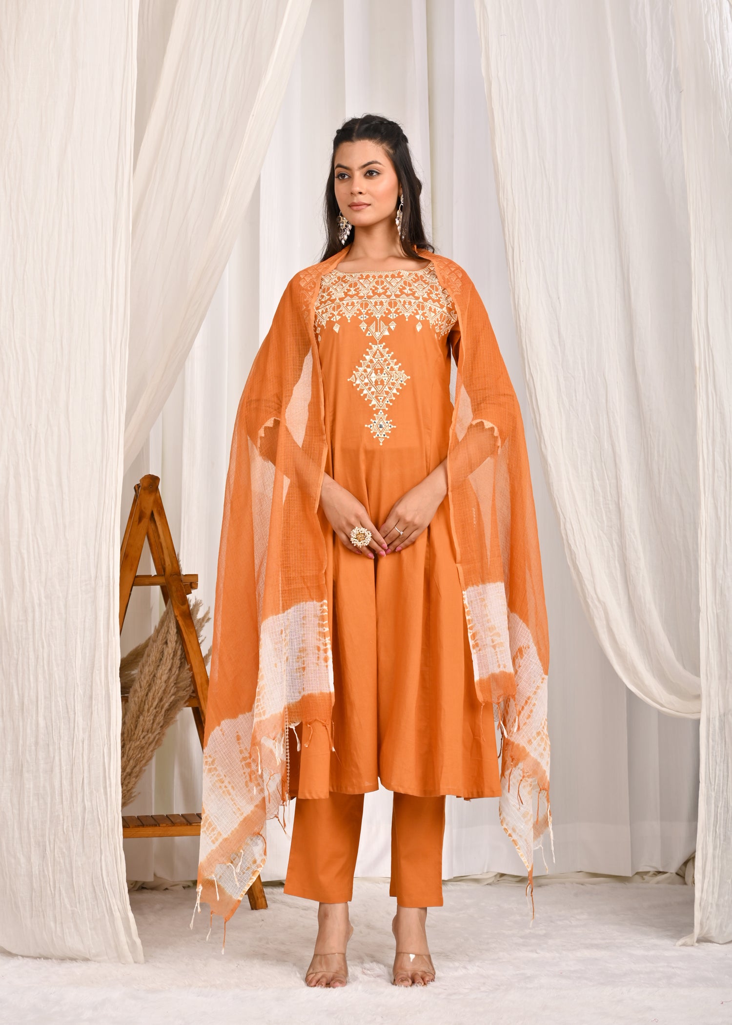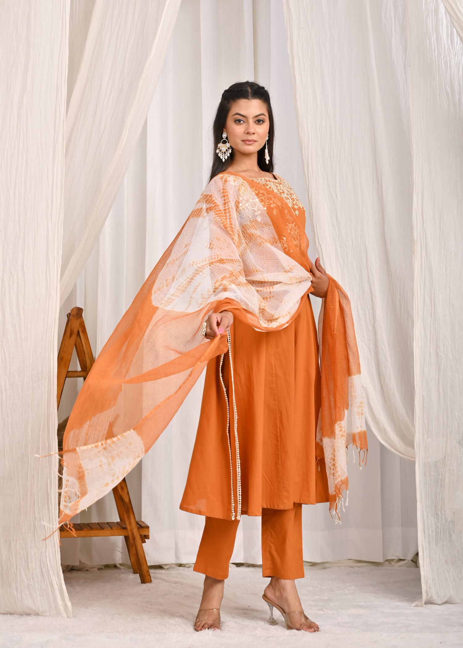 Rangmanch Basanti Embroidered A-Line Kurta Set with Bandhej Dupatta-Brighten your wardrobe with this exquisite Marigold Yellow Pure Cotton Kurta Set. The kurta, crafted from comfortable cotton, features an elegant boat neckline and a beautifully embroidered yoke with shimmering Mirror work and fine Resham embroidery. Delicate crochet lace detailing finishes the look, perfectly complementing the solid pants and the vibrant Bandhej Tie & Dye Kota Doria Dupatta. This ensemble is a celebration of festive color and refined craftsmanship.
