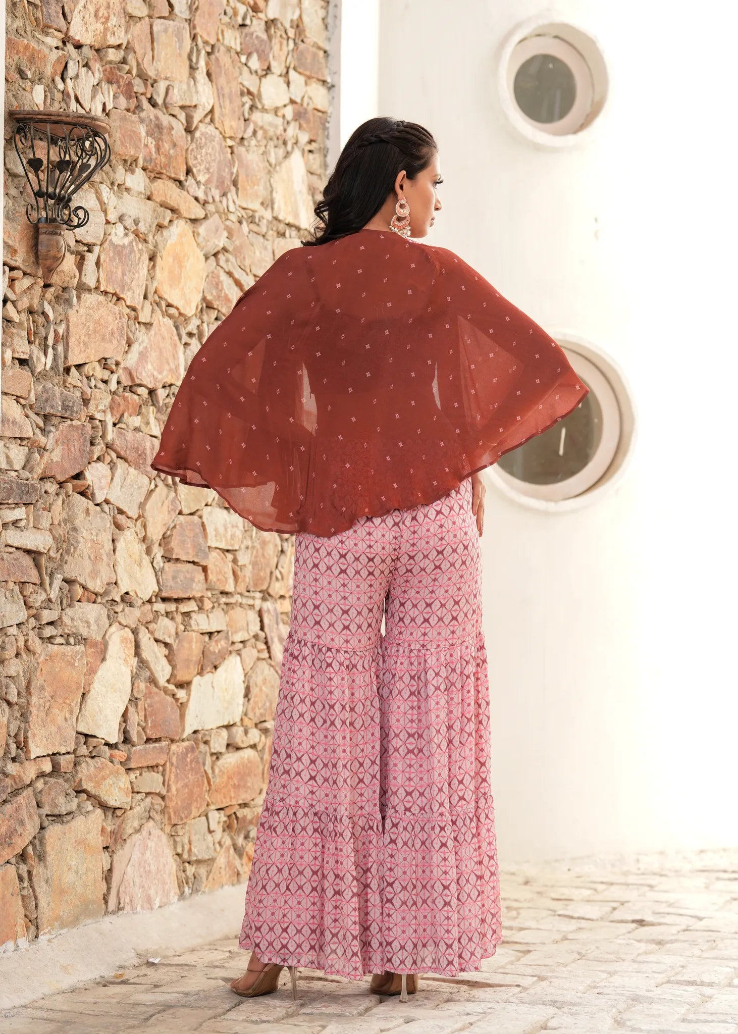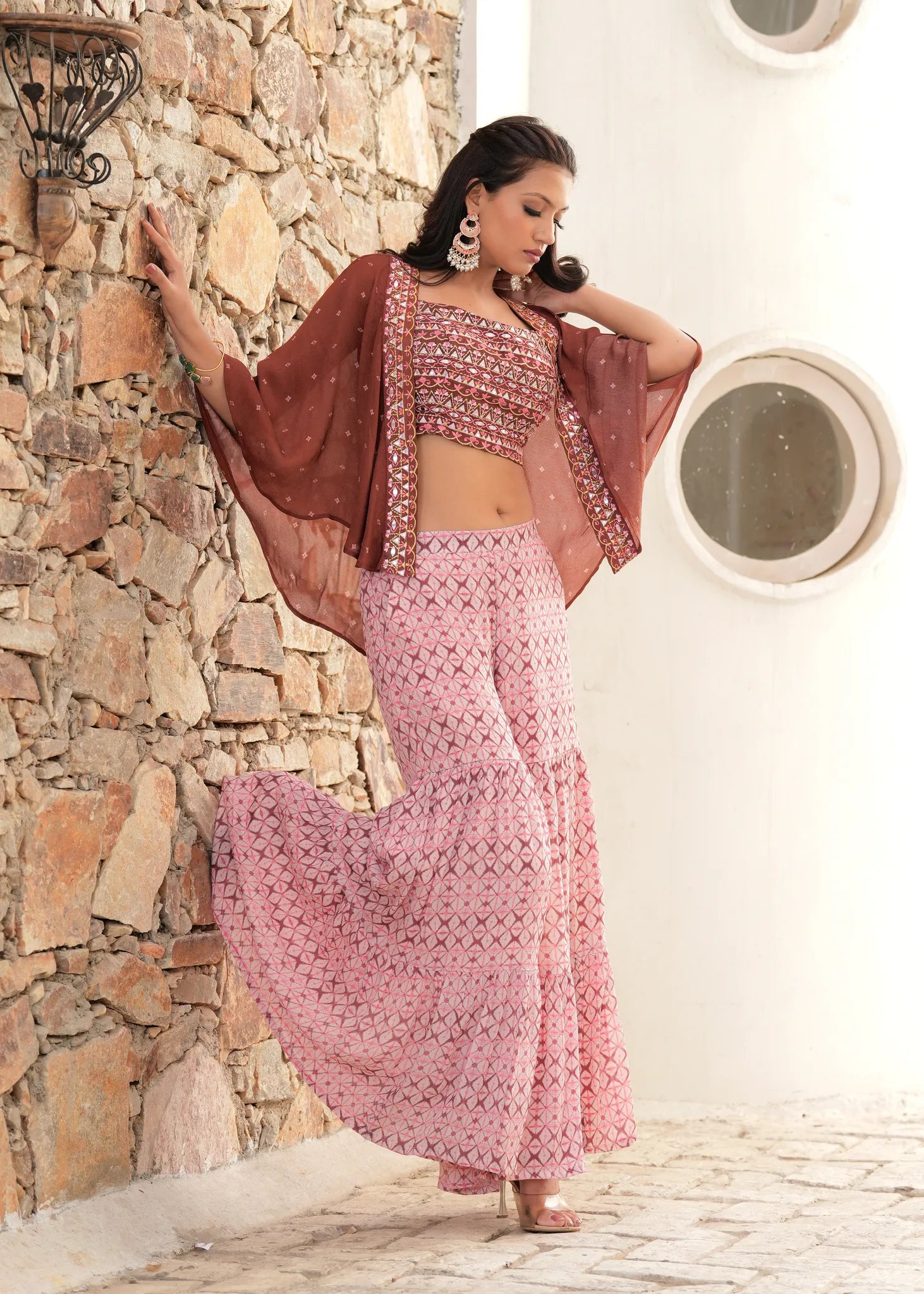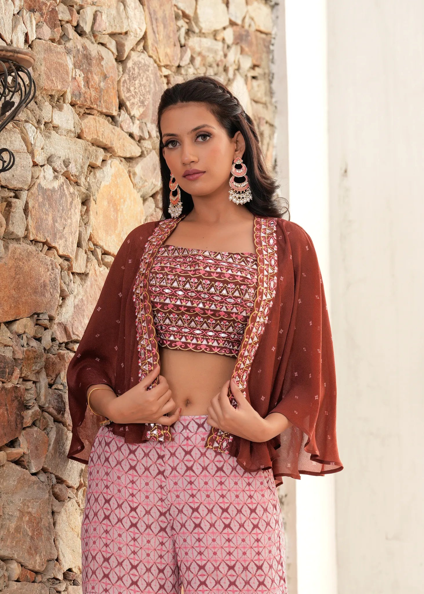 Banjaran Biscuit Brown Cape & Mirror Work Top with Sharara Fusion Set -Step into effortless elegance with the Banjaran Biscuit Brown Cape & Mirror Work Top with Sharara Fusion Set, crafted in airy Chinon chiffon. The chic crop top dazzles with intricate hand embroidery—Resham, Zari, and mirror work illuminating every detail. A flowing cape with a delicately embroidered front border adds drama and grace, while the tiered geometric-printed Sharara brings a contemporary twist to traditional charm. Perfect for modern muses who love a hint of heritage.
