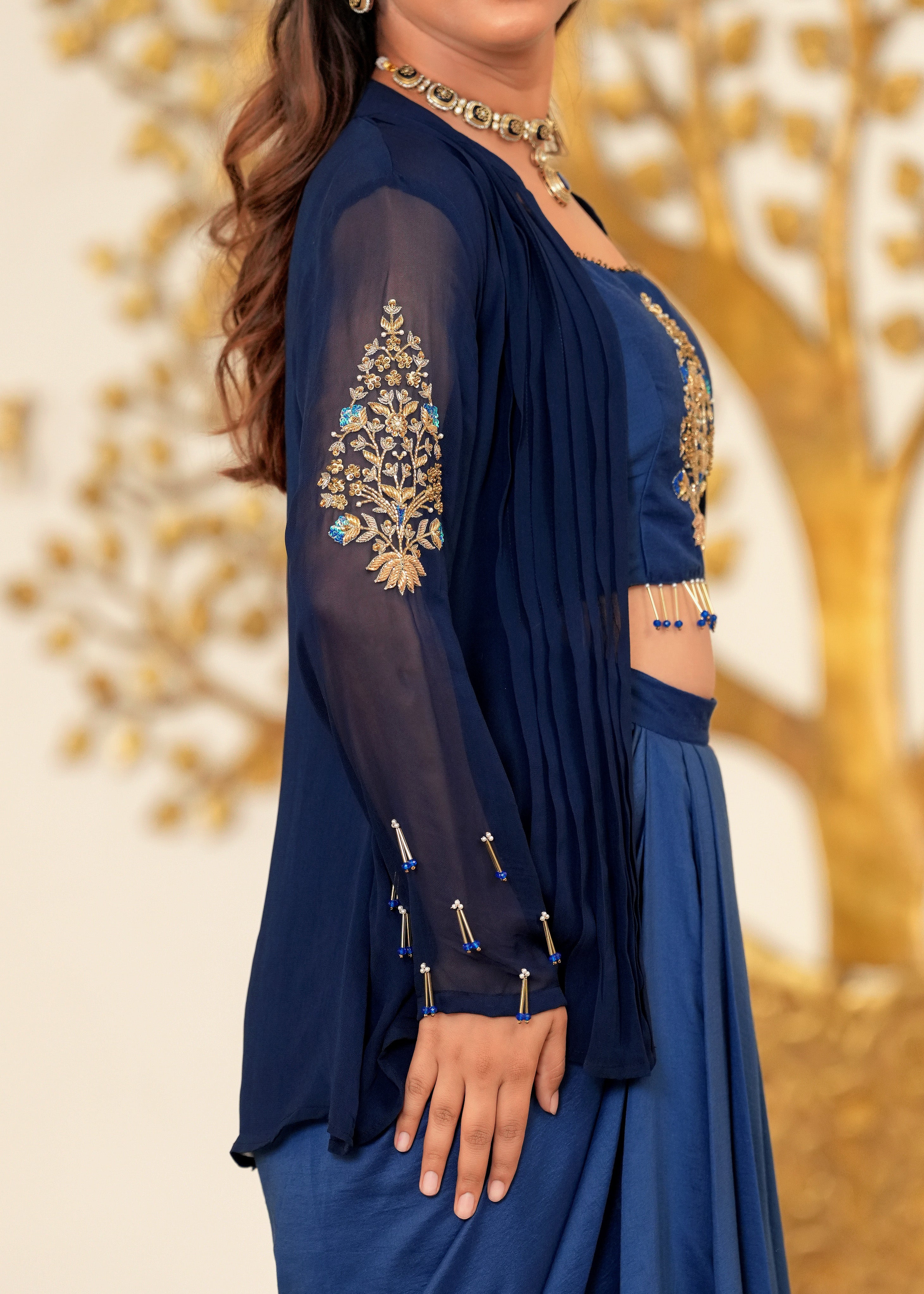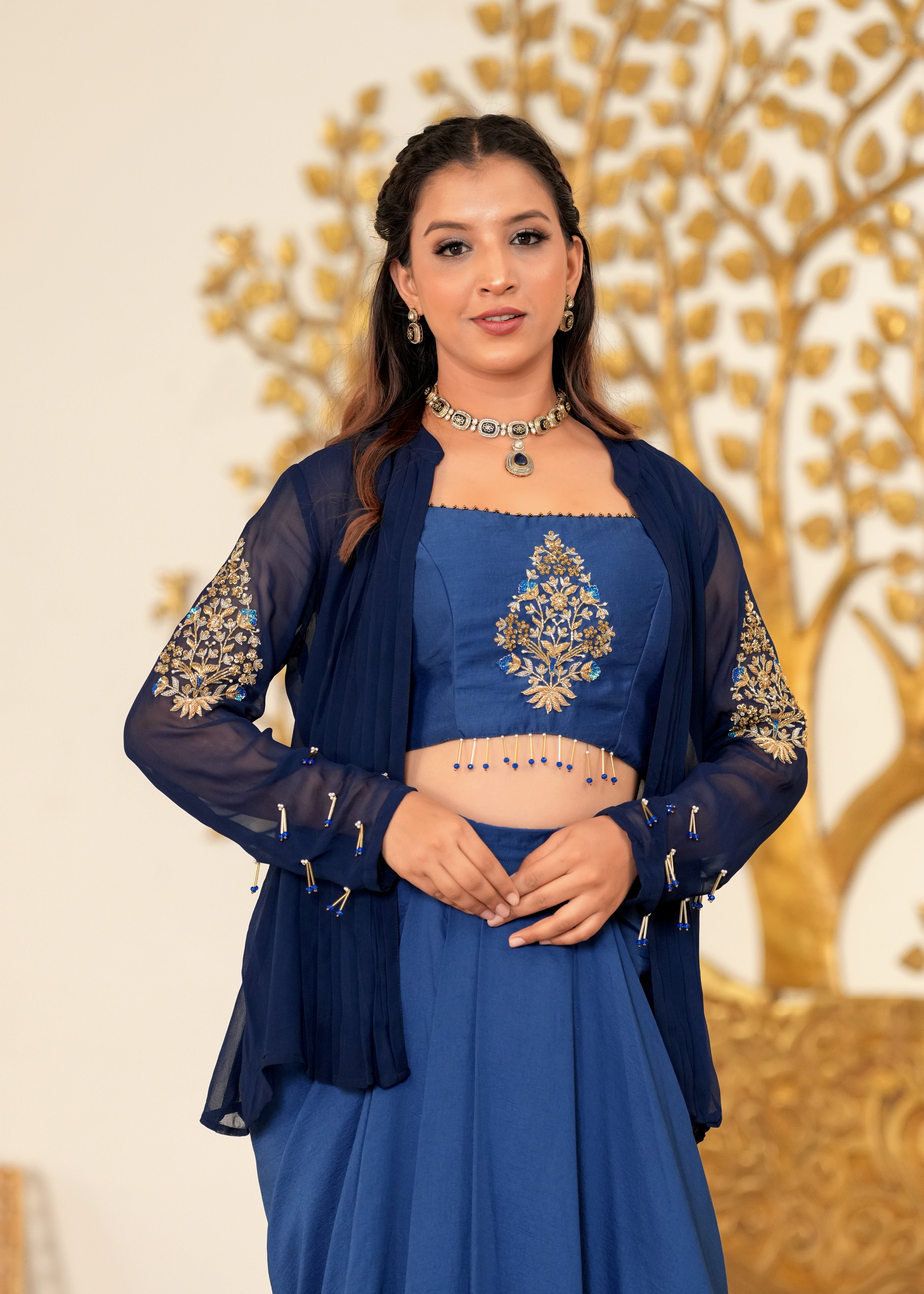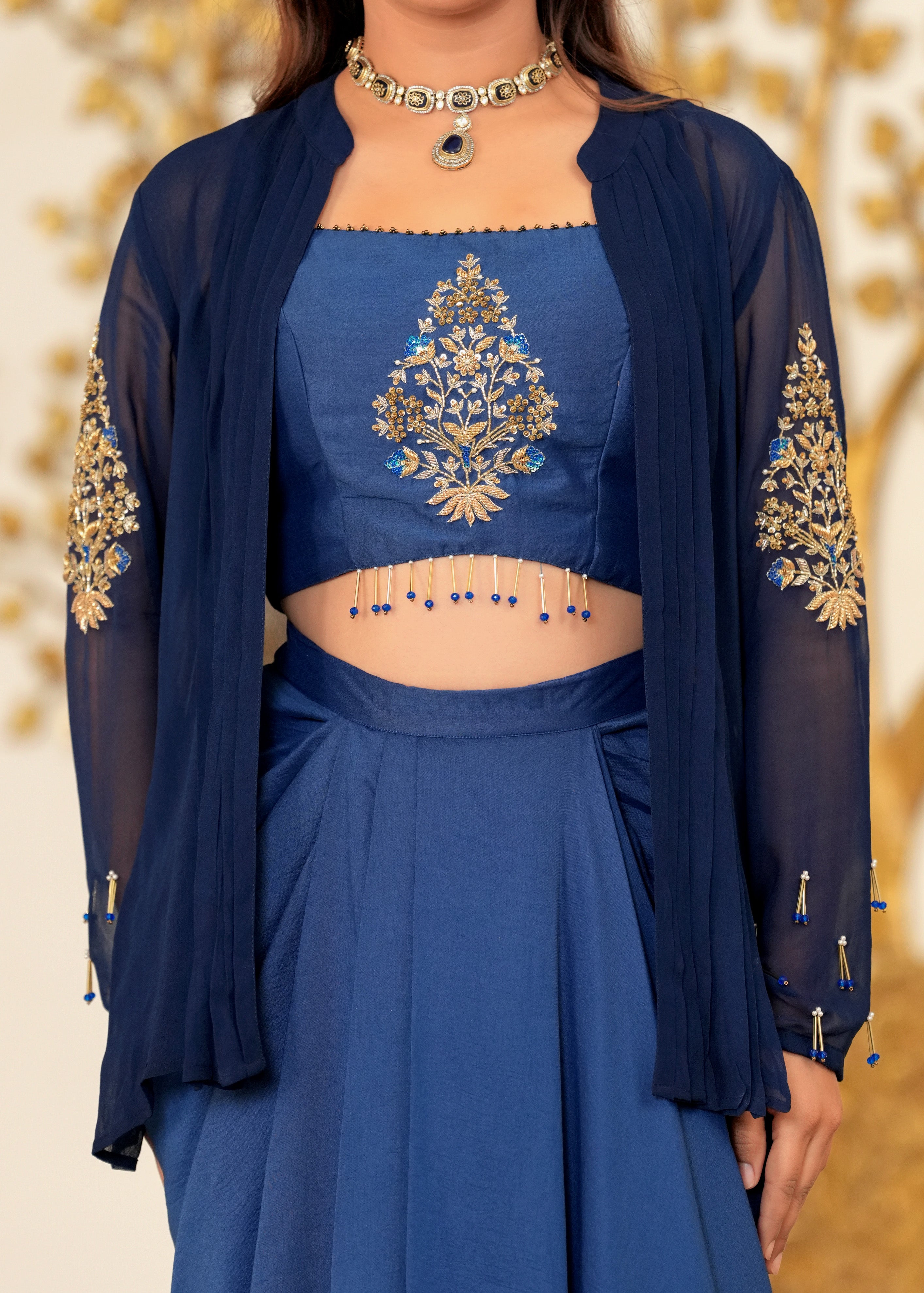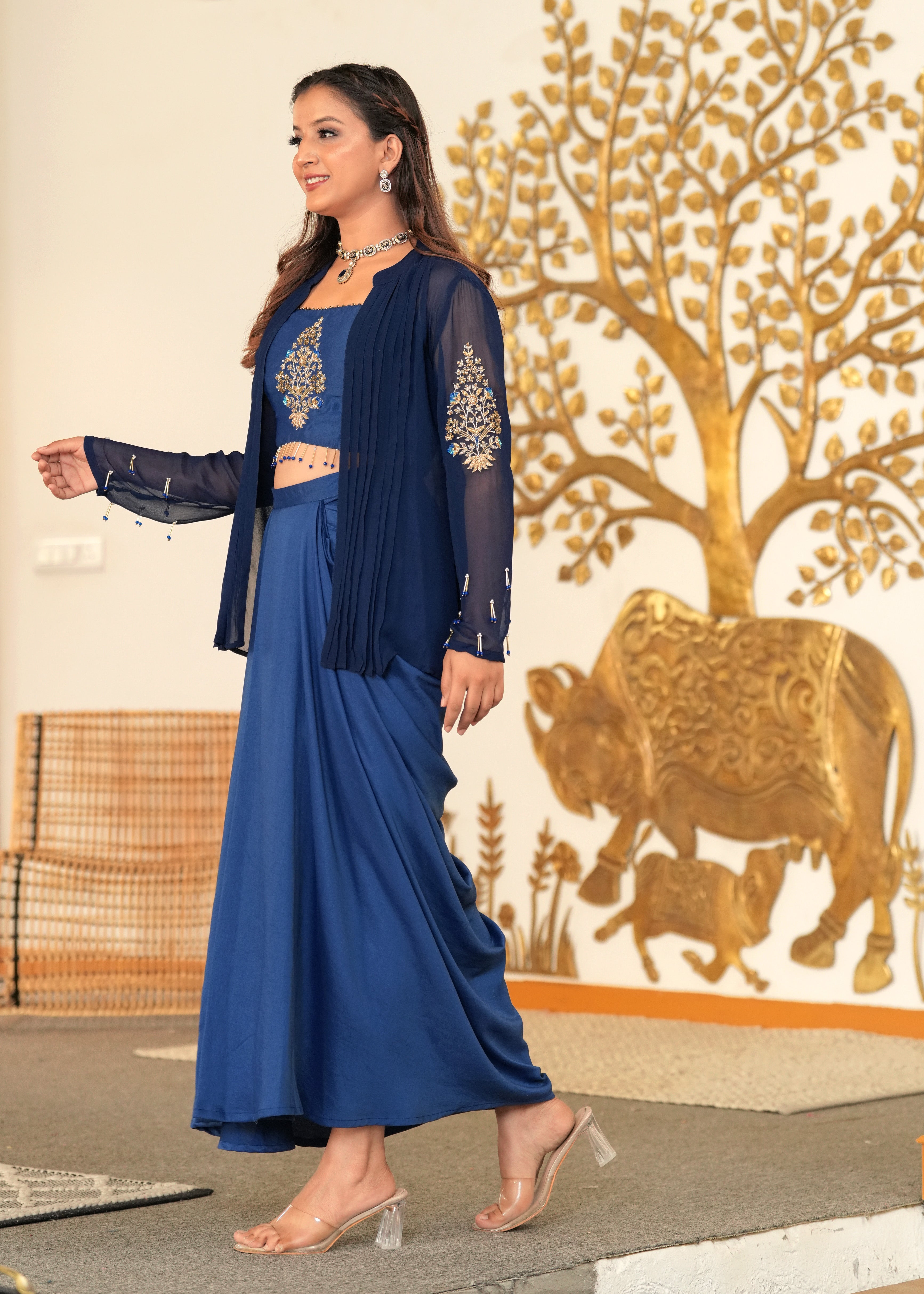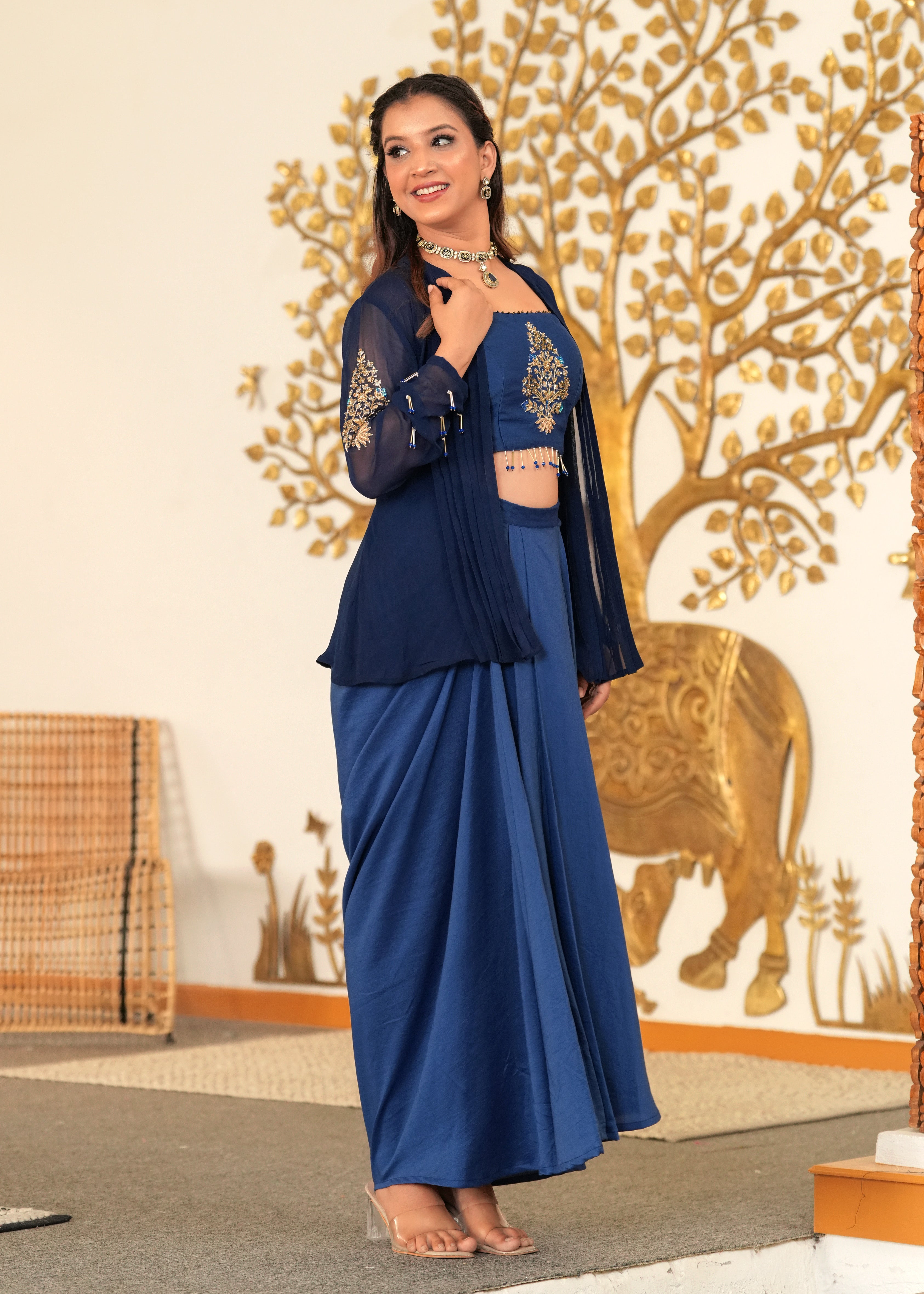 Desi Disco Blue Lagoon Hand Embroidered Draped Skirt Fusion Set- Make a dazzling statement in the Desi Disco Blue Lagoon Draped Skirt Set. Featuring a hand-embroidered zardozi bustier, pintucked jacket, and fluid draped skirt in silk and georgette, this striking blue ensemble fuses artisanal detail with contemporary allure—perfect for weddings and evening soirées.