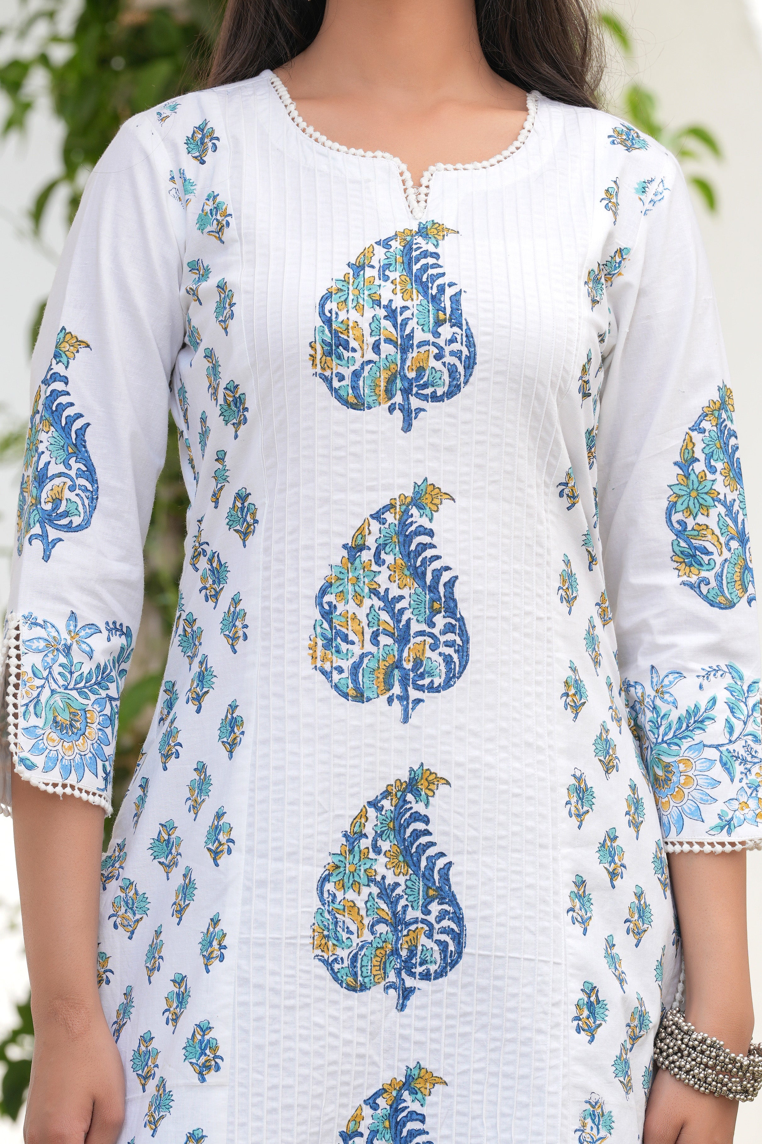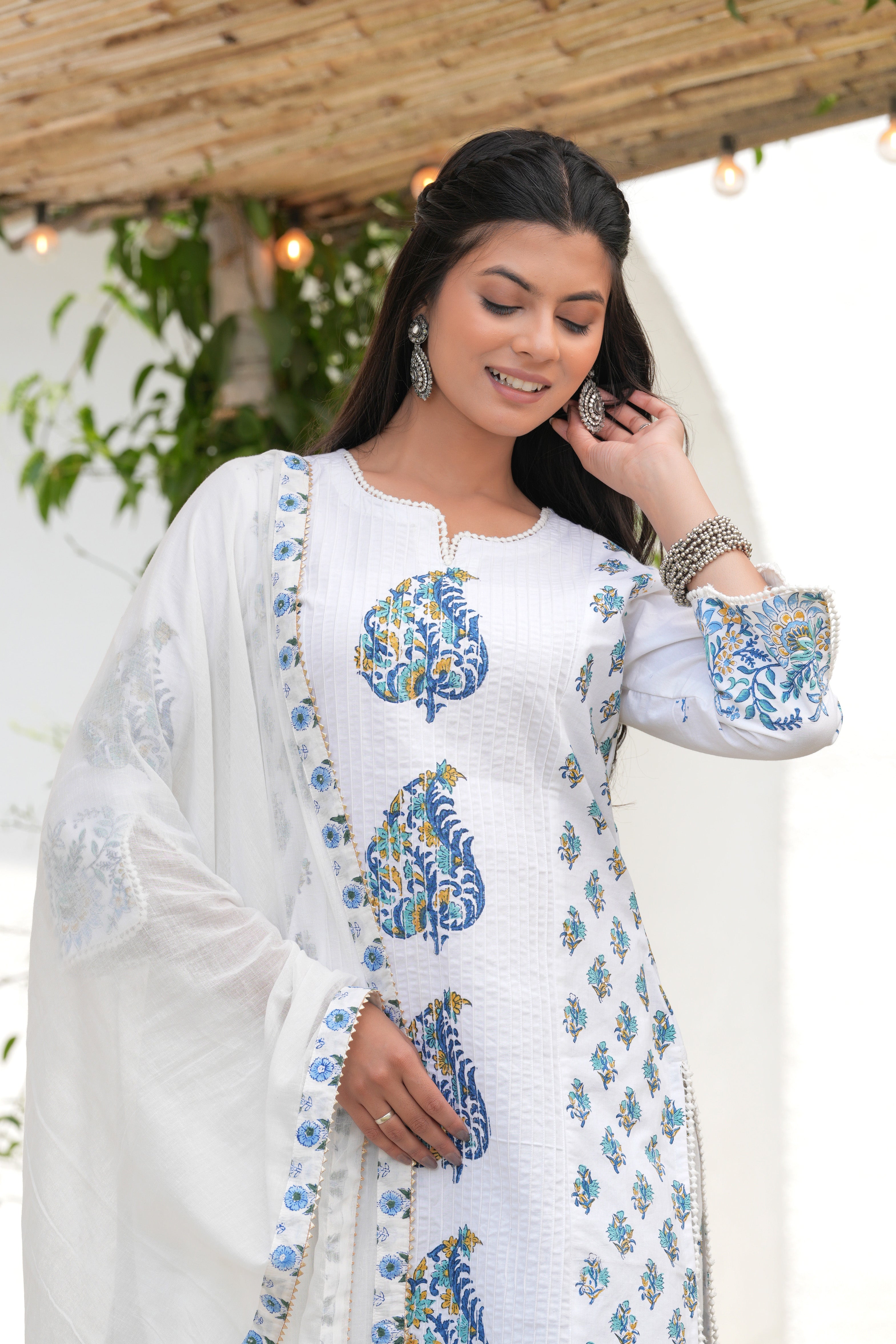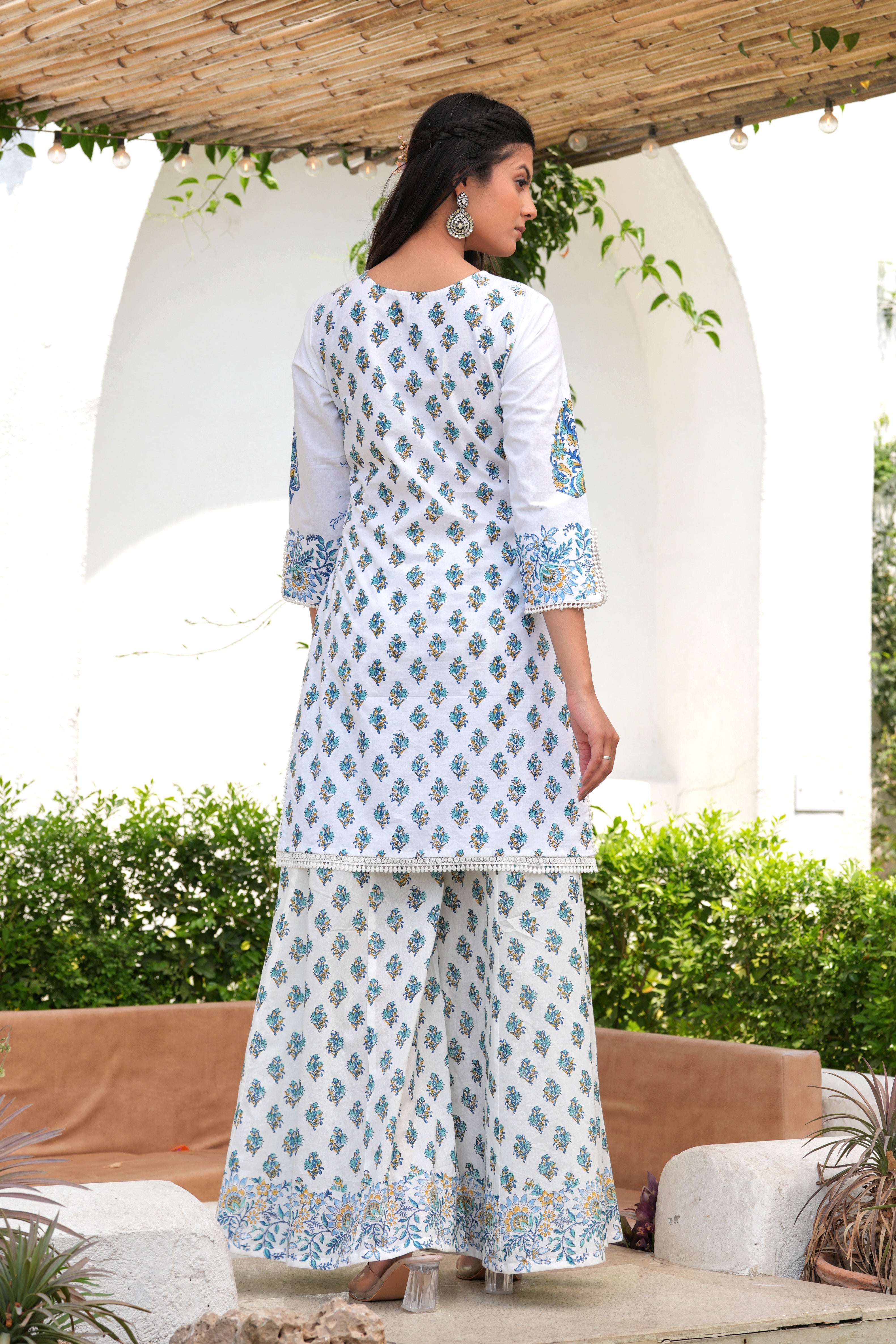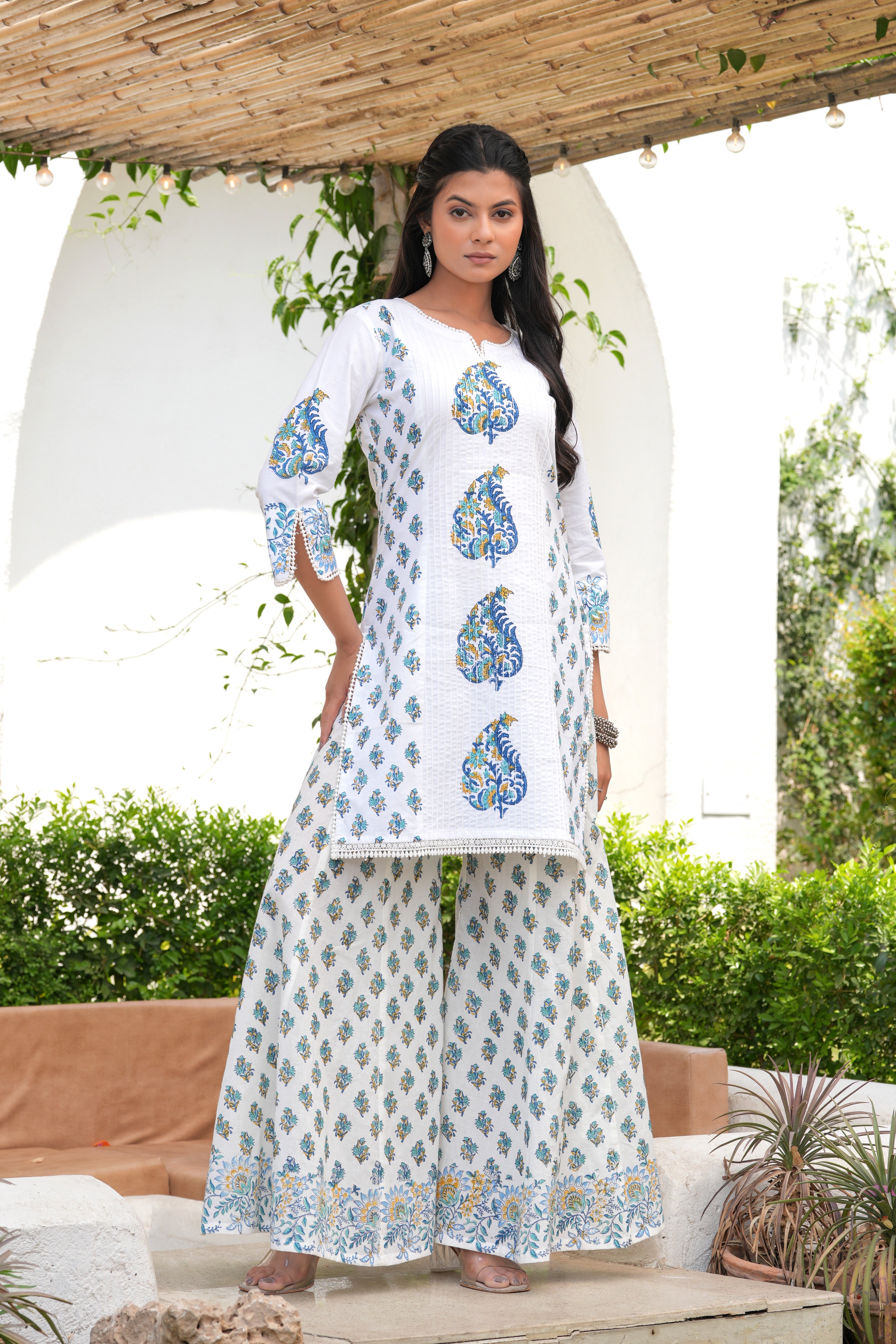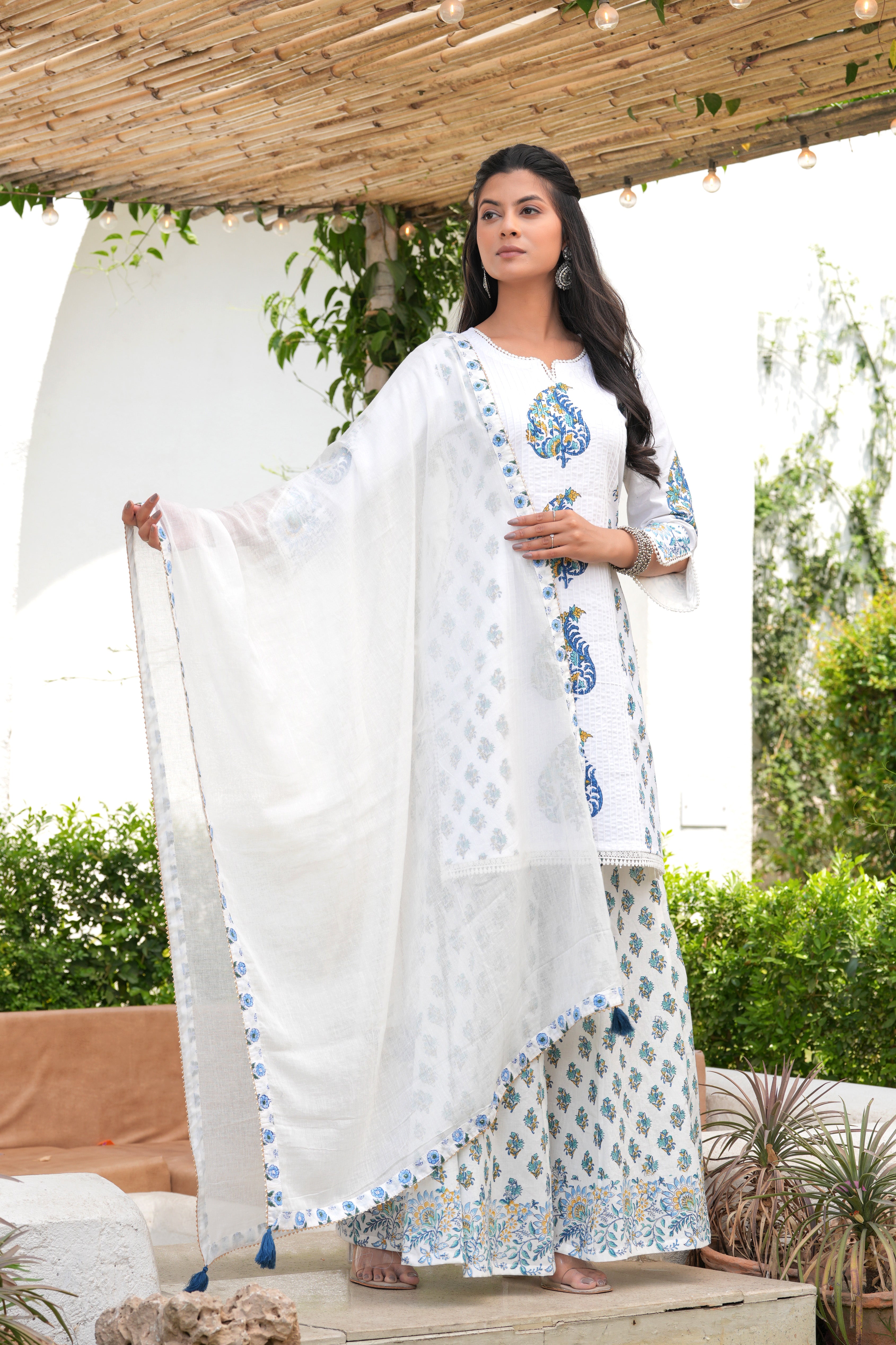 Saanjh Savera Blue Pottery Hand Blocked Print Kurta Set- Blue Pottery Kurta Set marries tradition with contemporary elegance, featuring a straight-fit kurta adorned with intricate floral block prints and delicate crochet lace at the neckline. Paired with flared palazzos and a bordered cotton mulmul dupatta, it exudes timeless sophistication for festive affairs.