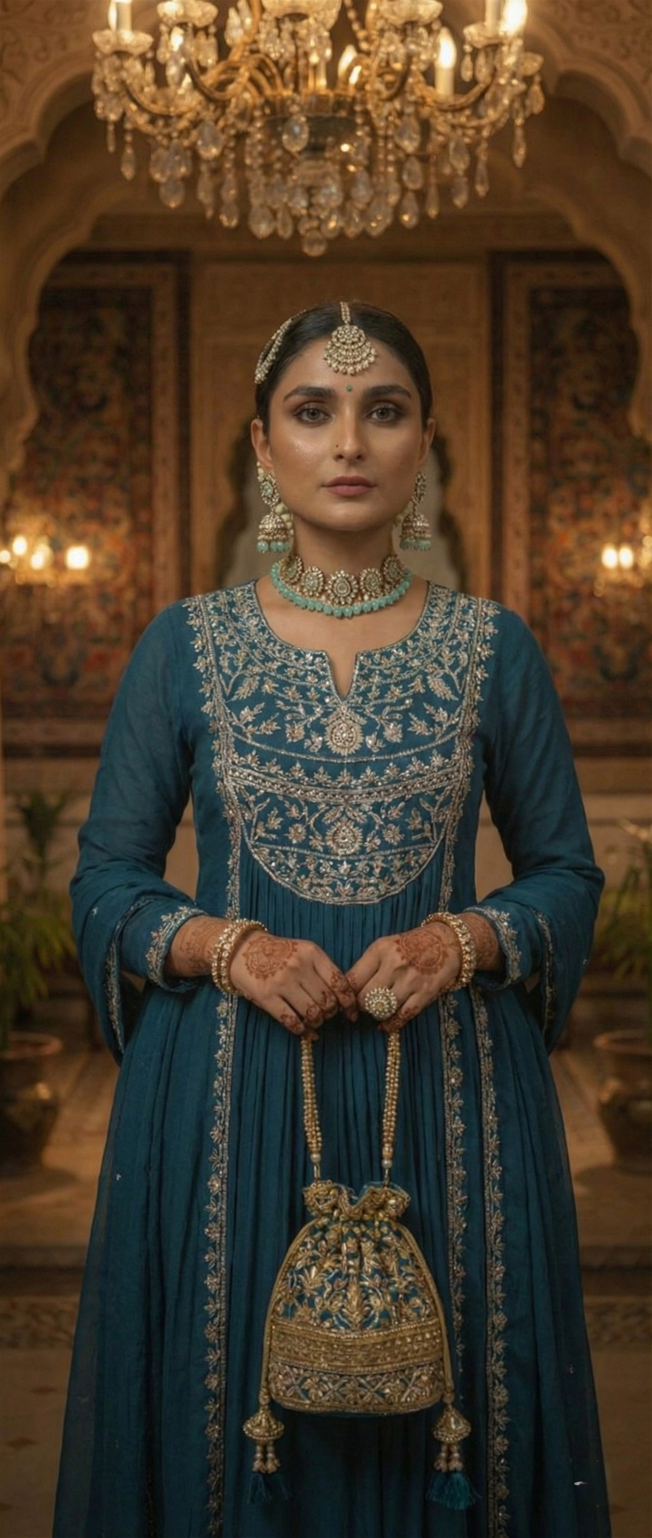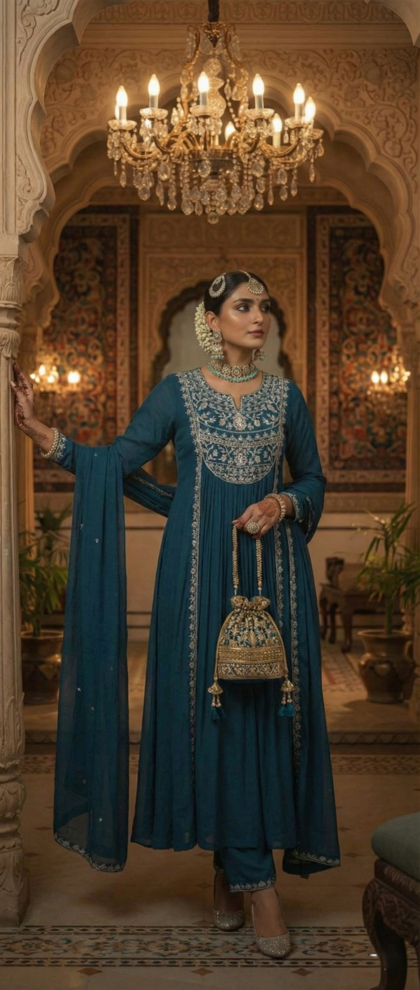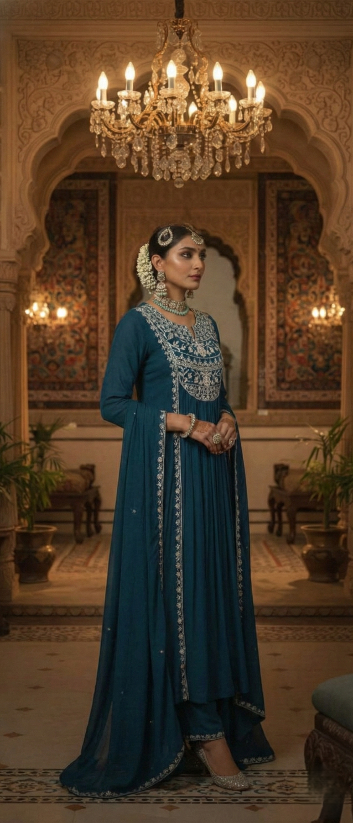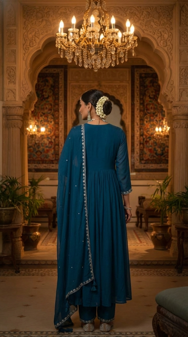 Exude an aura of divine grace in this Blue A-line gathered kurta, meticulously tailored to create a voluminous silhouette that flows with every step. The garment is defined by a classic round neckline, which serves as a sophisticated prelude to the intricate Zari embroidered yoke detailing that adorns the piece with a golden, artisanal glow. The deliberate gathers at the waist lend a poetic movement to the fabric, evoking a sense of royal heritage reimagined for the modern connoisseur. This sartorial masterpiece is seamlessly paired with solid cotton palazzos, providing a structured yet breathable base that enhances the kurta’s fluid lines. To complete the look, a diaphanous pure cotton mulmul dupatta is draped with effortless elegance, offering a soft, airy finish to the rich, jewel-toned palette. Whether gracing a festive gala or an intimate evening affair, this outfit is a testament to timeless sophistication and high-fashion poise.