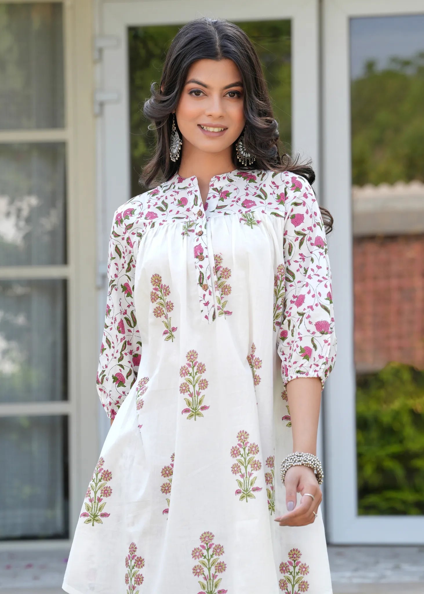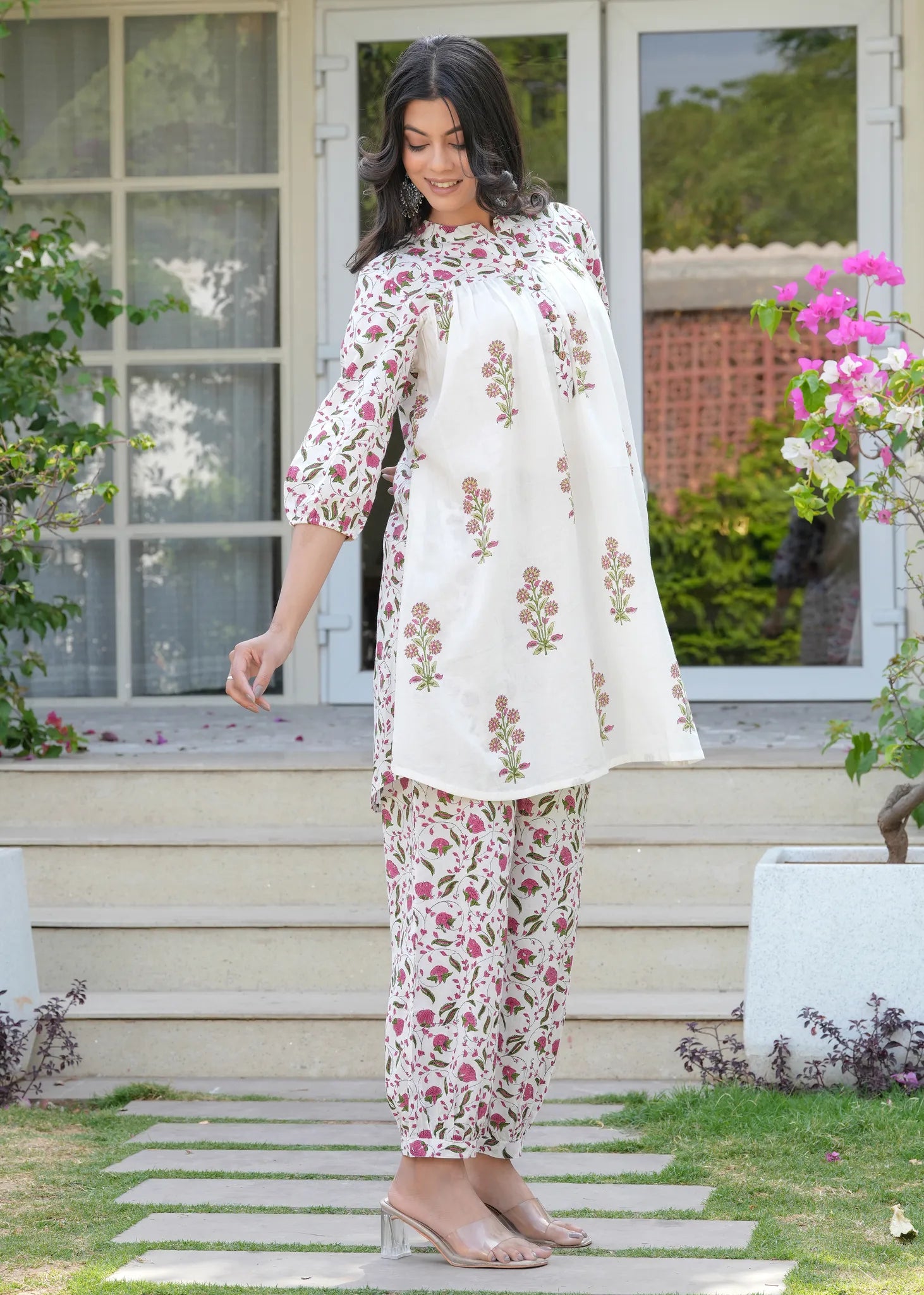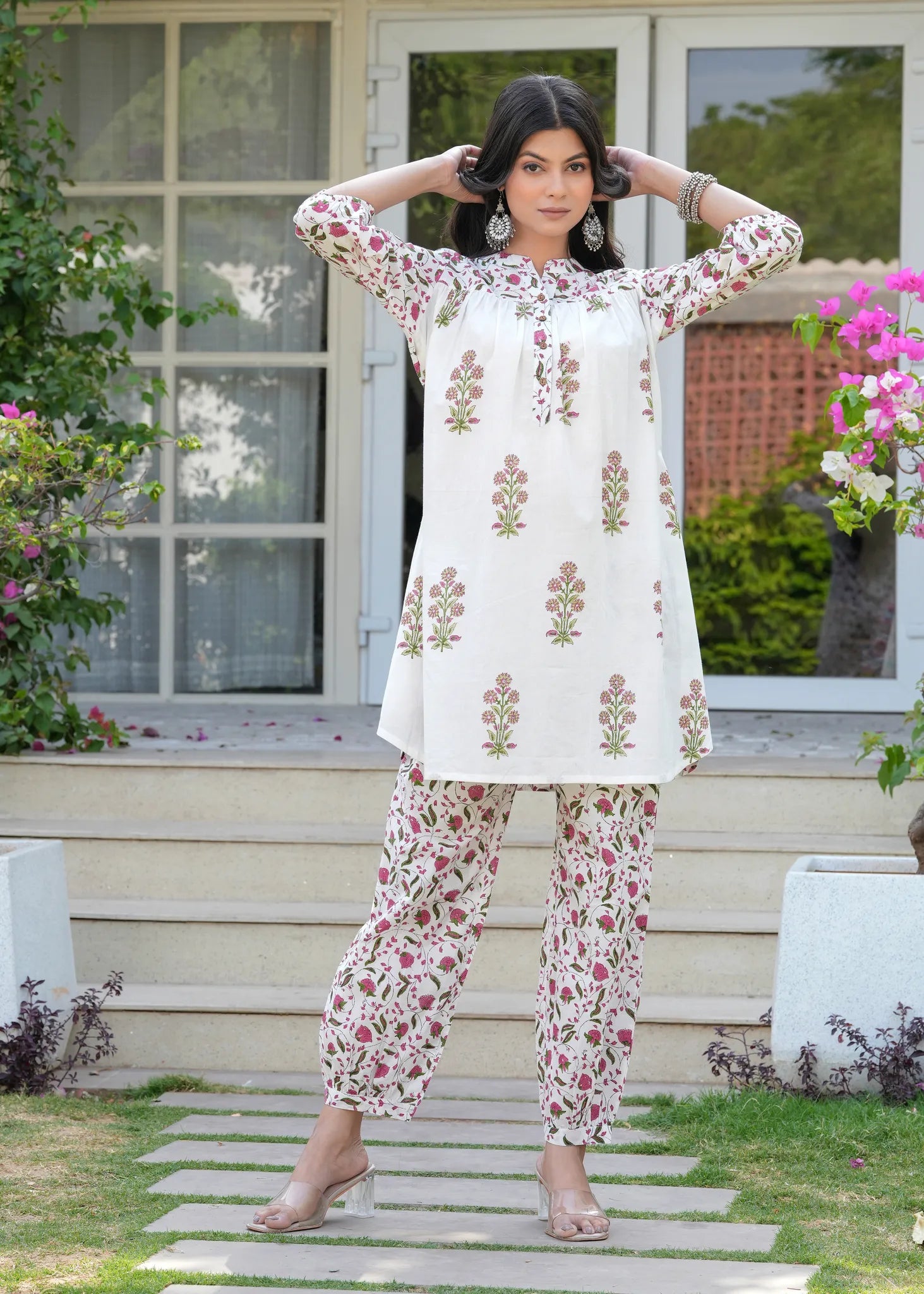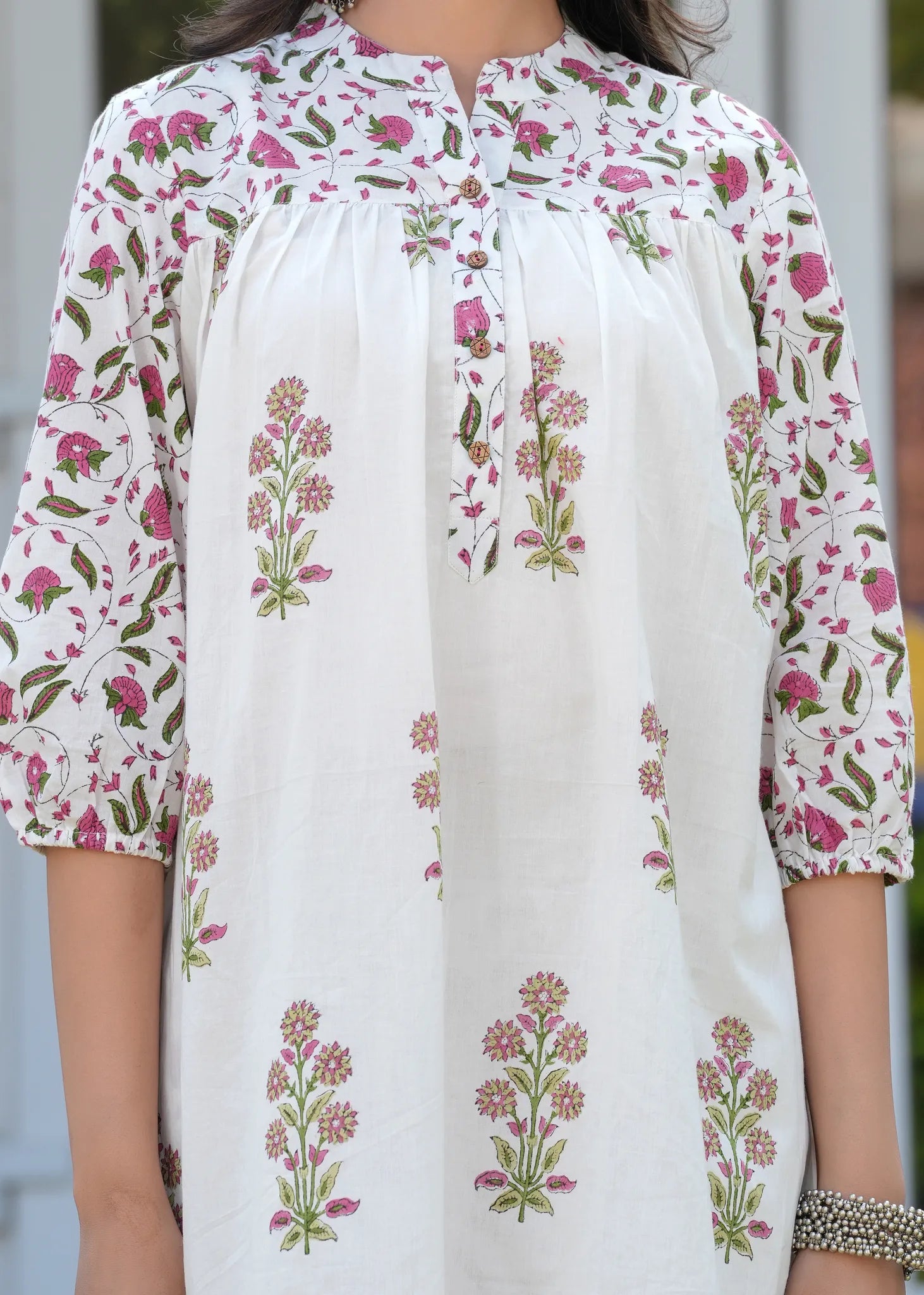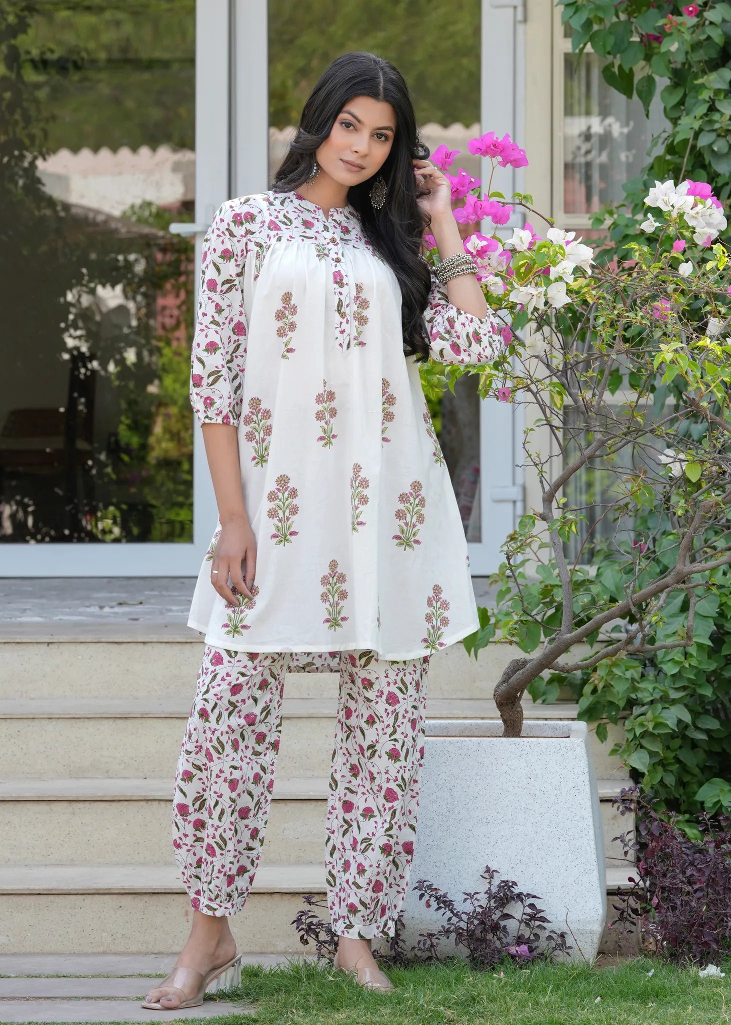 Saanj Savera Buti Jaal White Hand Blocked Printed A-Line Coord Set -Embrace effortless elegance with the Saanj Savera Buti Jaal White Hand Block Print Coord Set. Made from soft, breathable cotton, this set features a mandarin collar with a stylish placket and an A-line pleated short, adorned with intricate floral hand-block prints. The printed balloon pants add a playful yet sophisticated flair, completing the look with a contemporary twist. Perfect for a chic day out or a casual gathering, this set brings together timeless prints and modern silhouettes for a truly distinctive ensemble.