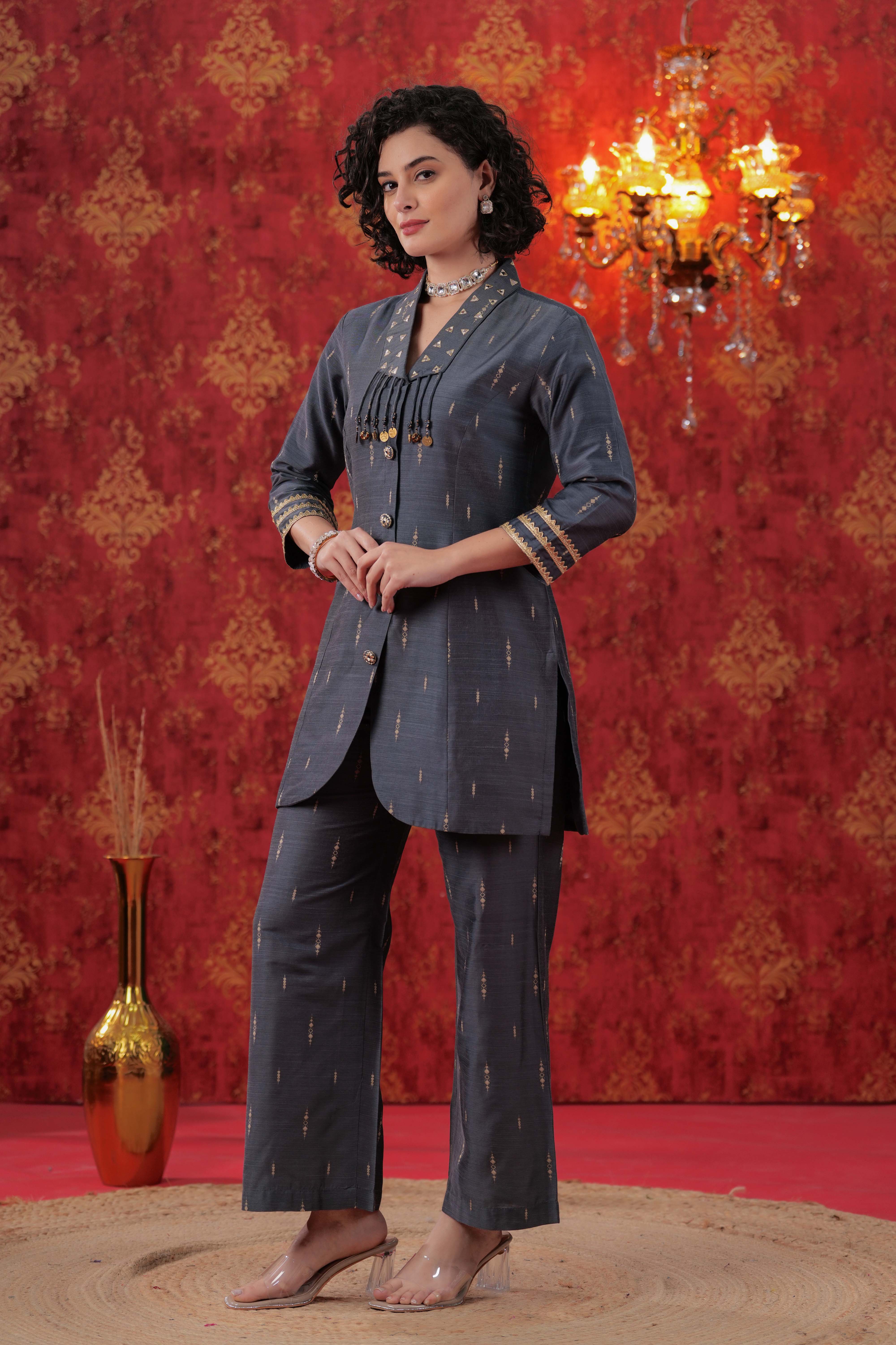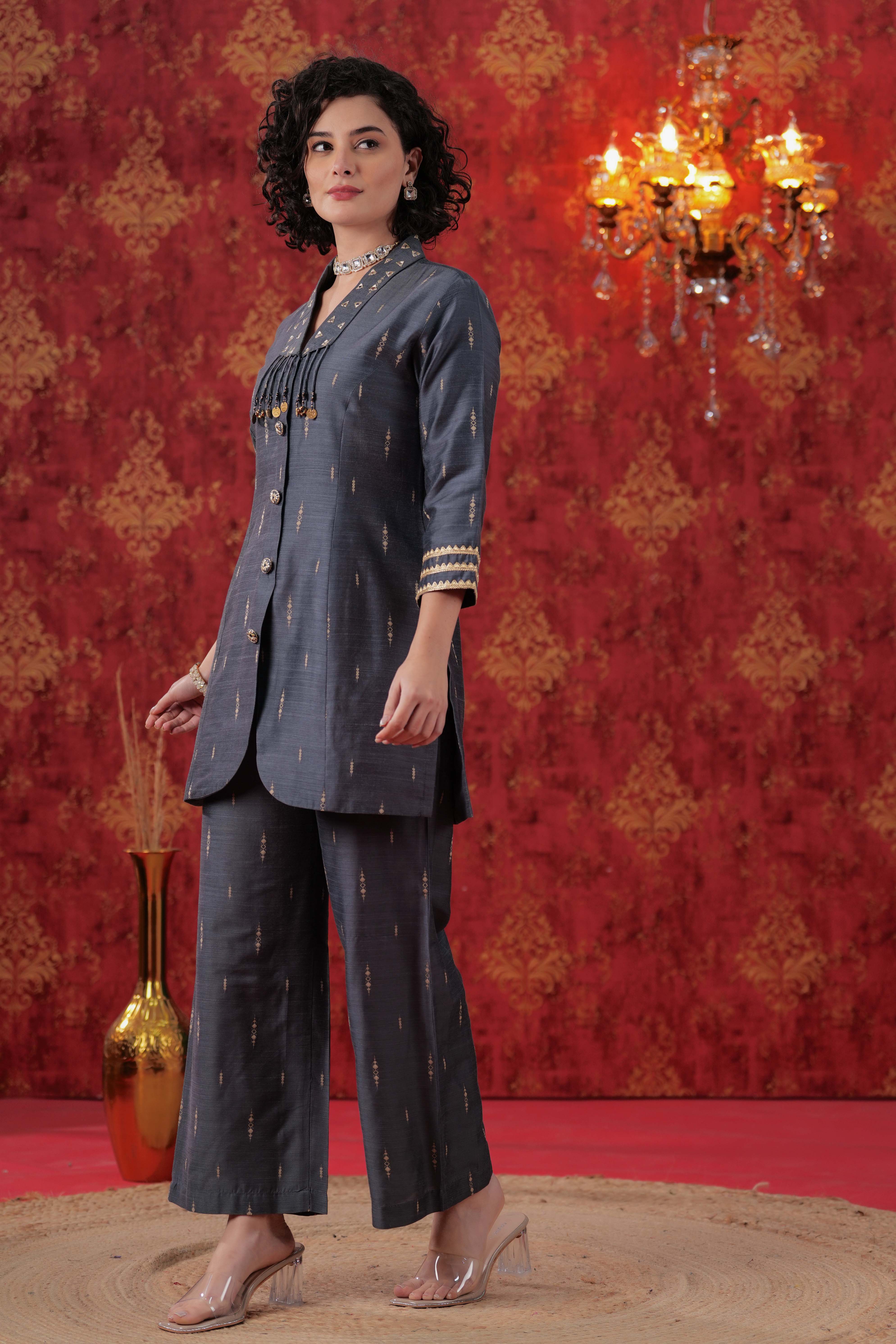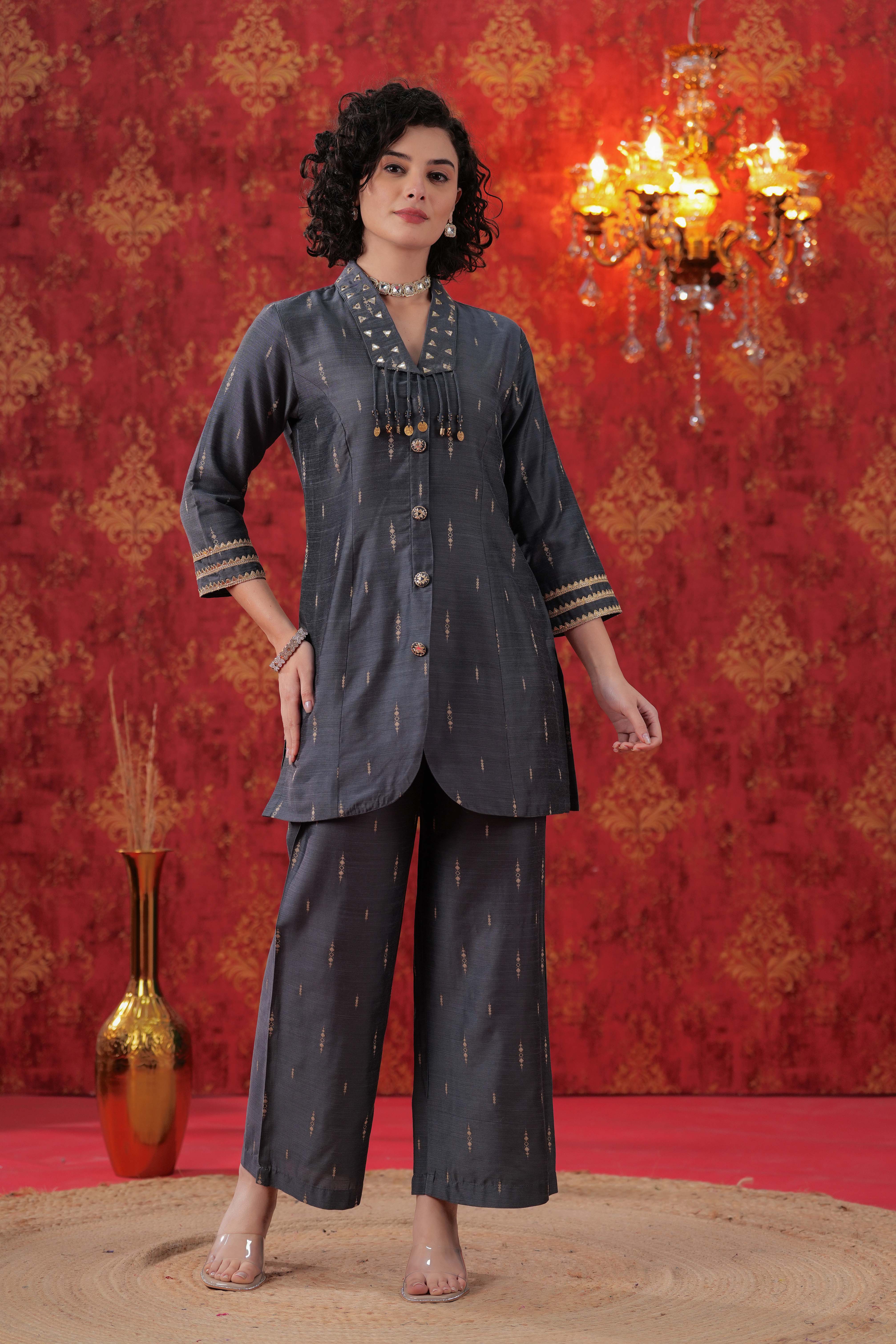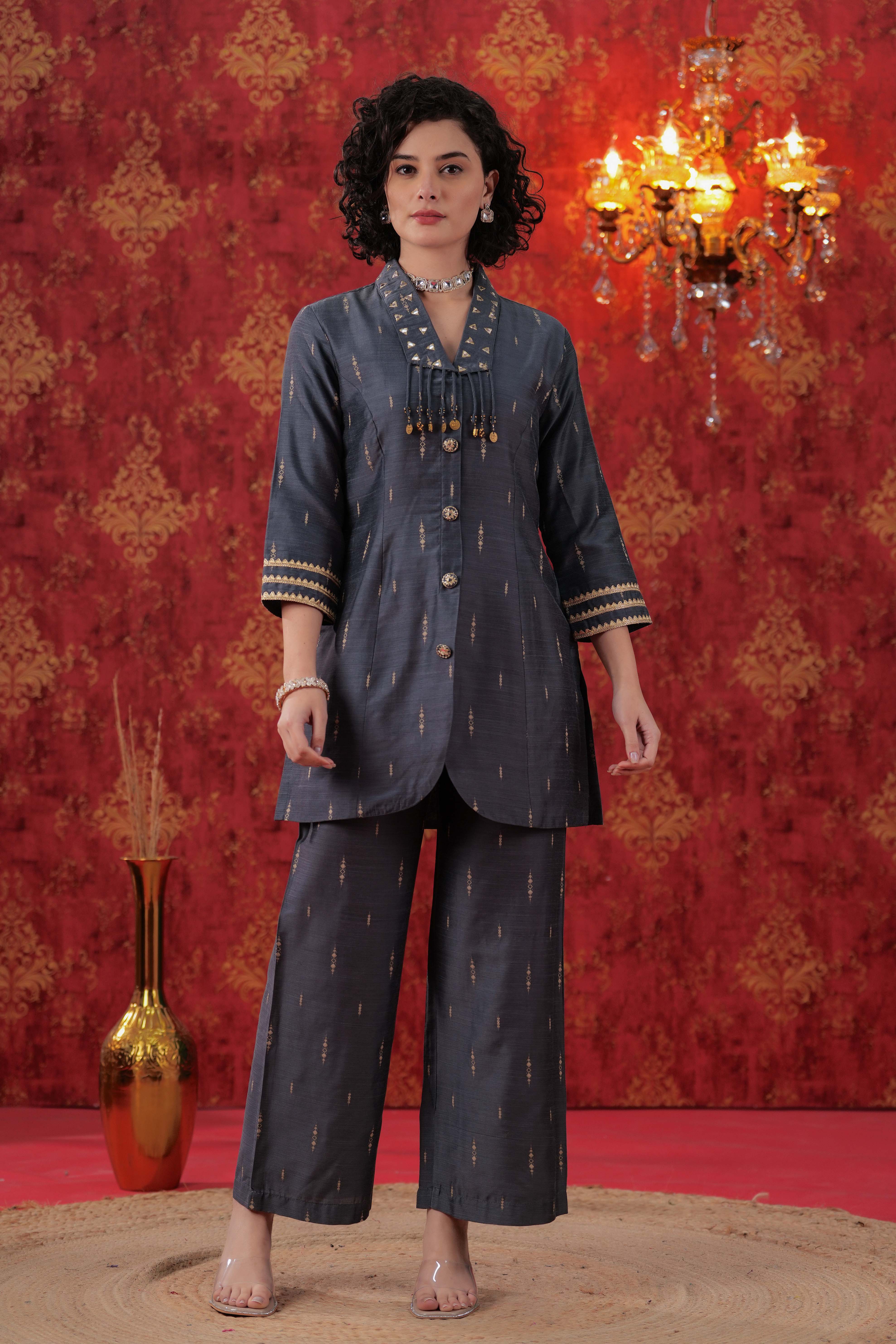 Desi Disco Grey Glitz Grey Jacket Co-ord Set- Shine effortlessly in the Desi Disco Glitz Grey Co-ord Set. Crafted from luxe cotton silk, it features a mirror-detailed shawl-collar jacket with zari-trimmed sleeves and sleek palazzos—perfect for festive fêtes and soirées.