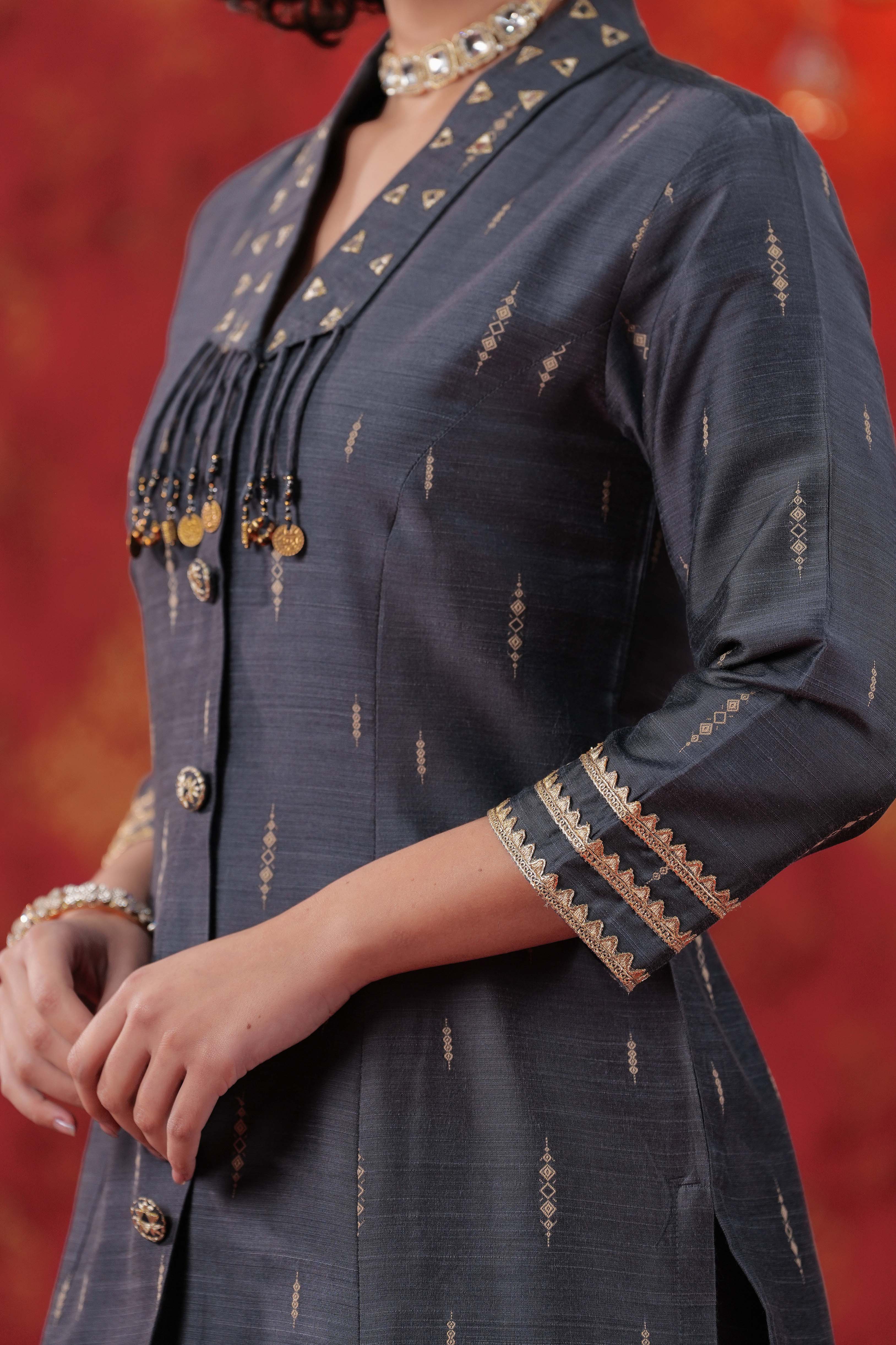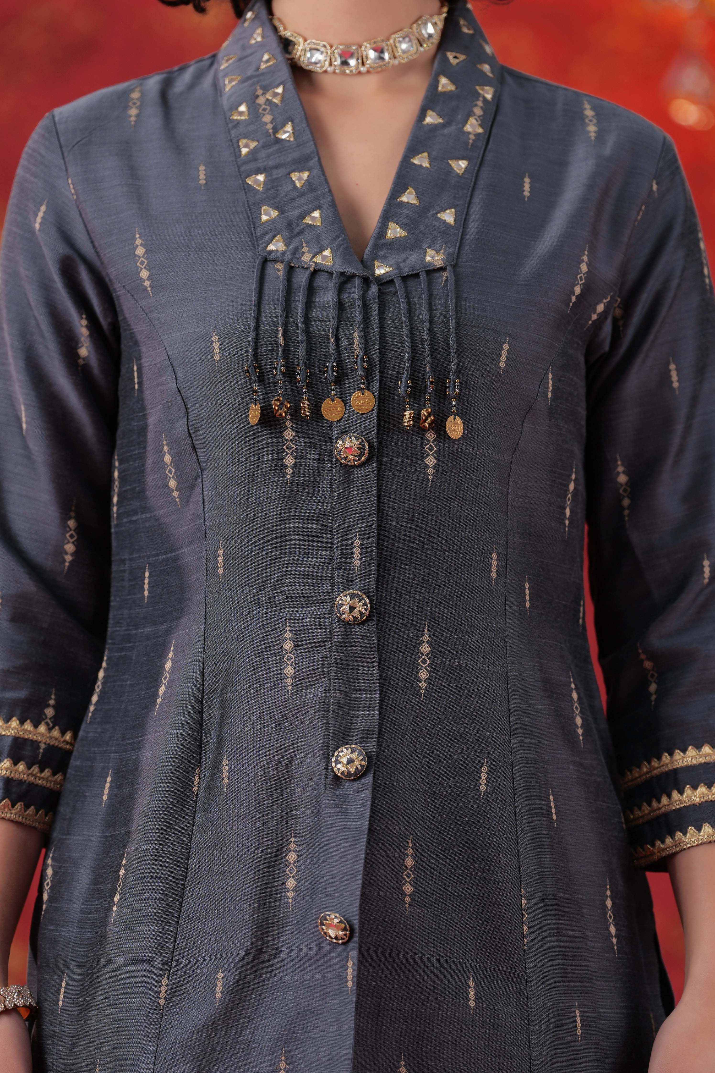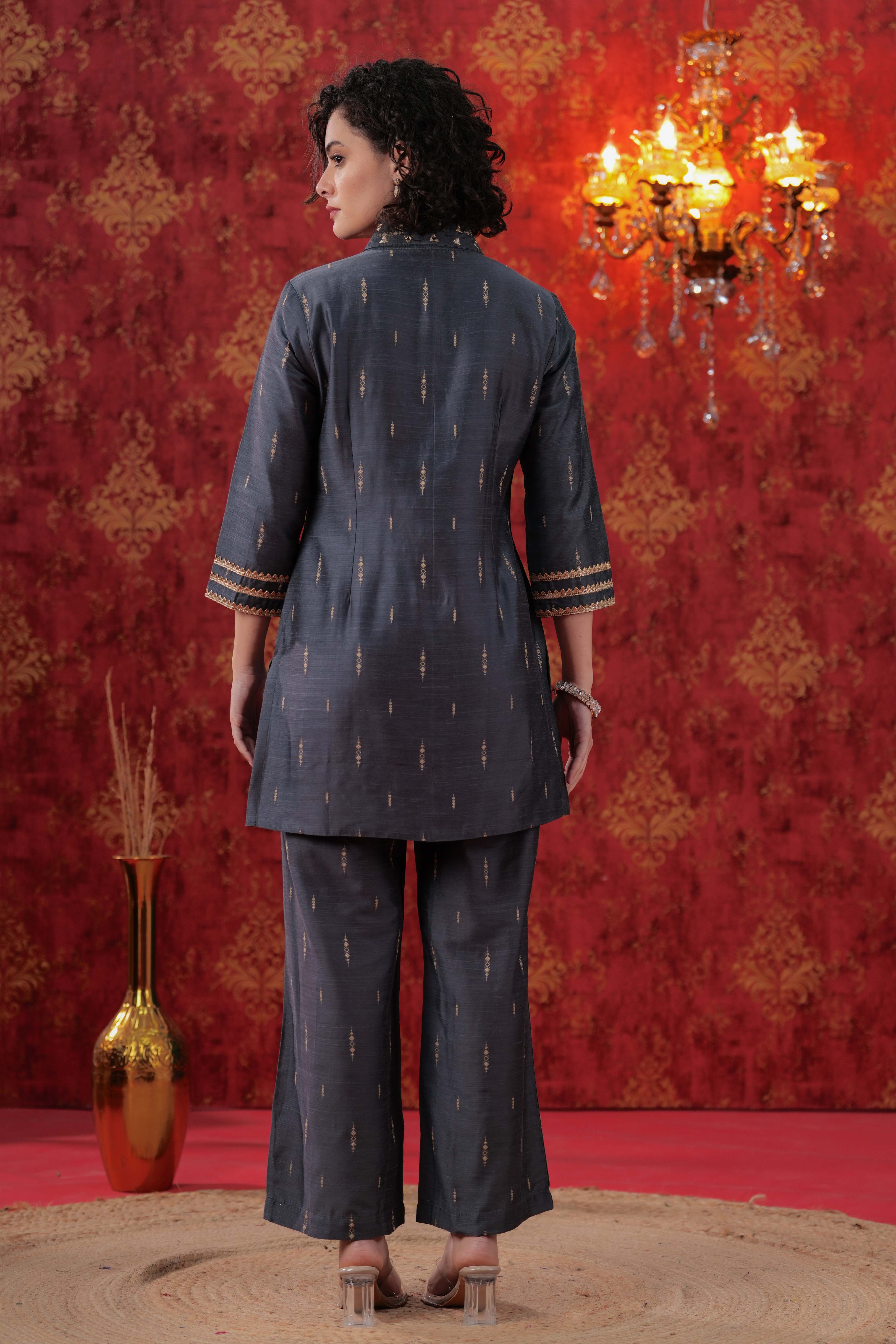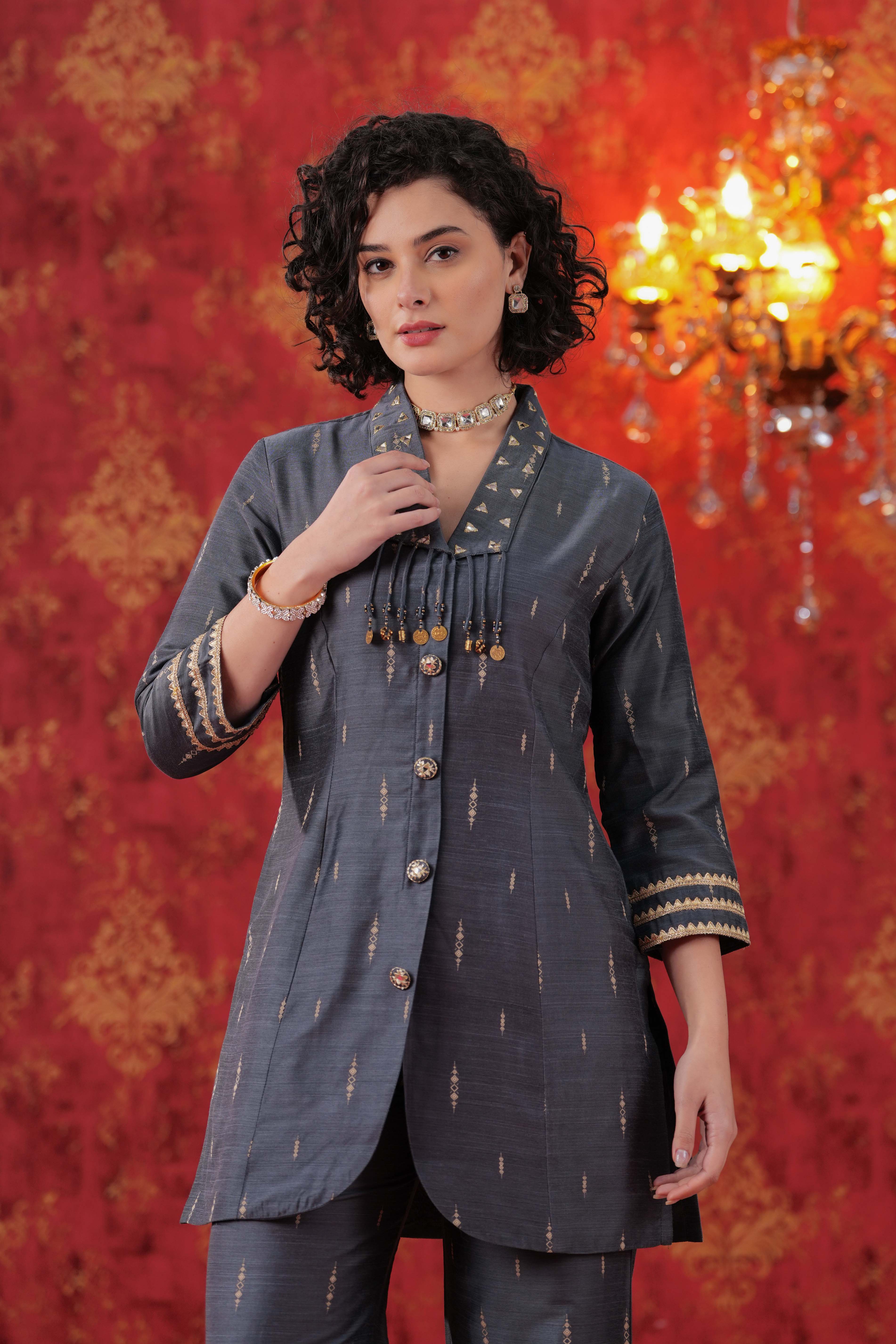 Desi Disco Grey Glitz Grey Jacket Co-ord Set- Shine effortlessly in the Desi Disco Glitz Grey Co-ord Set. Crafted from luxe cotton silk, it features a mirror-detailed shawl-collar jacket with zari-trimmed sleeves and sleek palazzos—perfect for festive fêtes and soirées.