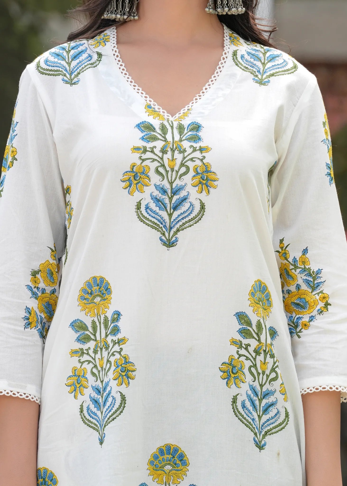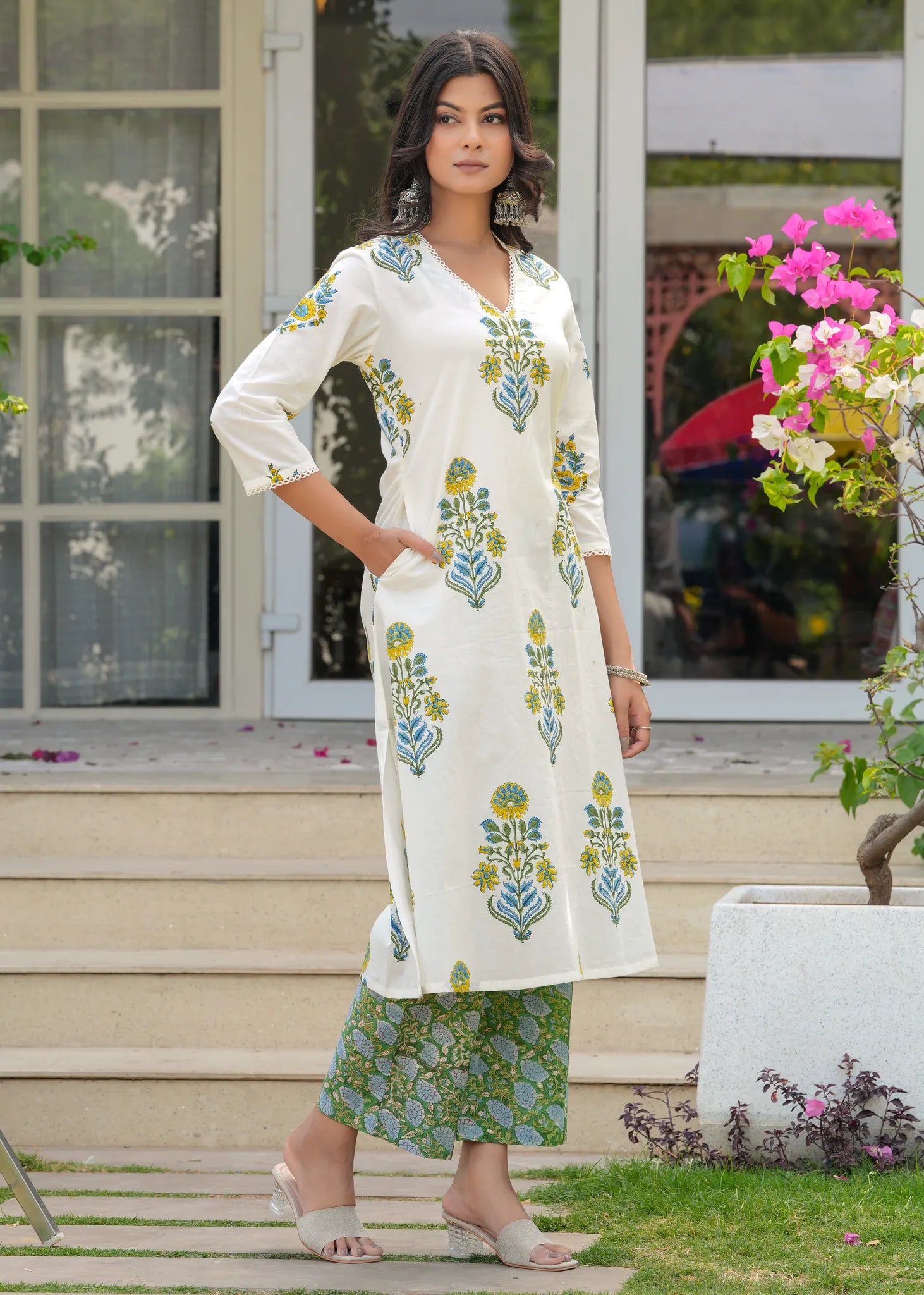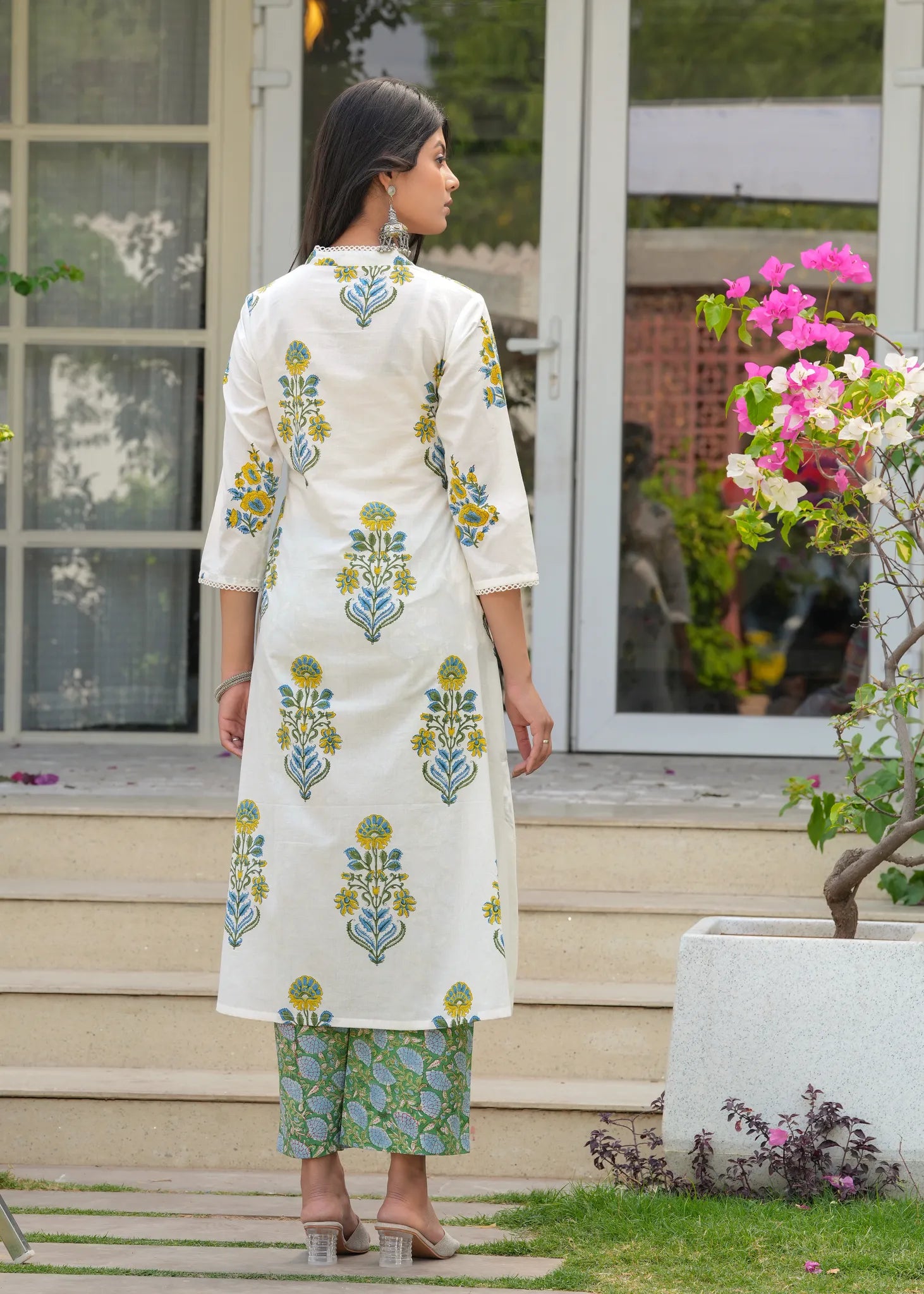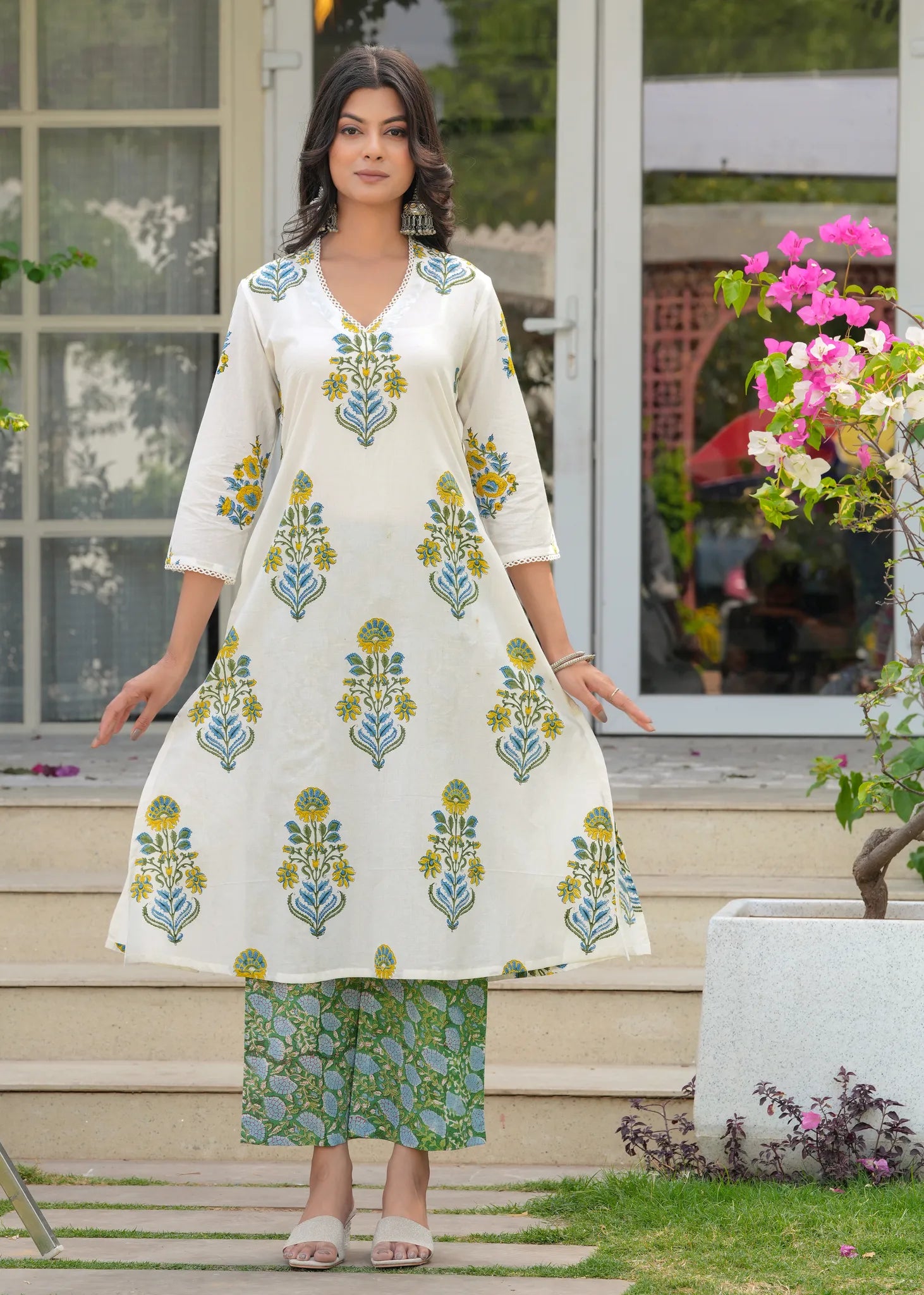 Saanj Savera Gulnaar White Green A-Line Kurta Set -The Saanj Savera Gulnaar Block Print White Green A-Line Kurta Set is a graceful ode to handcrafted elegance. Tailored in soft cotton, the A-line kurta features charming boota floral prints and a flattering V-neckline, delicately edged with crochet lace detailing. It is paired with a beautifully coordinated floral jaal block-printed palazzo, creating a look that is both fresh and timeless—perfect for daytime soirees or serene festive moments.