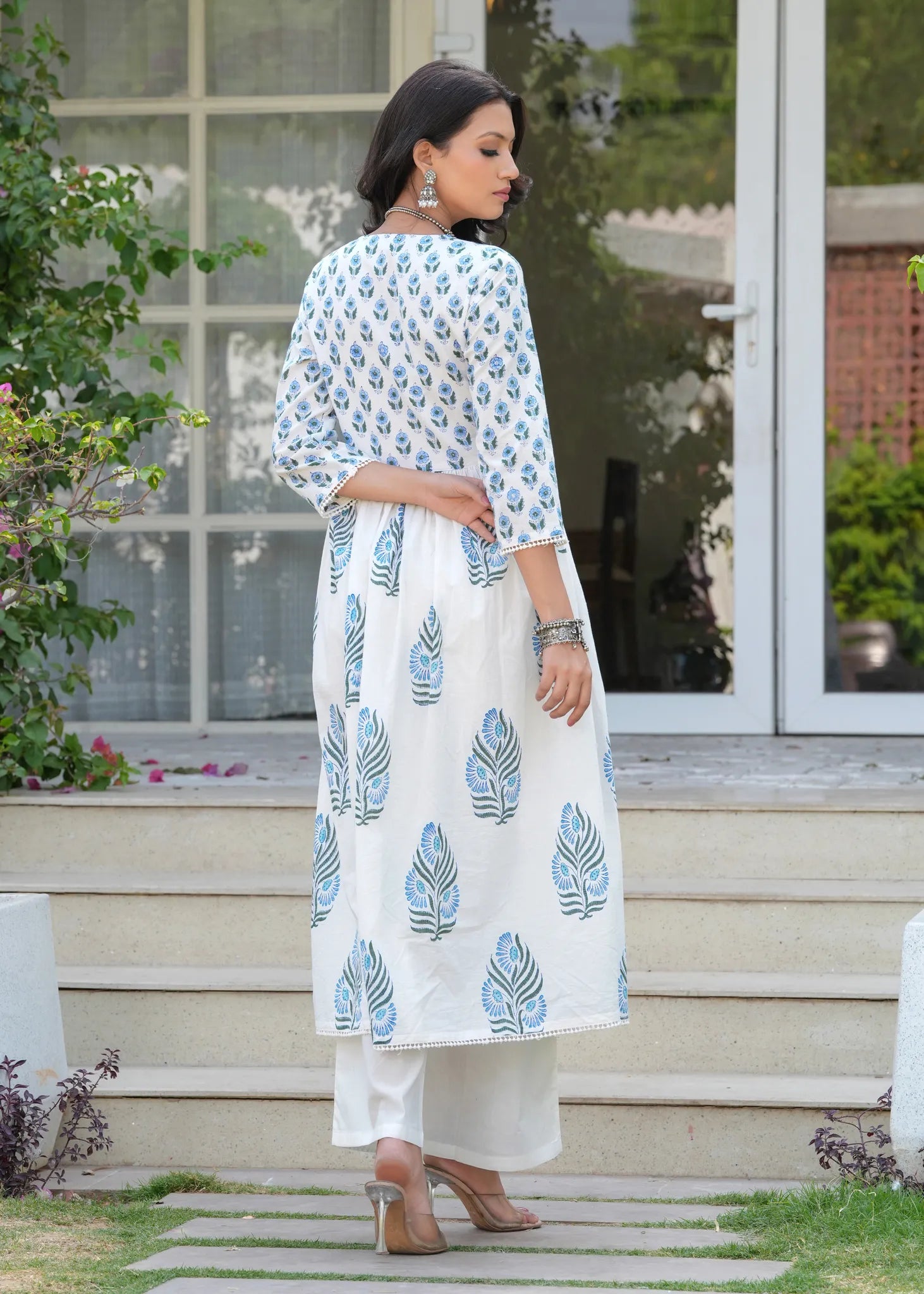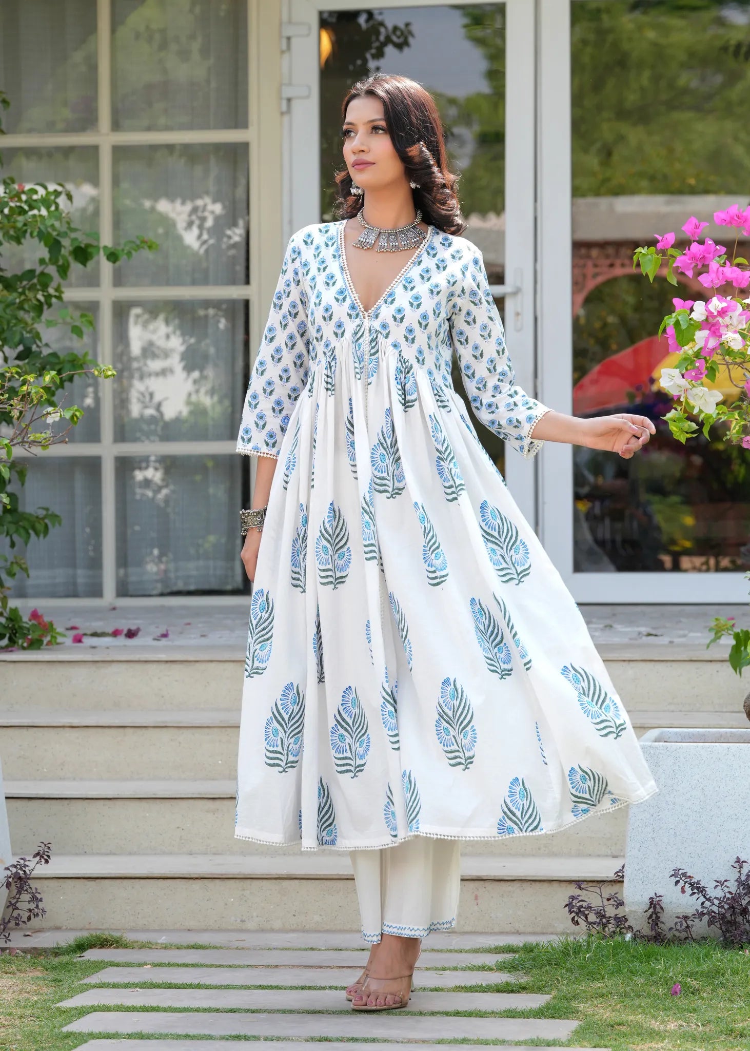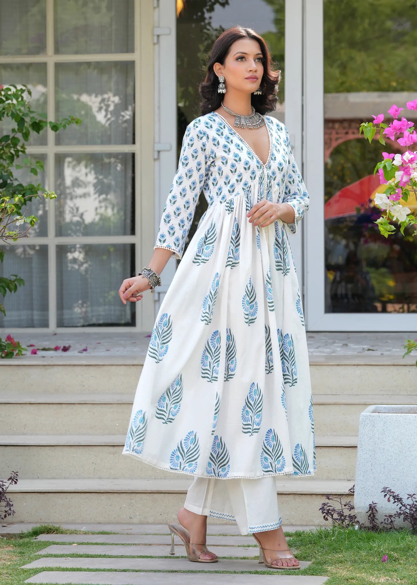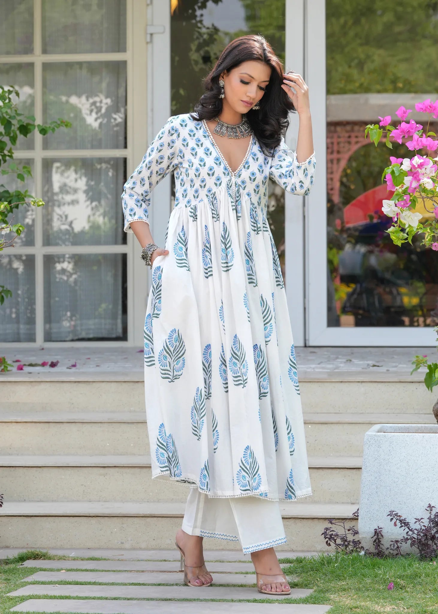 Saanj Savera Gunaar White Blue Gathered A-Line Kurta Set - The Saanj Savera Gulnaar White Blue Gathered Kurta Culotte Set offers a perfect fusion of ethnic charm and modern elegance. The Aliyah-cut kurta features vibrant floral block prints and is beautifully enhanced with crochet lace detailing for a delicate finish. Paired with solid palazzo pants, the hem showcases exquisite threadwork handwork, adding an artisanal touch. This set combines comfort and style, making it an ideal choice for chic, sophisticated occasions.