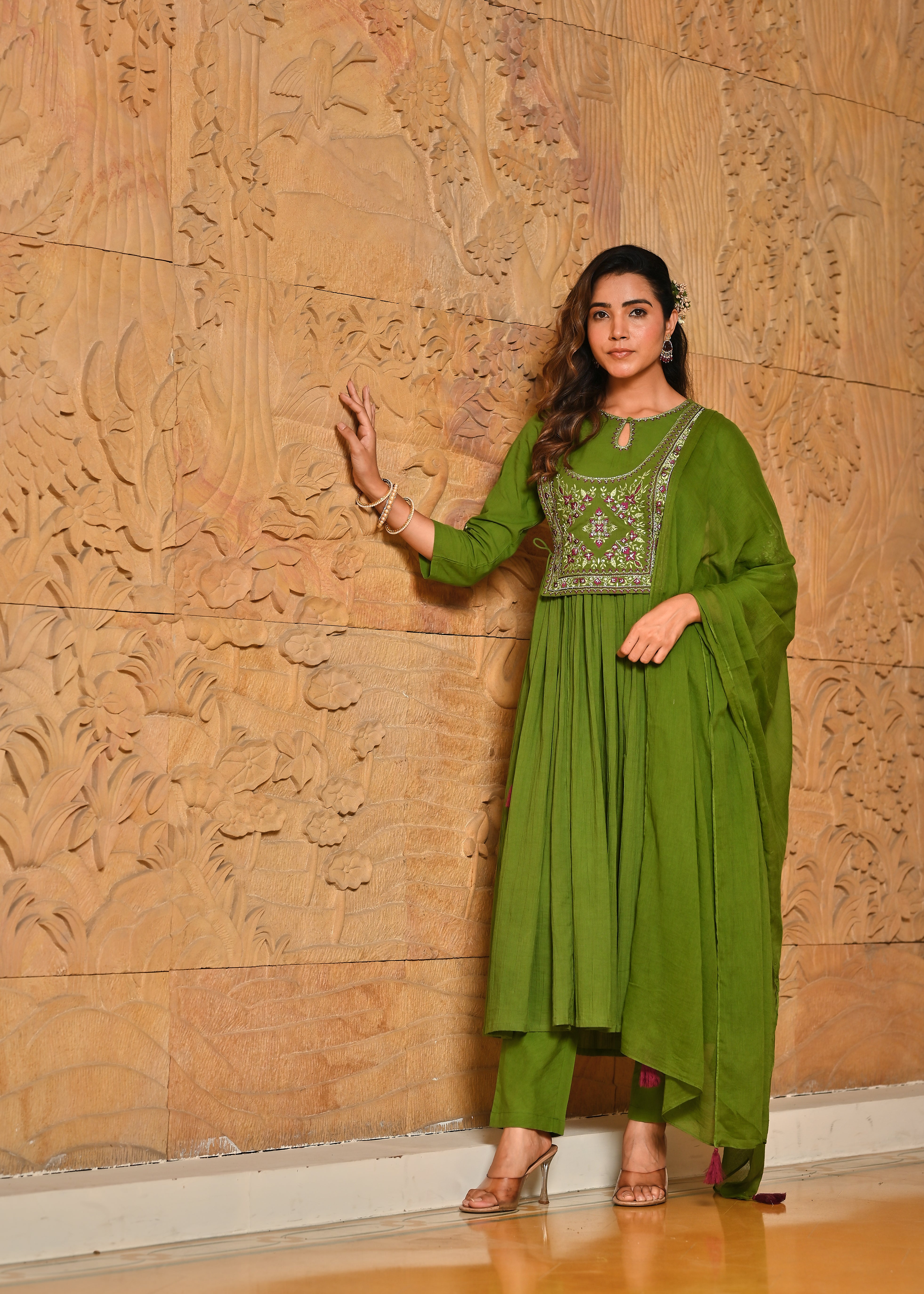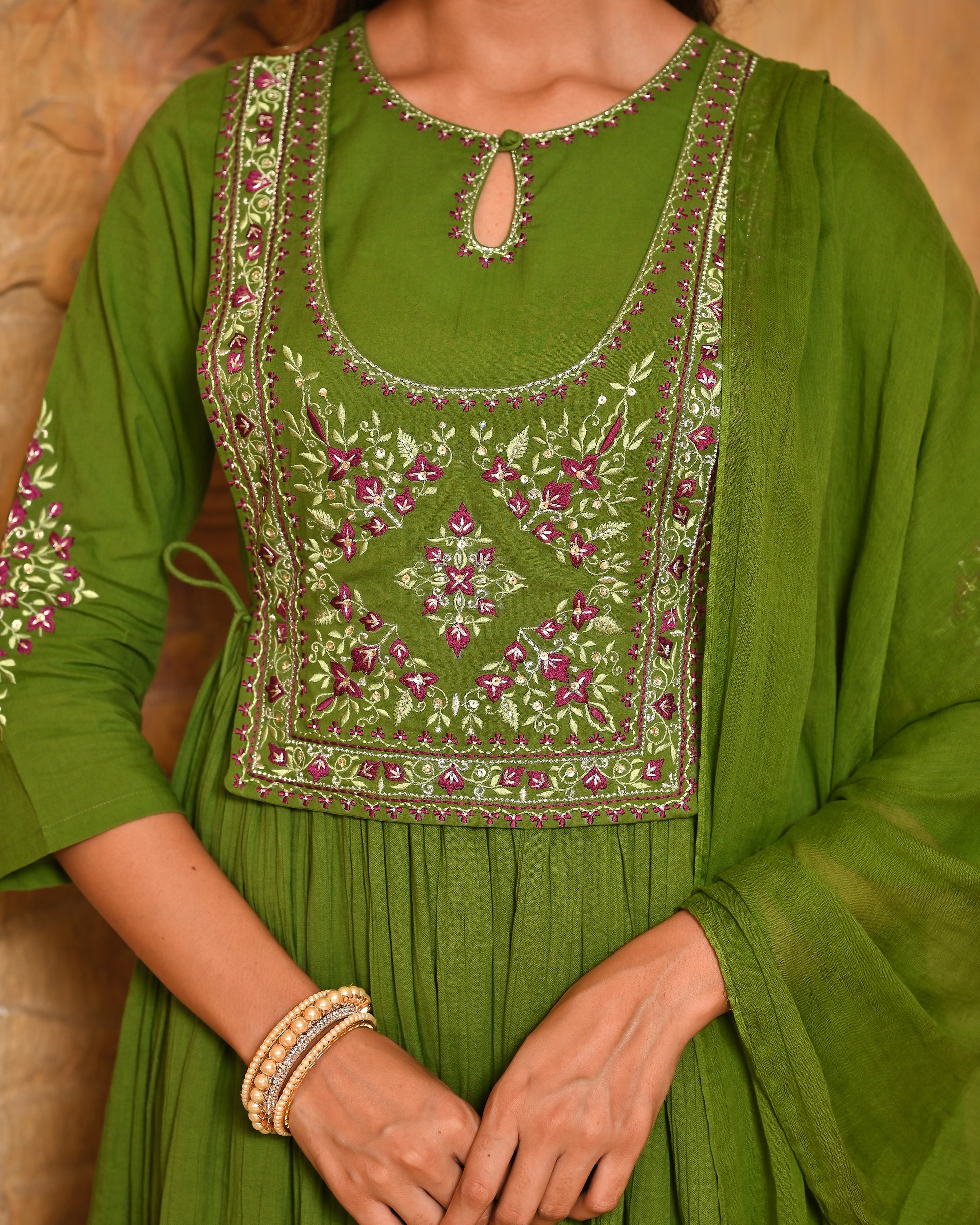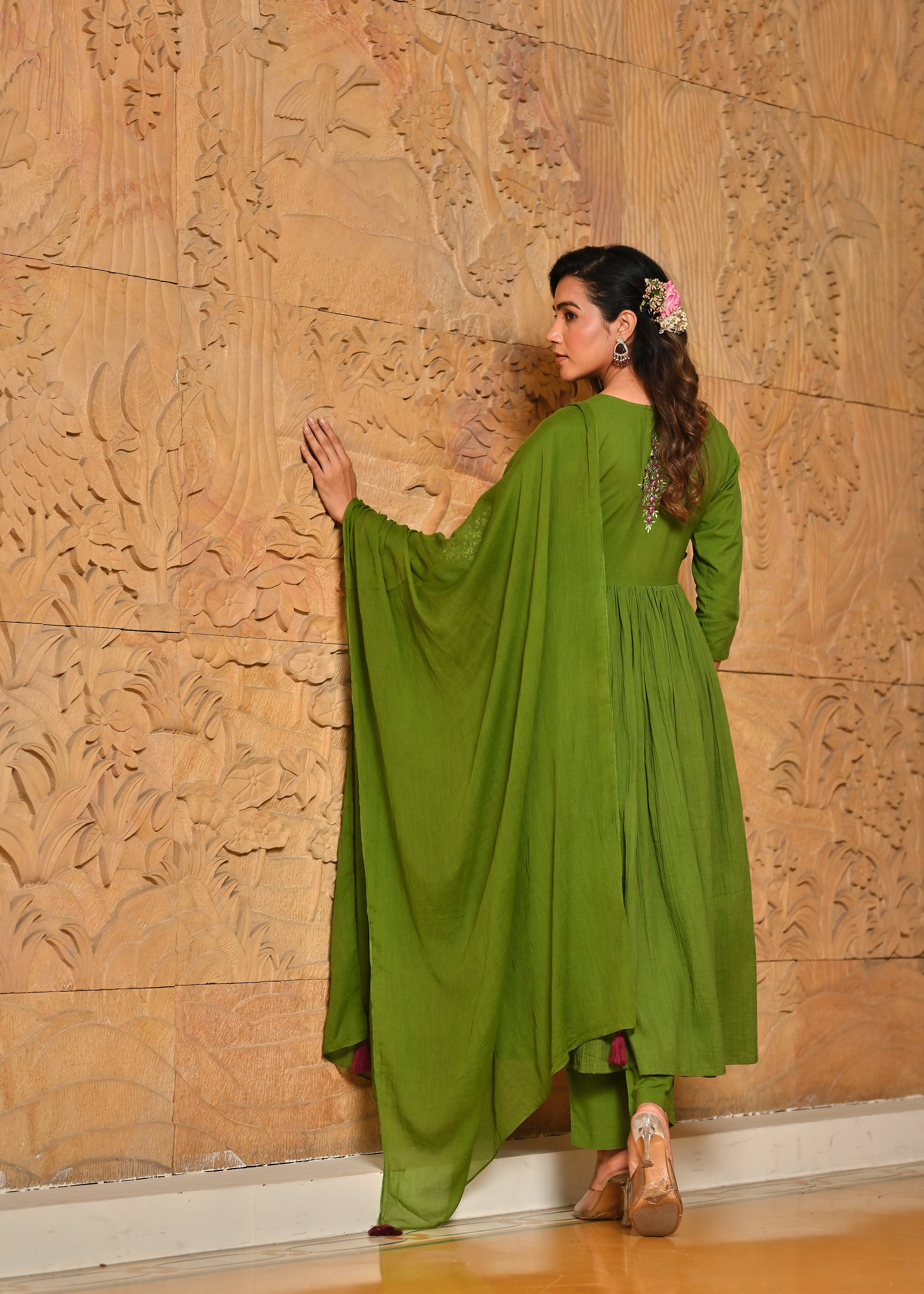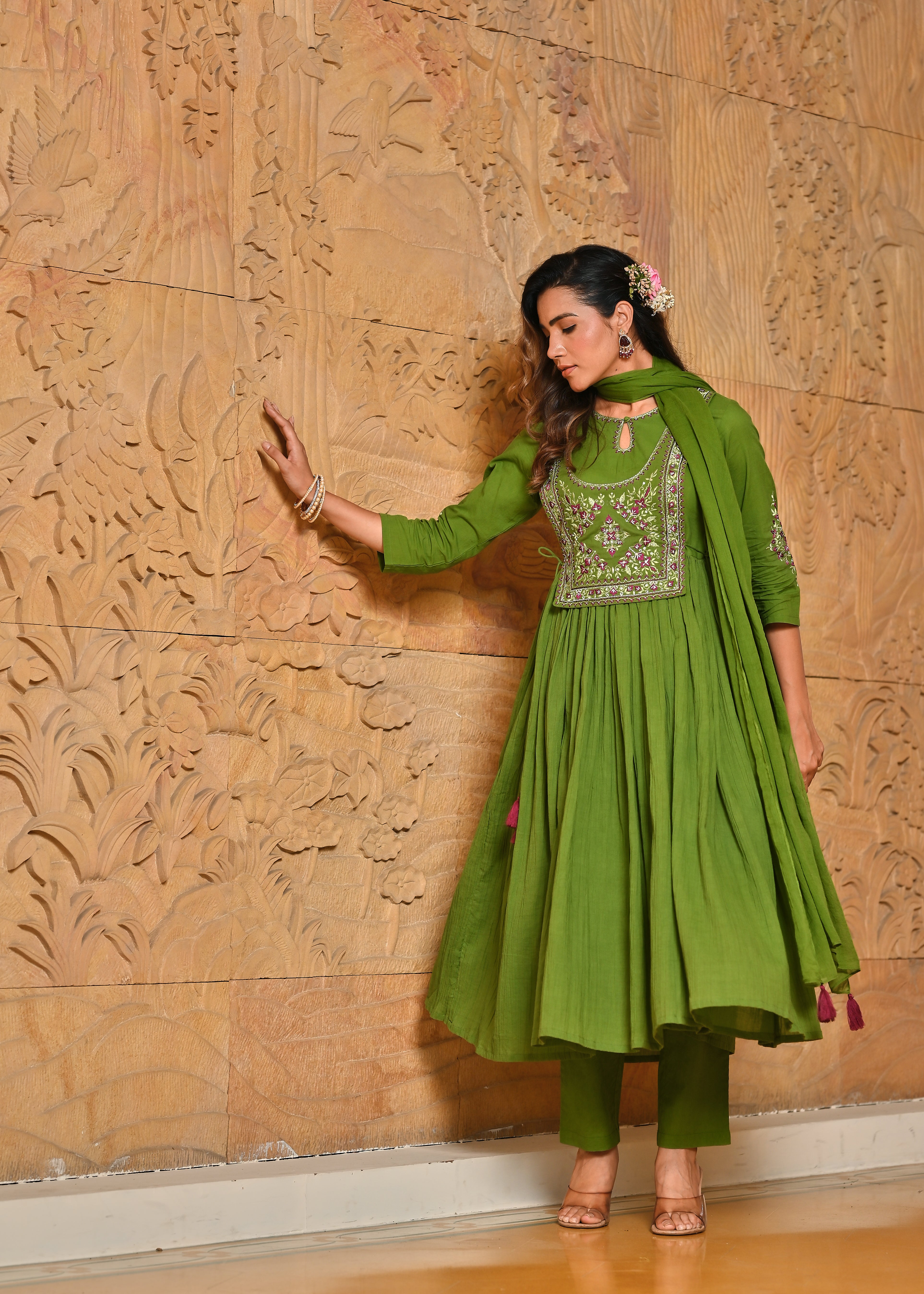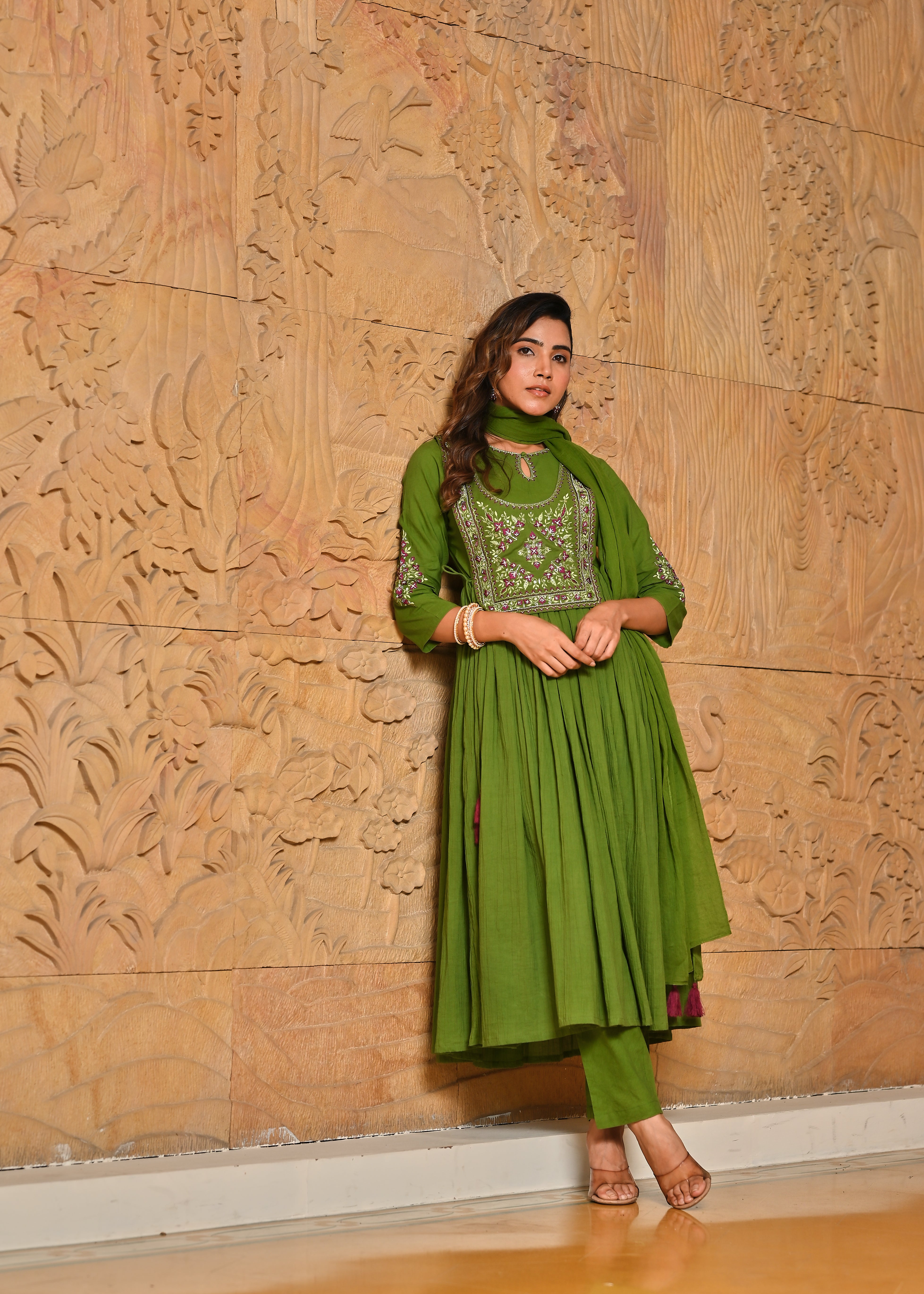 Rangmanch Hari Leher Wrinkled Zari Work Anarkali Kurta Dupatta Set - Embrace serene elegance in the Green Pure Cotton Crinkle Kurta Set. The soft, crinkled cotton offers a beautiful texture, enhanced by an ornate tie-up yoke detailed with exquisite Resham and Zari embroidery. This three-piece set includes complementary pants and a light, airy Cotton Mul dupatta, creating a look that is both comfortable and luxuriously handcrafted.