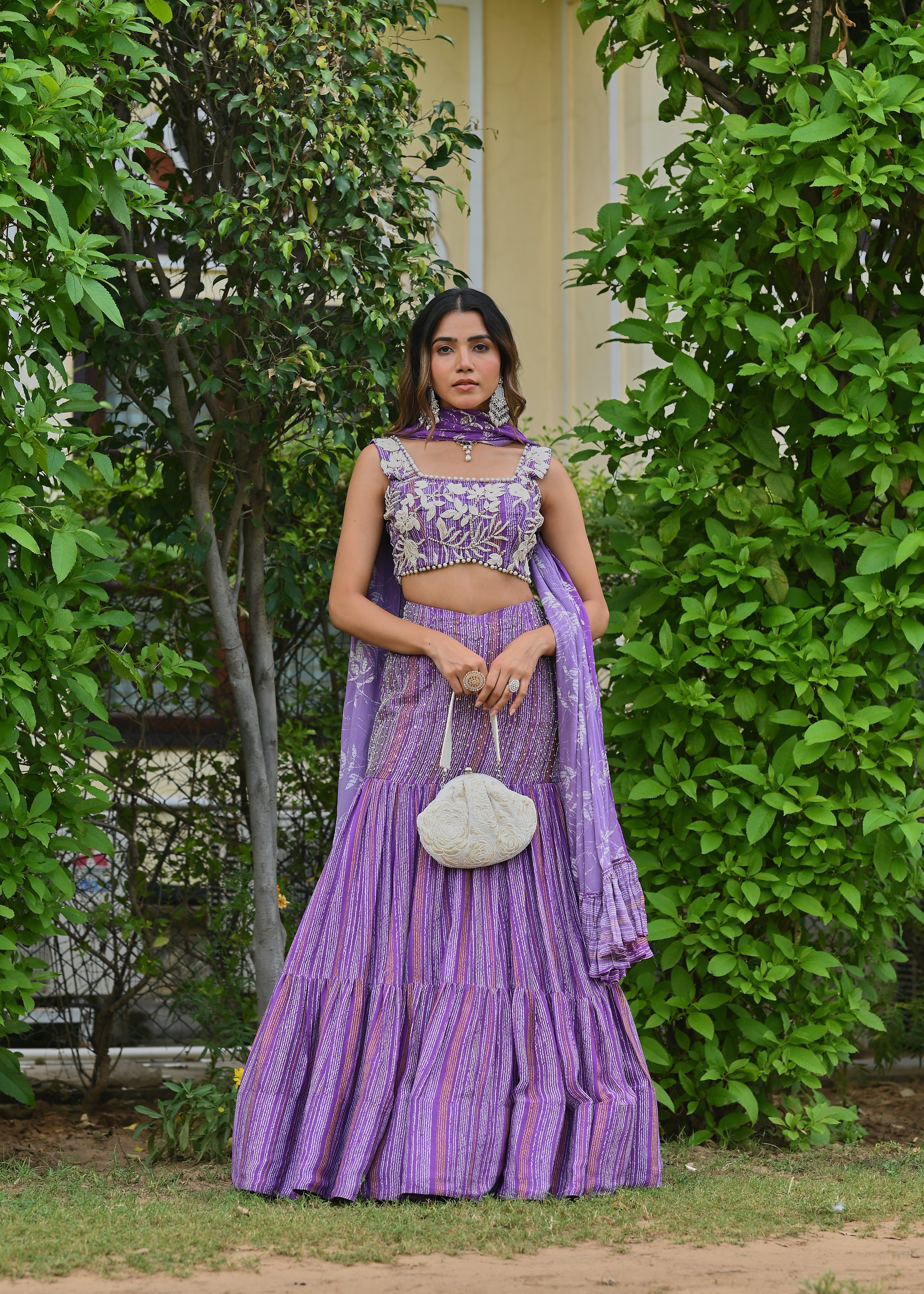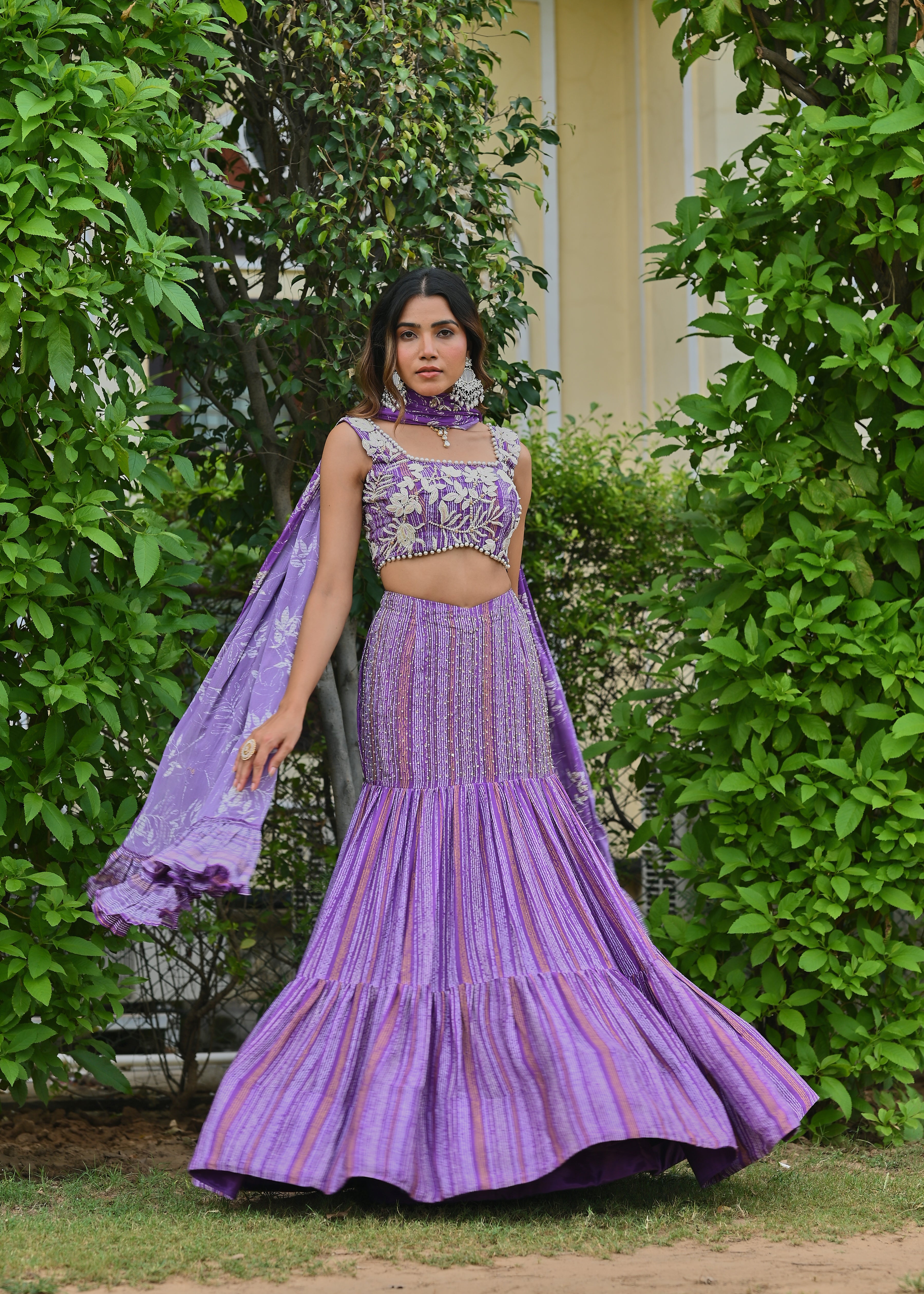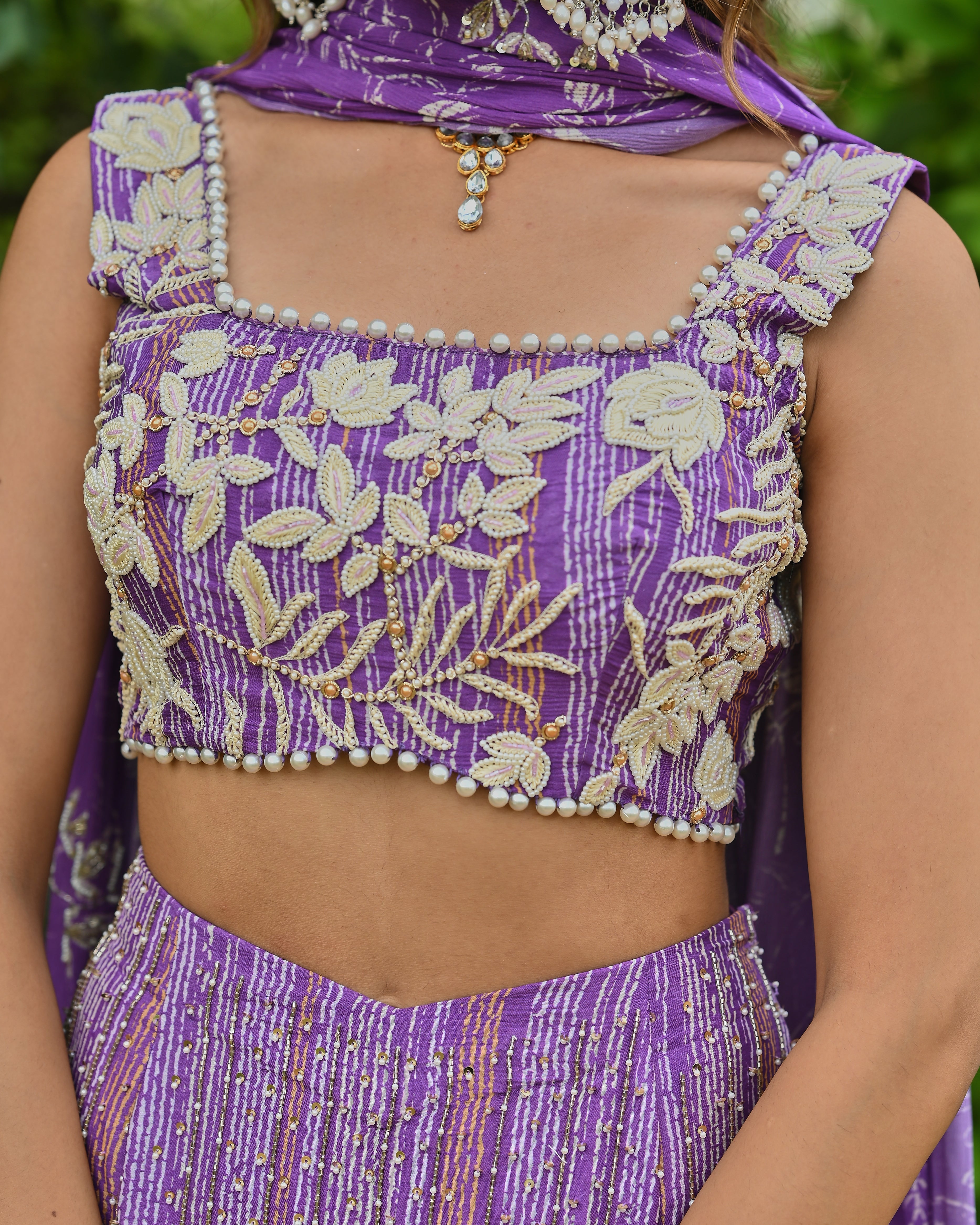Floral Panache Jamuni Bageecha Pearl Lehenga Set- Experience the ethereal charm of the Jamuni Bageecha set. This exquisite lehenga features a delightful fusion of floral and striped prints on airy Chinon Chiffon fabric. The elegance is elevated by intricate hand-embroidered pearl work adorning the blouse and lehenga, subtly enhanced with shimmering sequin accents. A stunning piece where traditional craft meets modern flair.