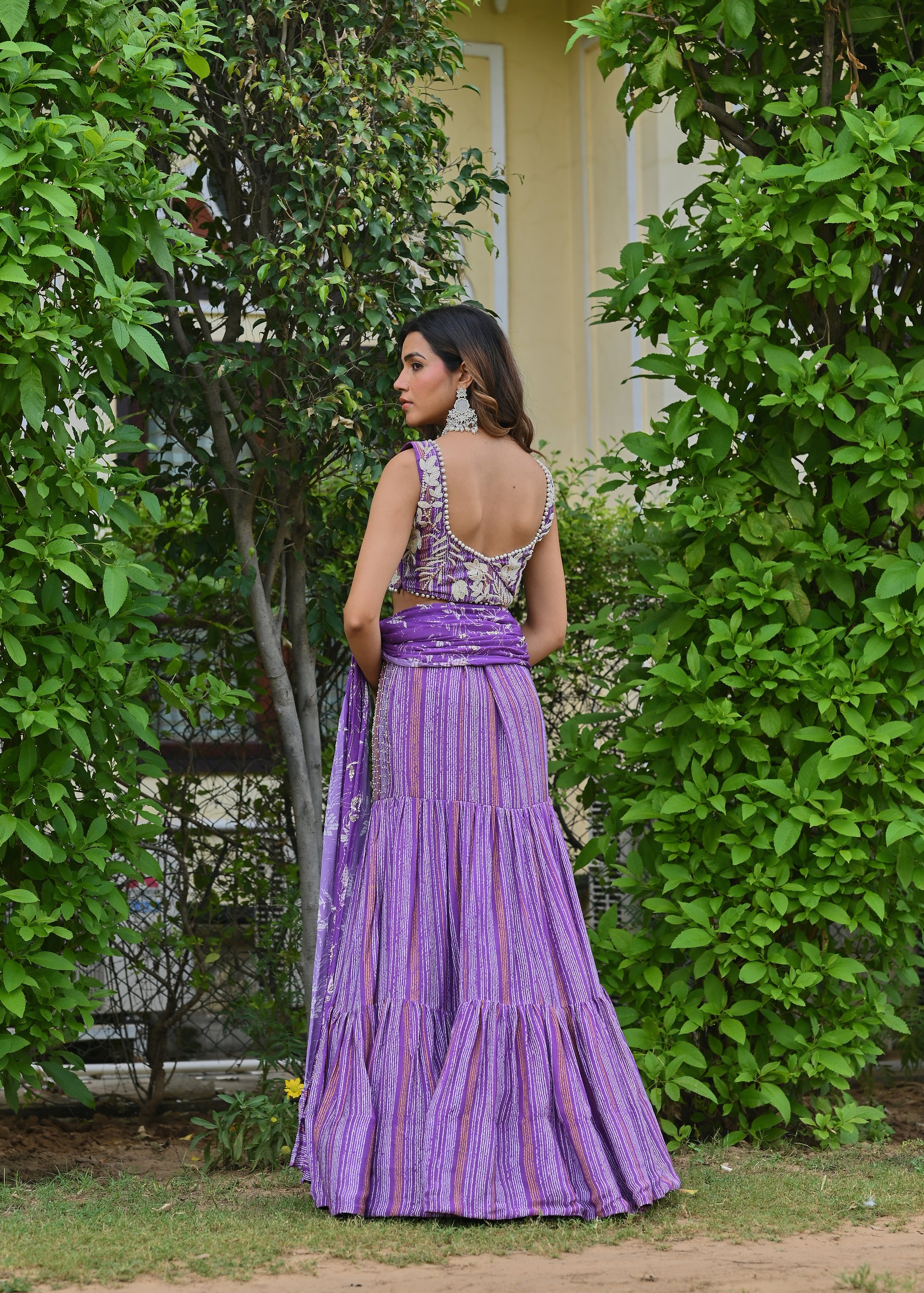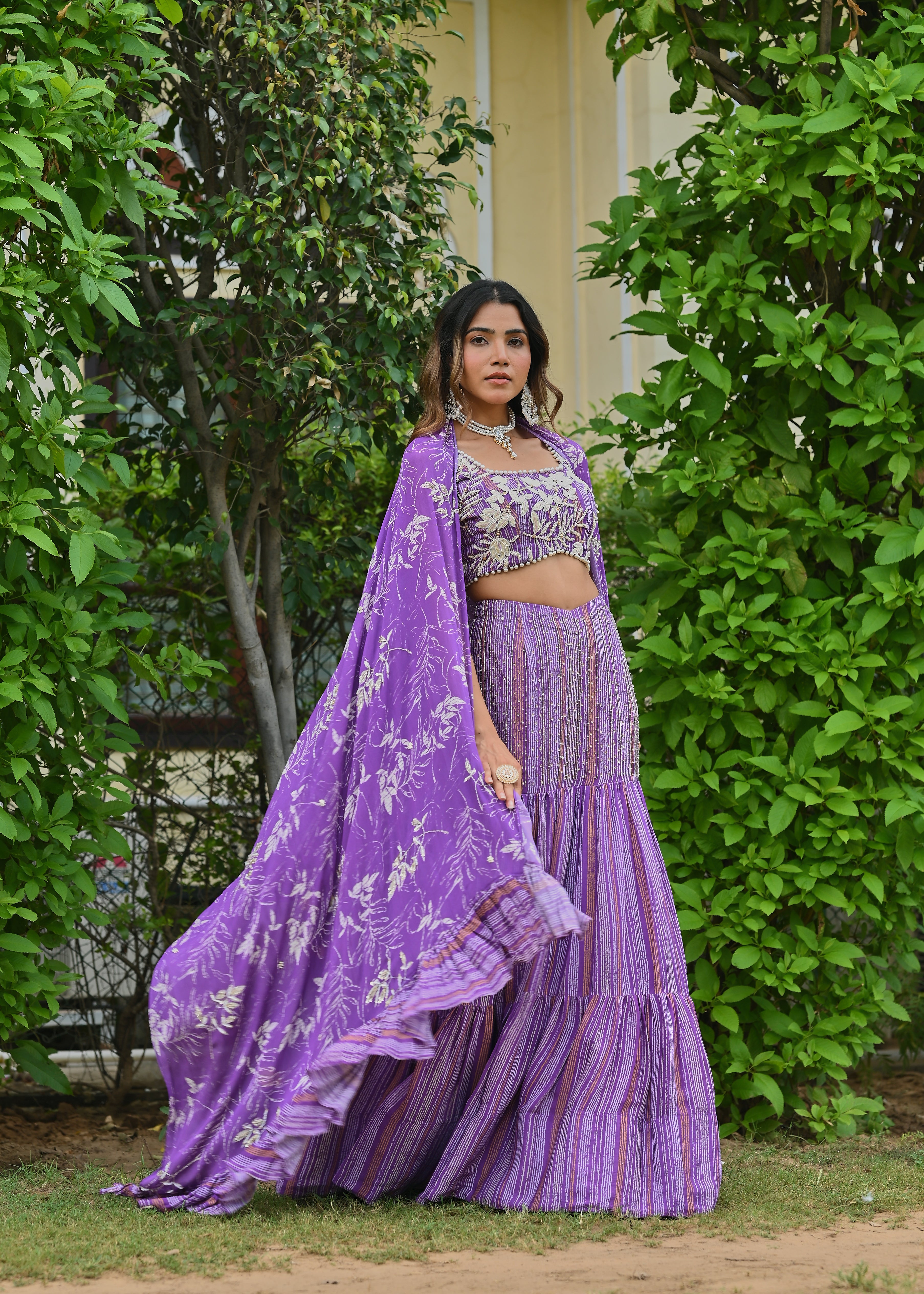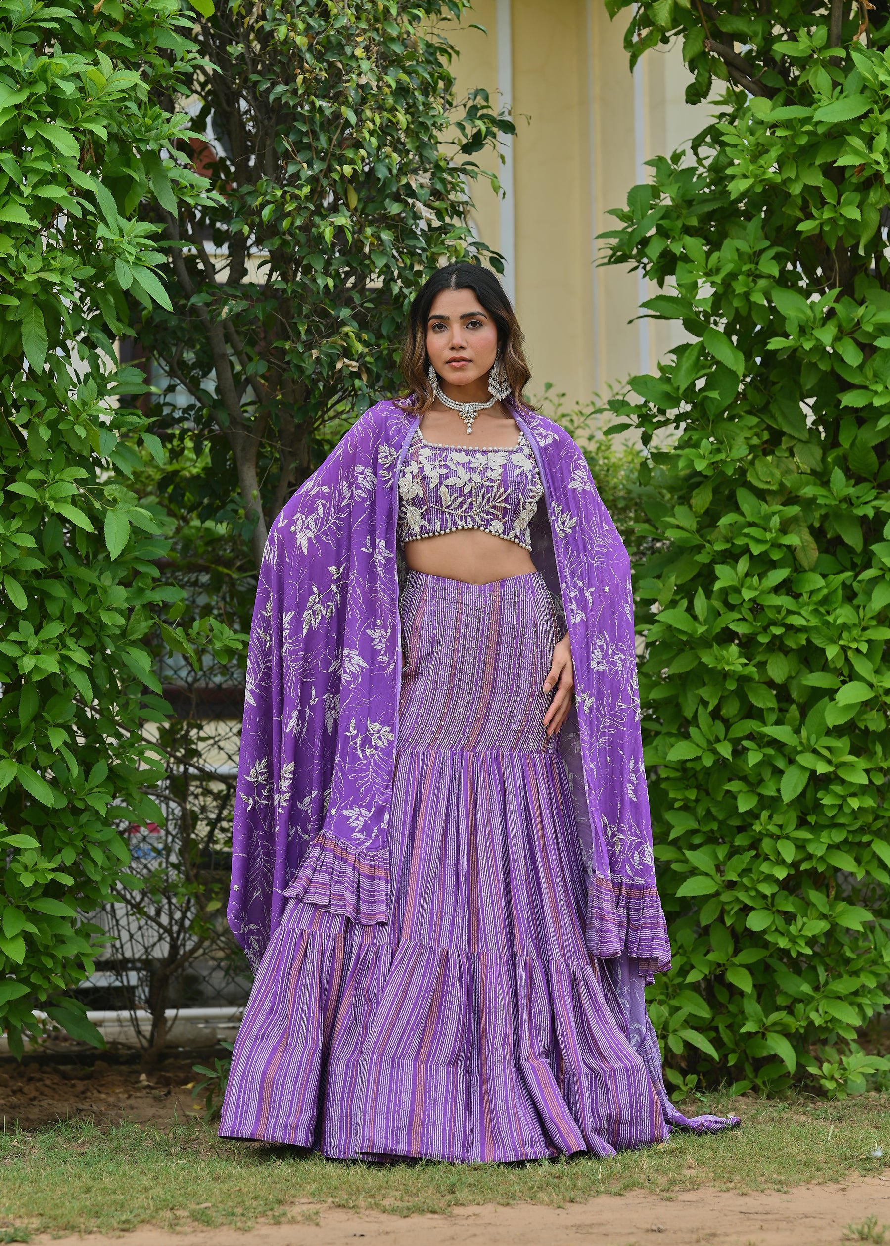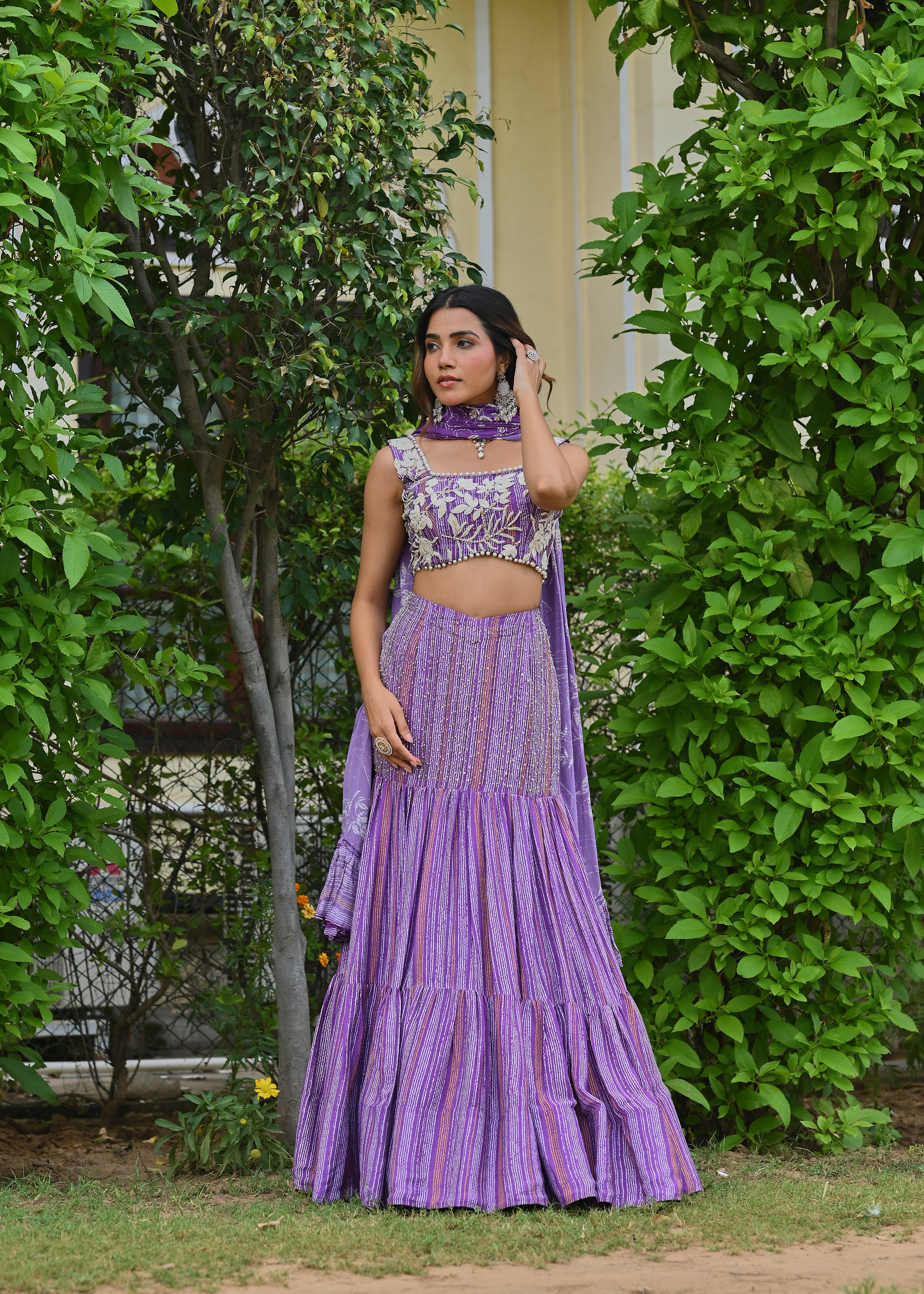 Floral Panache Jamuni Bageecha Pearl Lehenga Set- Experience the ethereal charm of the Jamuni Bageecha set. This exquisite lehenga features a delightful fusion of floral and striped prints on airy Chinon Chiffon fabric. The elegance is elevated by intricate hand-embroidered pearl work adorning the blouse and lehenga, subtly enhanced with shimmering sequin accents. A stunning piece where traditional craft meets modern flair.