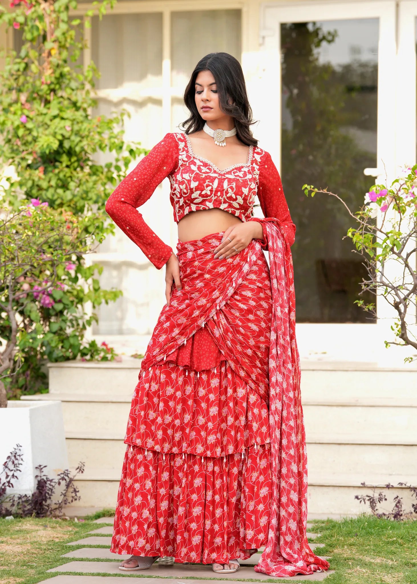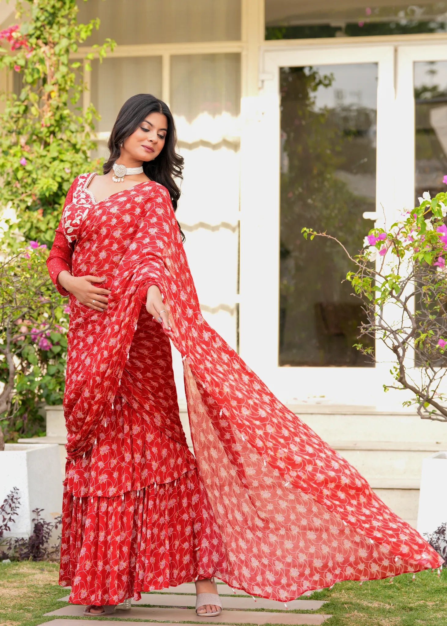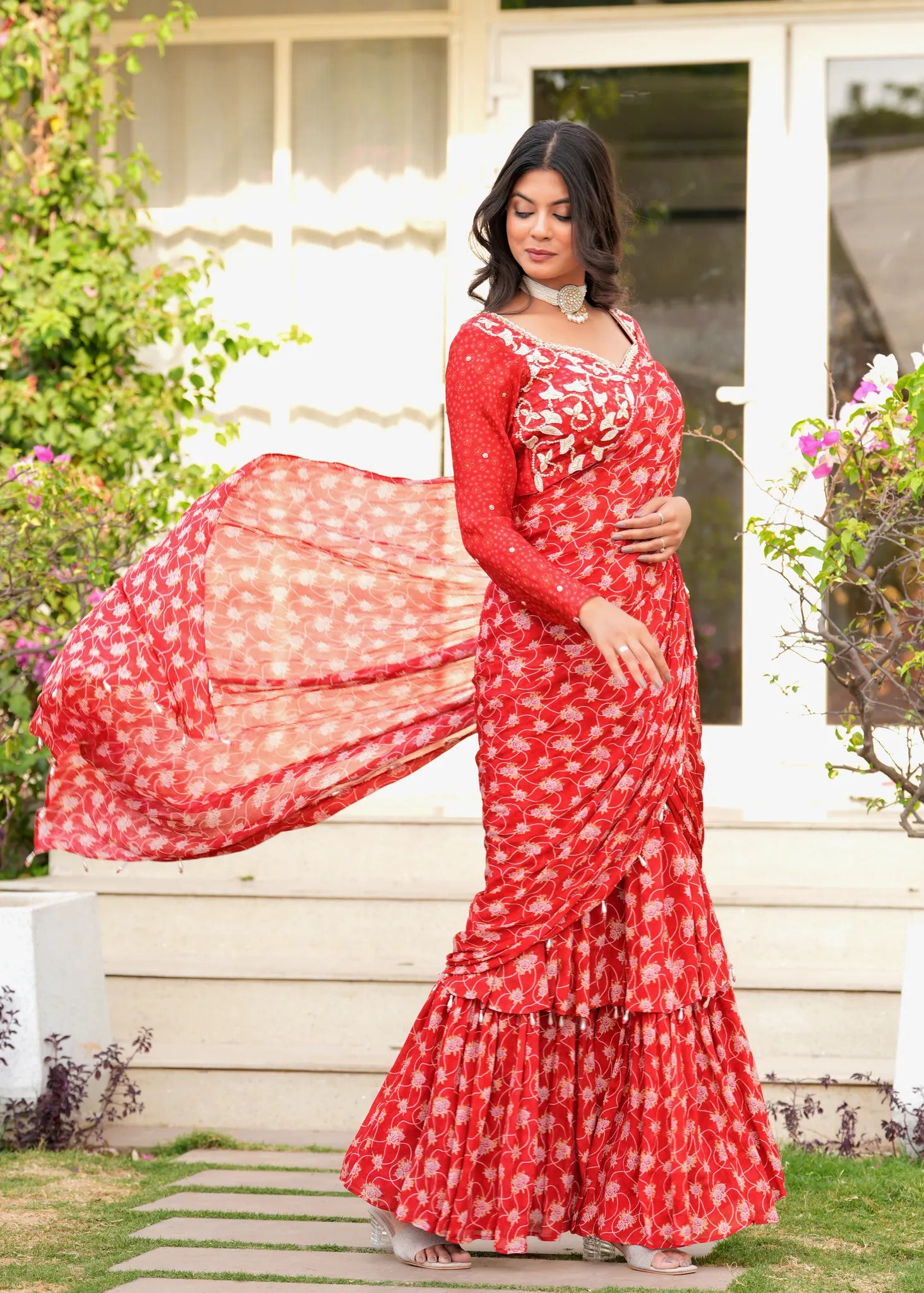 Floral Panache Kajraa Bling Ruffle Pre Draped Saree - Step into the spotlight with the Floral Panache Kajraa Bling Ruffle Pre-Draped Sari, crafted in flowy chinon chiffon for effortless grace. The pre-drape concept meets modern ease with a tiered, flared saree that brings movement and drama. Paired with a pearl and resham hand-embroidered blouse, featuring delicate bead highlights and charming back tie-ups, this ensemble is the perfect fusion of tradition and trend. Designed to make dressing seamless yet striking, it captures the allure of classic elegance with a playful, contemporary twist. Ideal for those who love statement style with minimal effort.