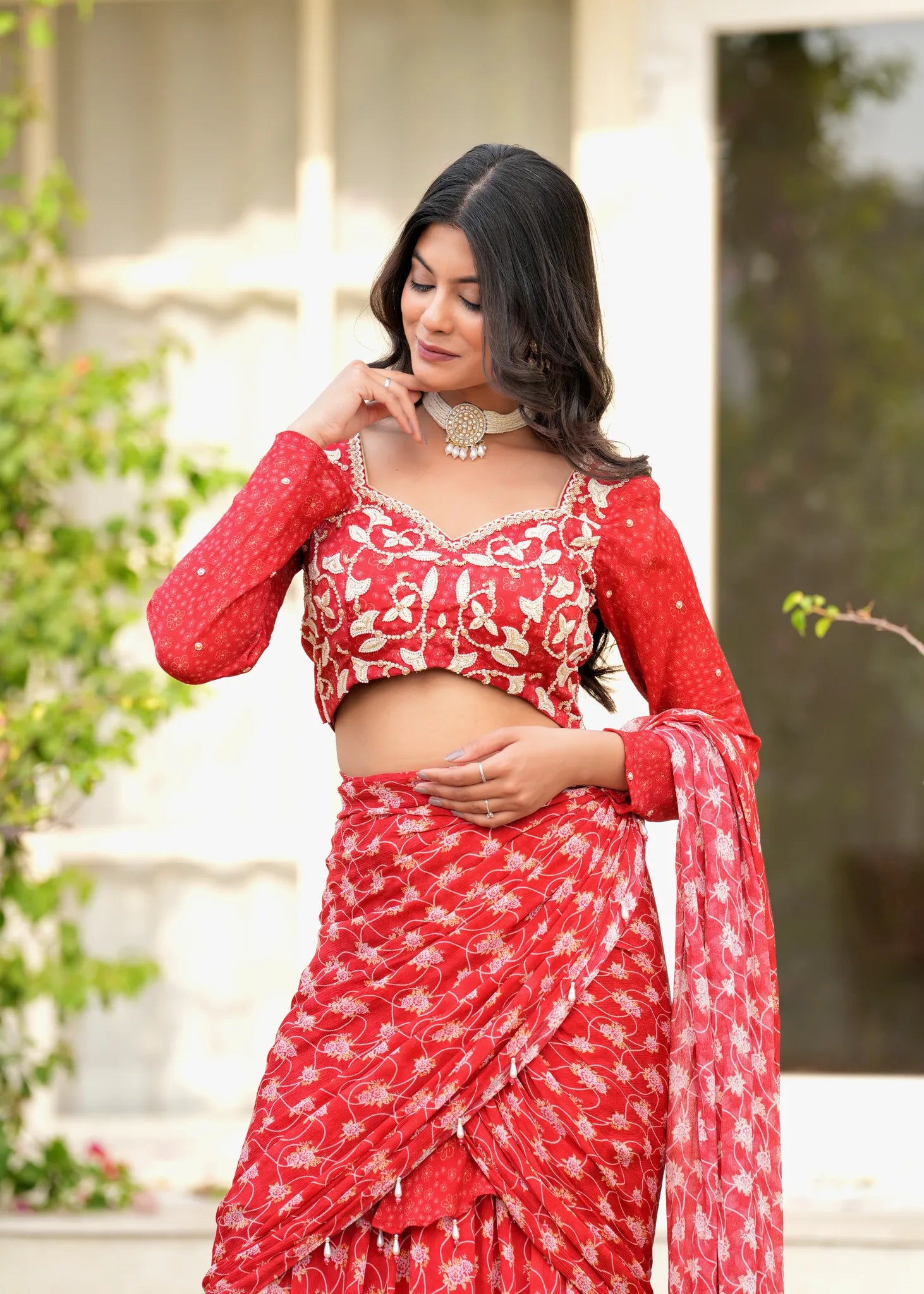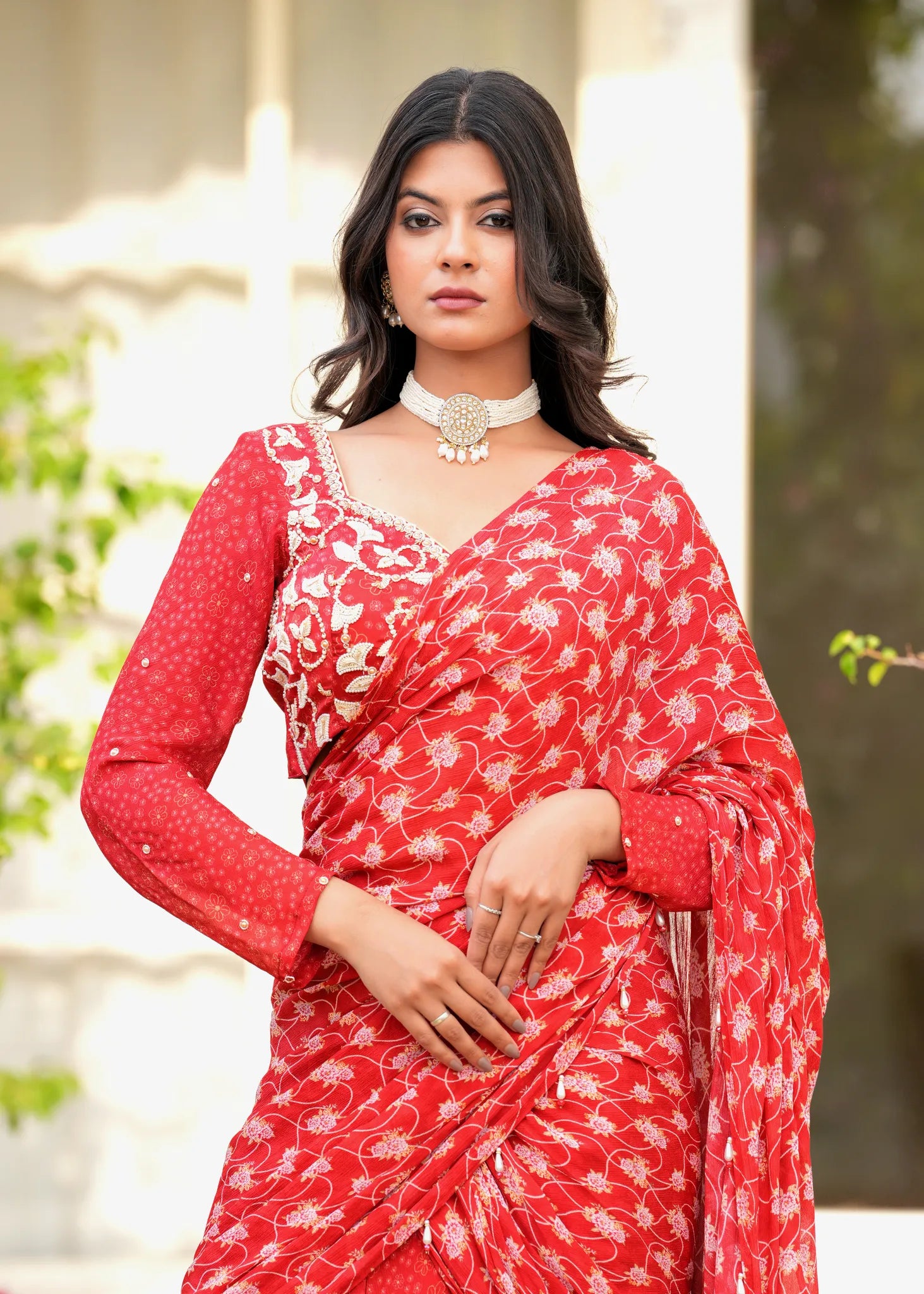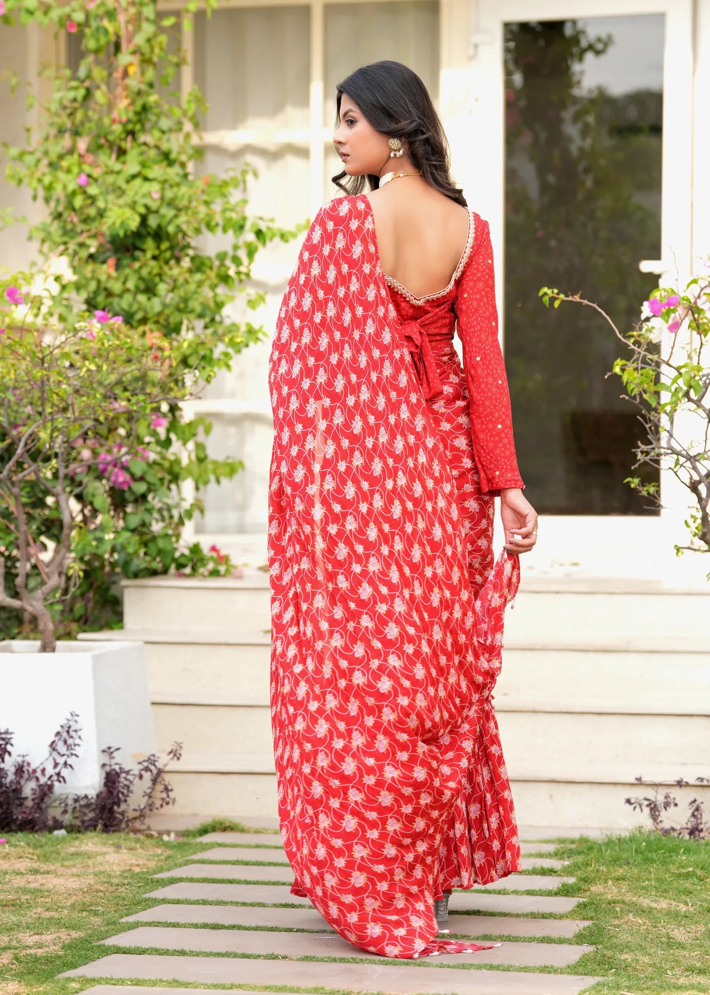 Floral Panache Kajraa Bling Ruffle Pre Draped Saree - Step into the spotlight with the Floral Panache Kajraa Bling Ruffle Pre-Draped Sari, crafted in flowy chinon chiffon for effortless grace. The pre-drape concept meets modern ease with a tiered, flared saree that brings movement and drama. Paired with a pearl and resham hand-embroidered blouse, featuring delicate bead highlights and charming back tie-ups, this ensemble is the perfect fusion of tradition and trend. Designed to make dressing seamless yet striking, it captures the allure of classic elegance with a playful, contemporary twist. Ideal for those who love statement style with minimal effort.