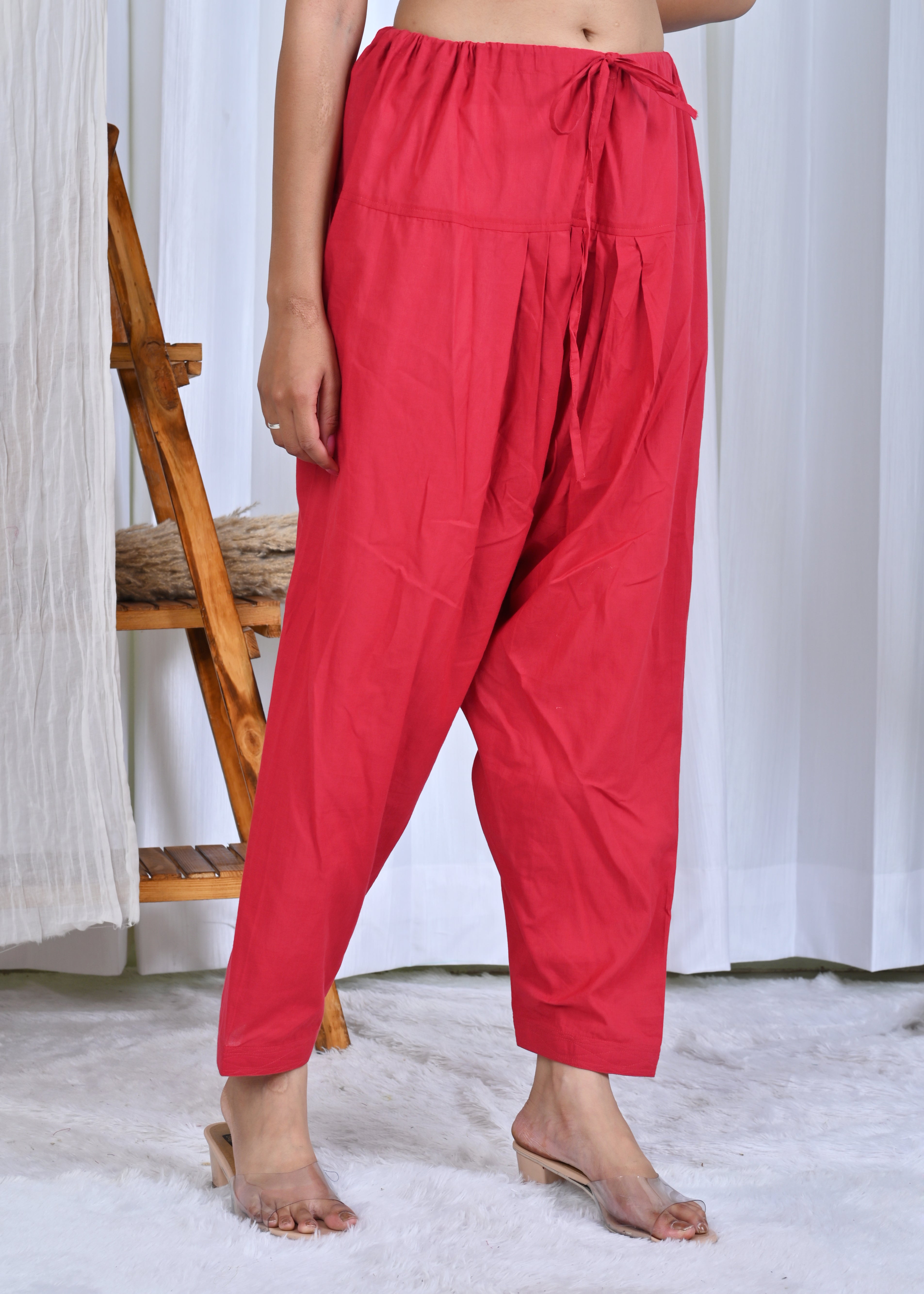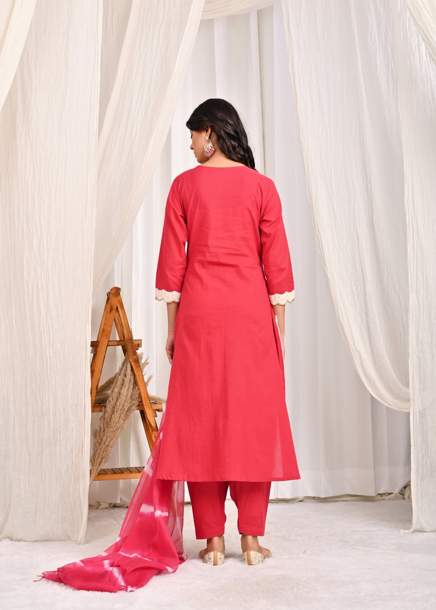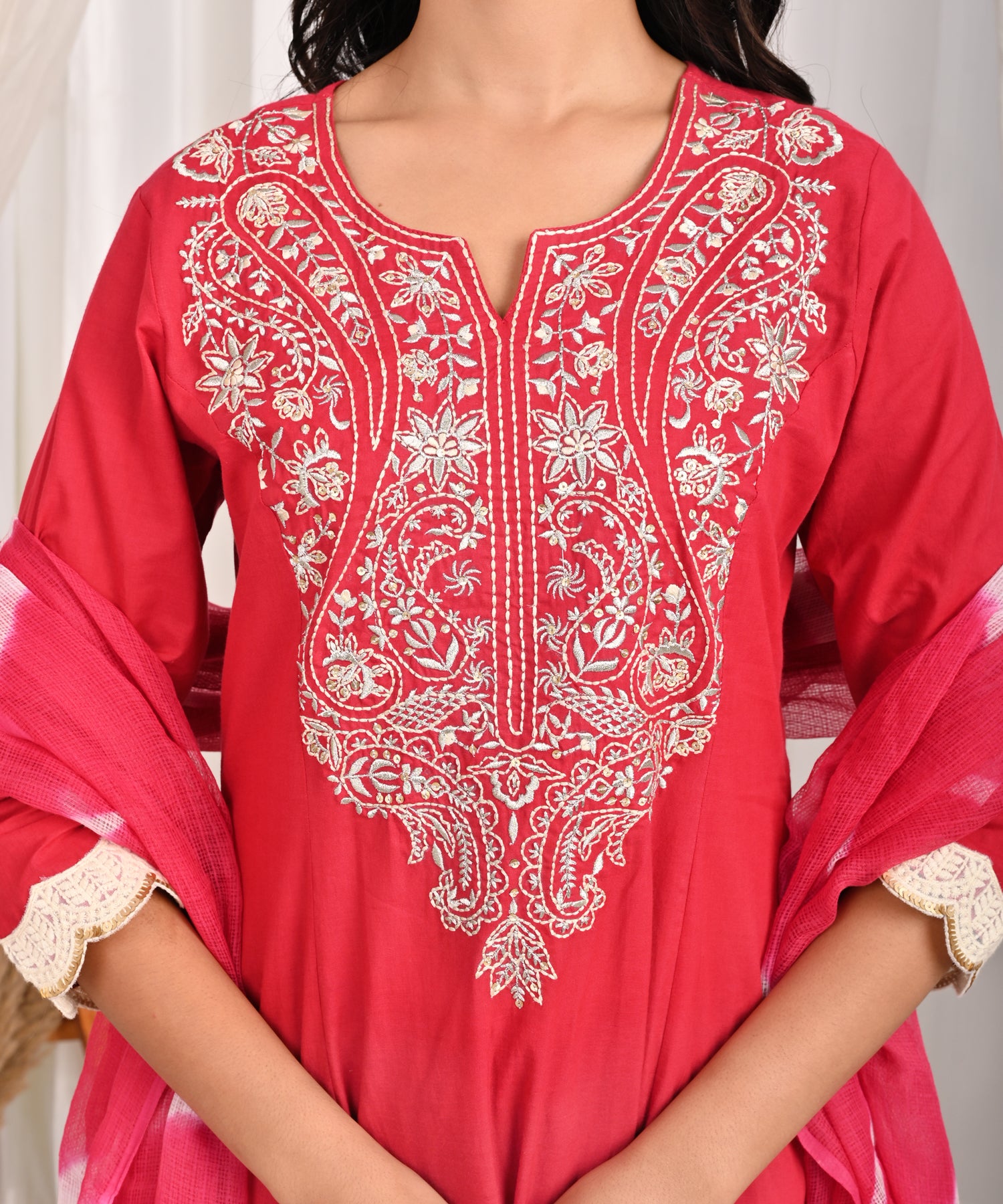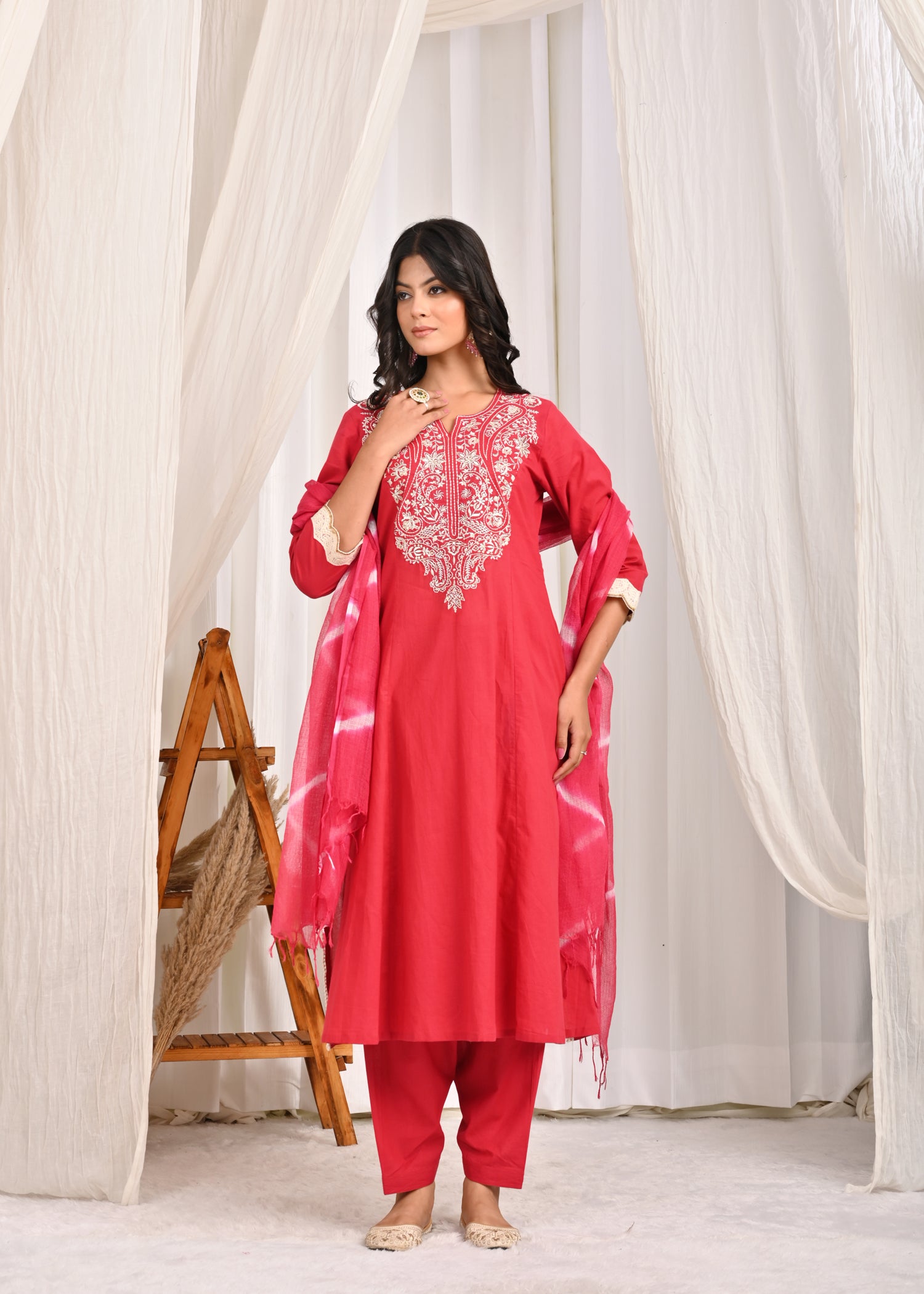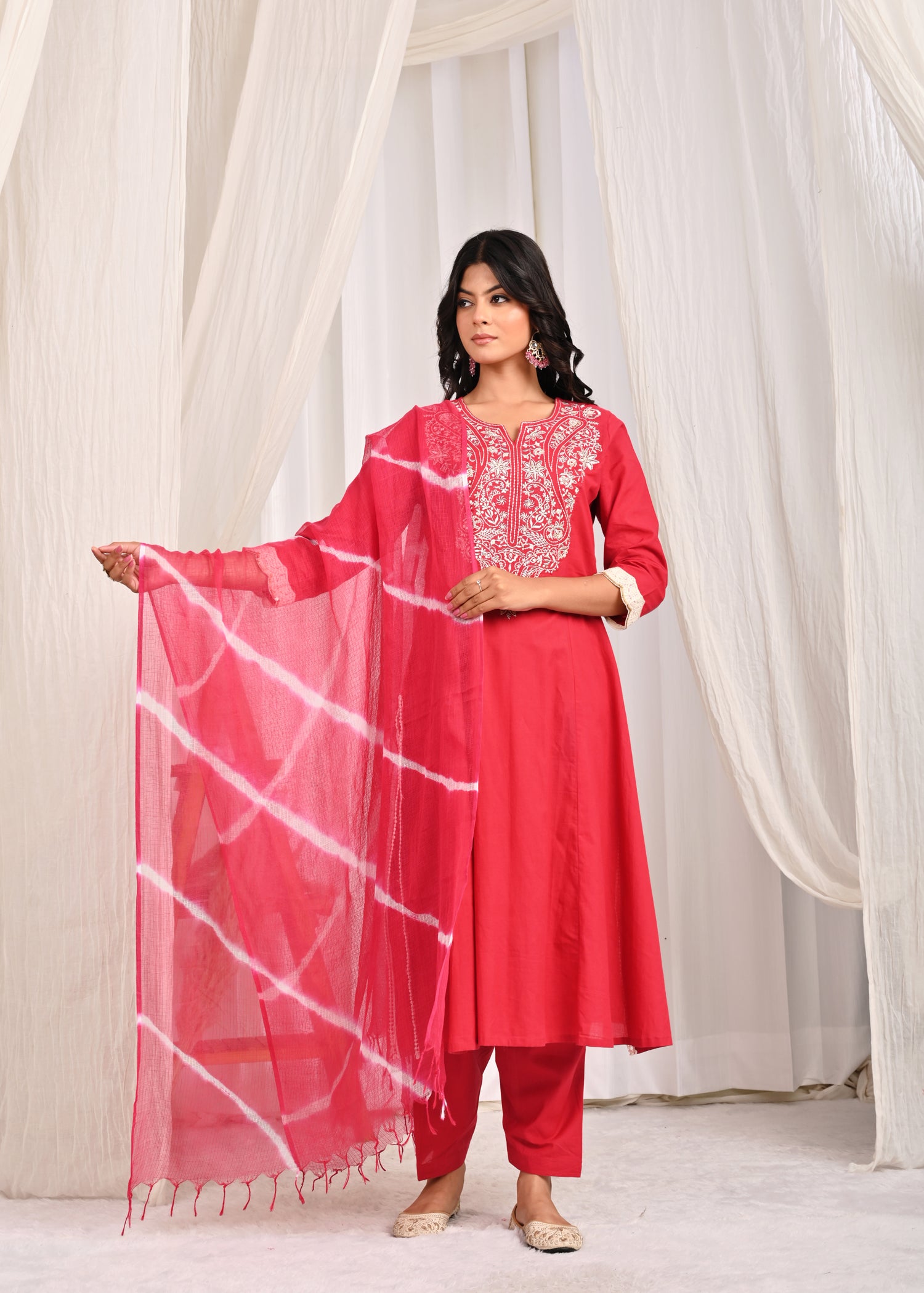 Rangmanch Laal Ritu Embroidered A-Line Kurta Set with Leheriya Dupatta- Brighten your wardrobe with this exquisite Red Pure Cotton Kurta Set. The kurta, crafted from comfortable cotton, features an elegant round neckline and a beautifully embroidered yoke with fine Resham embroidery. Delicate crochet lace detailing finishes the look, perfectly complementing the solid pants and the vibrant Leheriya Tie & Dye Kota Doria Dupatta. This ensemble is a celebration of festive color and refined craftsmanship.
