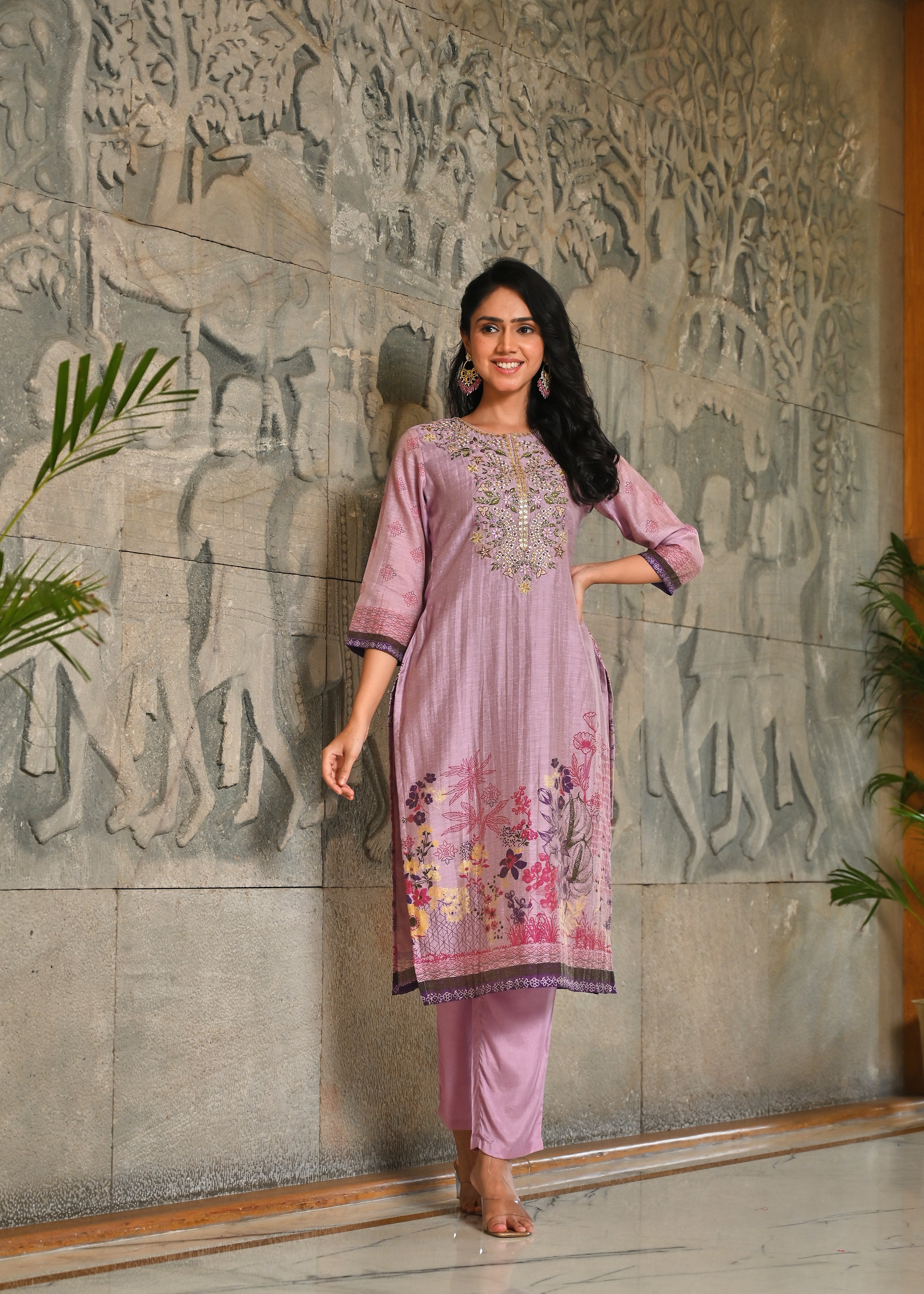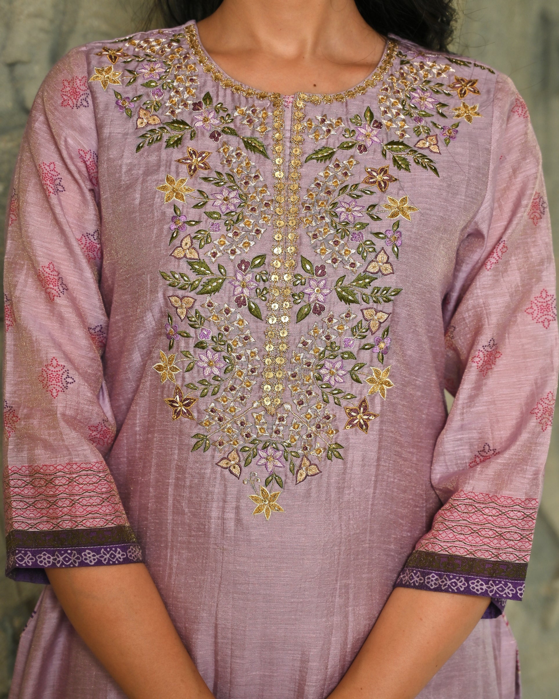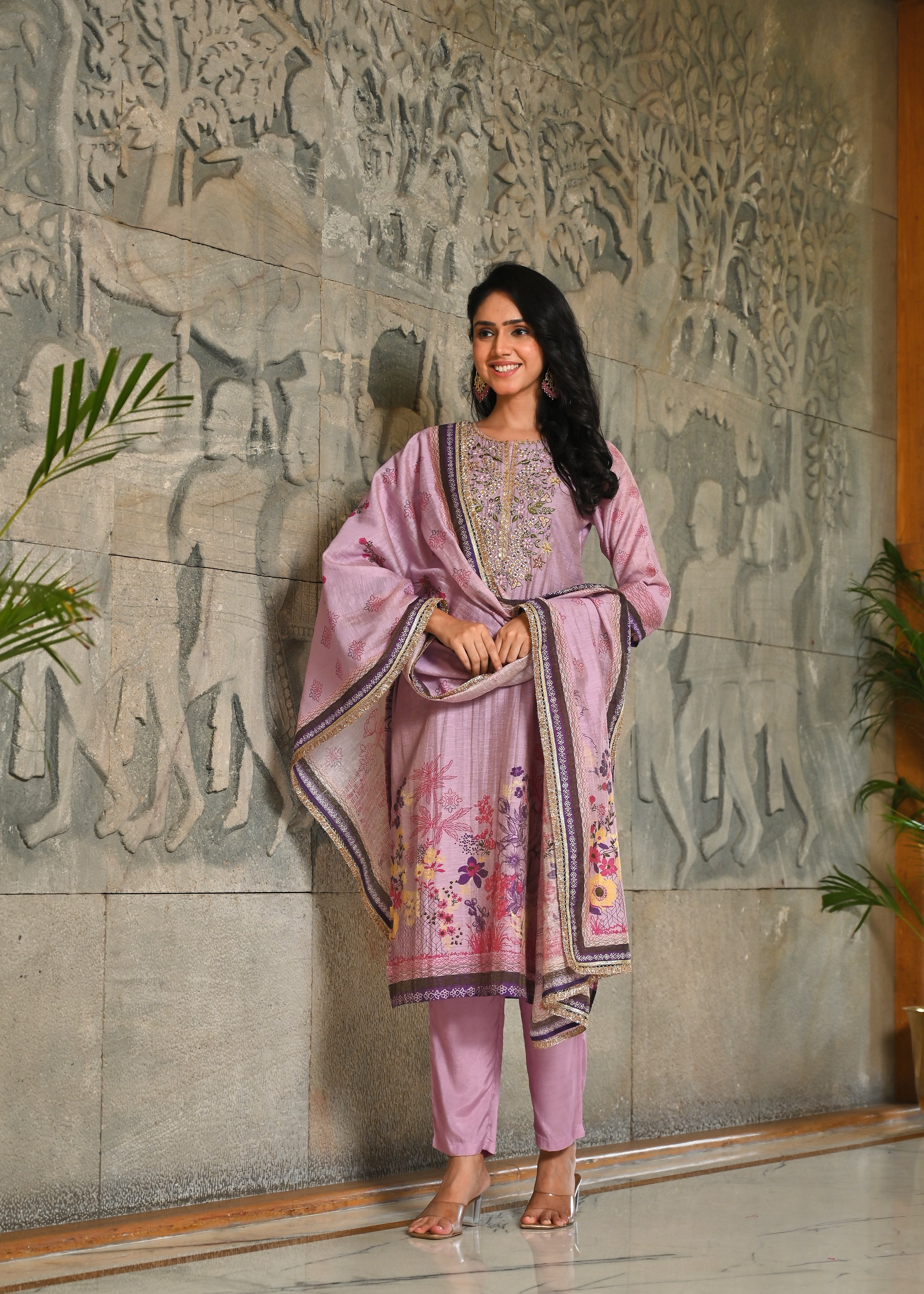 Floral Panache Lavender Zari - Kari & Phool Silk Kurta Dupatta Set- Drape yourself in the soft splendor of this exquisite Lavender Kurta-Dupatta Set. Crafted from luxurious Aurum Silk, the kurta features a classic round neckline. The beauty is centered on the yoke, which is beautifully accented with intricate Zari and delicate Resham hand-embroidery. Subtle floral prints adorn the front, along with coordinating solid pant. Paired with a matching silk dupatta, this set is a perfect blend of traditional artistry and contemporary grace.