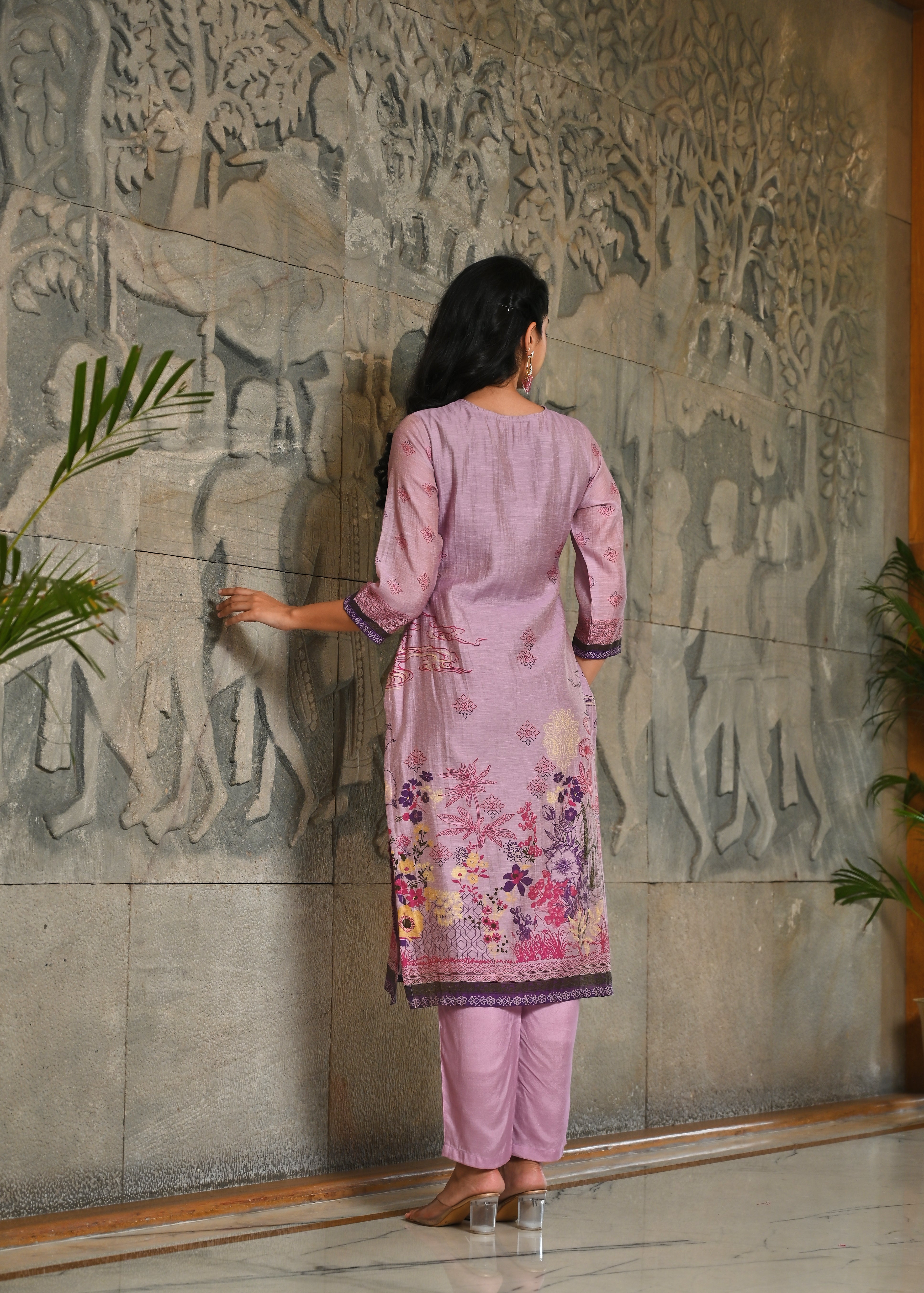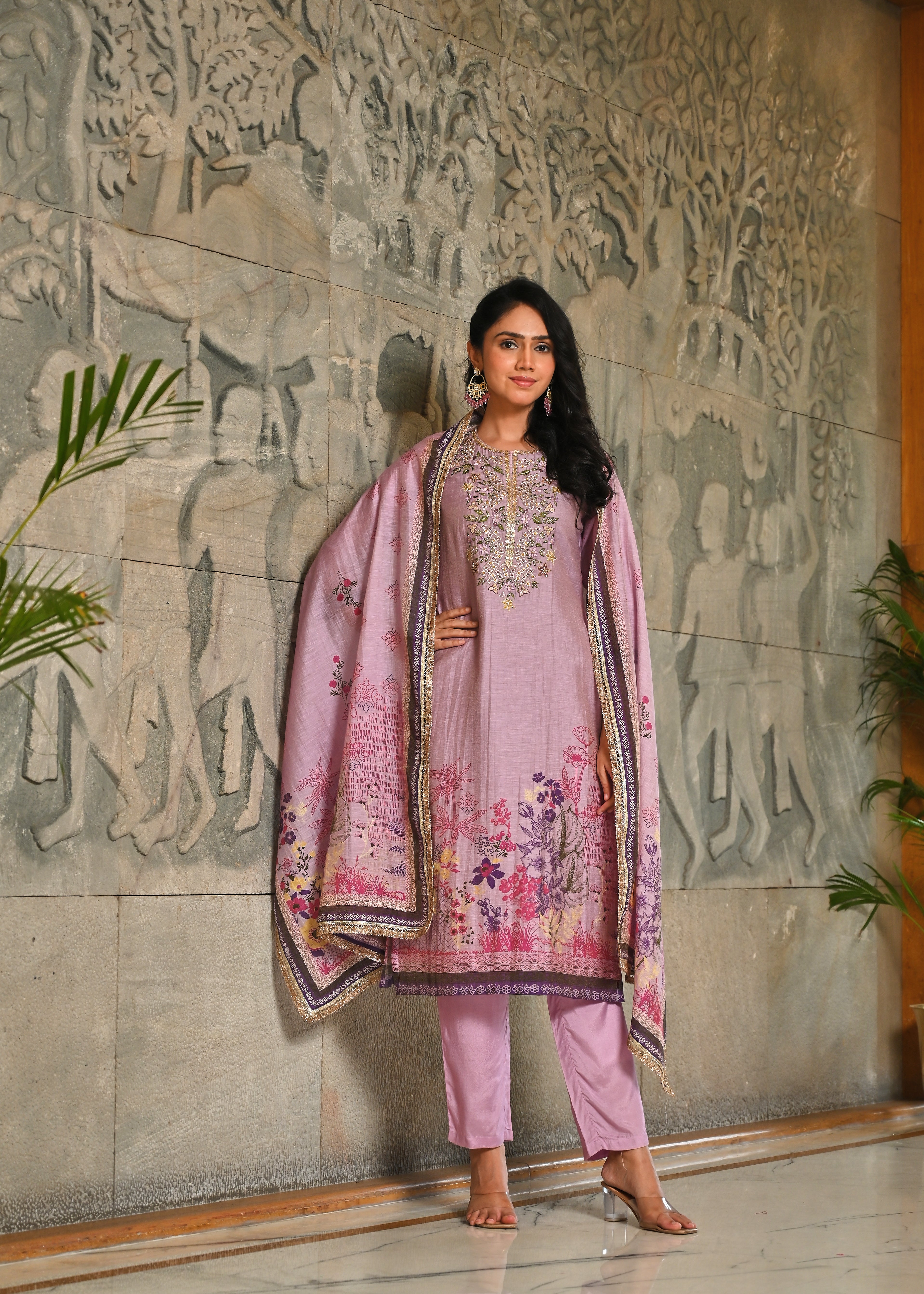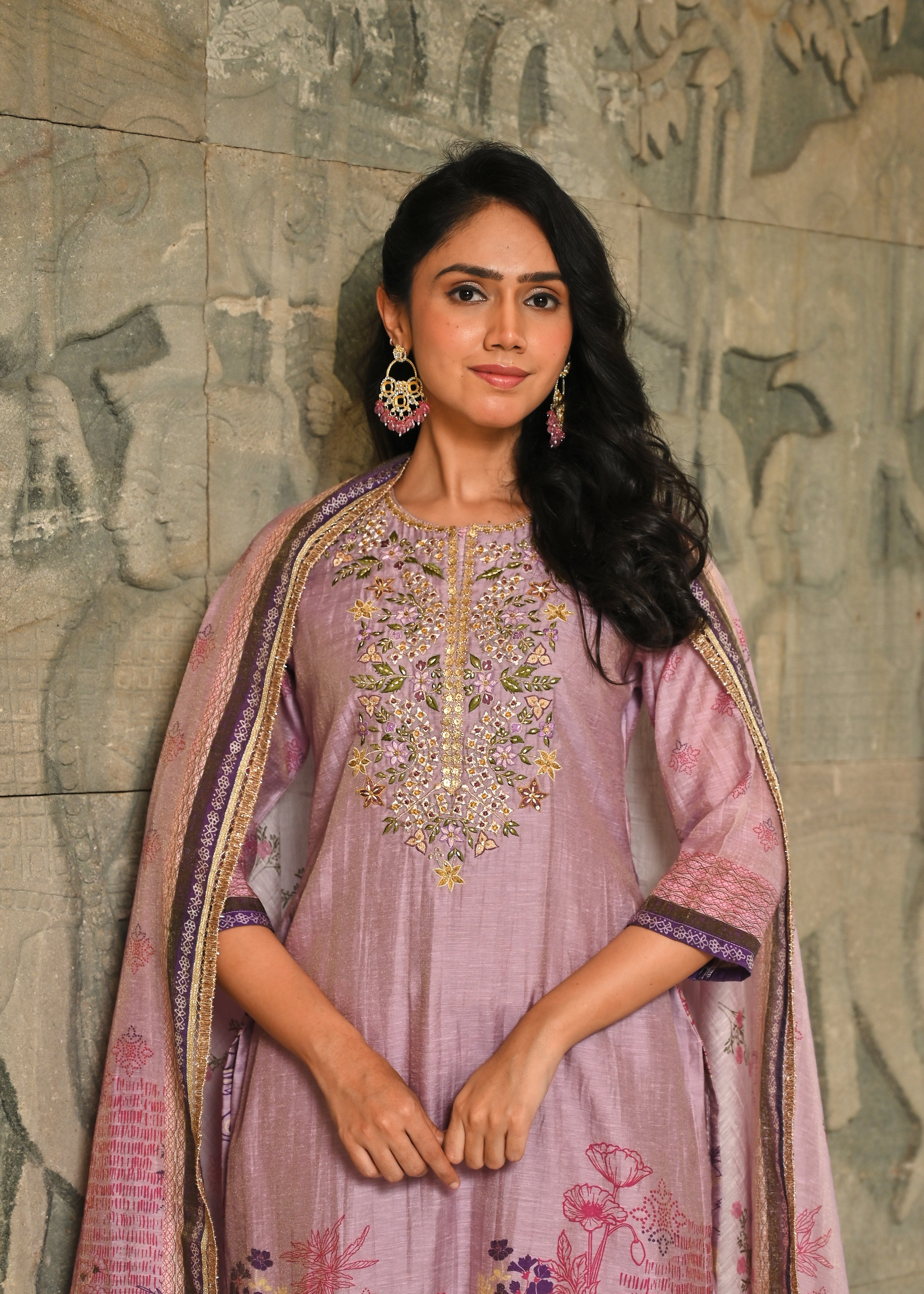 Floral Panache Lavender Zari - Kari & Phool Silk Kurta Dupatta Set- Drape yourself in the soft splendor of this exquisite Lavender Kurta-Dupatta Set. Crafted from luxurious Aurum Silk, the kurta features a classic round neckline. The beauty is centered on the yoke, which is beautifully accented with intricate Zari and delicate Resham hand-embroidery. Subtle floral prints adorn the front, along with coordinating solid pant. Paired with a matching silk dupatta, this set is a perfect blend of traditional artistry and contemporary grace.