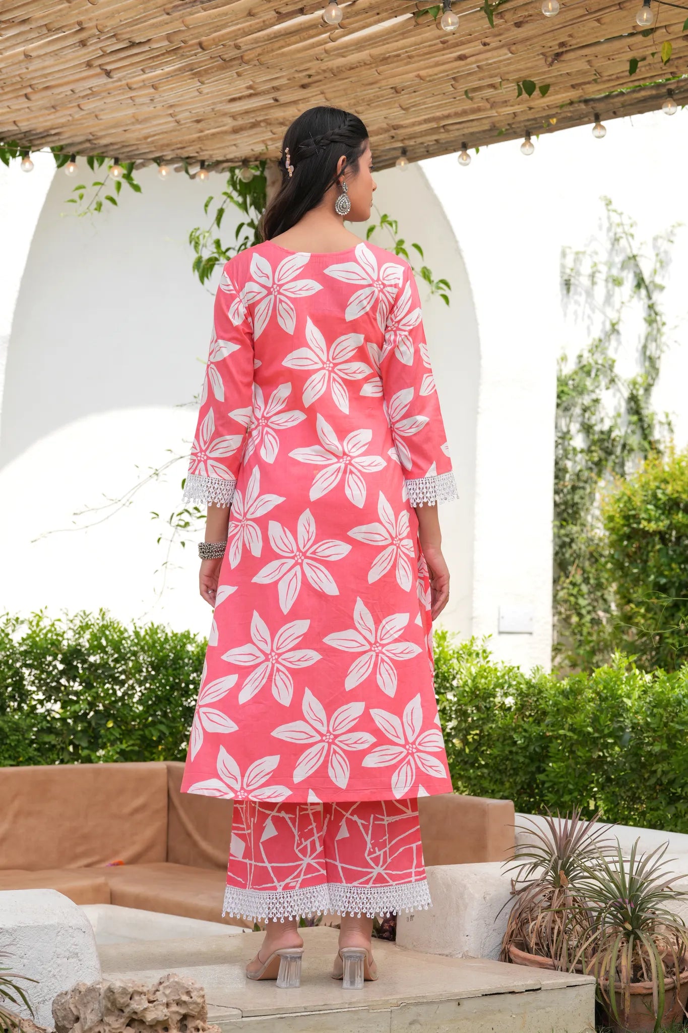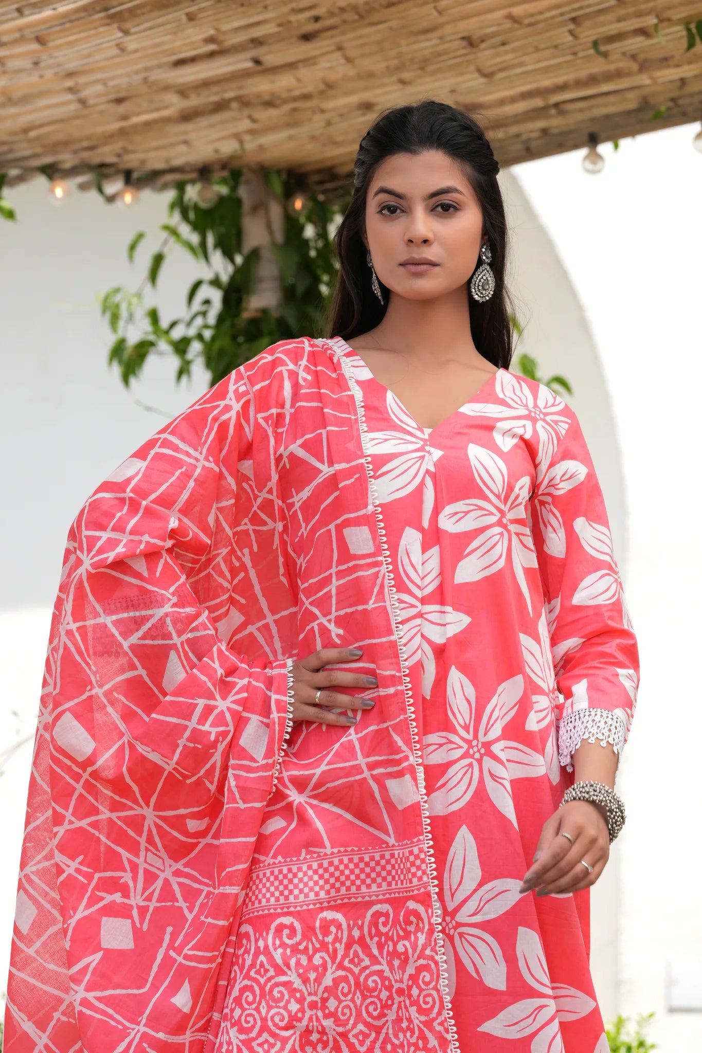 Manchali Heer Bright Peach A-Line Cotton Kurta Set - Step into effortless elegance with the Manchali Heer Bright Peach Cotton Kurta Set, a delightful celebration of color and craft. The A-line pleated kurta showcases abstract floral prints, brought to life with finished with elegant crochet lace detailing on the sleeves and palazzo hem. Paired with a matching printed cotton palazzo and a soft, airy cotton dupatta, this ensemble is a perfect blend of comfort and festive finesse. Light, luminous, and made to charm.