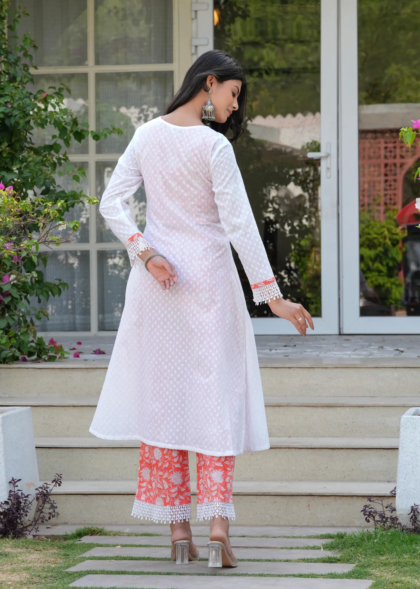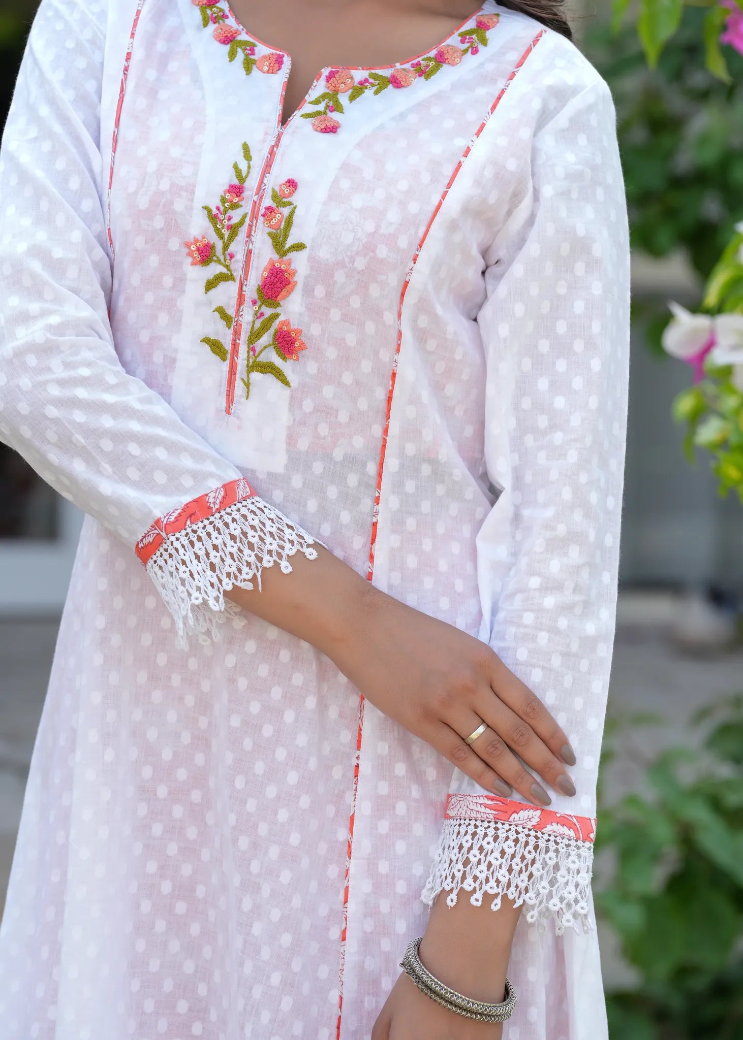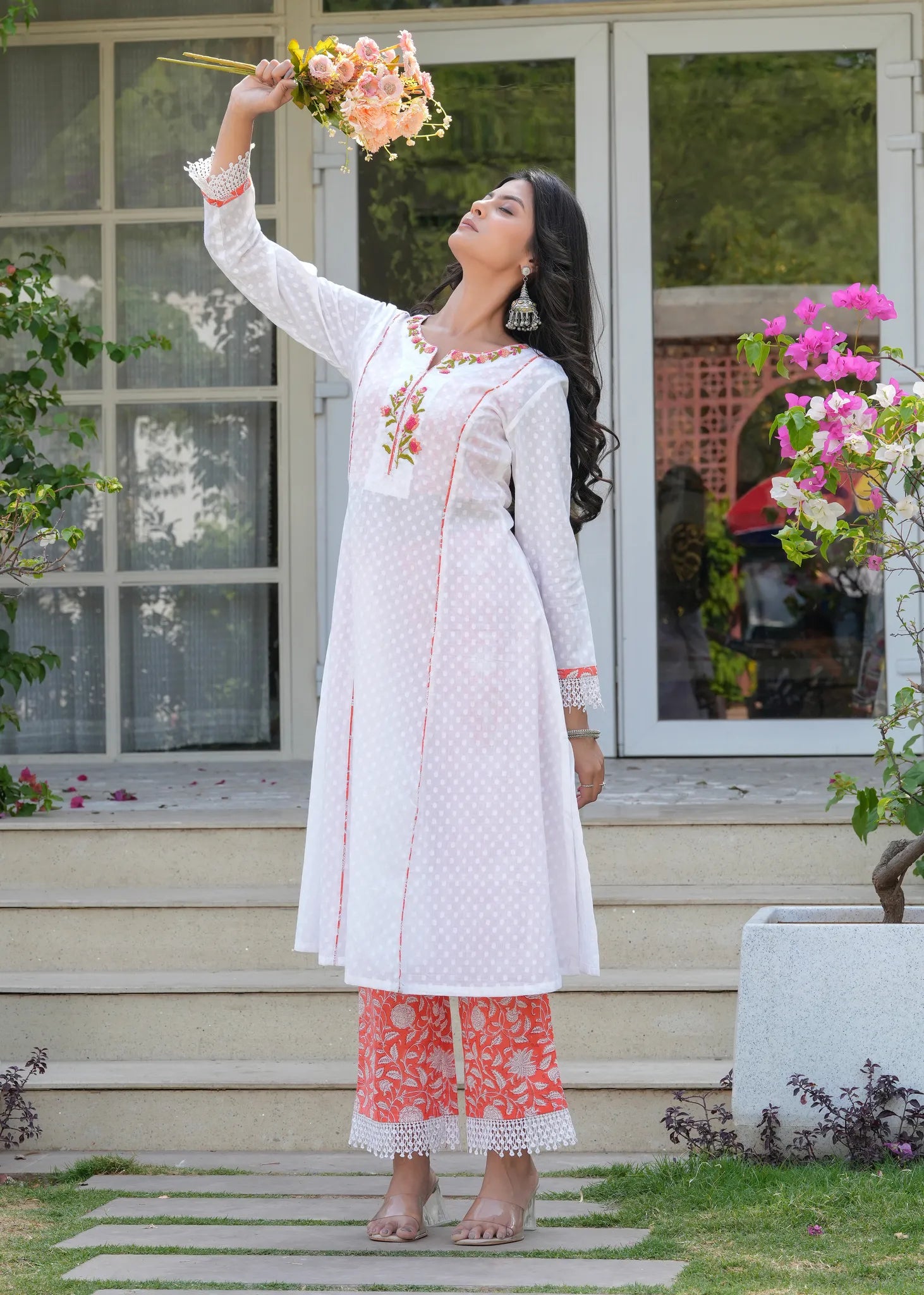 Manchali Heer Floral Hand Work Nazma A-Line Kurta Set - Elevate your ethnic wardrobe with the Manchali Heer Nazma Kurta Set — a graceful fusion of tradition and charm. This A-line paneled kurta, crafted in soft cotton dobby, features a round neckline adorned with delicate anchor floral handwork and shimmering sequin accents. Paired beautifully with a printed block crop top and matching palazzo pants, both designed in breathable cotton, the ensemble is finished with elegant crochet lace detailing on the sleeves and palazzo hem. A perfect blend of artisanal beauty and contemporary flair.