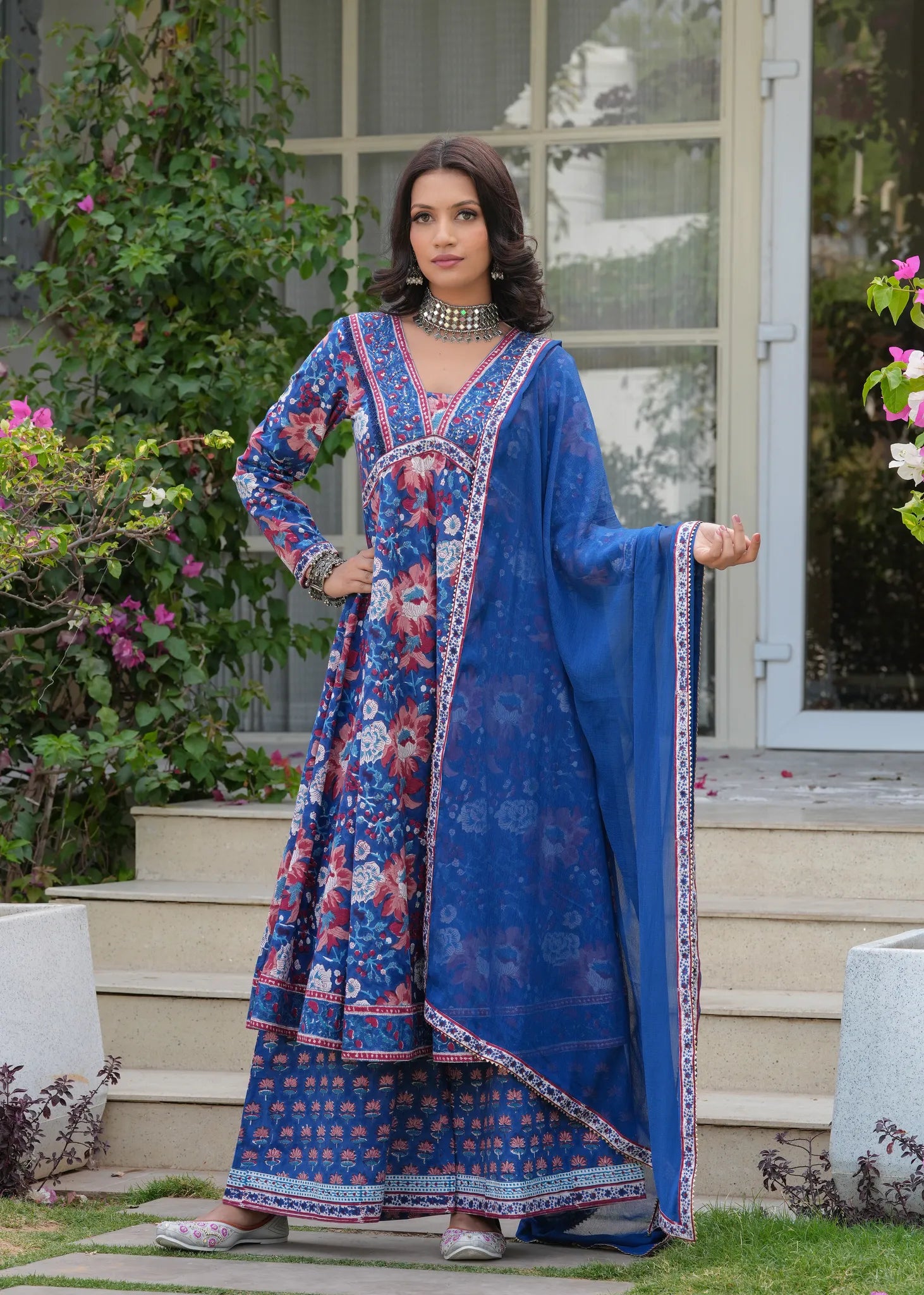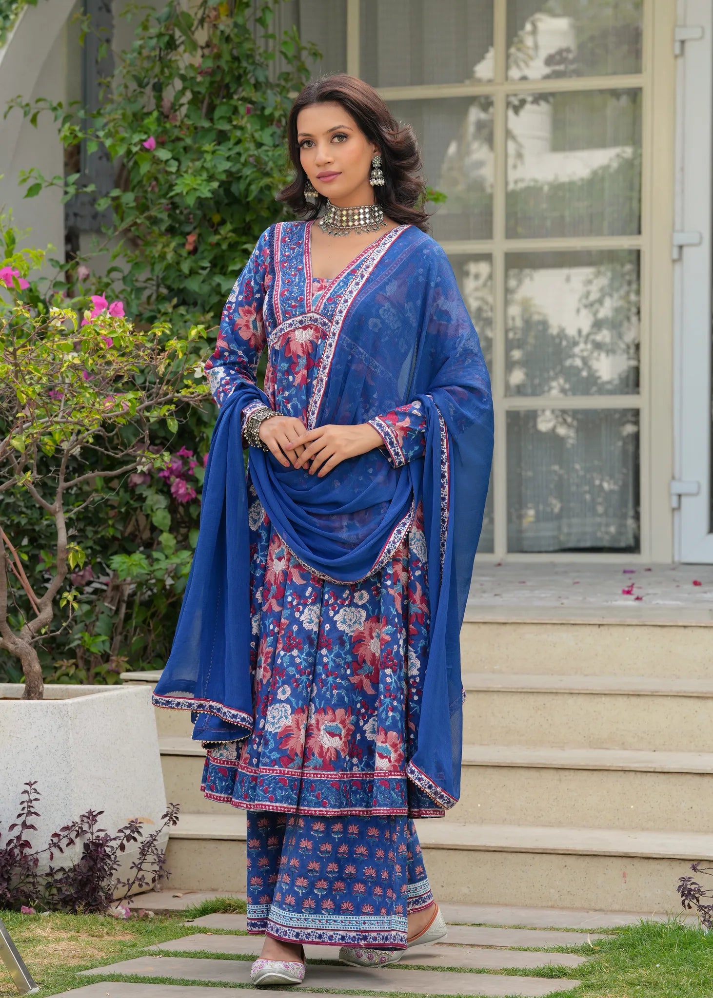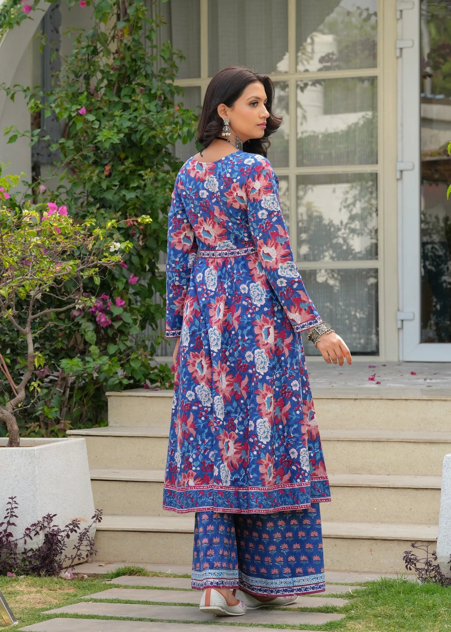 Manchali Heer Neel Bahar Hand Blocked A-Line Kurta Set - Embrace the beauty of tradition with the Manchali Heer Neel Bahar Hand Blocked A-Line Kurta Set. Crafted from soft cotton, this A-line flared kurta features exquisite ethnic floral Sanganeri prints, beautifully adorned with sequins and resham embroidery along the neckline for a touch of elegance. The set is completed with matching flared palazzos and a solid blue chiffon dupatta with delicate border detailing. Graceful, vibrant, and perfect for any festive celebration or evening gathering.
