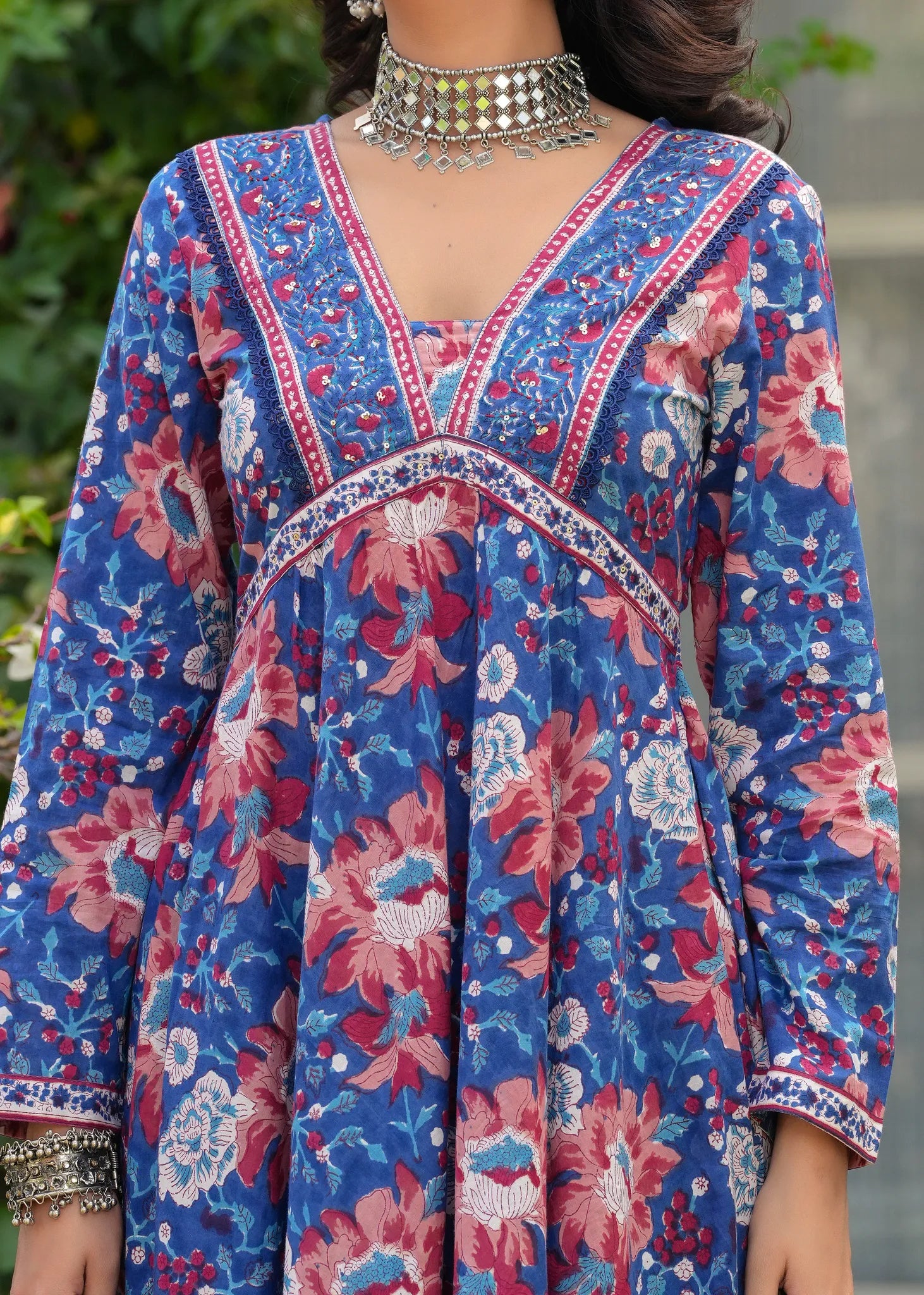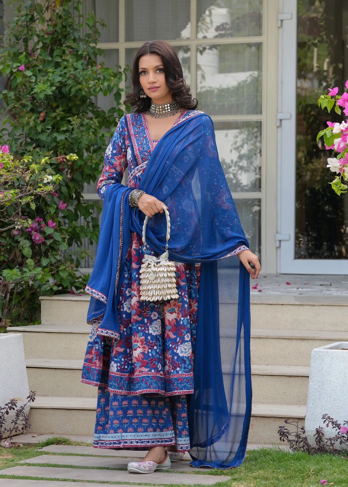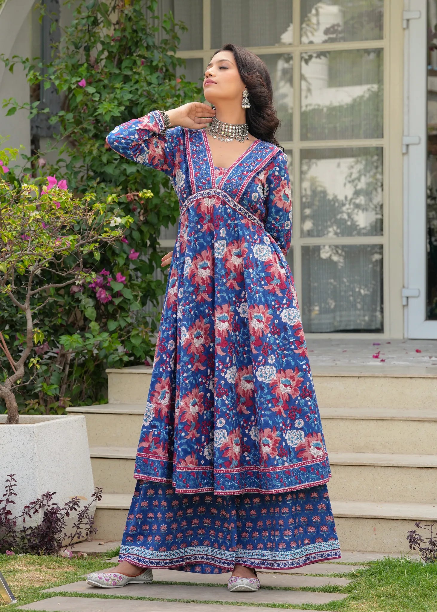 Manchali Heer Neel Bahar Hand Blocked A-Line Kurta Set - Embrace the beauty of tradition with the Manchali Heer Neel Bahar Hand Blocked A-Line Kurta Set. Crafted from soft cotton, this A-line flared kurta features exquisite ethnic floral Sanganeri prints, beautifully adorned with sequins and resham embroidery along the neckline for a touch of elegance. The set is completed with matching flared palazzos and a solid blue chiffon dupatta with delicate border detailing. Graceful, vibrant, and perfect for any festive celebration or evening gathering.