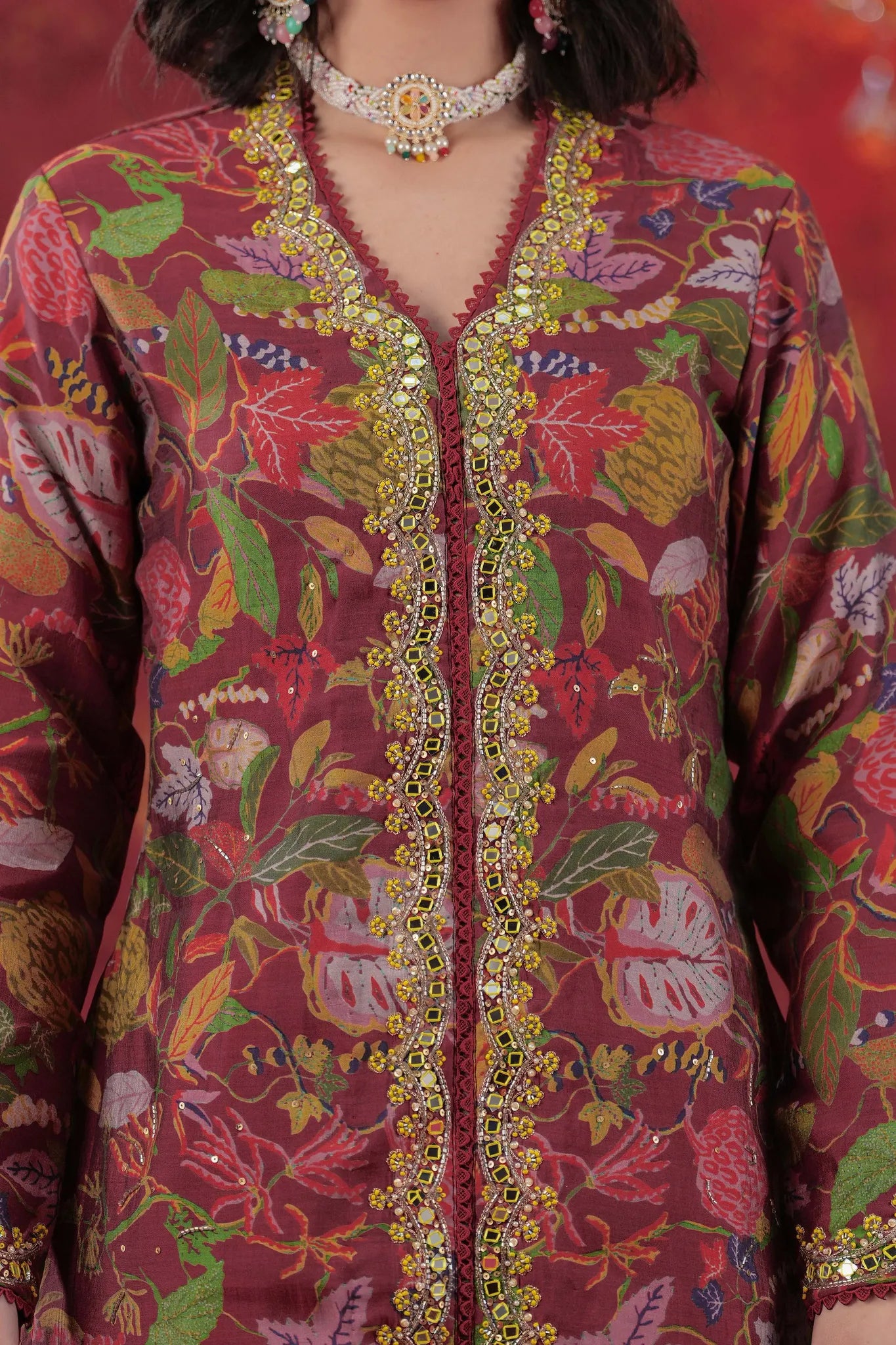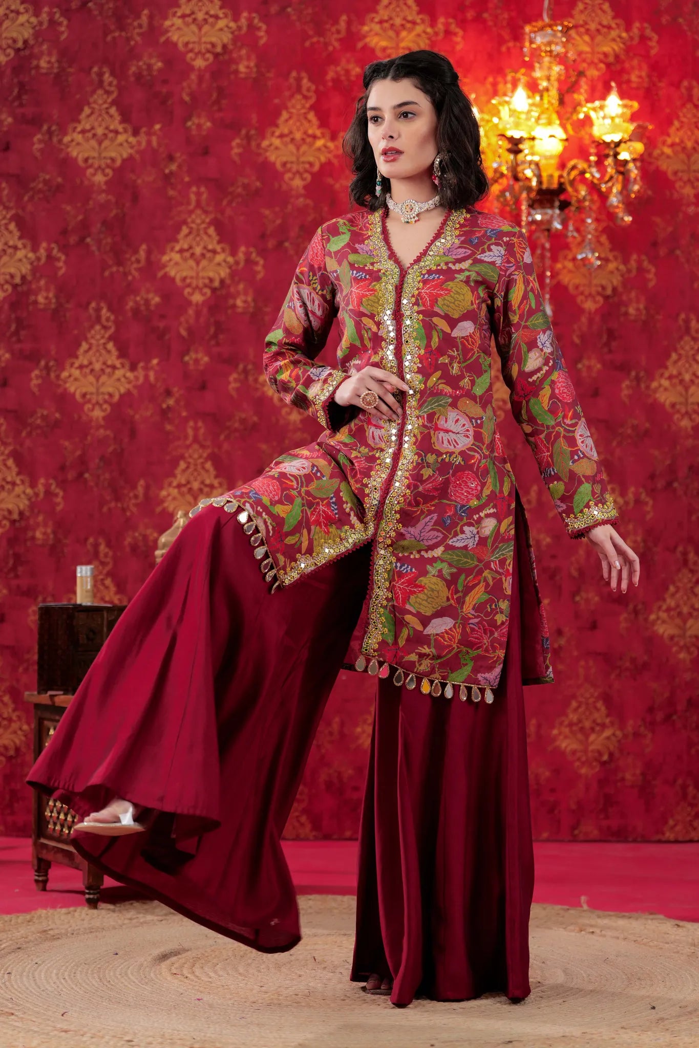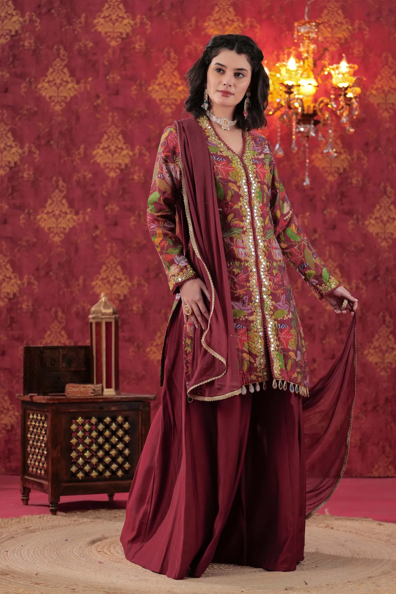 Floral Panache Maroon Desire Hand Embellished Sharara Set - Radiate timeless charm in this exquisite hand-embellished sharara set. Featuring an abstract floral-printed, mirror work embroidered jacket-style kurta, paired with a solid flared sharara and a flowing chiffon dupatta — this ensemble is a perfect blend of tradition and modern elegance. Delicate mirror accents catch the light with every move, while the rich maroon palette adds depth and drama. A show-stopping choice for celebrations where style meets sophistication.