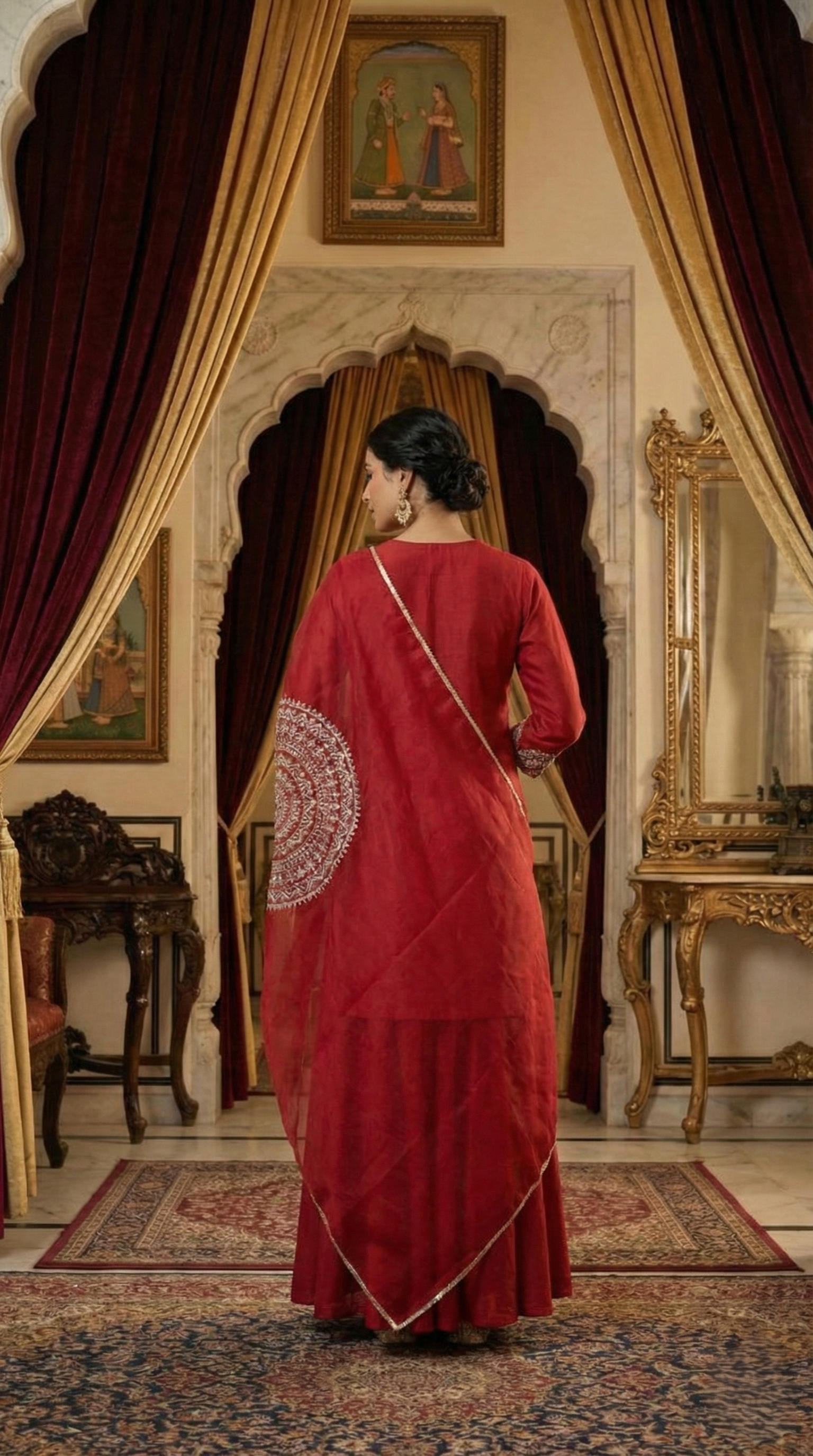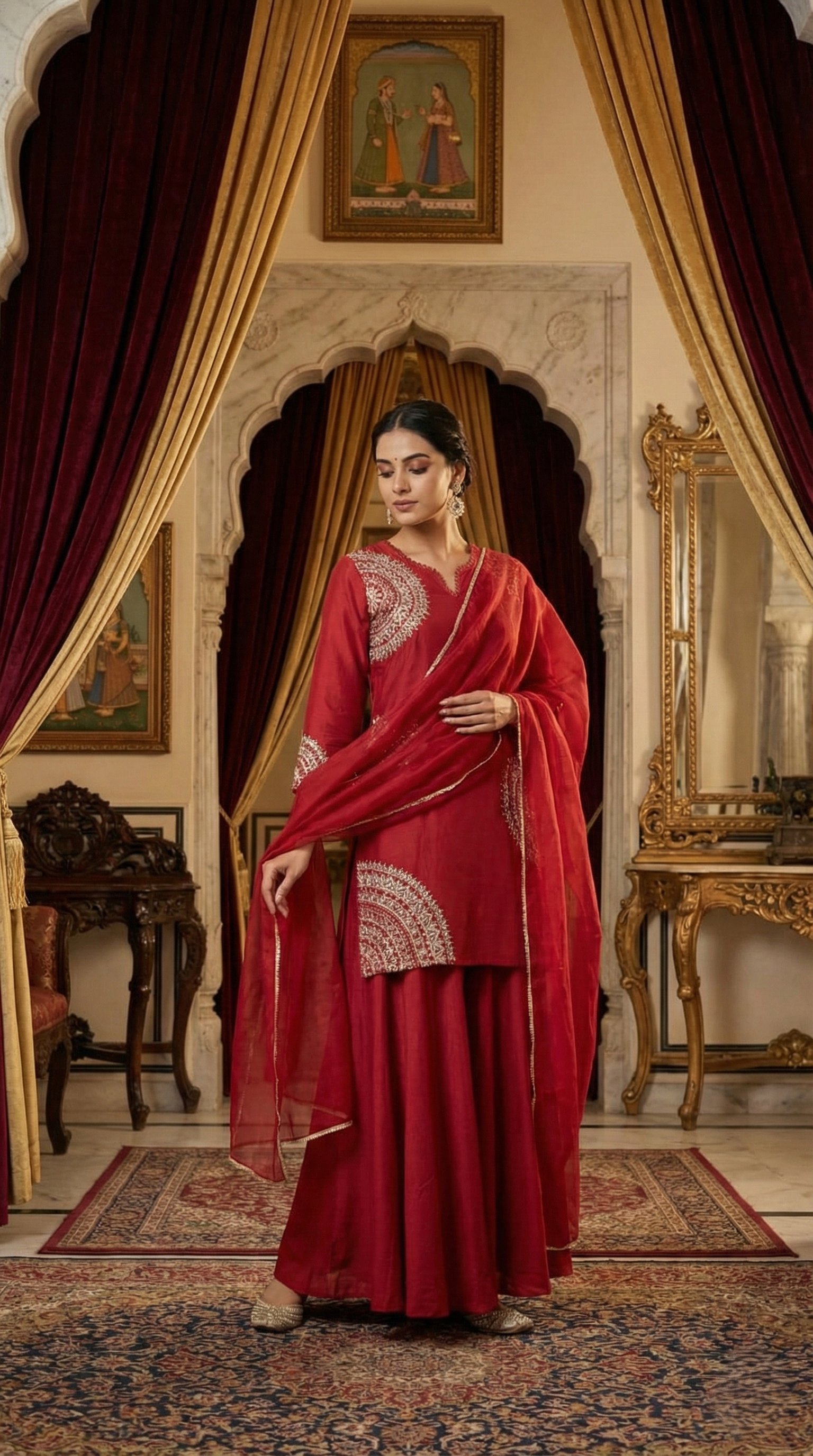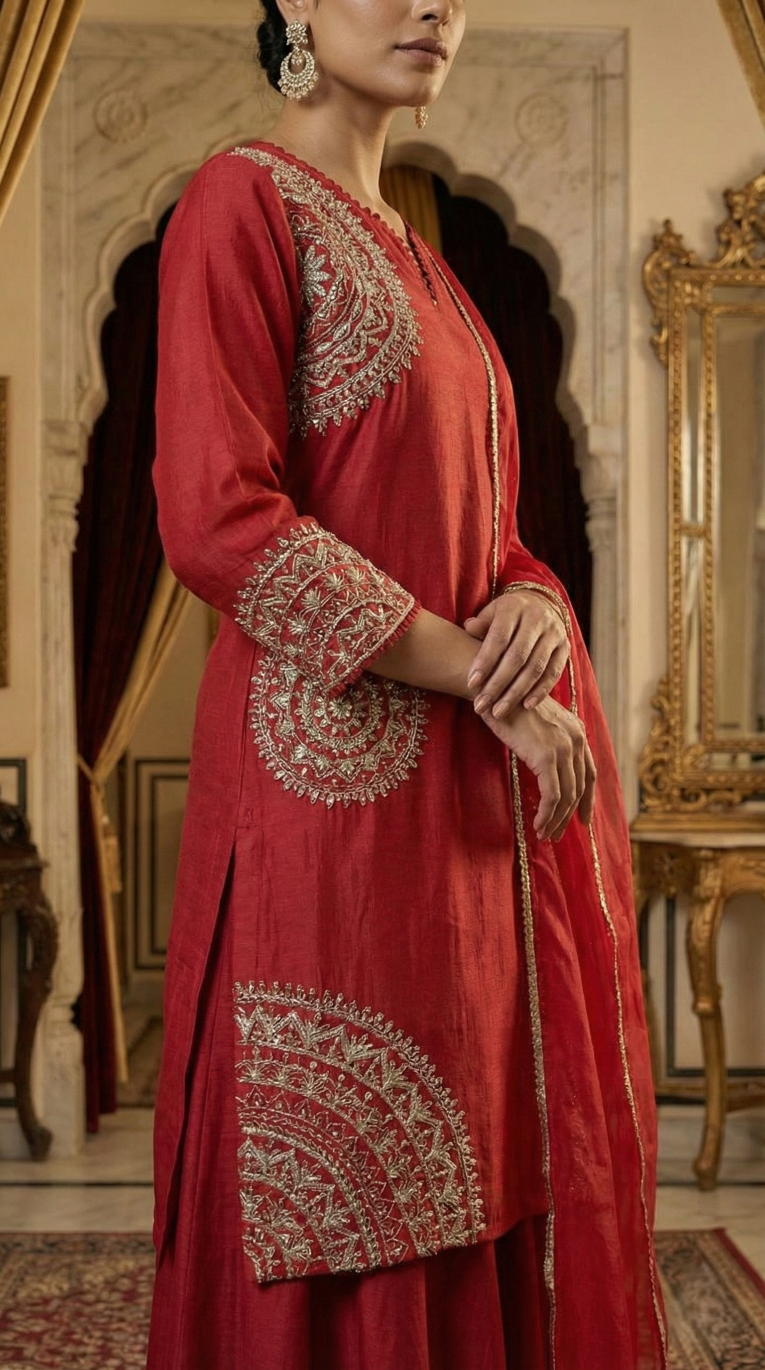 Immerse yourself in the unparalleled luxury of this straight-fit kurta, masterfully sculpted from the finest pure slub silk. The bodice serves as a canvas for a breathtaking display of Zari embroidery, where shimmering golden threads form intricate, celestial patterns across the front. Designed with a timeless round neckline, the kurta radiates a poised and dignified charm. The silhouette is dramatically elevated by a solid sharara, also fashioned from pure slub silk, which flows with a majestic volume that commands attention with every stride. Completing this grand sartorial vision is a diaphanous organza dupatta, adorned with delicate solid dori embroidery that adds a layer of ethereal texture and artisanal depth. This outfit is a definitive choice for the modern aristocrat, perfectly blending the richness of heritage with a contemporary, high-fashion sensibility.
