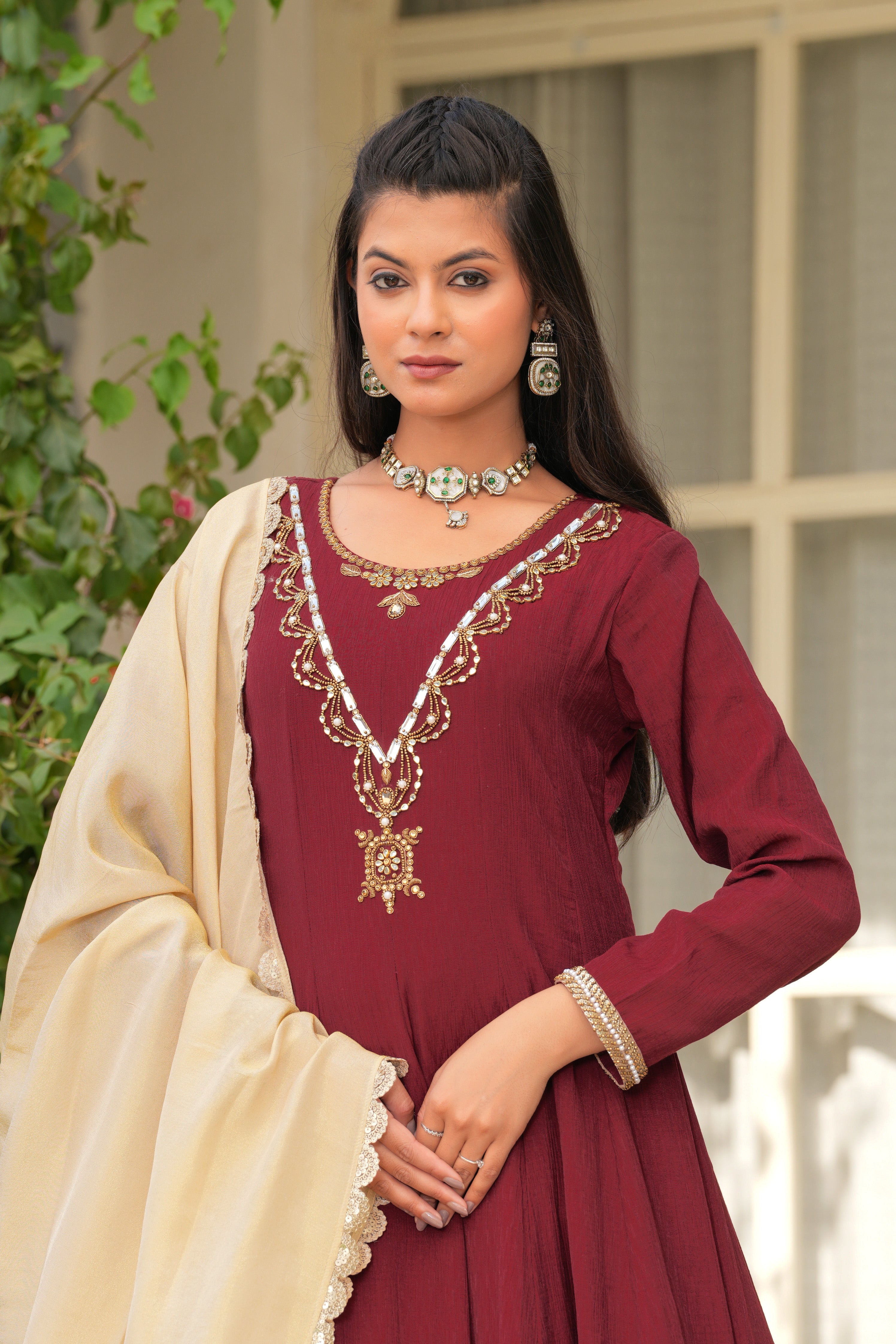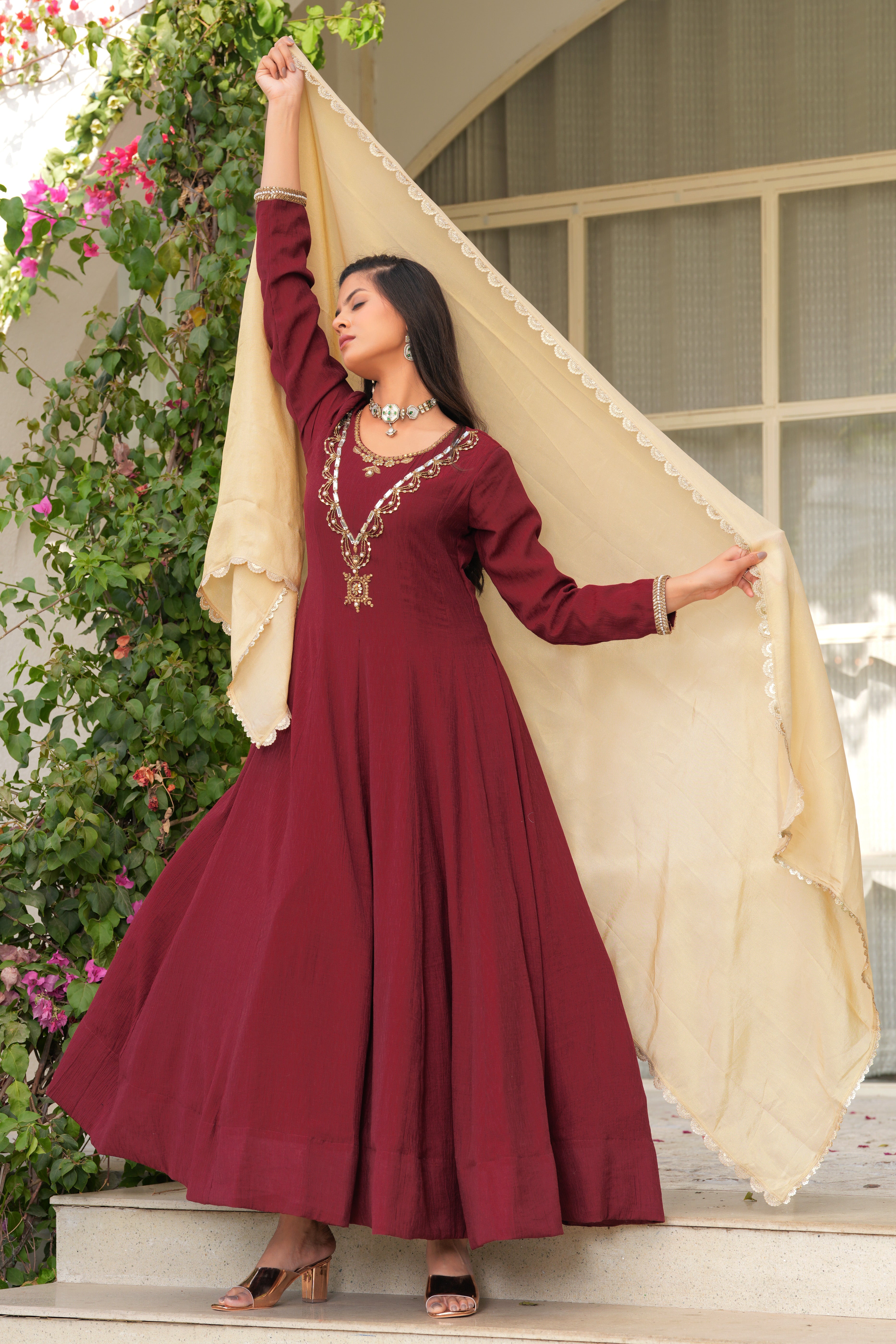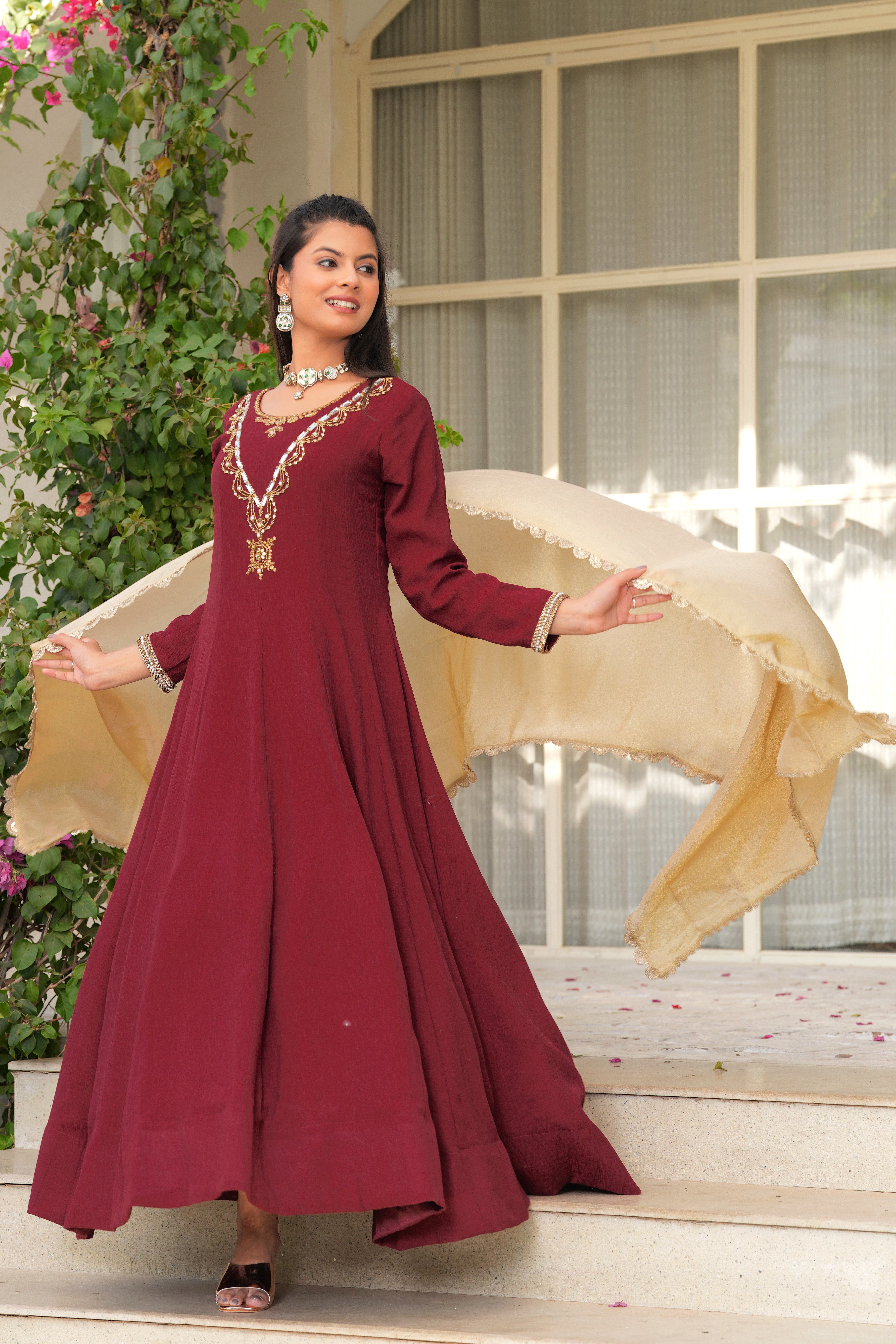 Maharani Vibes Maroon Rani Haar Marsala Anarkali Dress with Tissue Dupatta- Unveil royal elegance in this Marsala chiffon jacquard maxi dress, featuring a round neck, long sleeves, and intricate haar-style embroidery with pearls, zardozi, sequins, and beads, paired with a gold crush tissue dupatta for grand festive allure.