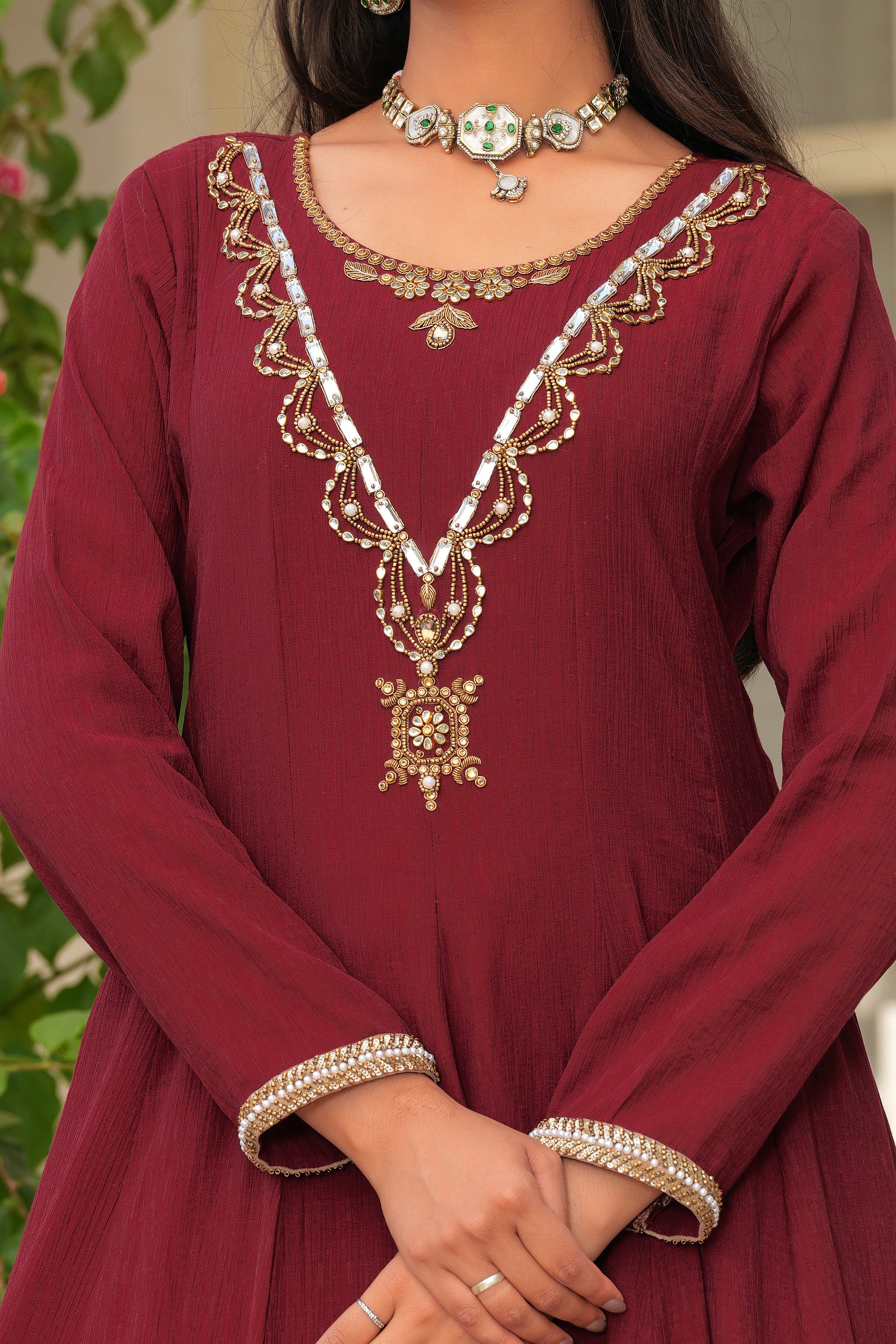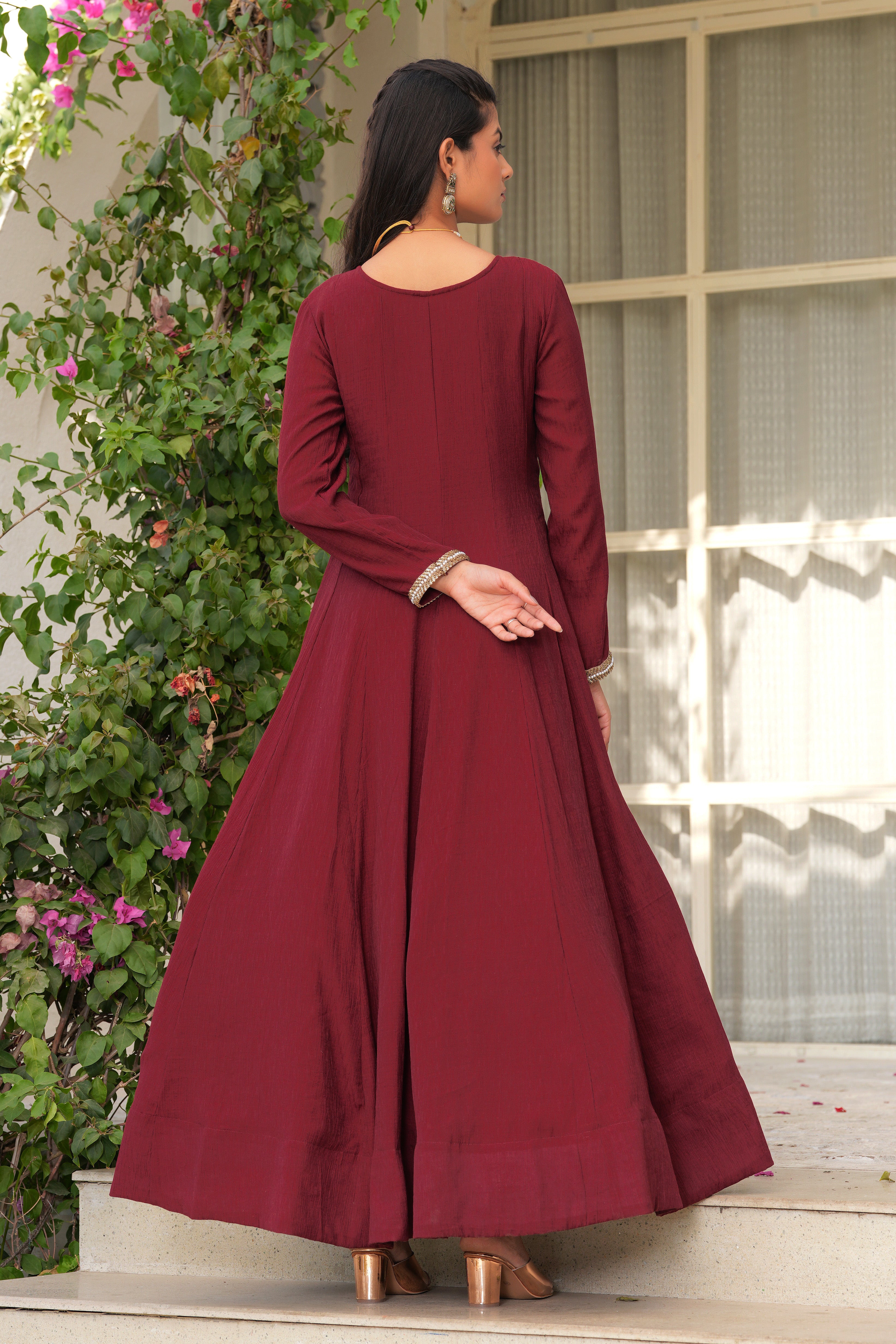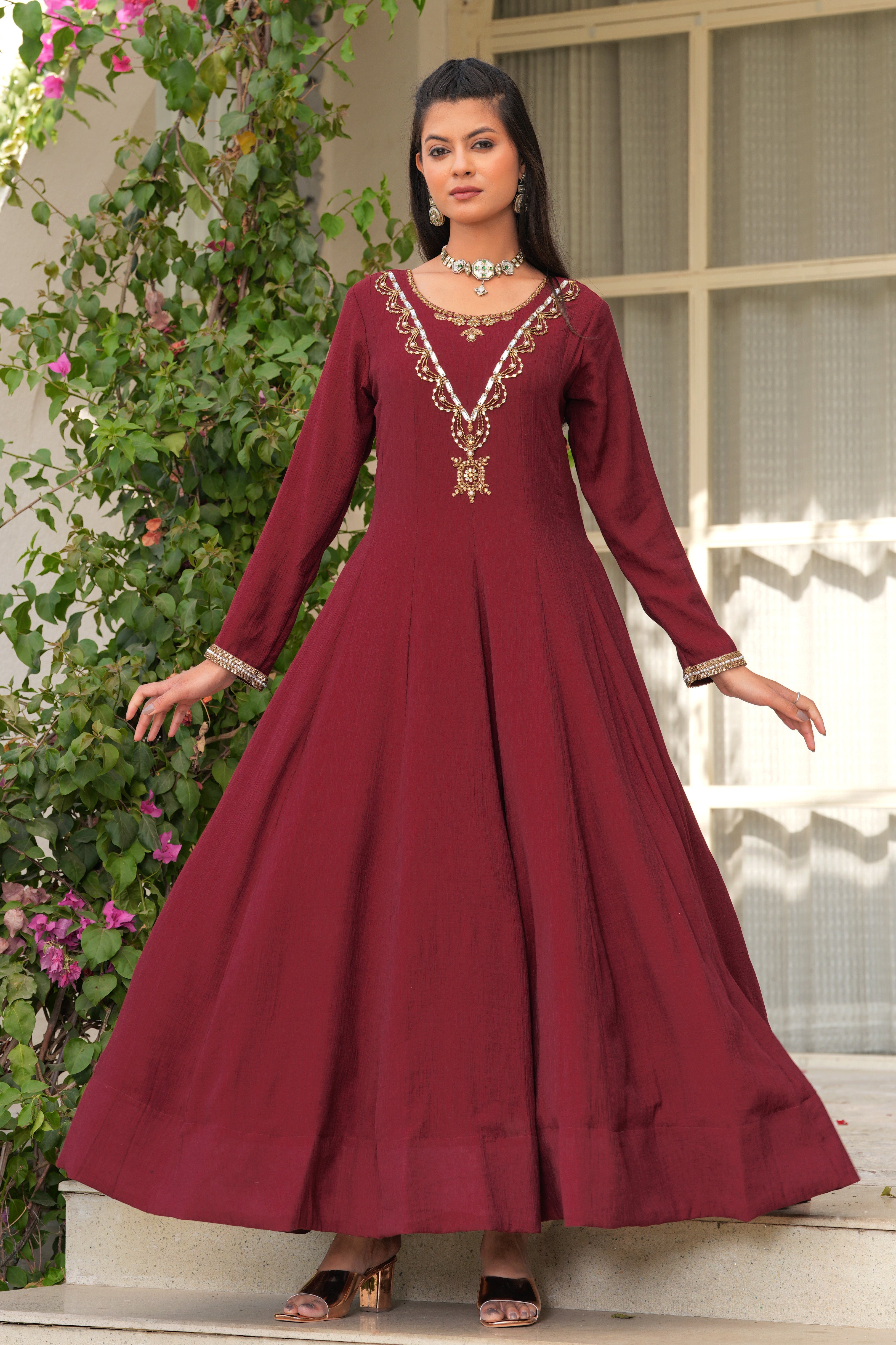 Maharani Vibes Maroon Rani Haar Marsala Anarkali Dress with Tissue Dupatta- Unveil royal elegance in this Marsala chiffon jacquard maxi dress, featuring a round neck, long sleeves, and intricate haar-style embroidery with pearls, zardozi, sequins, and beads, paired with a gold crush tissue dupatta for grand festive allure.