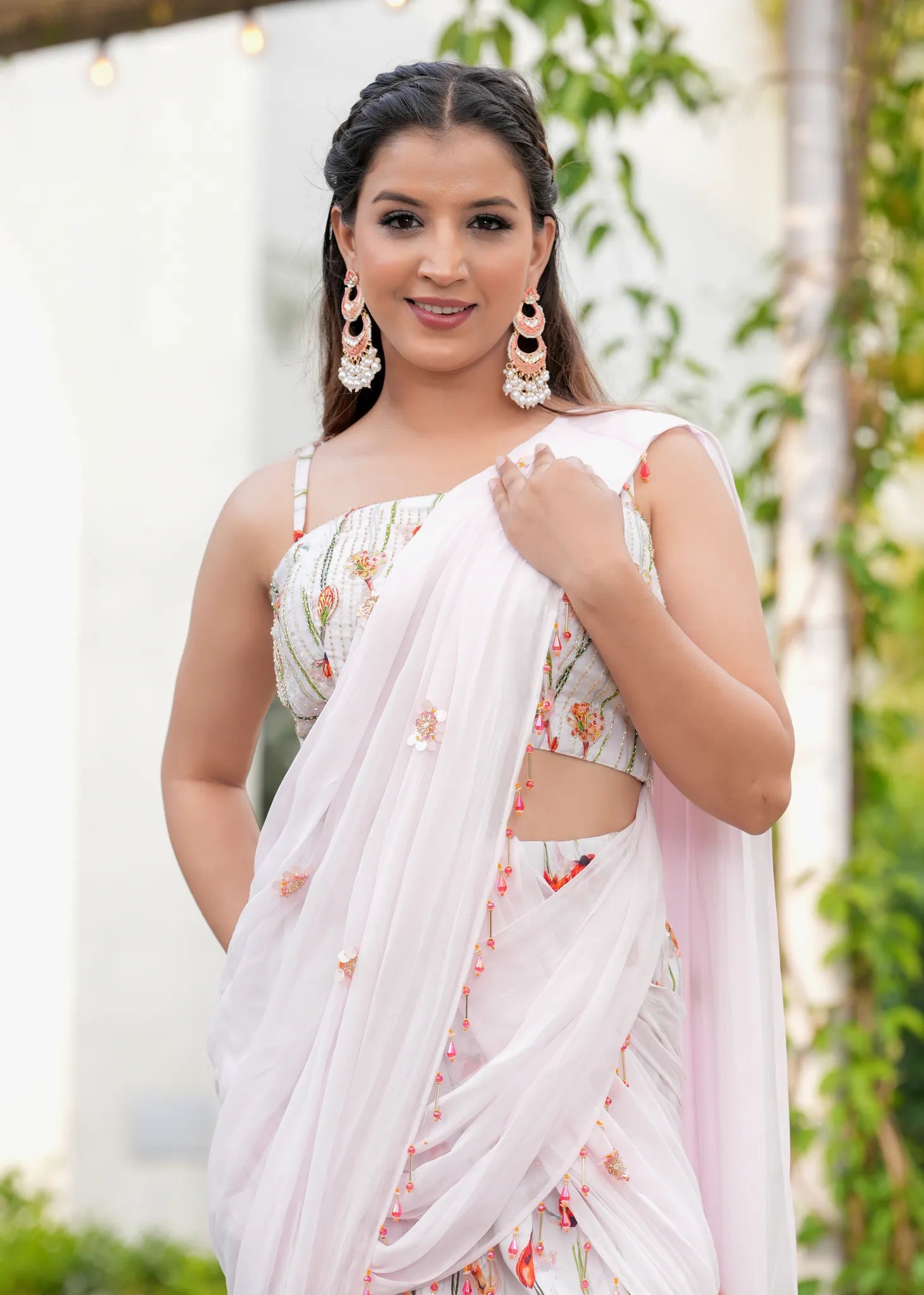 Floral Panache Mogra Bling Pre Draped Saree -Radiate refined charm in the Floral Panache Mogra Bling Draped Saree, crafted in luxurious Chanderi silk with abstract floral prints. The paneled fish-cut skirt offers graceful structure, while the resham, cutdana, beads, and sequins hand-embroidered bustier adds artisanal elegance. Finished with a solid georgette pallu adorned in delicate bead embroidery, this ensemble is a seamless blend of tradition and trend. A modern drape that moves with ease and dazzles with detail.
