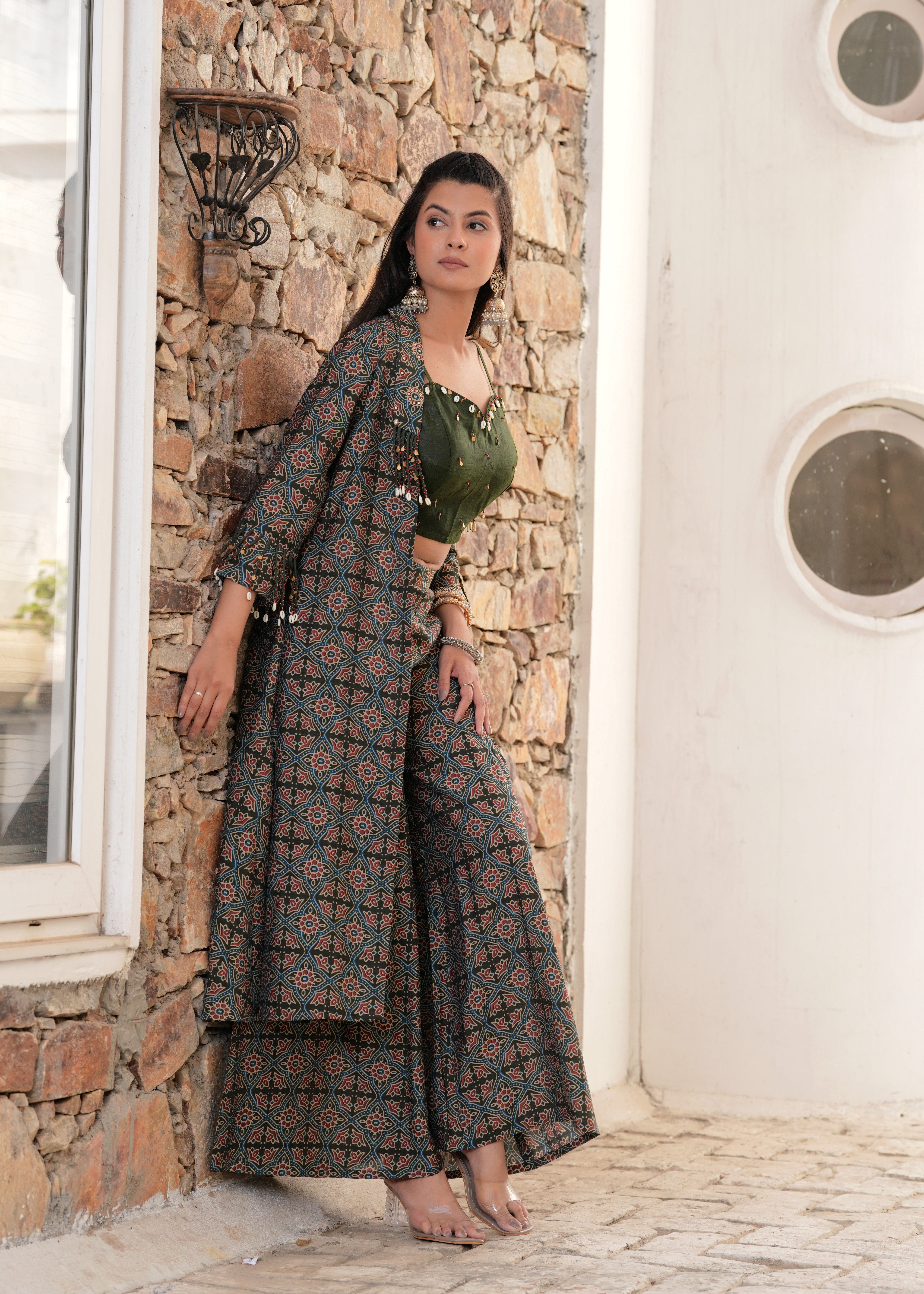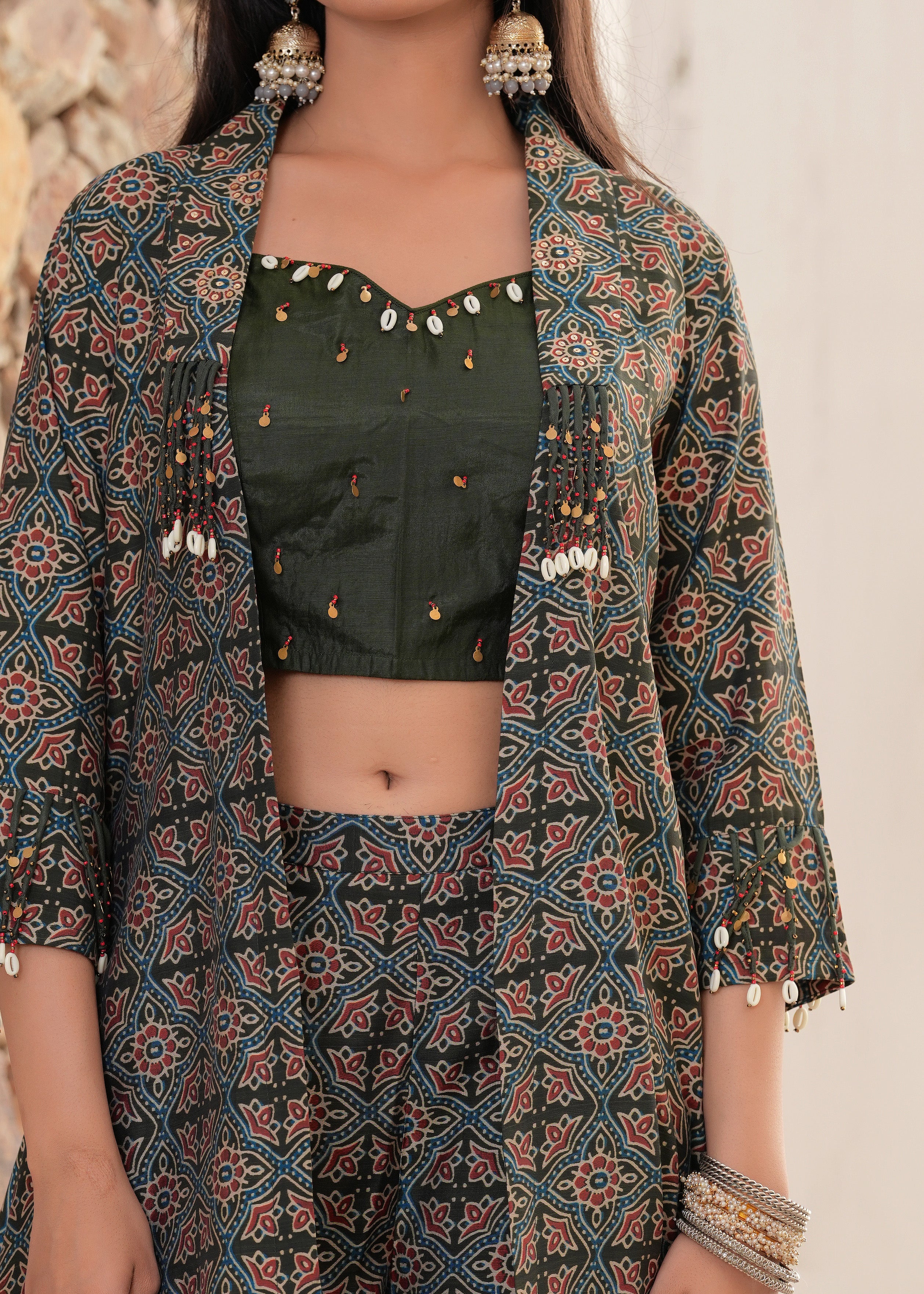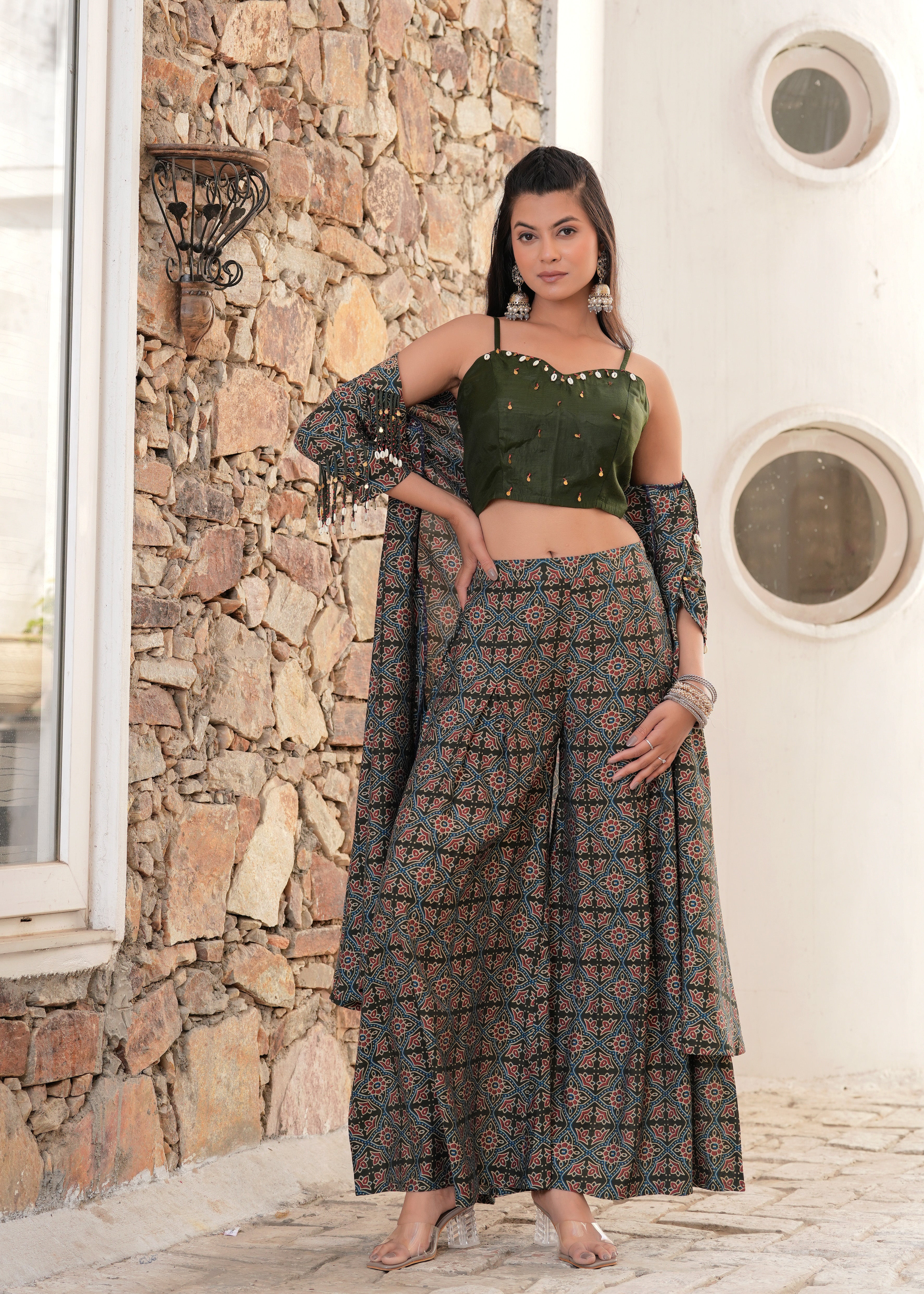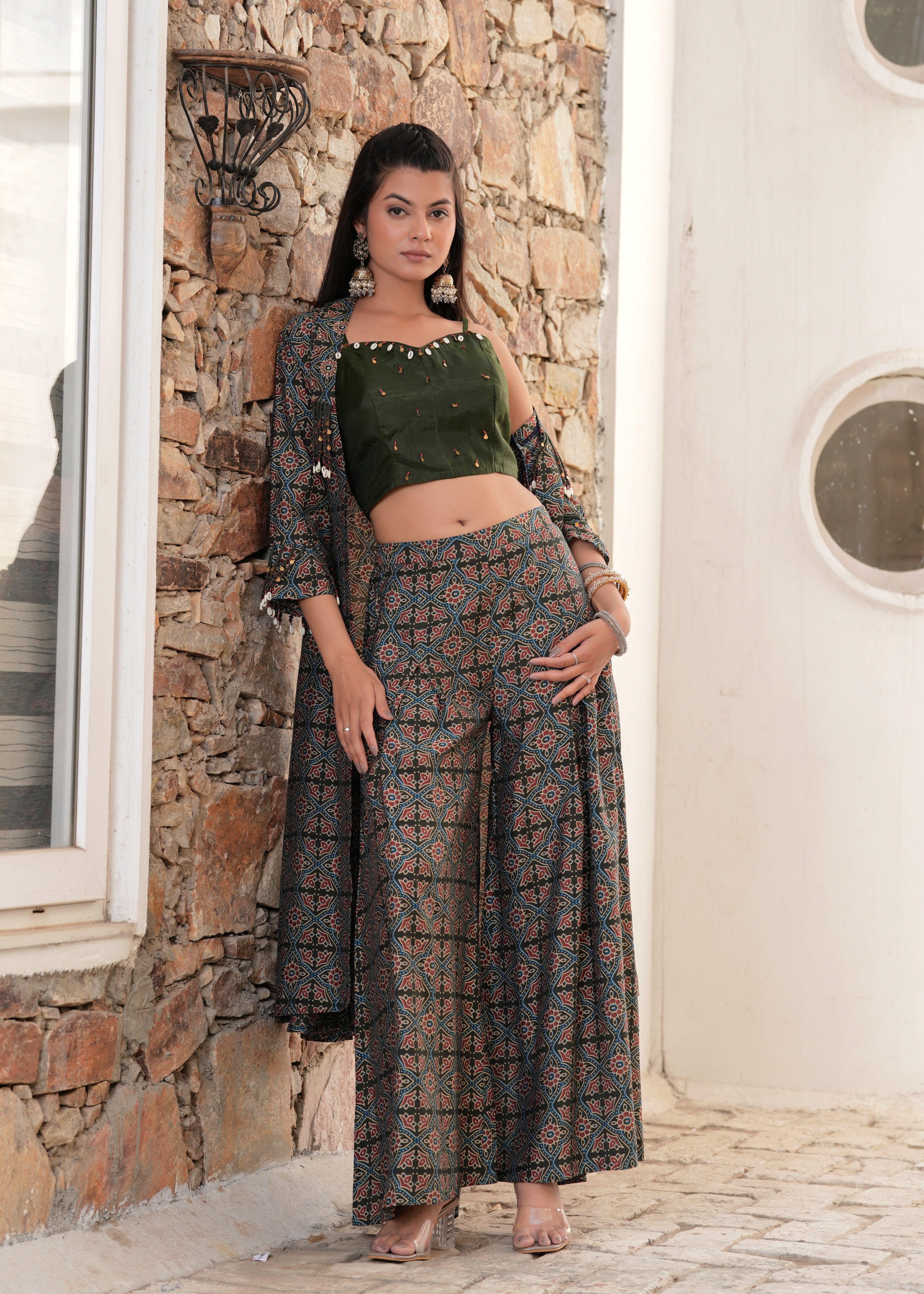 Banjaran Moss Green Chanderi Jacket & Palazzo Fusion Set- Make an earthy statement with the Banjaran Moss Green Chanderi Jacket & Culotte Set. Featuring a long A-line jacket with ethnic floral prints, shawl collar, and coin detailing, paired with flared palazzos and a sequin-embellished solid green crop top. A graceful blend of boho charm and festive style.