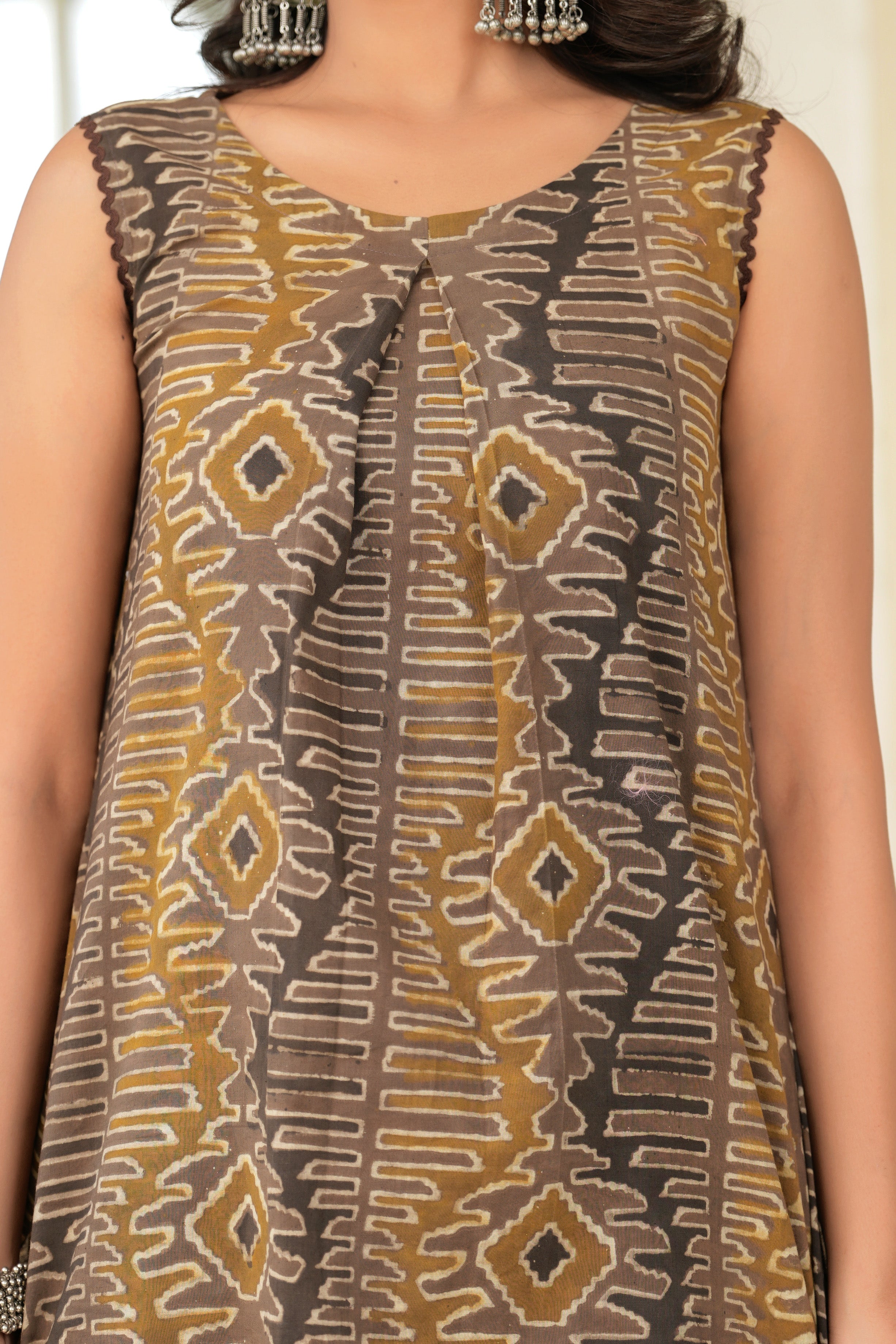 Artisanal Tribe Multi Vanaspati Print A-Line Co-ord Set- Celebrate earthy elegance in this soft cotton co-ord, featuring a tribal-print sleeveless A-line kurta with a boat neckline and matching palazzos—rich in comfort and artisanal flair. Perfect for elevating everyday style with cultural charm.