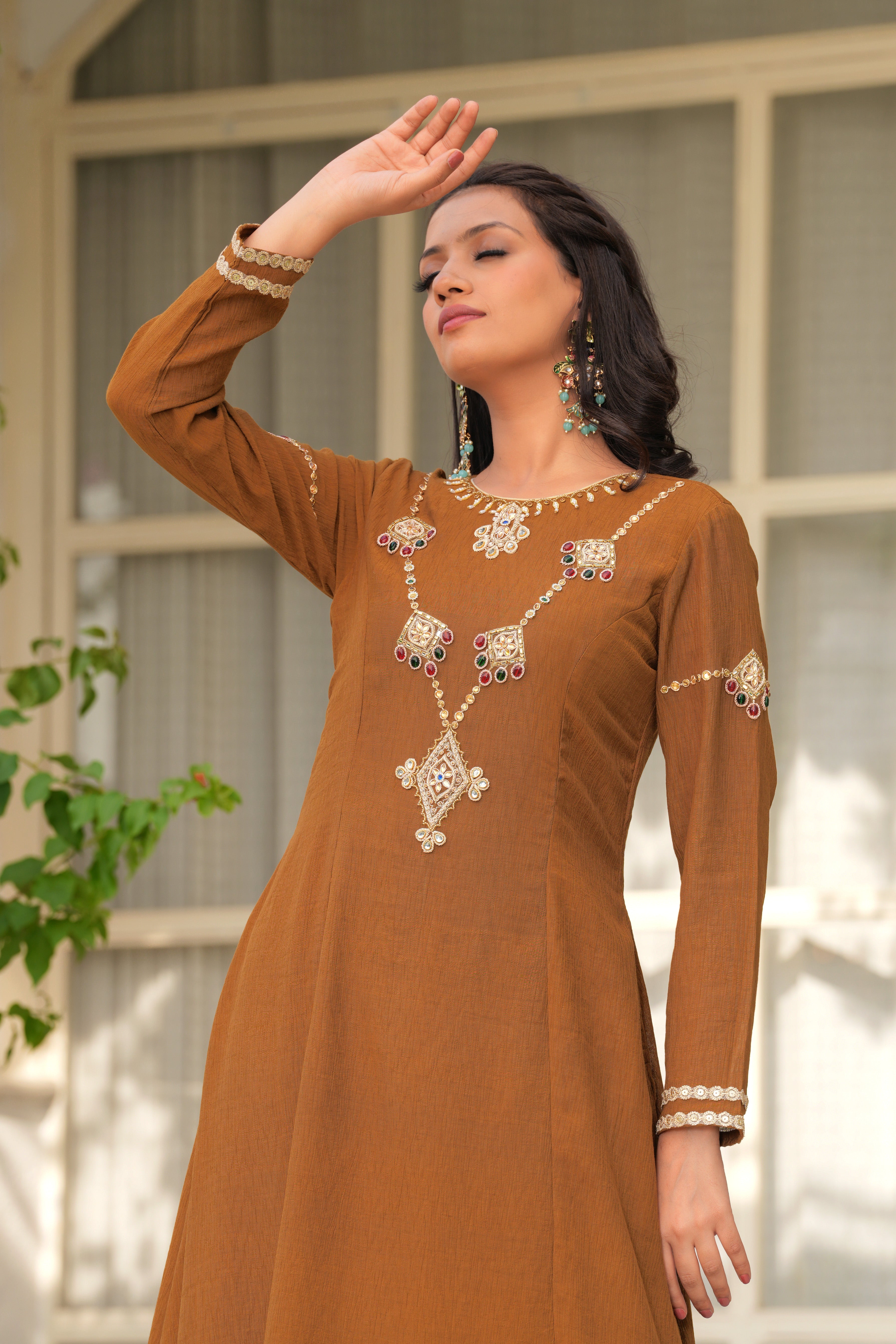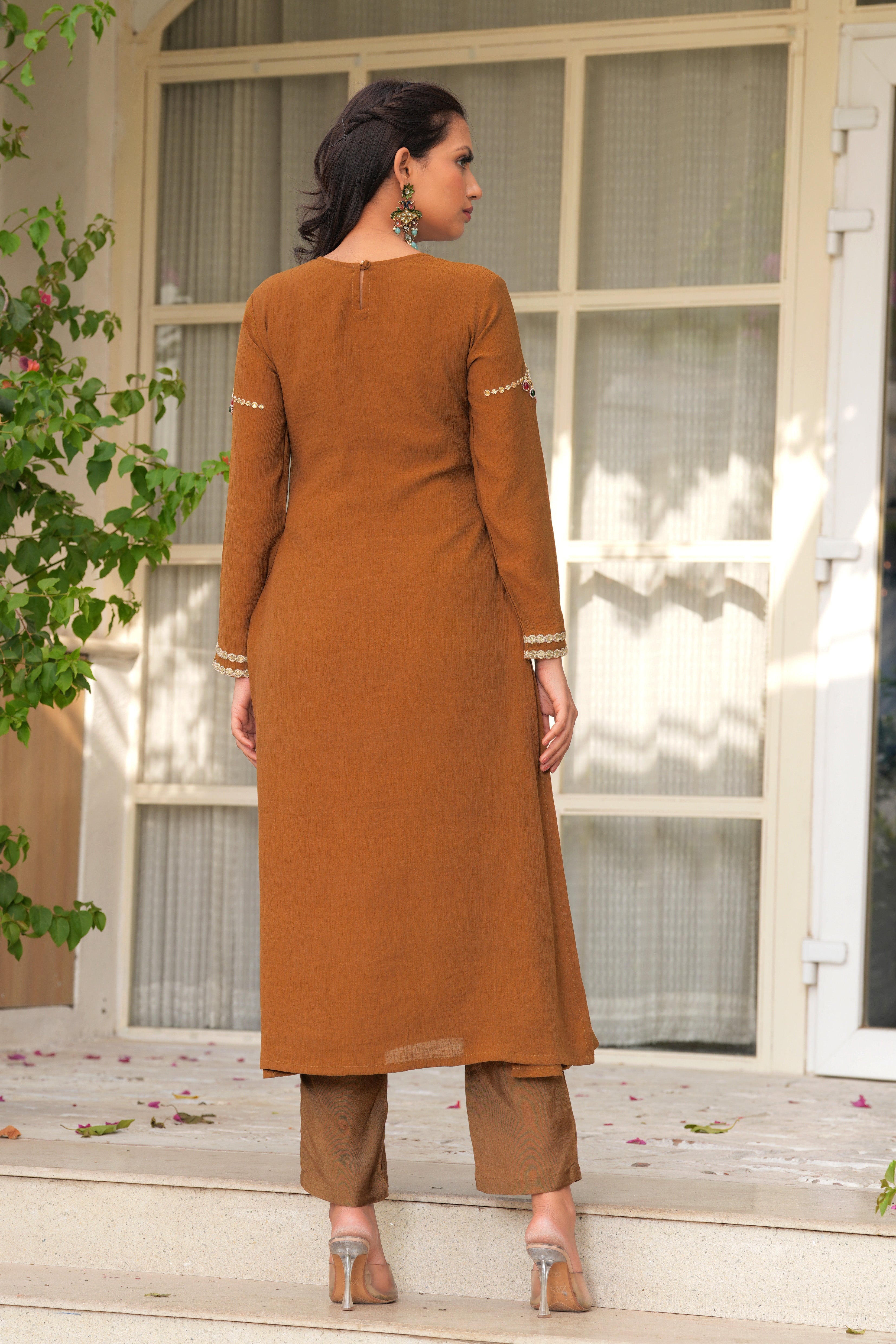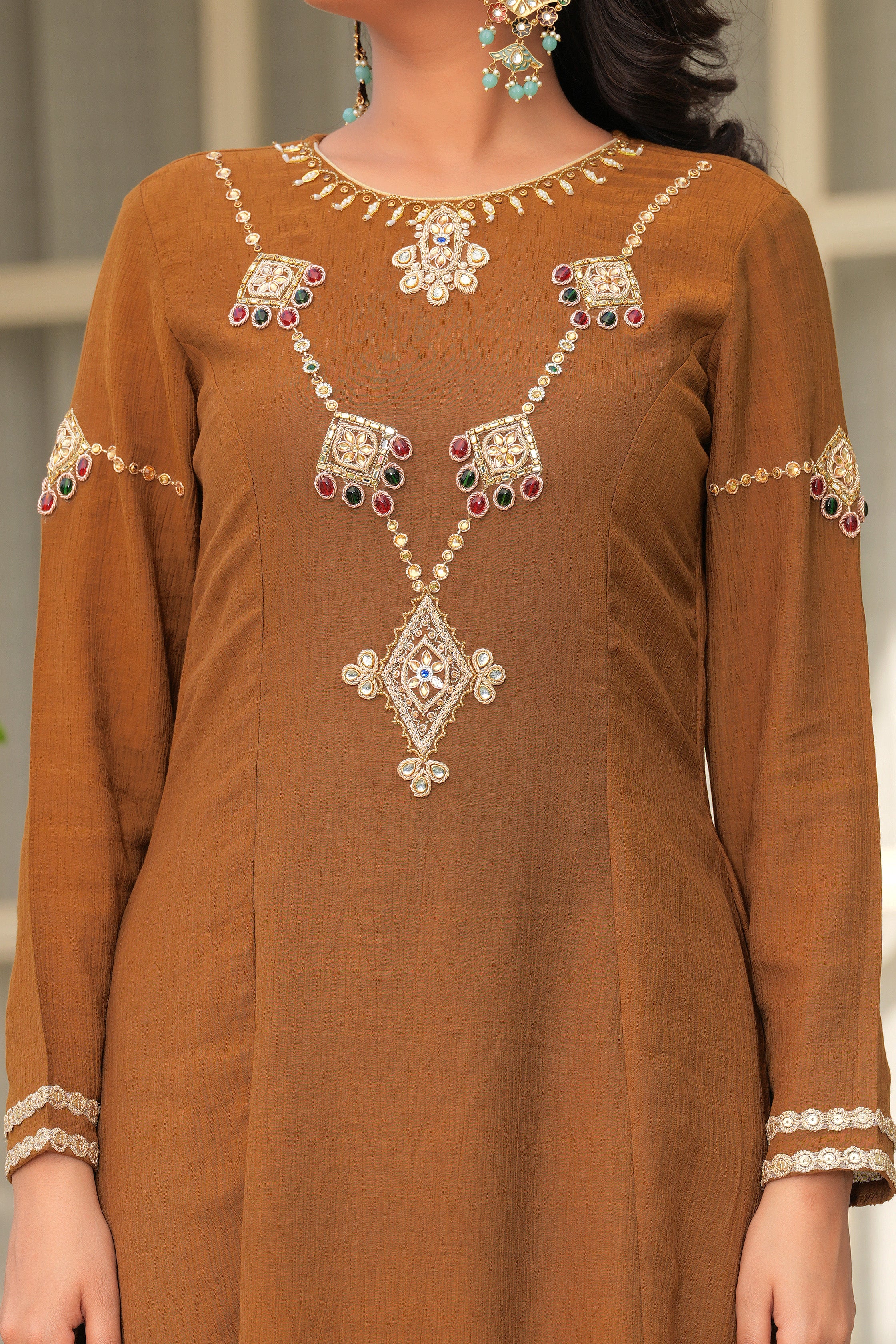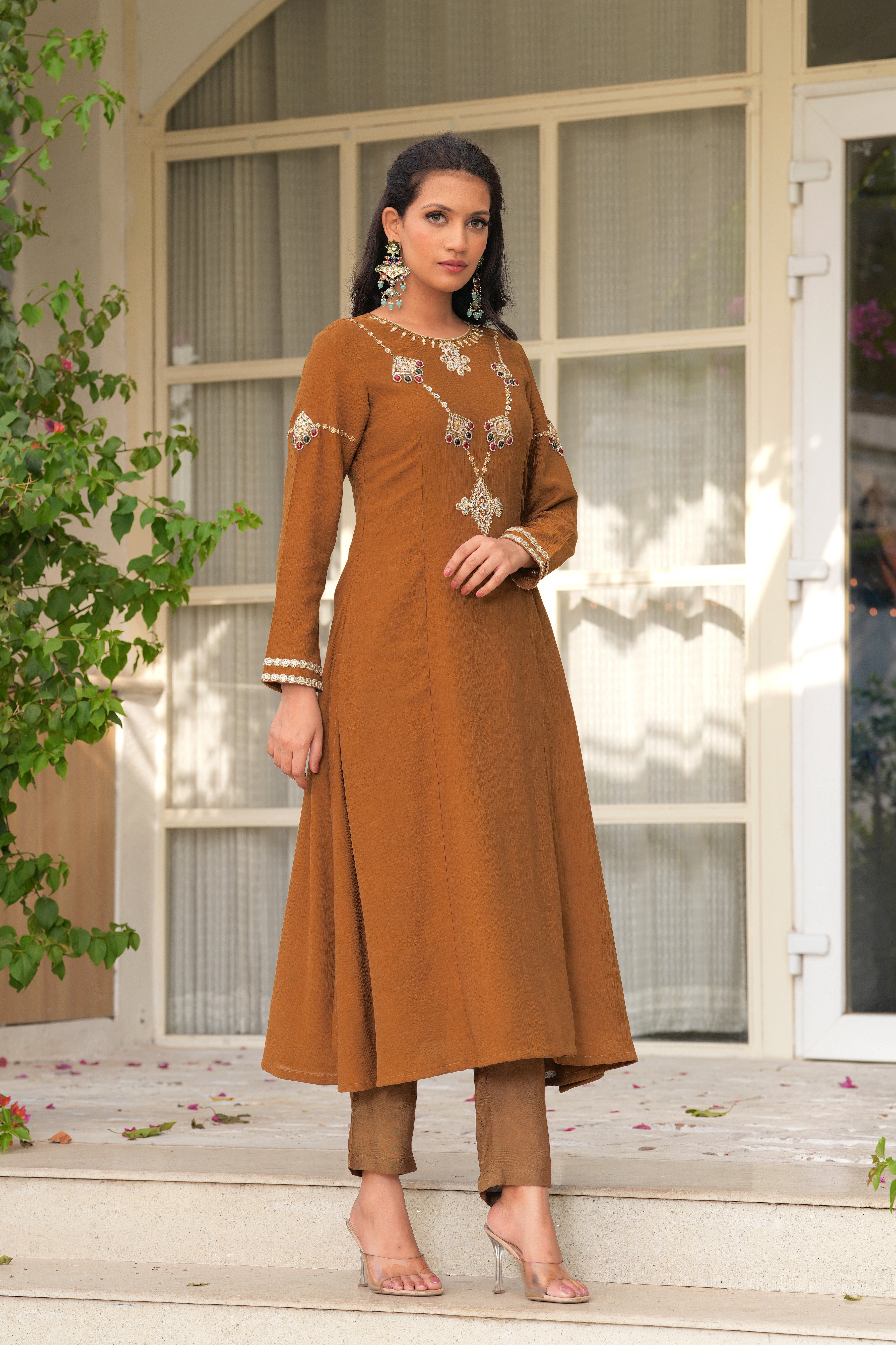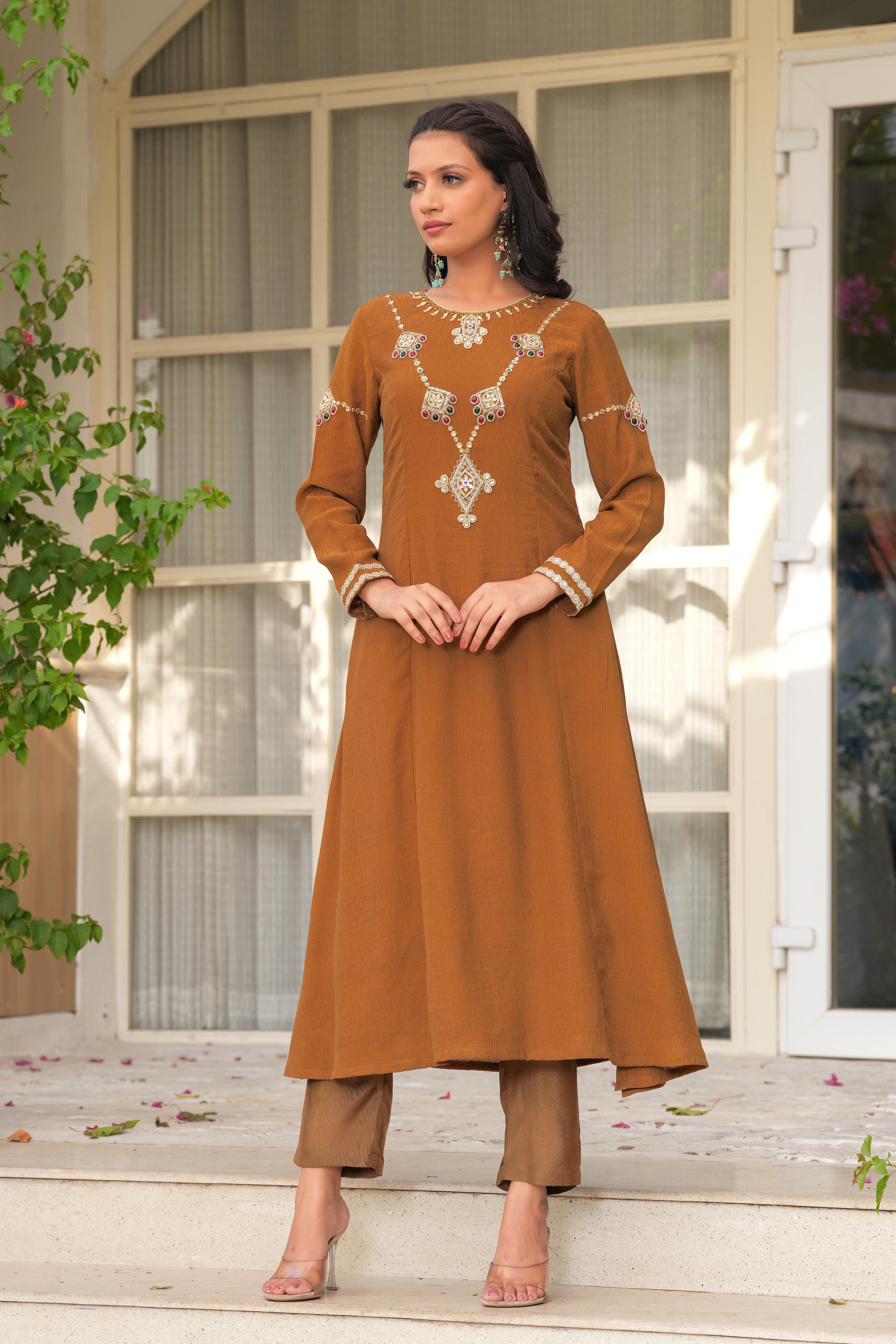 Maharani Vibes Mustard Rani Haar Embroidered Kurta Set- Radiate charm in this mustard chiffon jacquard kurta set, featuring a flared paneled silhouette, closed neckline, and lavish pearl, zardozi, sequin, and stone embellishments, paired with sleek shantoon trousers for effortless festive glamour.