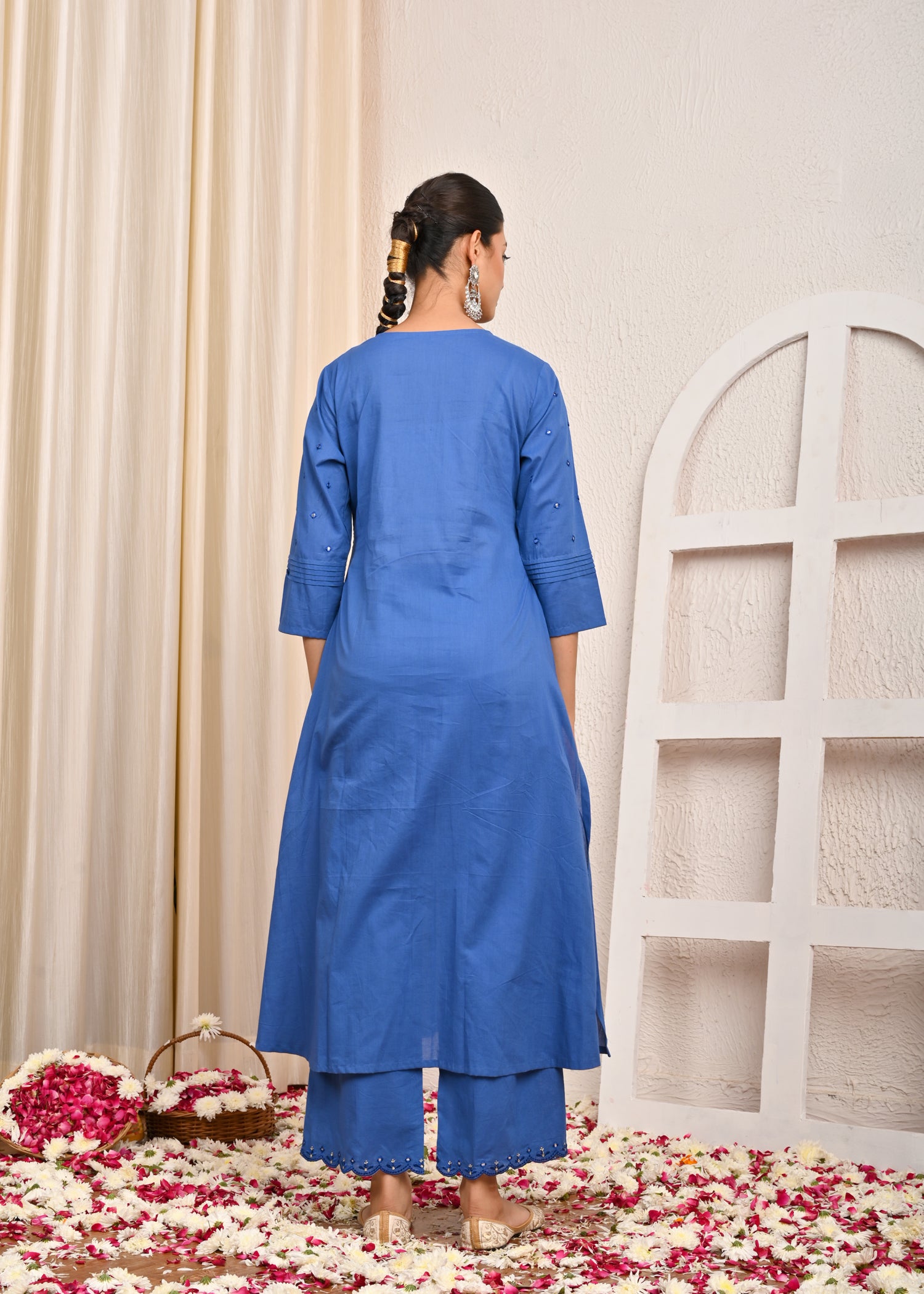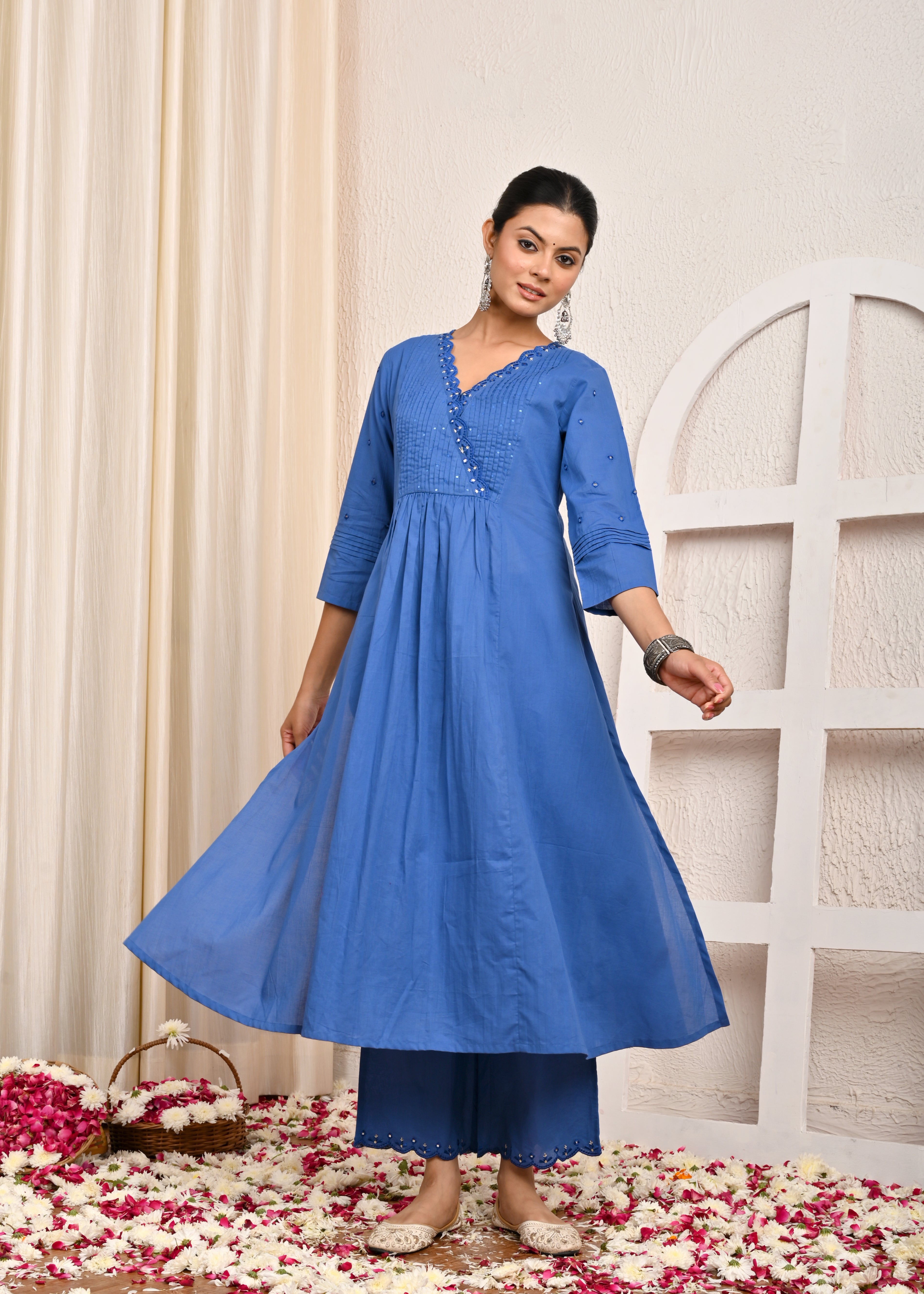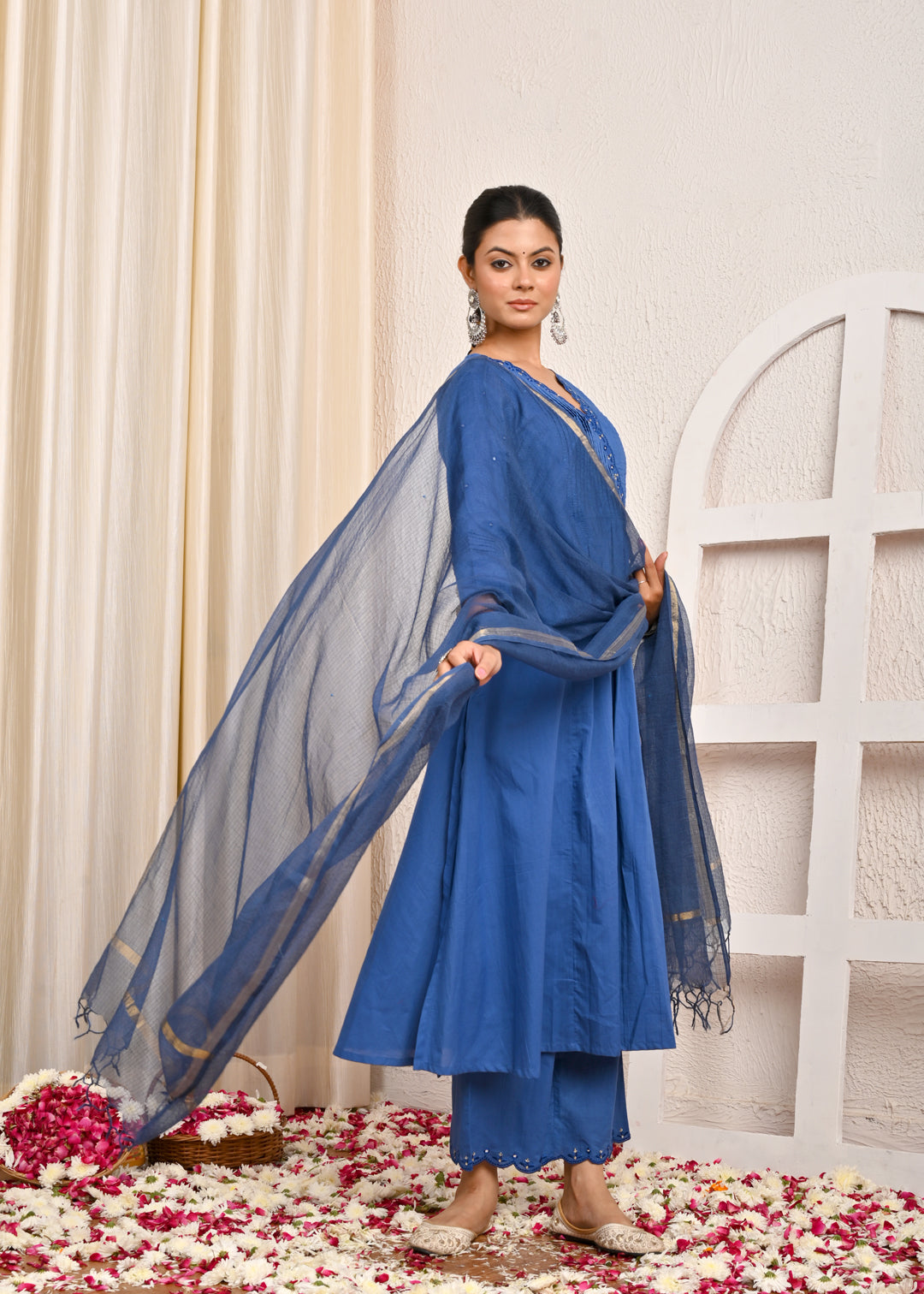 Rangmanch Neelam Pin Tuck A-Line Kurta Kota Doriya Dupatta Set -Step into elegance with this striking Cobalt Blue Pure Cotton Kurta Set. The kurta features a flattering V-neckline and a structured pin-tuck yoke brilliantly highlighted with shimmering sequin work. The matching palazzo is exquisitely finished with mirror and resham embroidery along the scalloped hemline. Completing the look is a solid, airy Pure Kota Doria Dupatta, making this ensemble a picture of sophisticated, traditional charm.