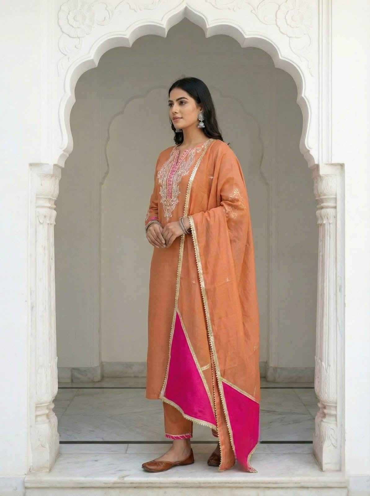 Drape yourself in the ethereal lightness of this Peach A-line flared kurta, meticulously crafted from the finest Mul Chanderi fabric to ensure a silhouette that breathes with effortless grace. The design is elevated by a classic round neckline, which serves as a refined canvas for the opulent Zari and Gota embroidered detailing. These shimmering metallic accents catch the light with every movement, weaving a narrative of royal heritage and contemporary charm. The kurta is harmoniously paired with fluid solid palazzos, offering a voluminous yet structured base that enhances the outfit’s majestic sway. Completing this sartorial symphony is the Mul Chanderi contrast patchwork dupatta, where vibrant bursts of color meet delicate textures to create a visual masterpiece. Perfectly balanced and profoundly elegant, this ensemble is an exquisite choice for the modern woman who cherishes high-fashion craftsmanship.