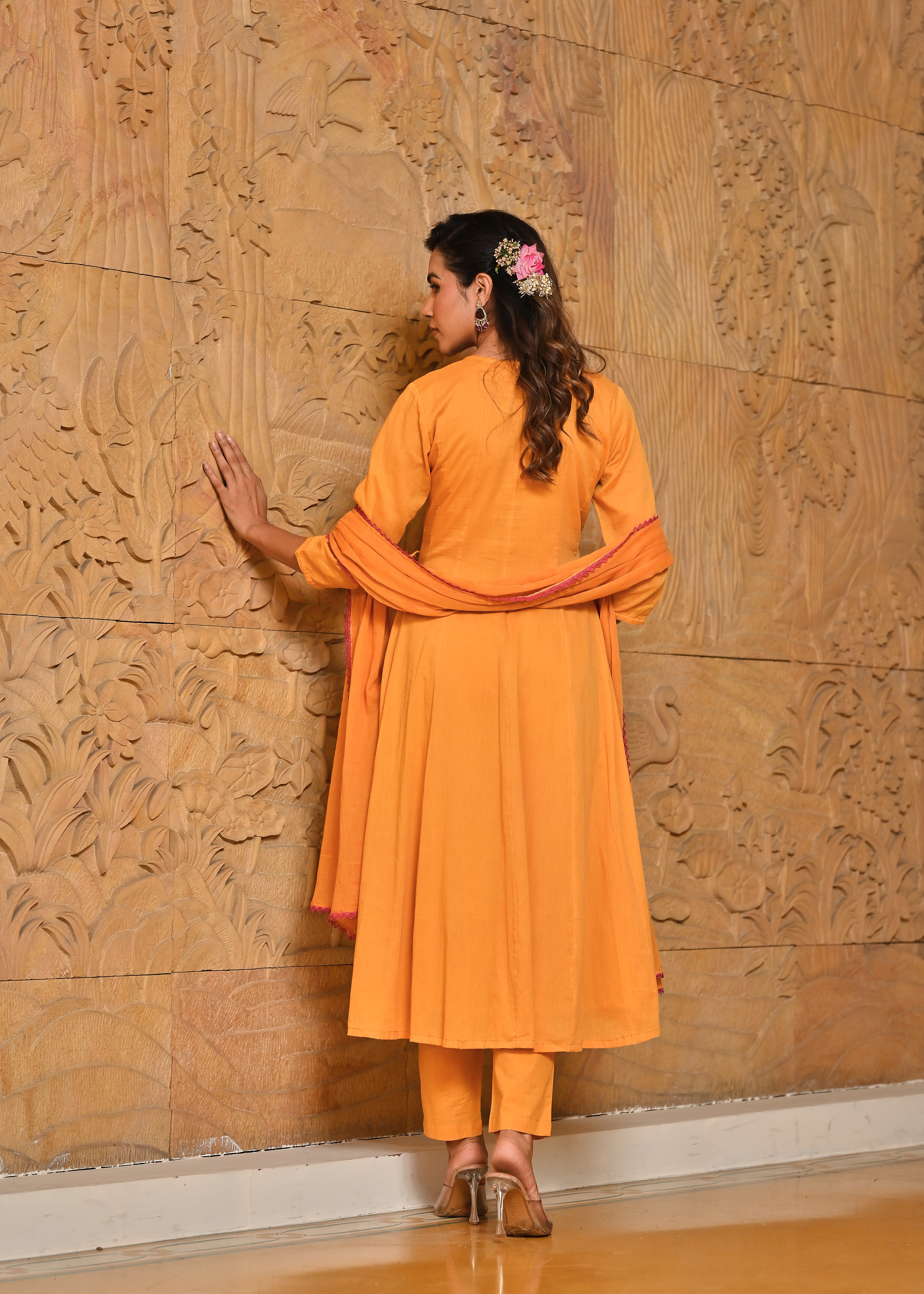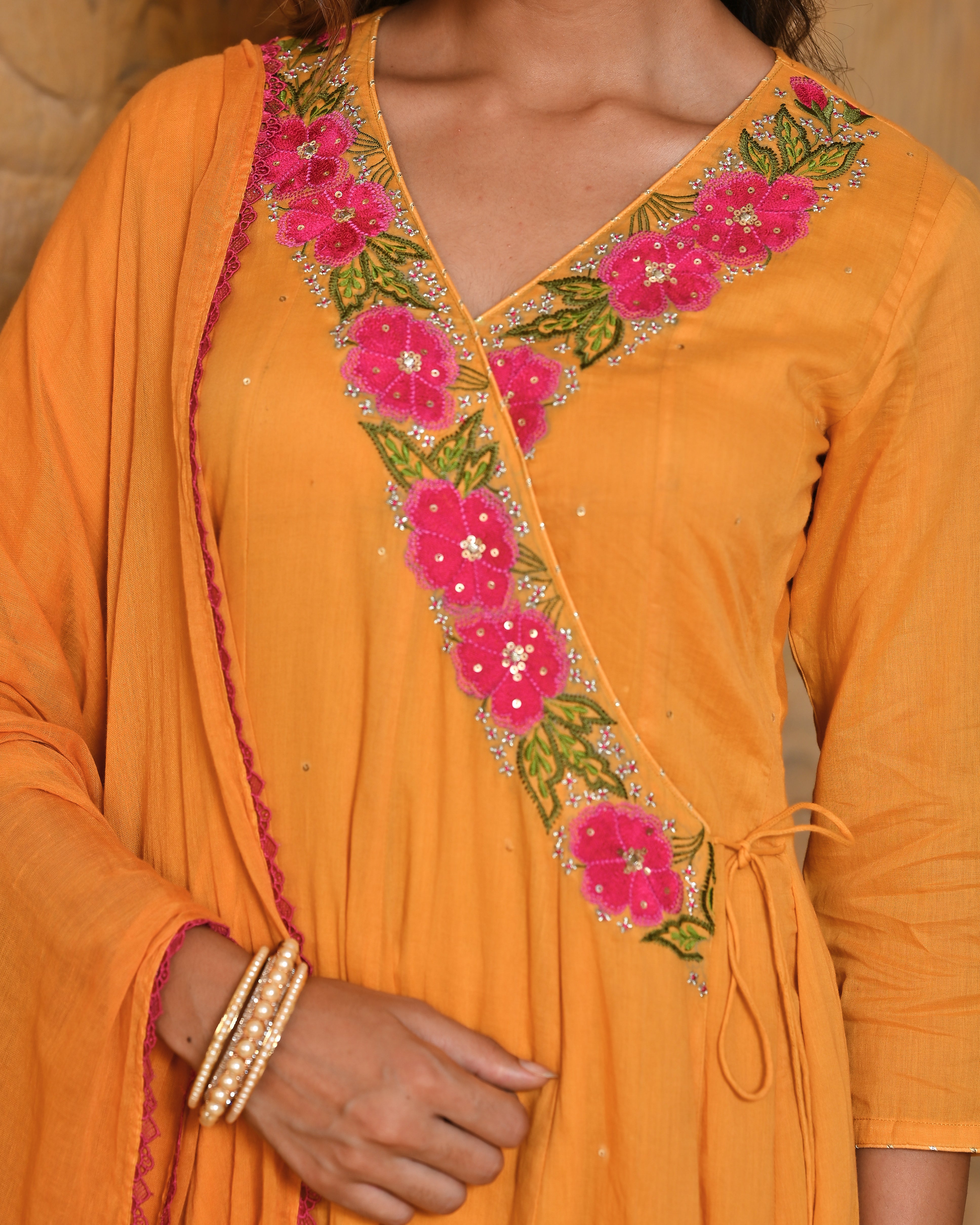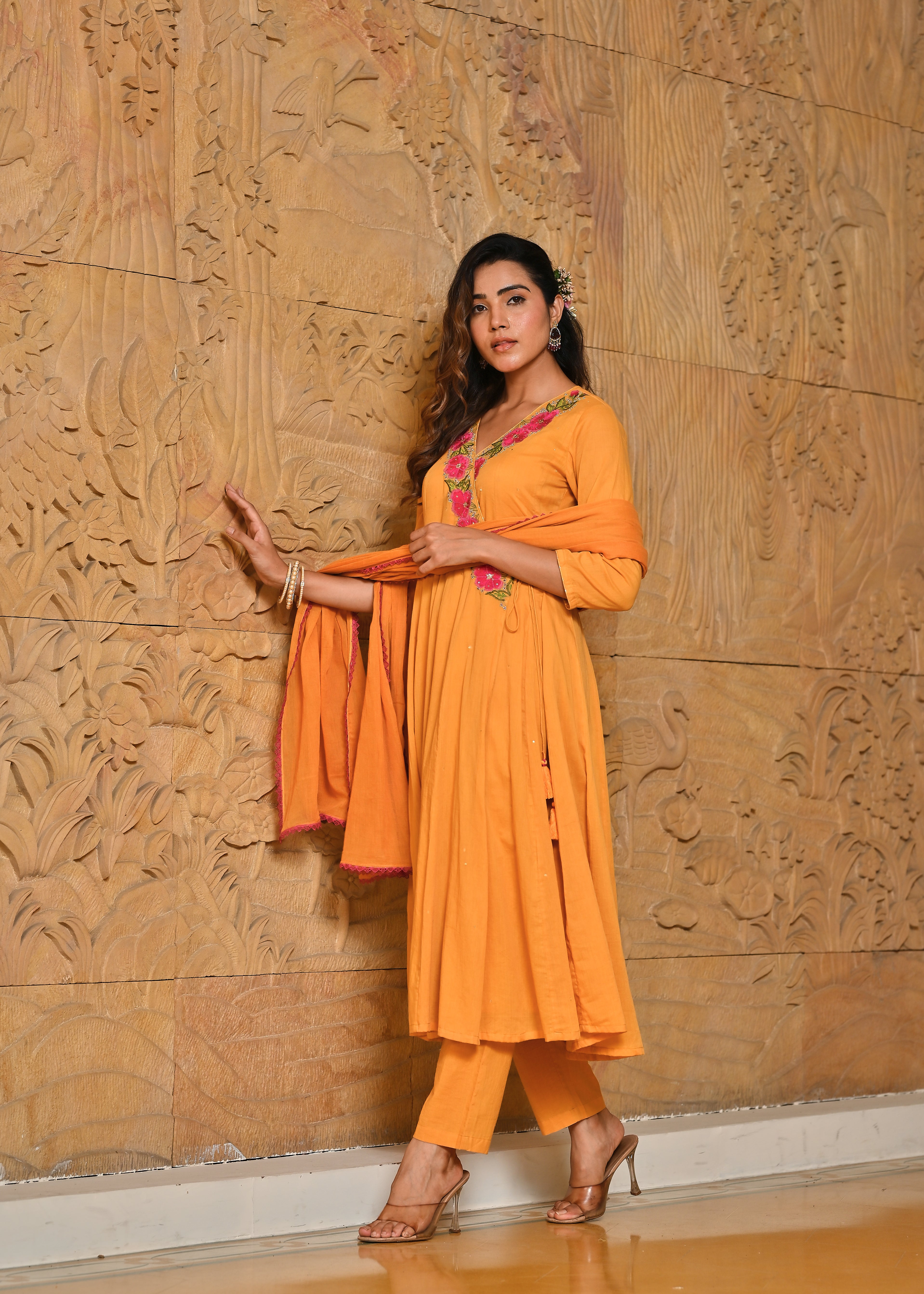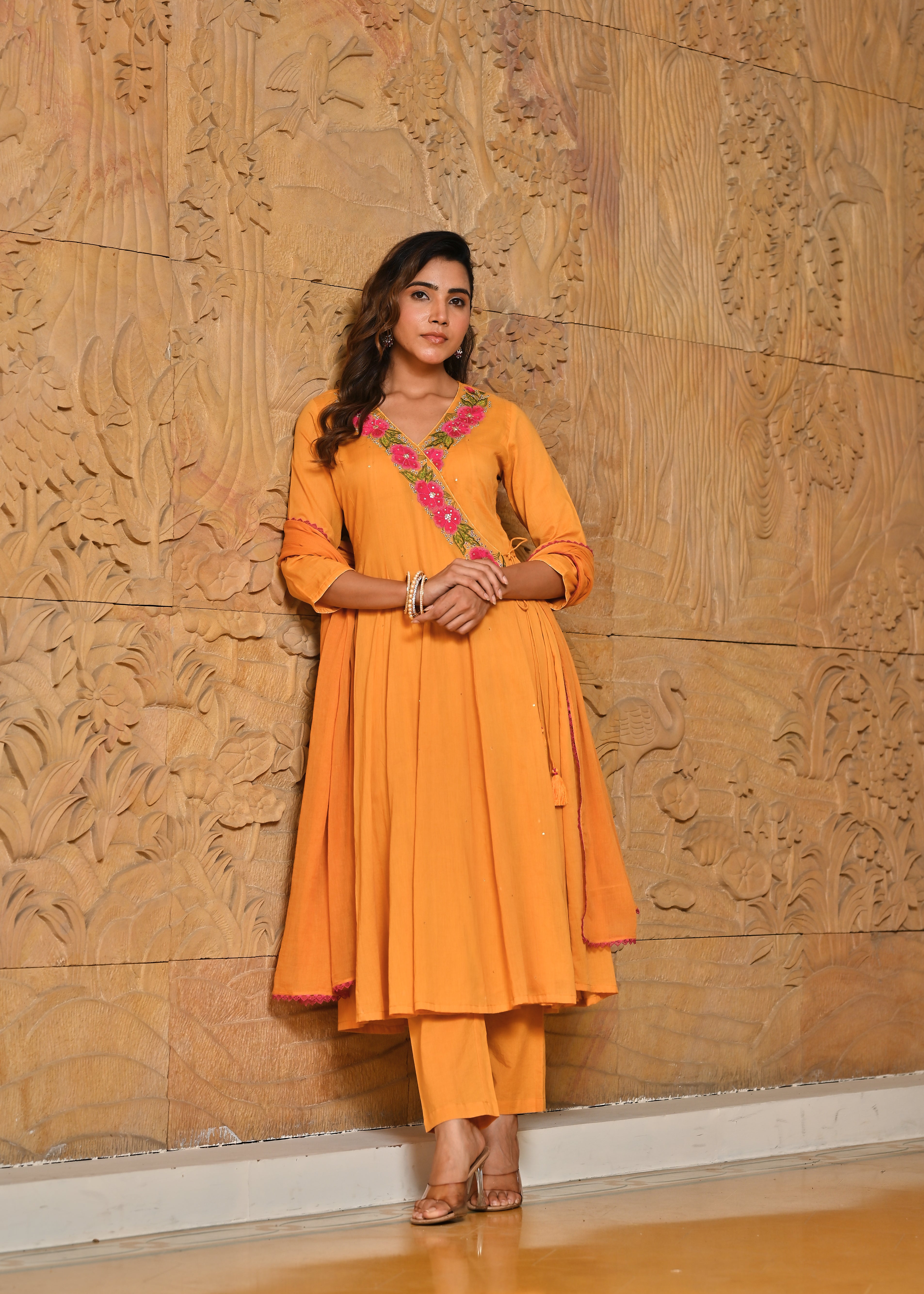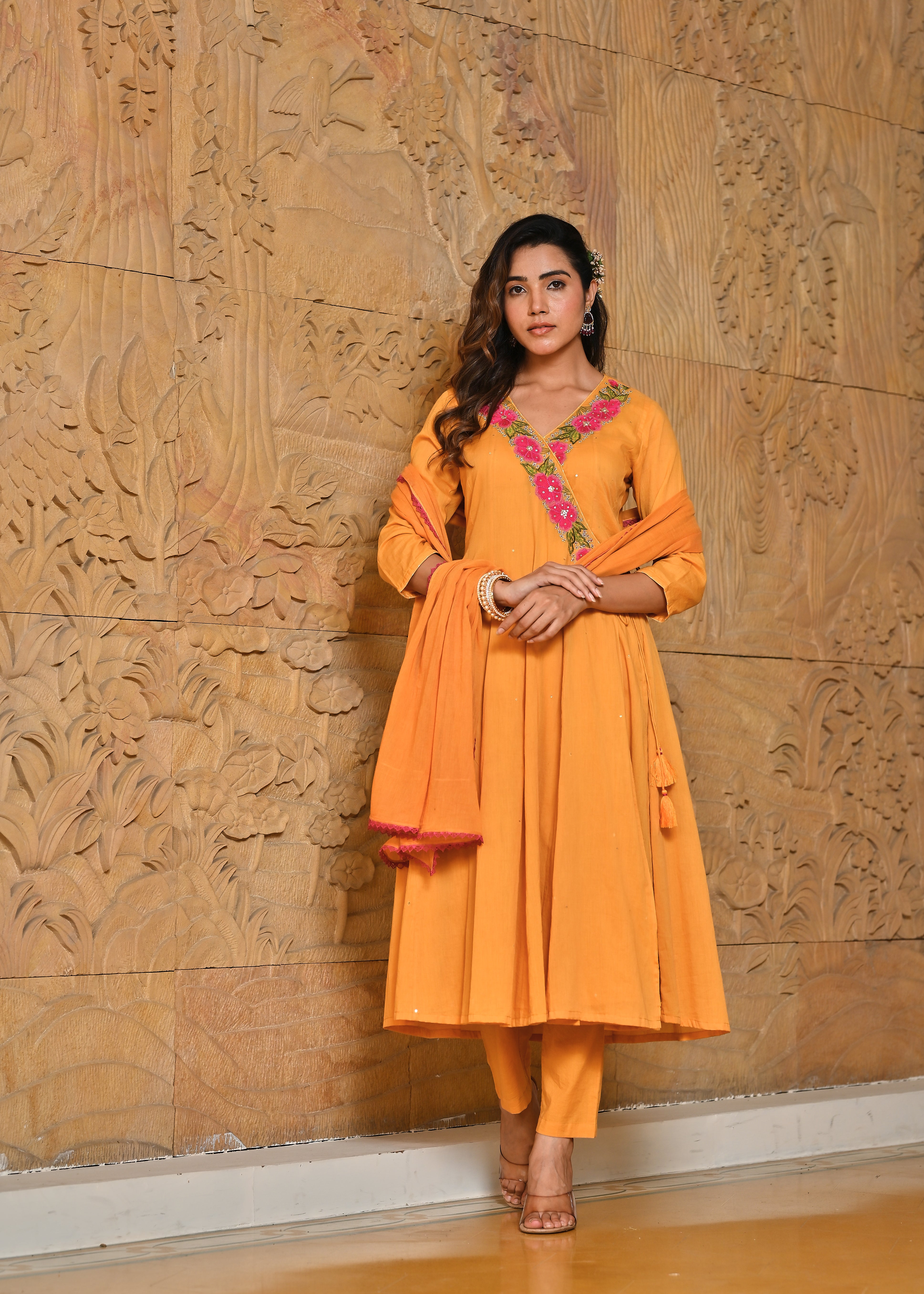 Rangmanch Peetambari Mulmul Angrakha Anarkali Kurta Dupatta Set- Step out in the radiance of the Saffron Yellow Cotton Mulmul Angrakha Set. This flowing Anarkali silhouette is crafted from soft cotton mulmul, featuring a flattering V-neckline. Intricate Resham and Zari embroidery illuminates the design, adding a touch of festive shimmer. Complete with comfortable pants and a matching cotton Mulmul dupatta, this three-piece set offers pure elegance and comfort.