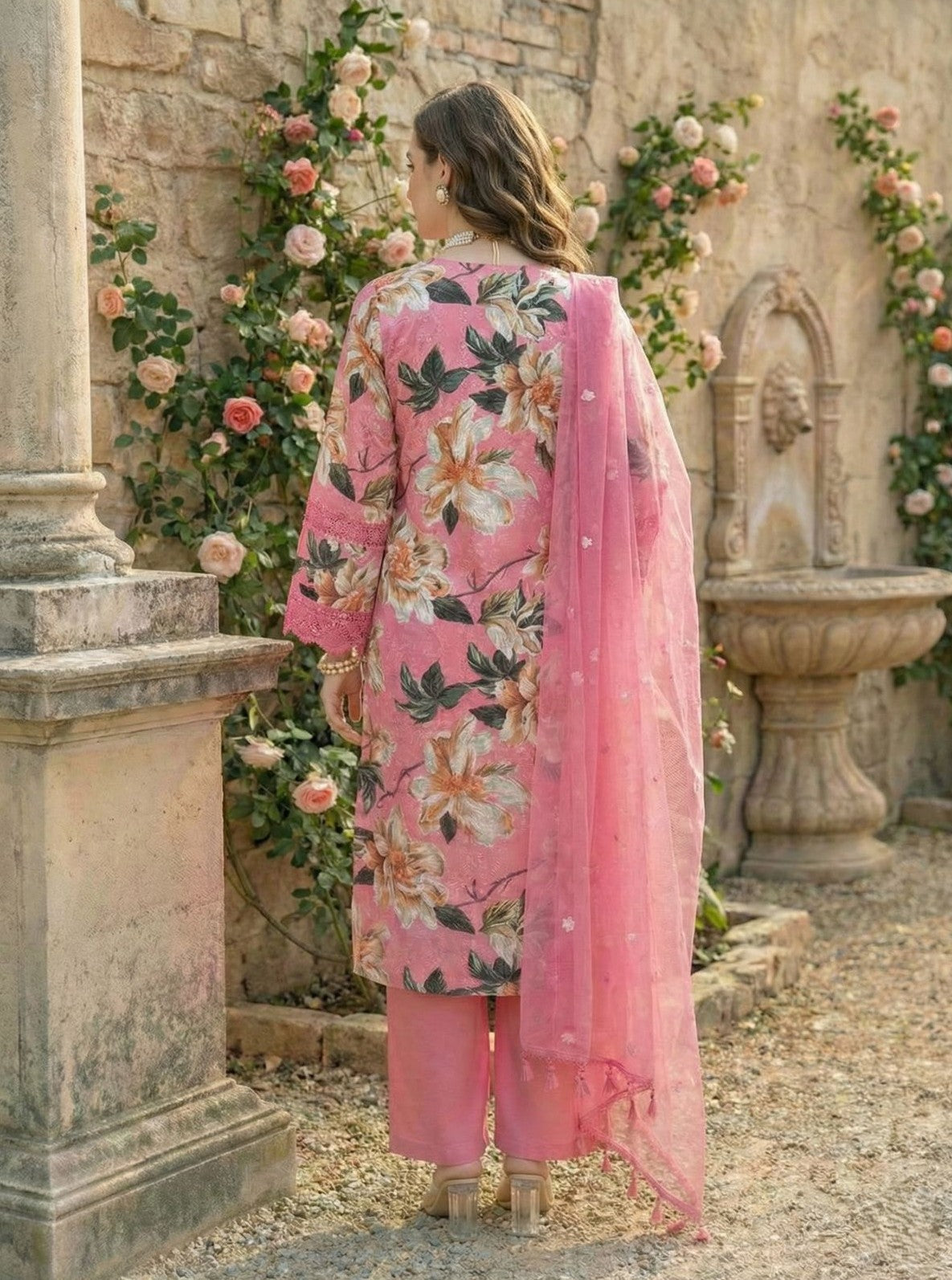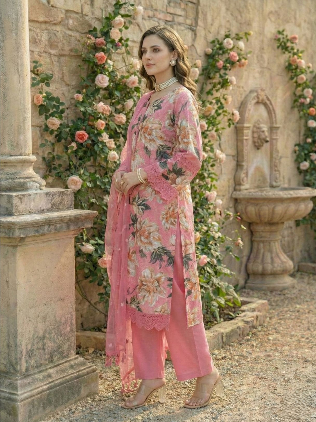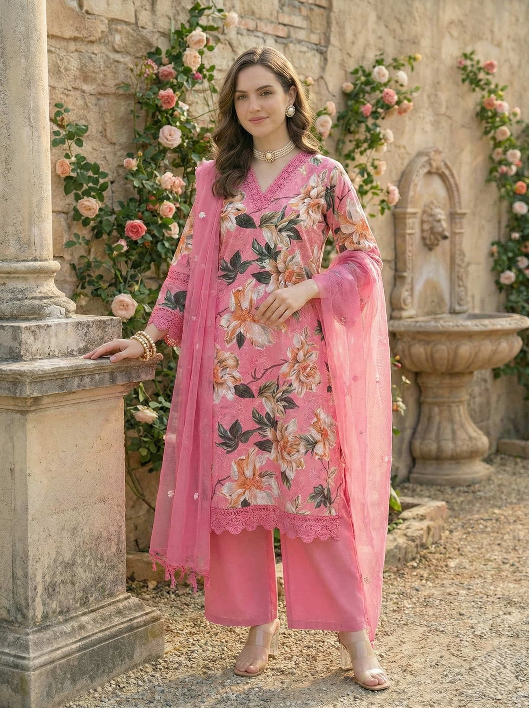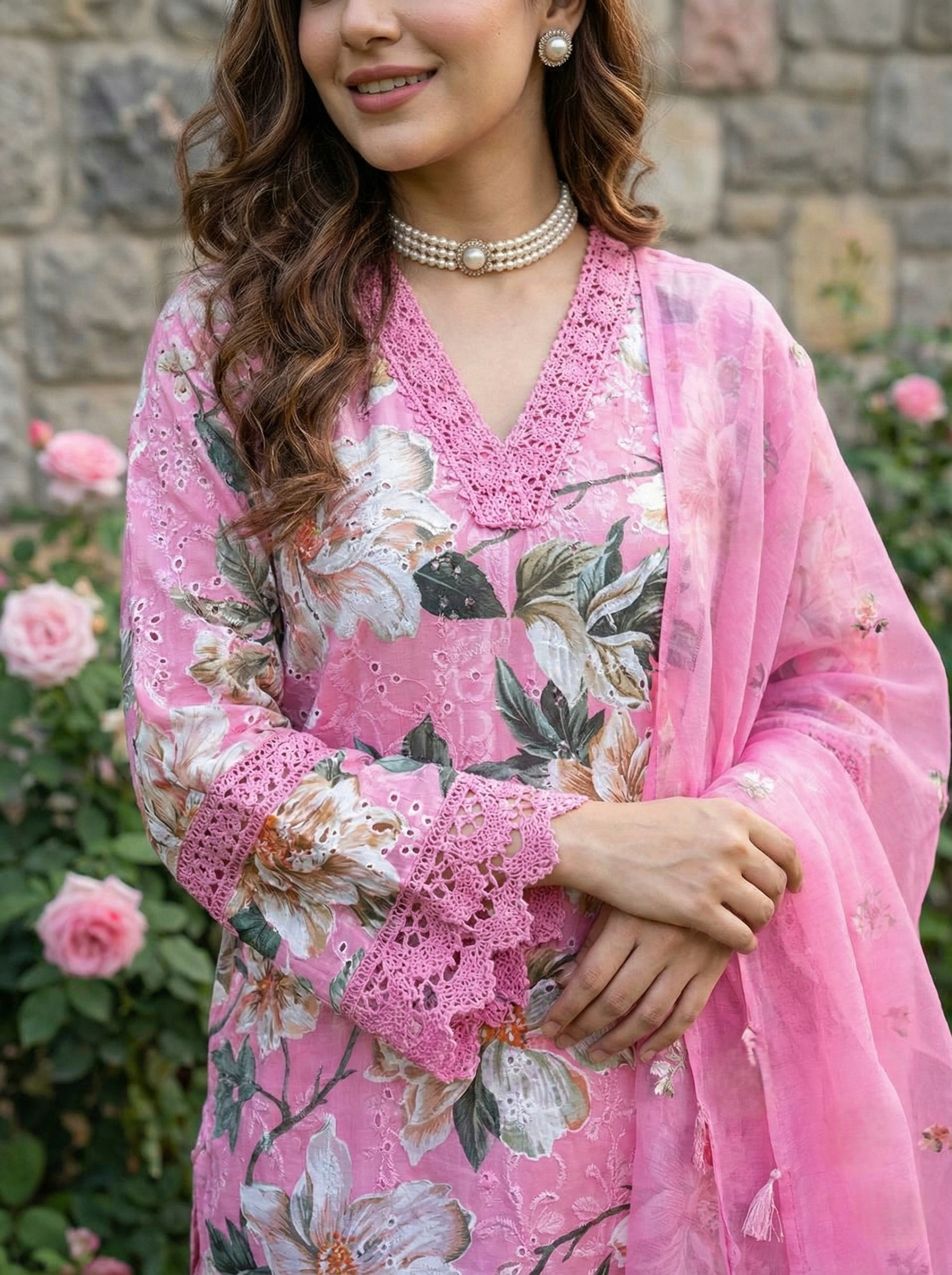 Ideal for casual celebrations and daytime occasions, this lightweight cotton suit set feels breathable for warm days. The printed V-neck kurta with crochet lace detailing pairs with relaxed palazzos for a flexible fit. A coordinated dupatta completes the cohesive look, remaining easy to carry and style.