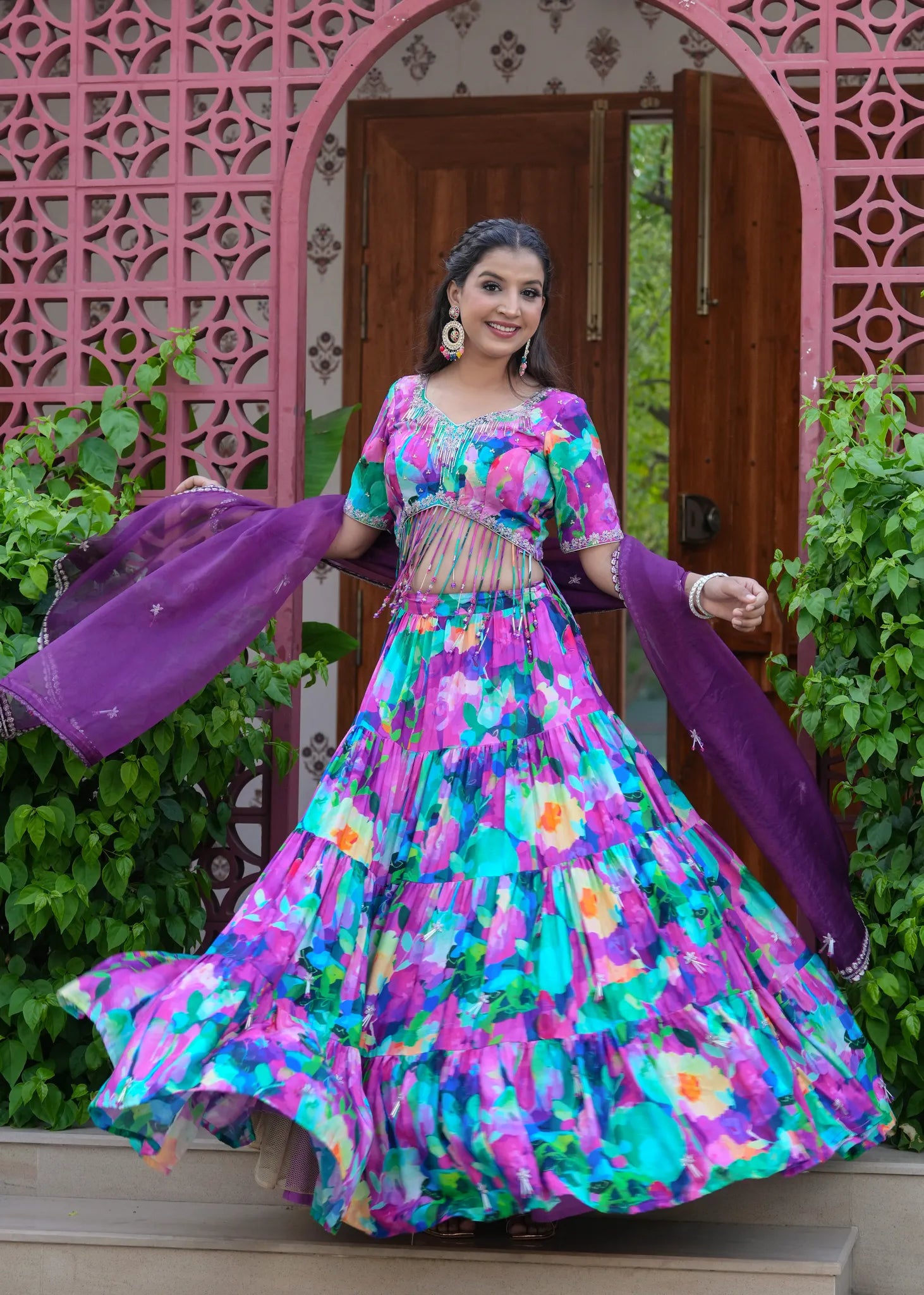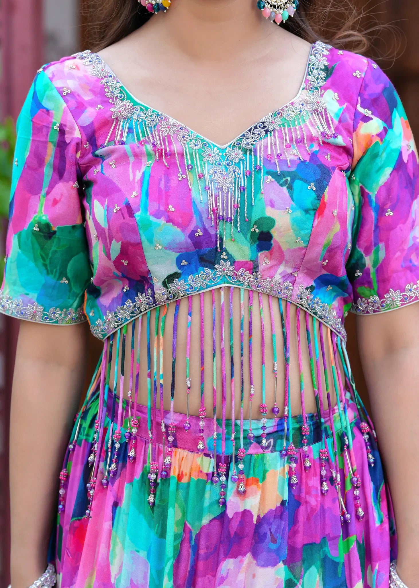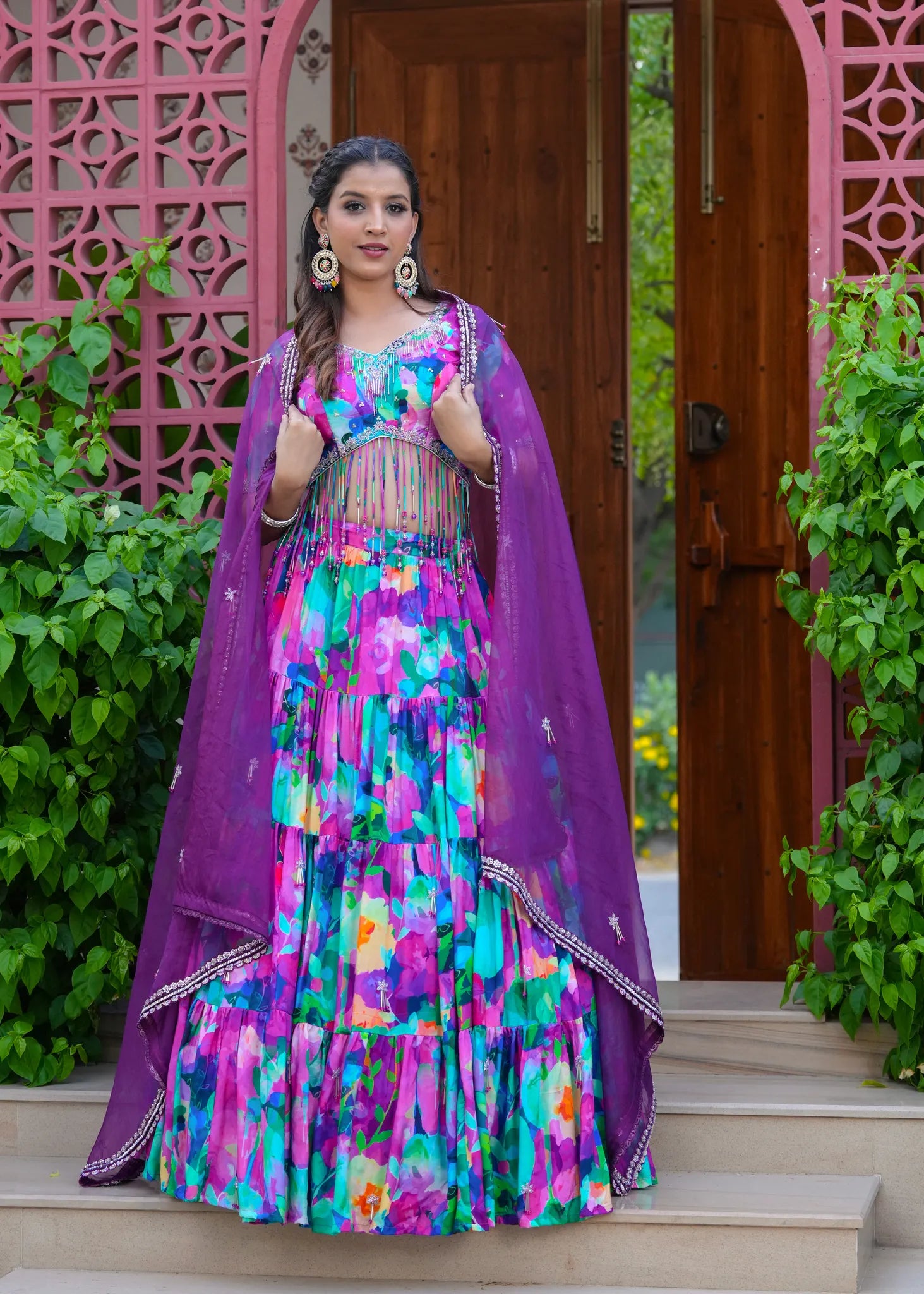 Floral Panache Purple Bloom Fusion Lehenga Set with Dupatta -The Floral Panache Purple Bloom Fusion Lehenga Set is a stunning statement ensemble perfect for grand occasions. The abstract floral printed lehenga is paired with a lavishly hand-embroidered blouse, adorned with shimmering cutdana work and playful beaded fringes. A solid organza dupatta, delicately hand-embroidered, completes the look with sheer elegance—making this set a radiant choice for unforgettable celebrations.