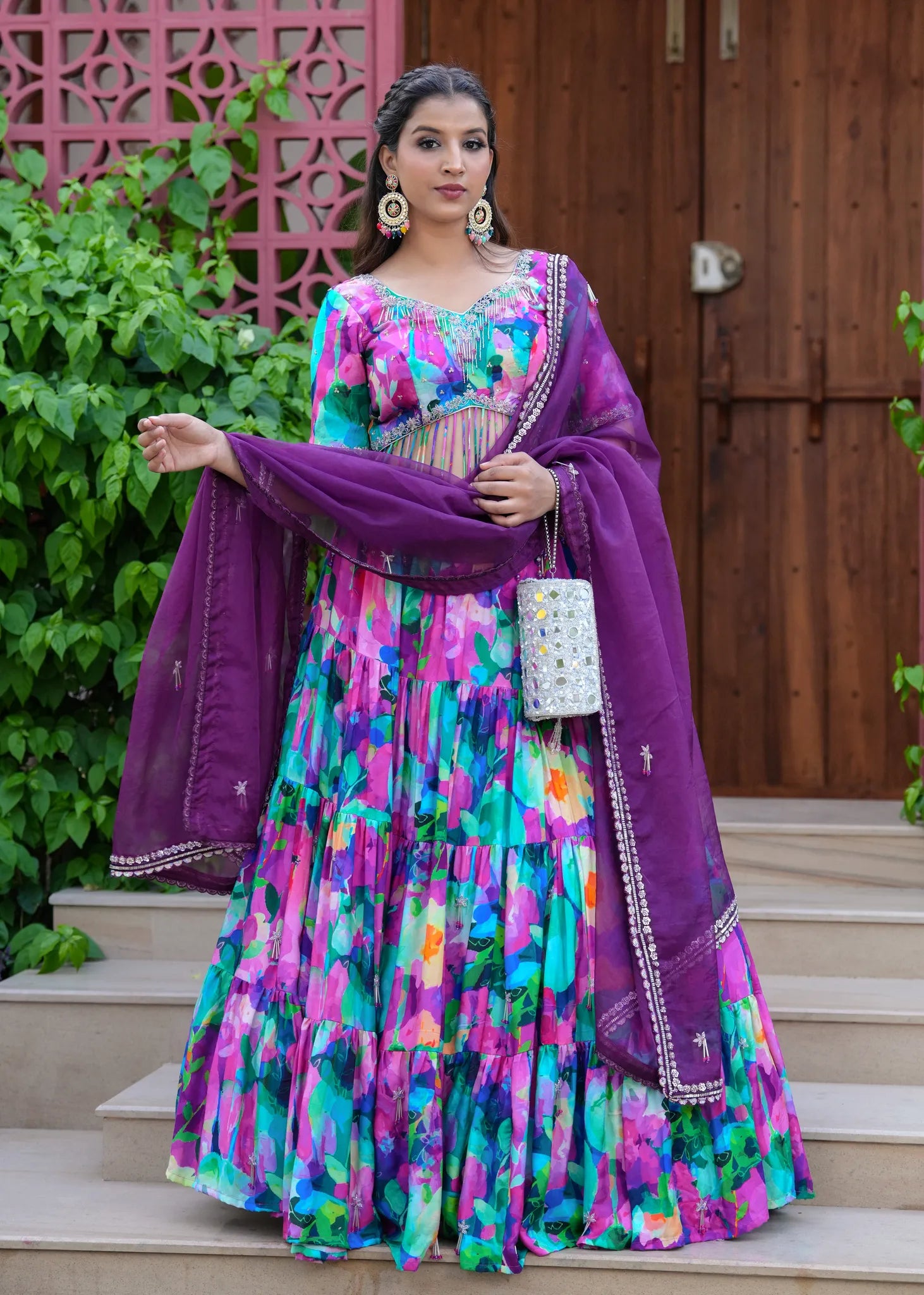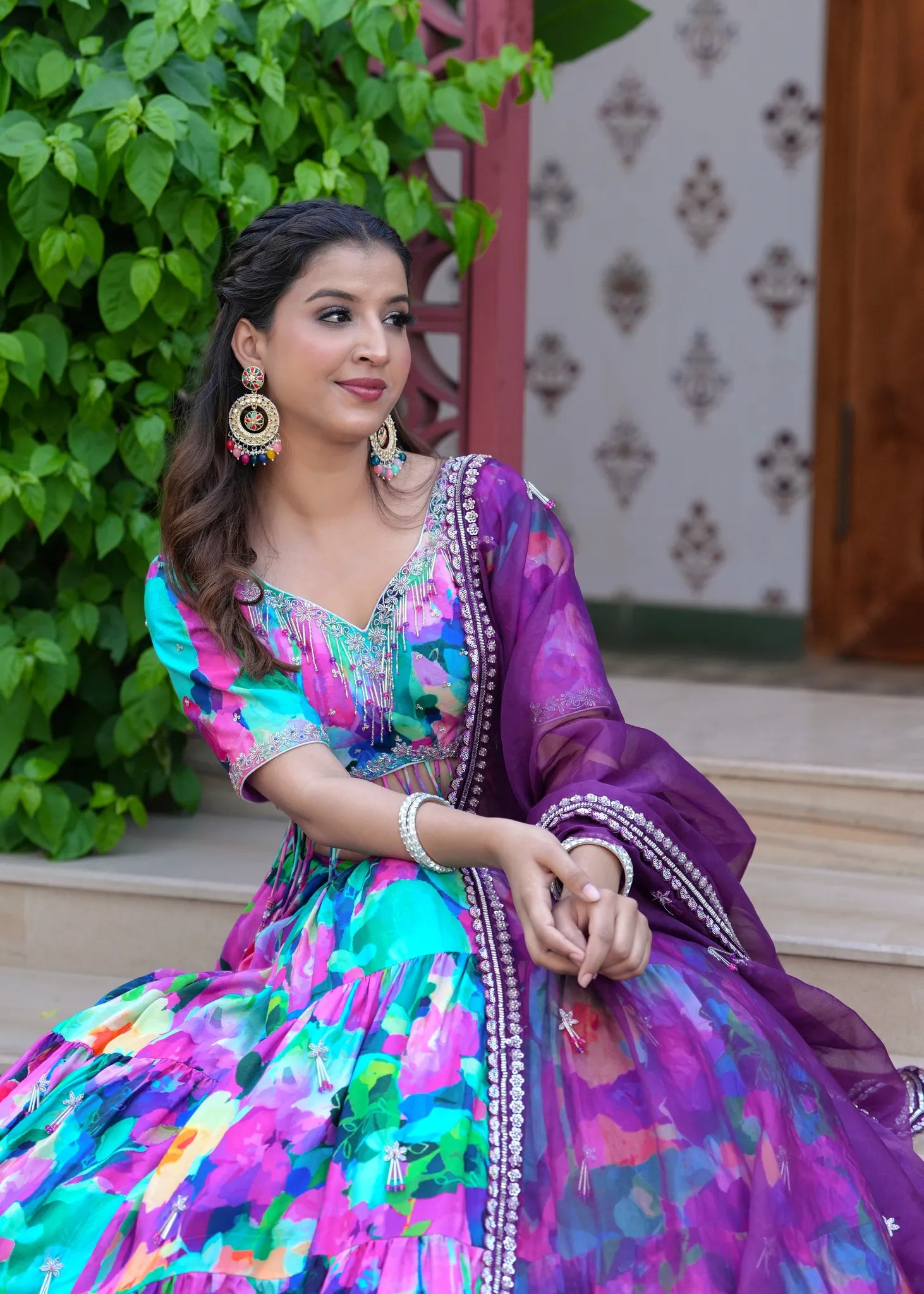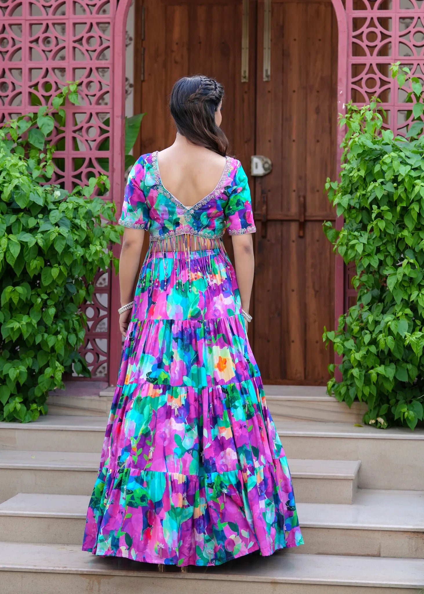 Floral Panache Purple Bloom Fusion Lehenga Set with Dupatta -The Floral Panache Purple Bloom Fusion Lehenga Set is a stunning statement ensemble perfect for grand occasions. The abstract floral printed lehenga is paired with a lavishly hand-embroidered blouse, adorned with shimmering cutdana work and playful beaded fringes. A solid organza dupatta, delicately hand-embroidered, completes the look with sheer elegance—making this set a radiant choice for unforgettable celebrations.