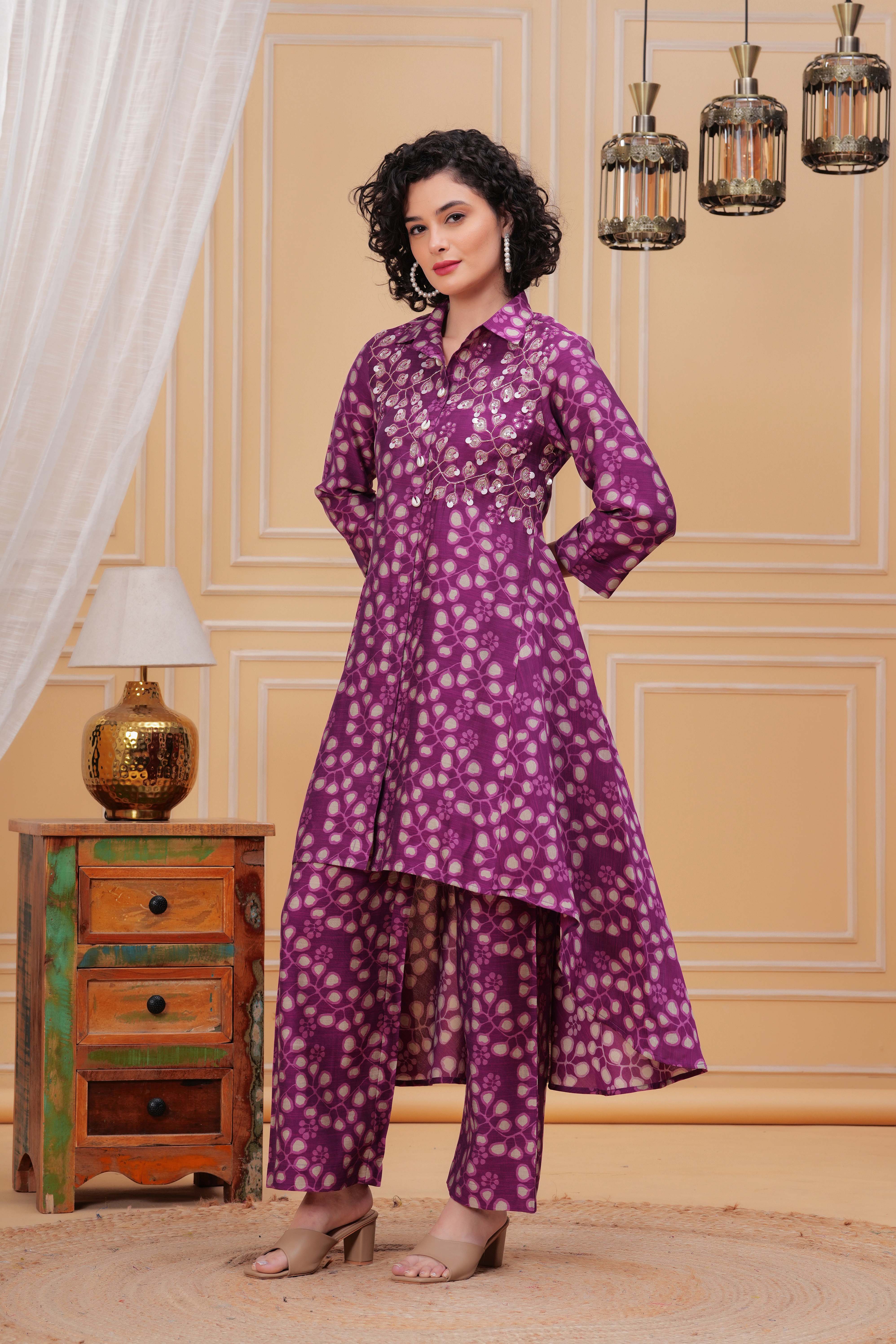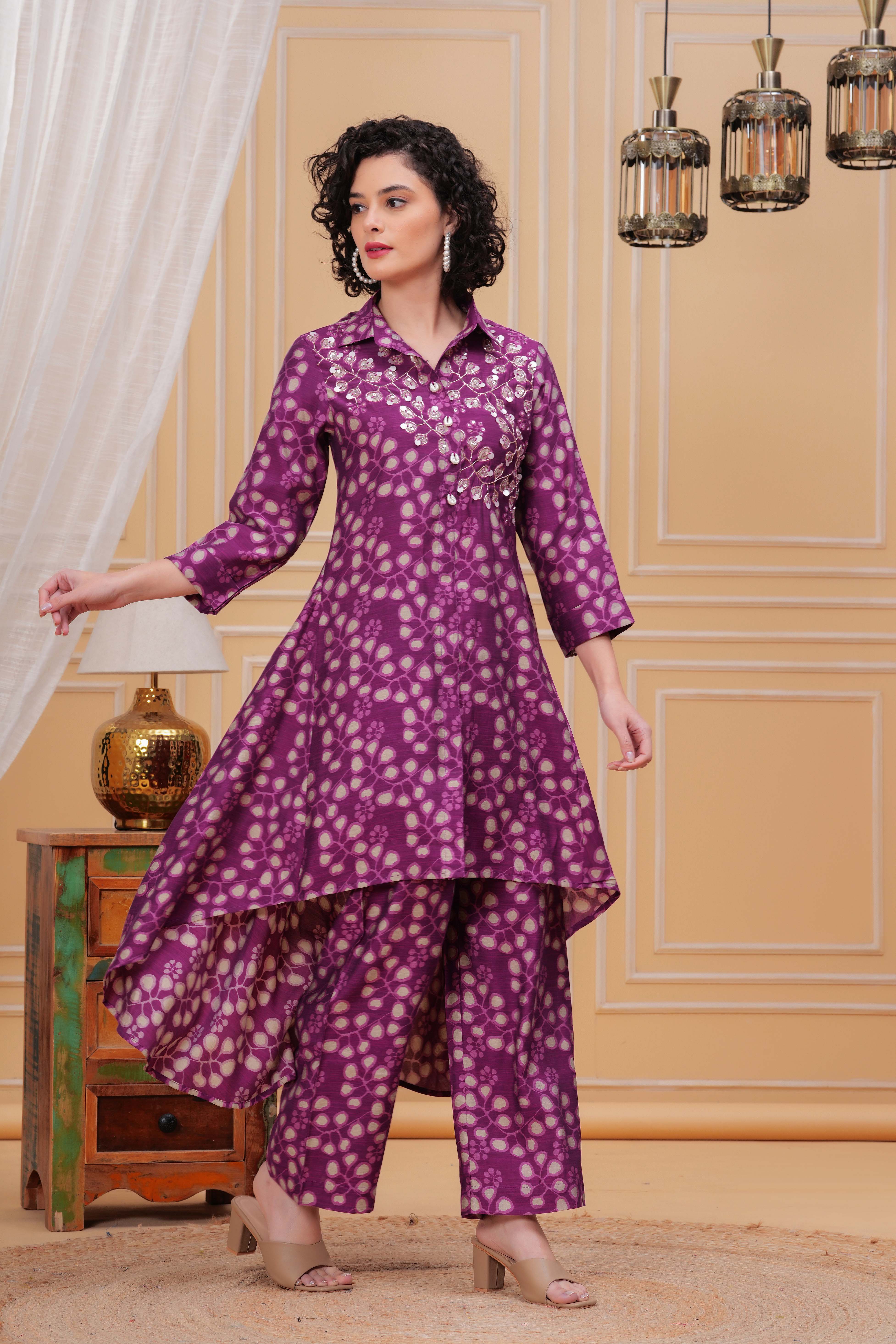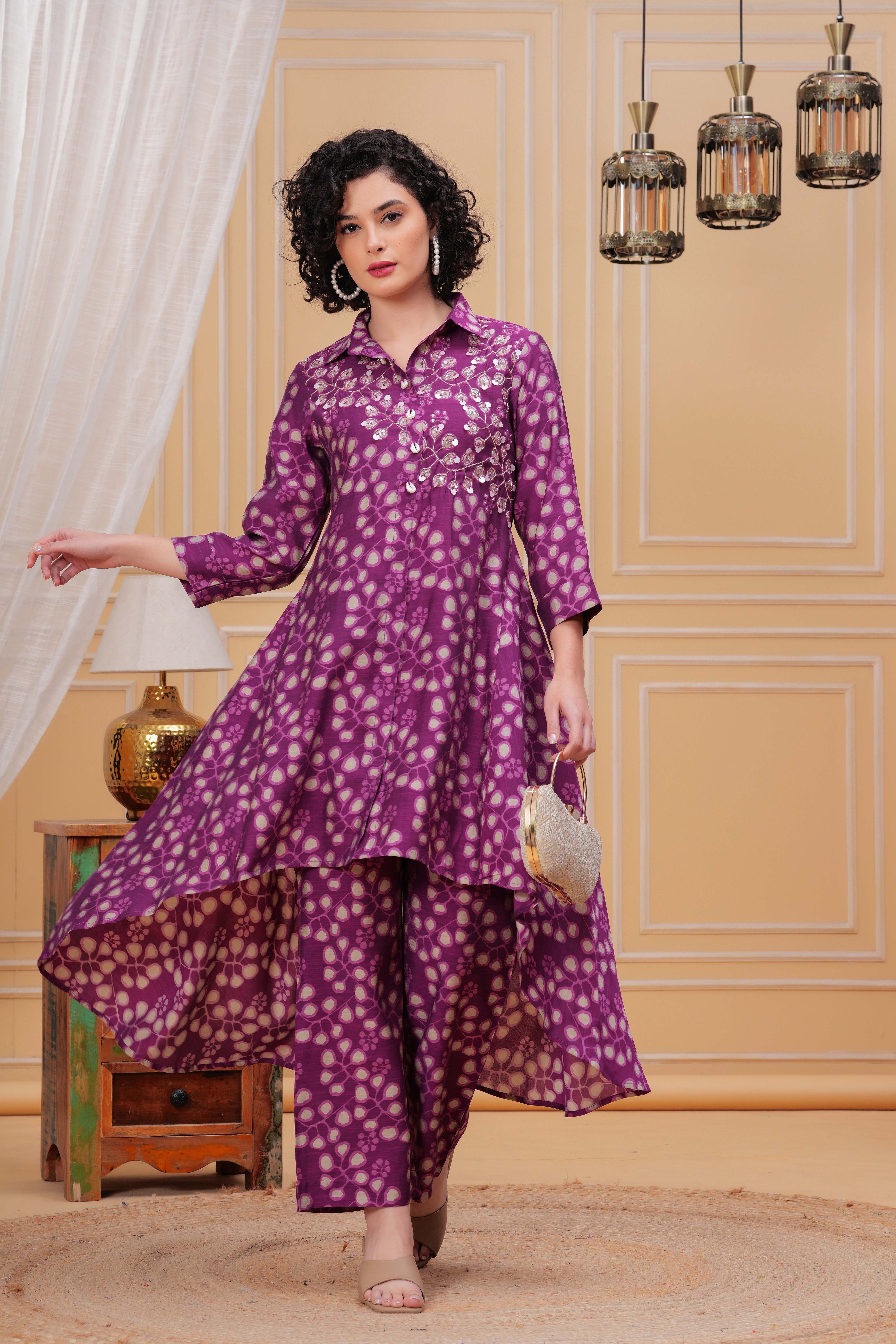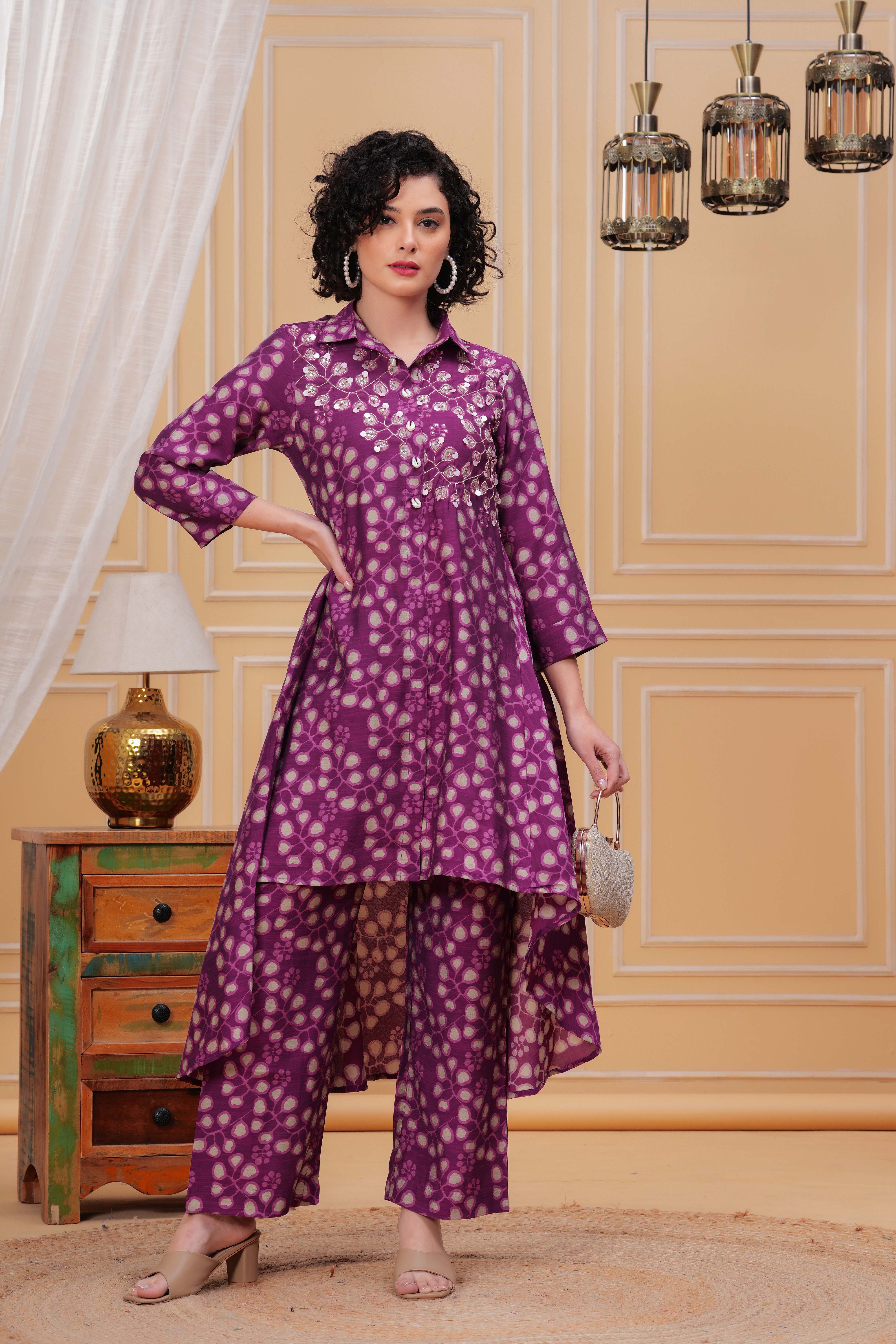 Desi Disco Purple Punch Hand Embroidered Assymetrical Kurta Set- Embrace effortless glamour with the Desi Disco Purple Punch Kurta Culotte Set. Crafted from lightweight Chanderi silk, it features a high-low A-line kurta with abstract floral prints, delicate embroidery, and sequin detailing. Paired with printed palazzos, this stylish set blends festive sparkle with modern ease—perfect for any special occasion.