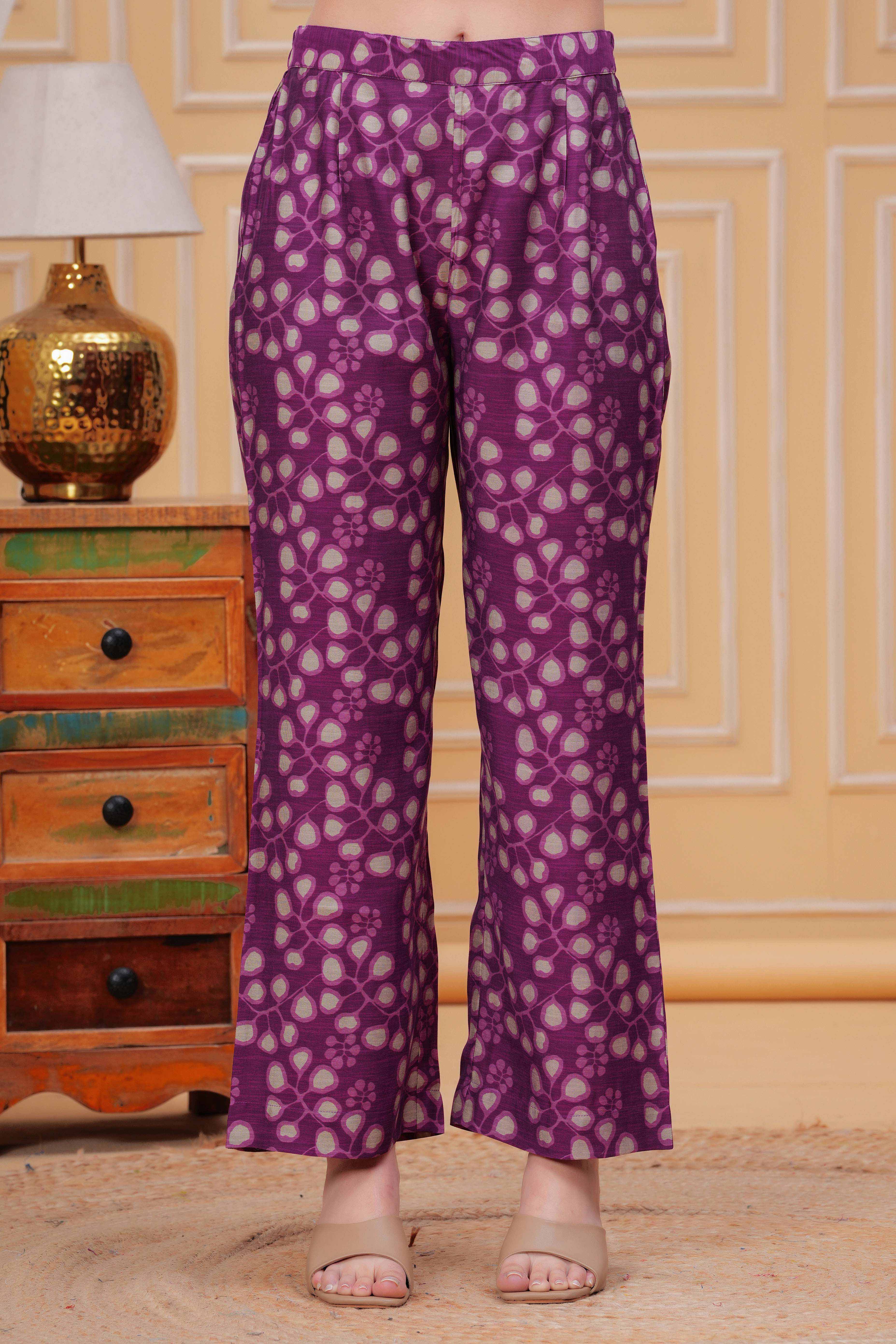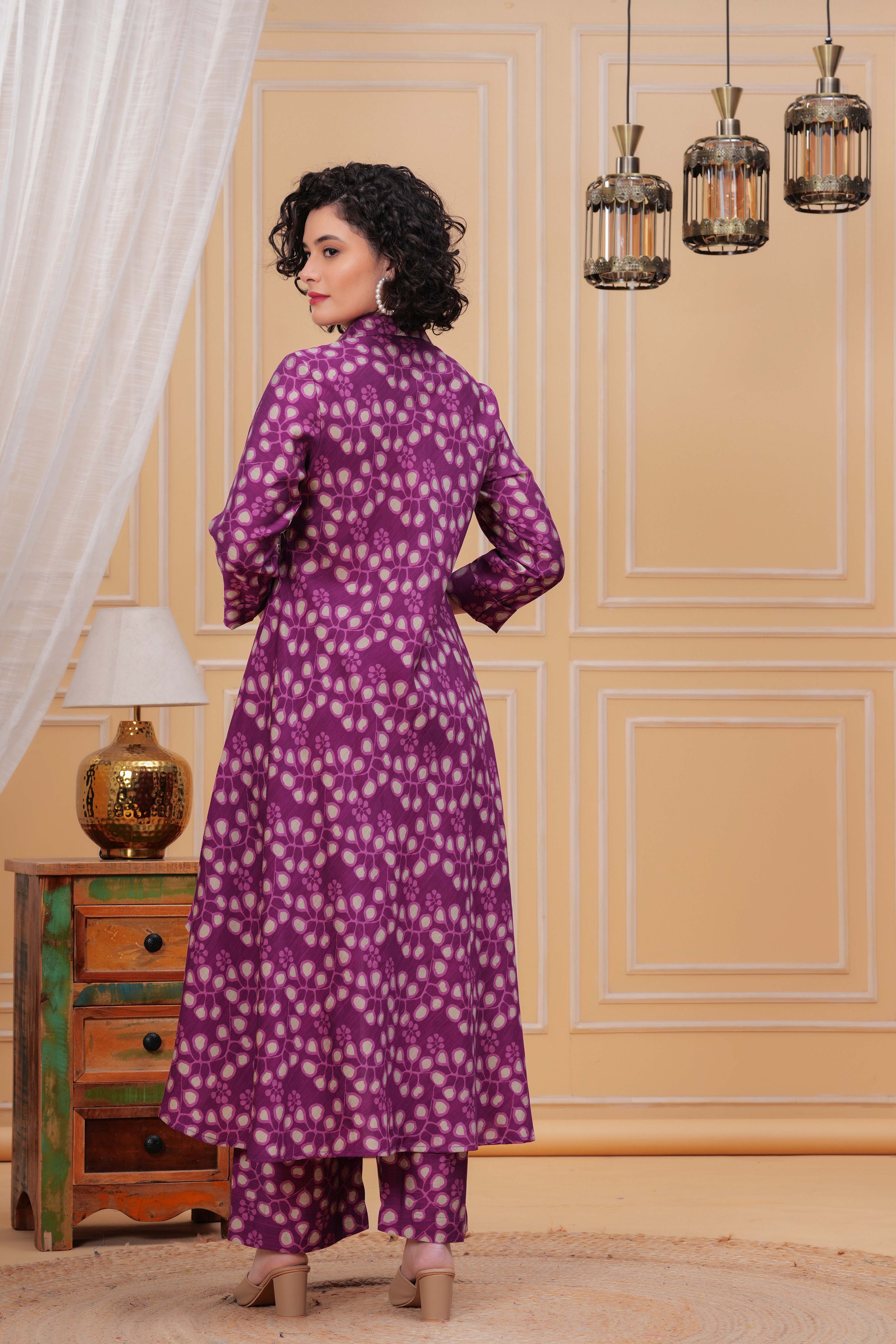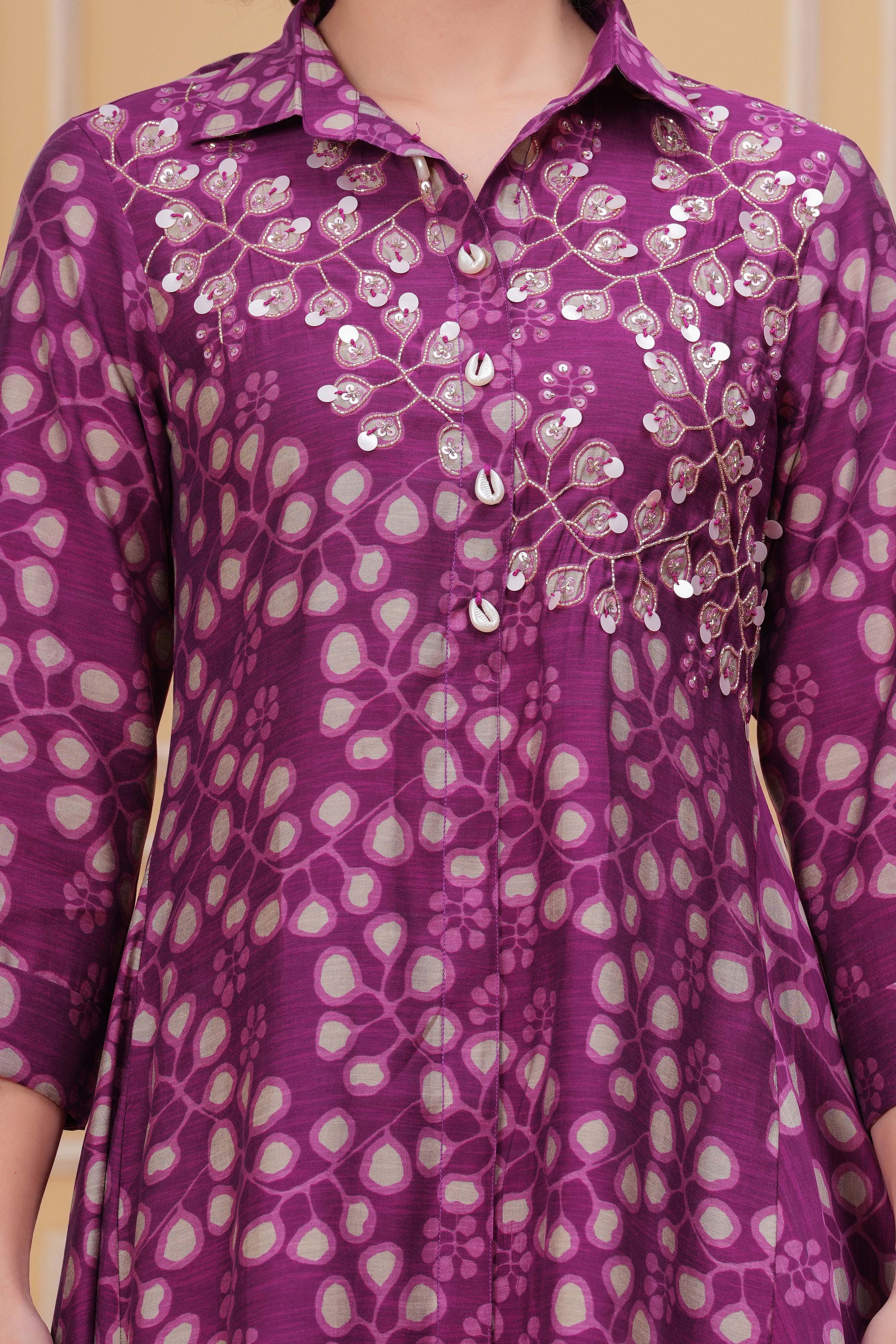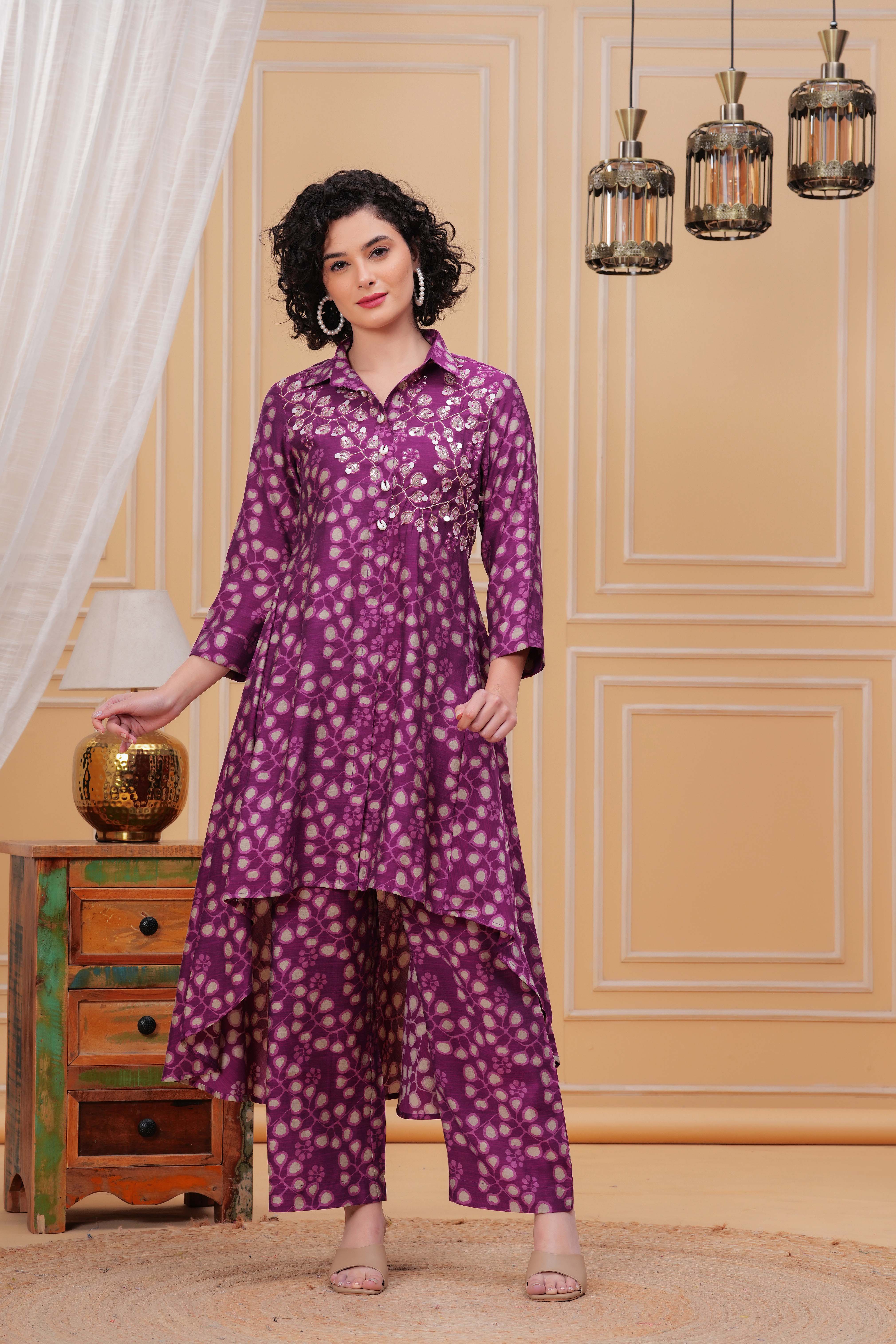 Desi Disco Purple Punch Hand Embroidered Assymetrical Kurta Set- Embrace effortless glamour with the Desi Disco Purple Punch Kurta Culotte Set. Crafted from lightweight Chanderi silk, it features a high-low A-line kurta with abstract floral prints, delicate embroidery, and sequin detailing. Paired with printed palazzos, this stylish set blends festive sparkle with modern ease—perfect for any special occasion.