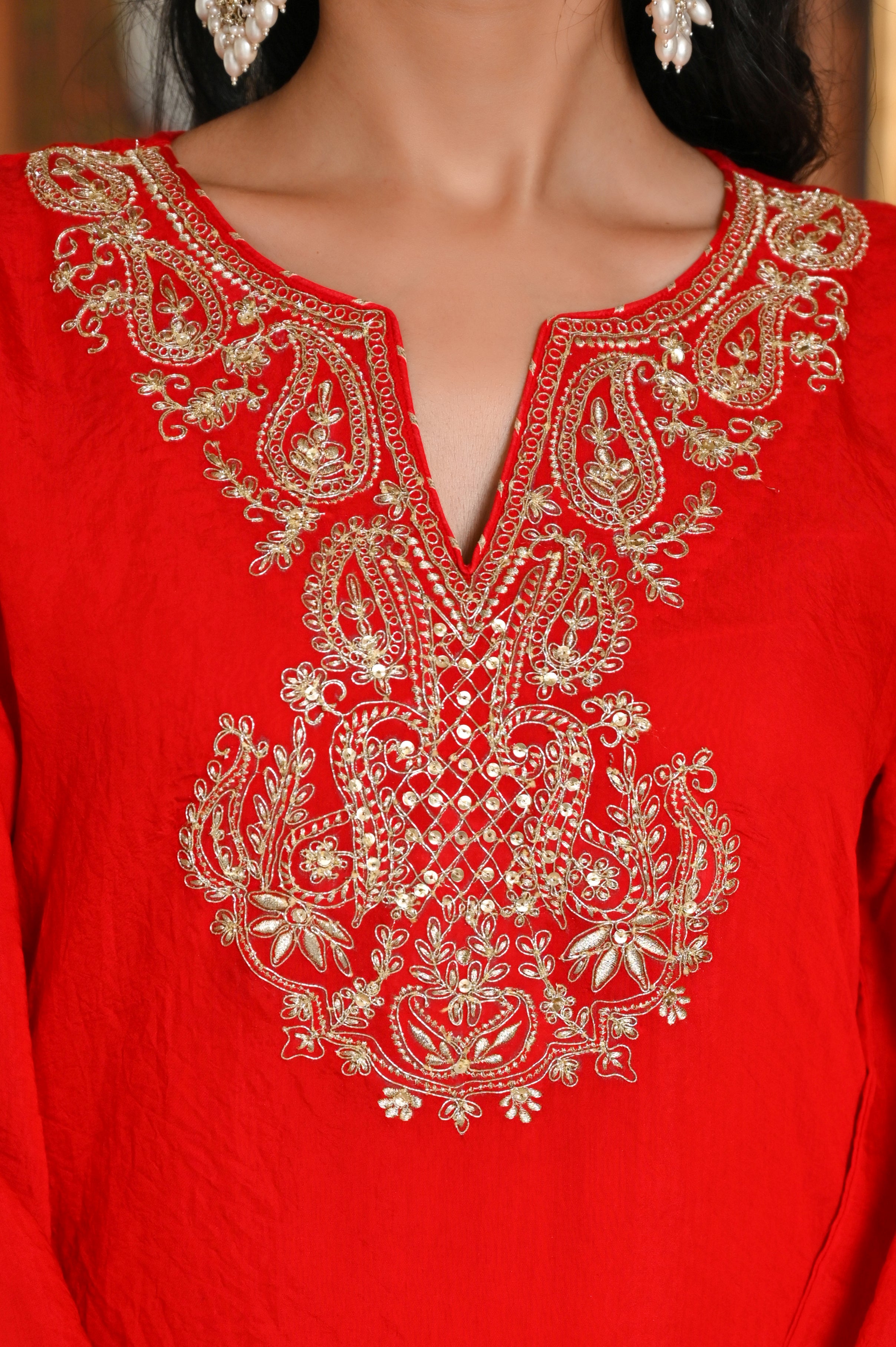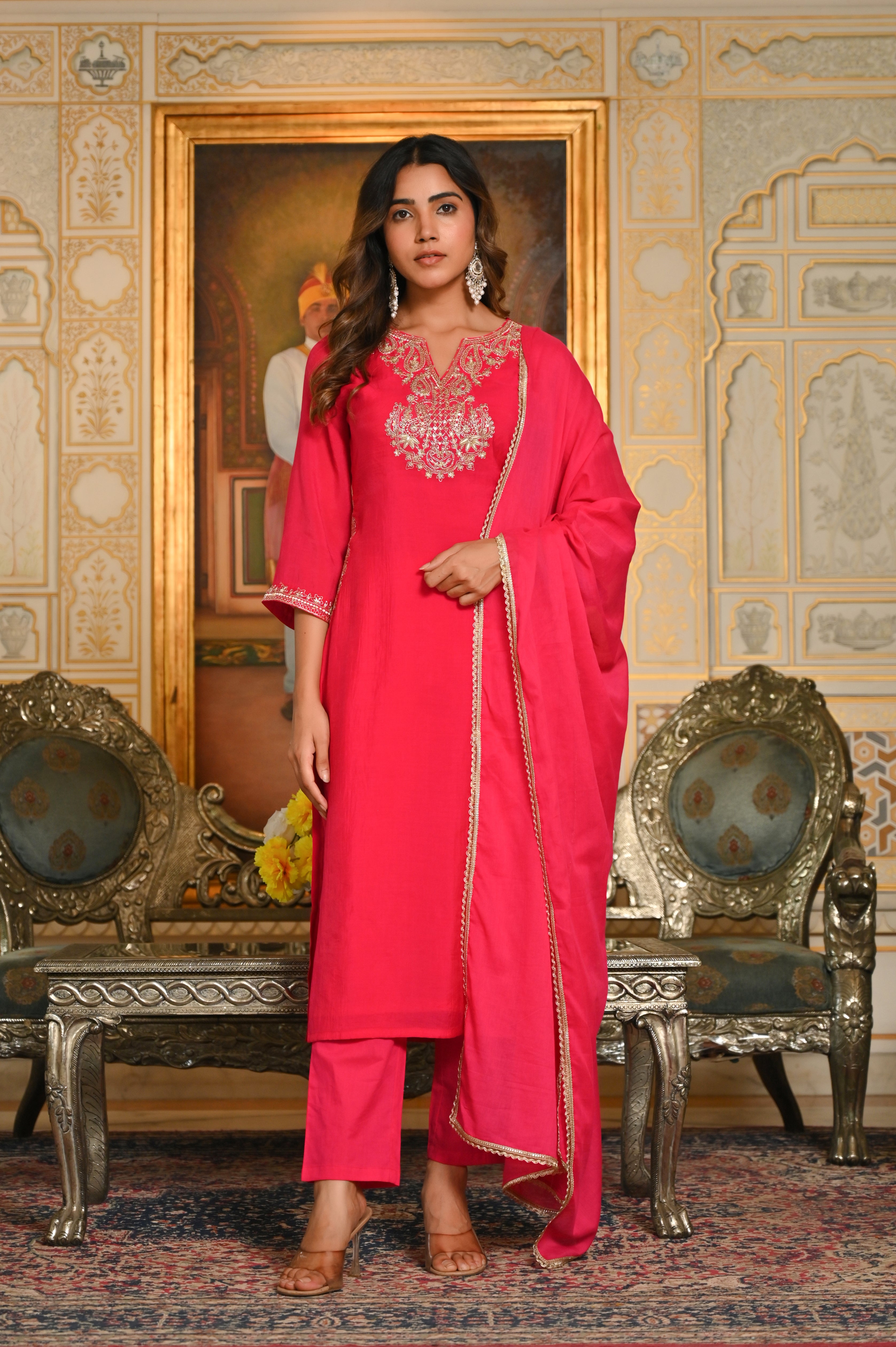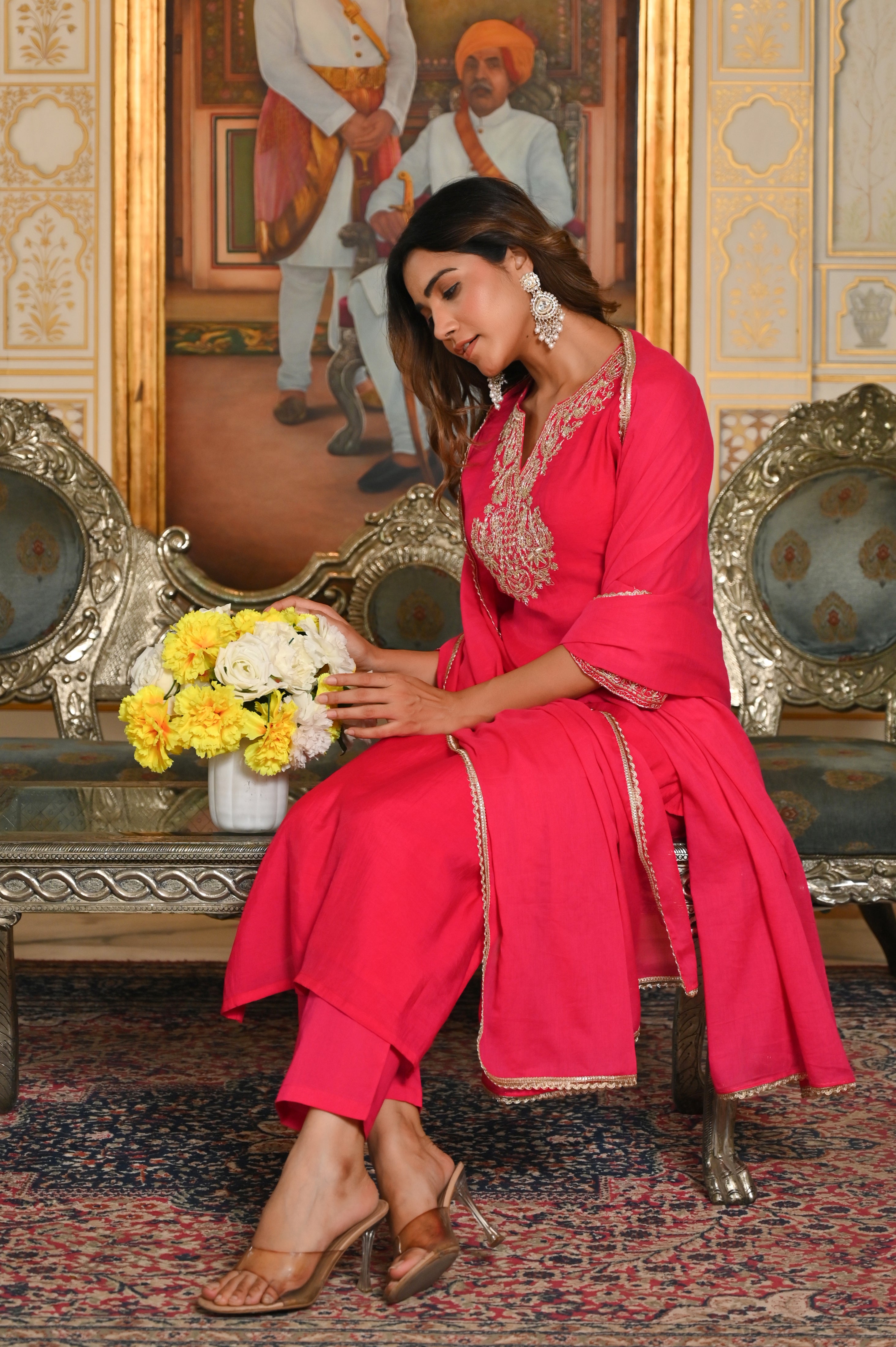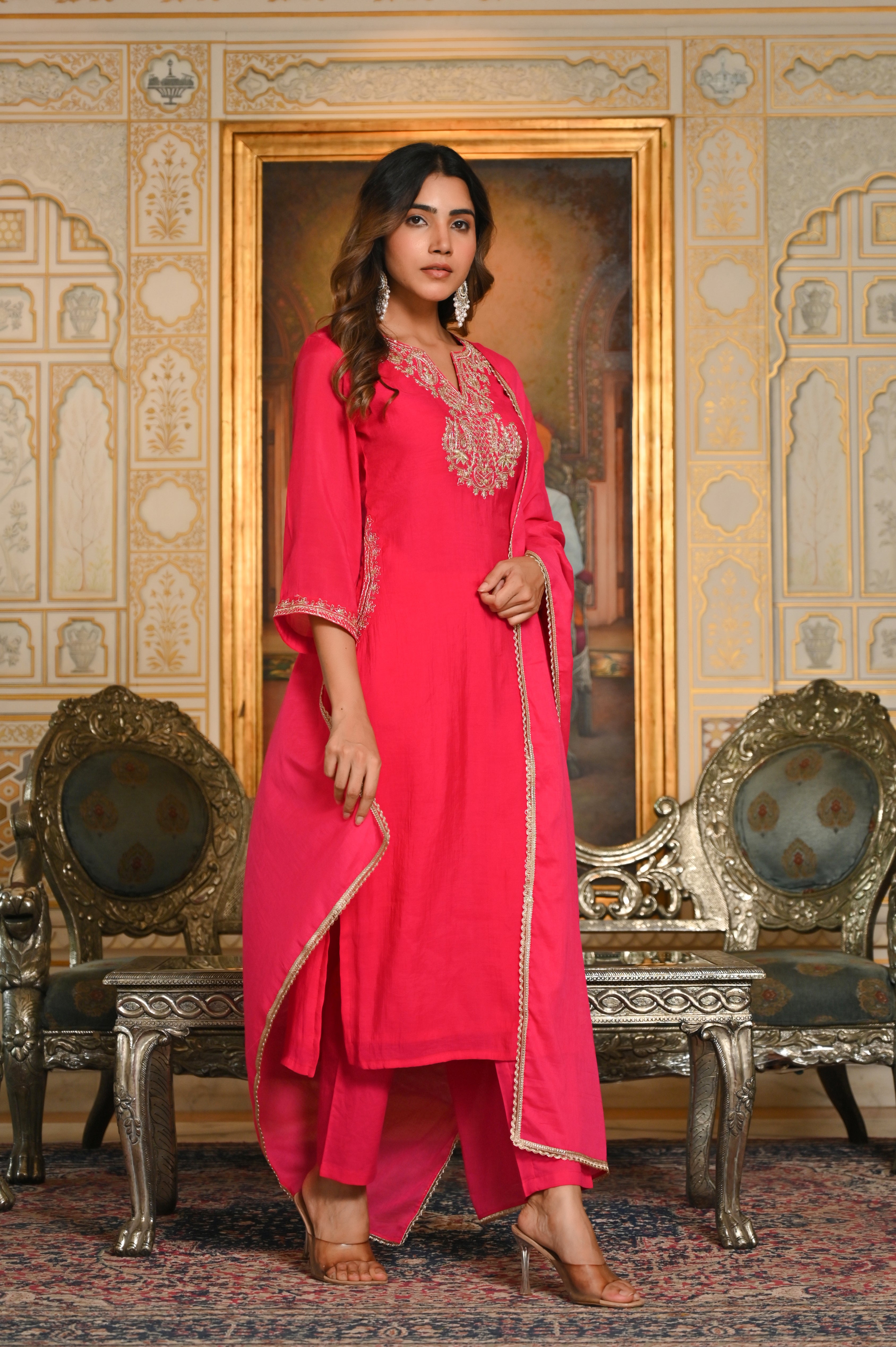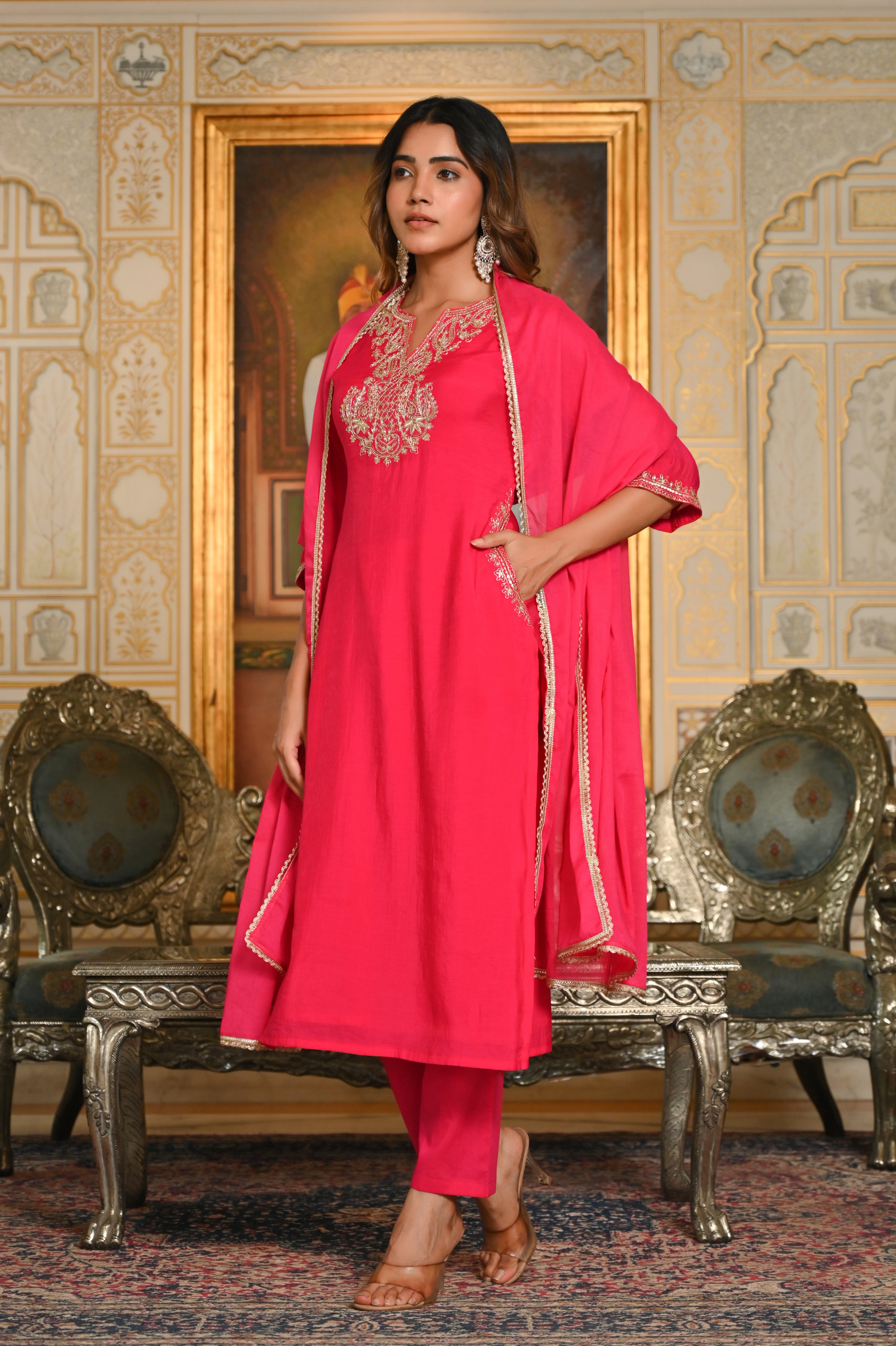 Maharani Vibes Rani Dori Work Chanderi Kurta Dupatta Set- Embrace effortless grace with this stunning Pink Kurta Set, blending comfort and craftsmanship. The smooth solid Mul Chanderi kurta, designed with a classic round neckline, features a chic yoke intricately detailed with rich Dori, Zari, and sequin hand-embroidery. Practicality meets style with convenient front pockets. Paired with a soft cotton pant and a coordinating, breathable Mulmul dupatta, this ensemble is perfect for sophisticated daily wear.